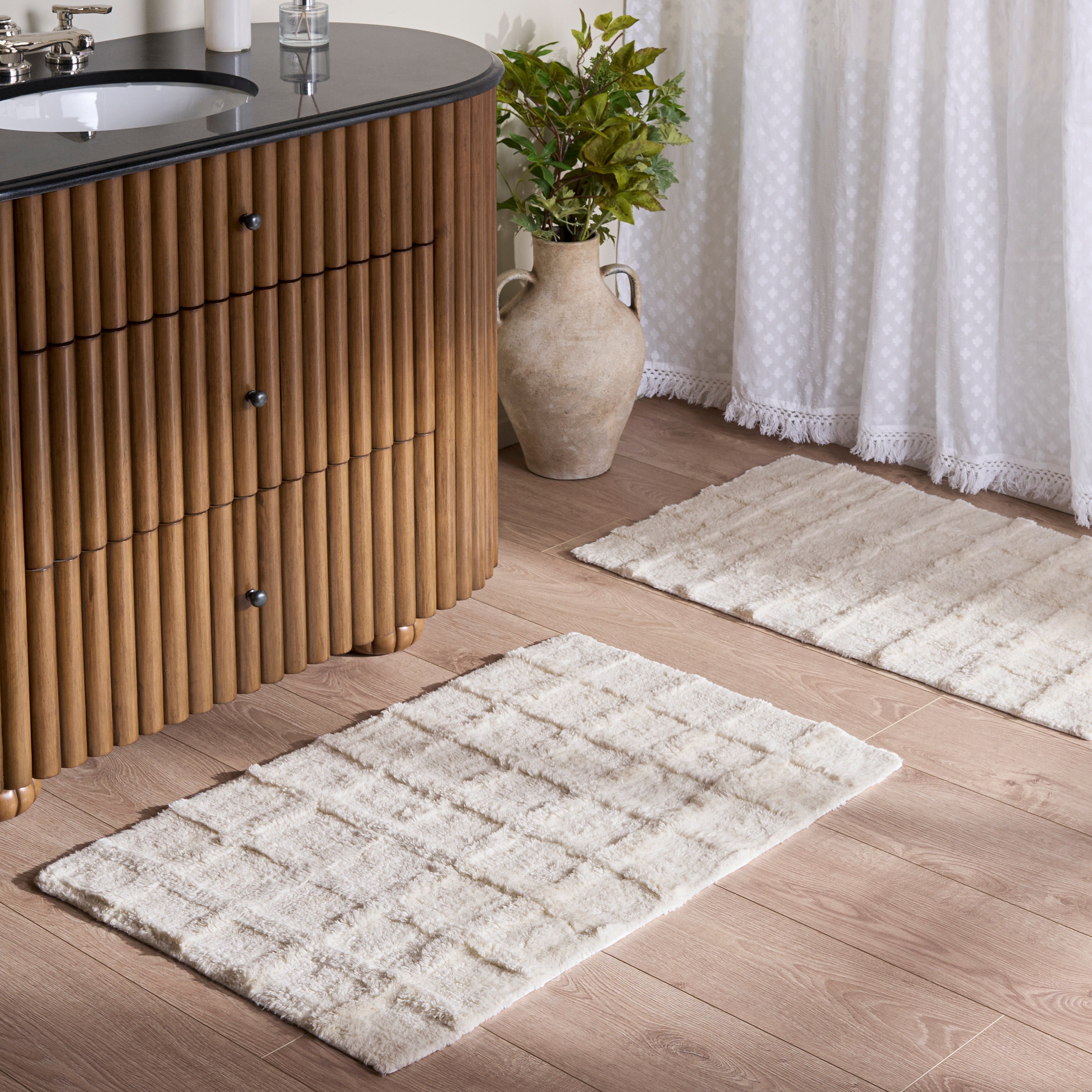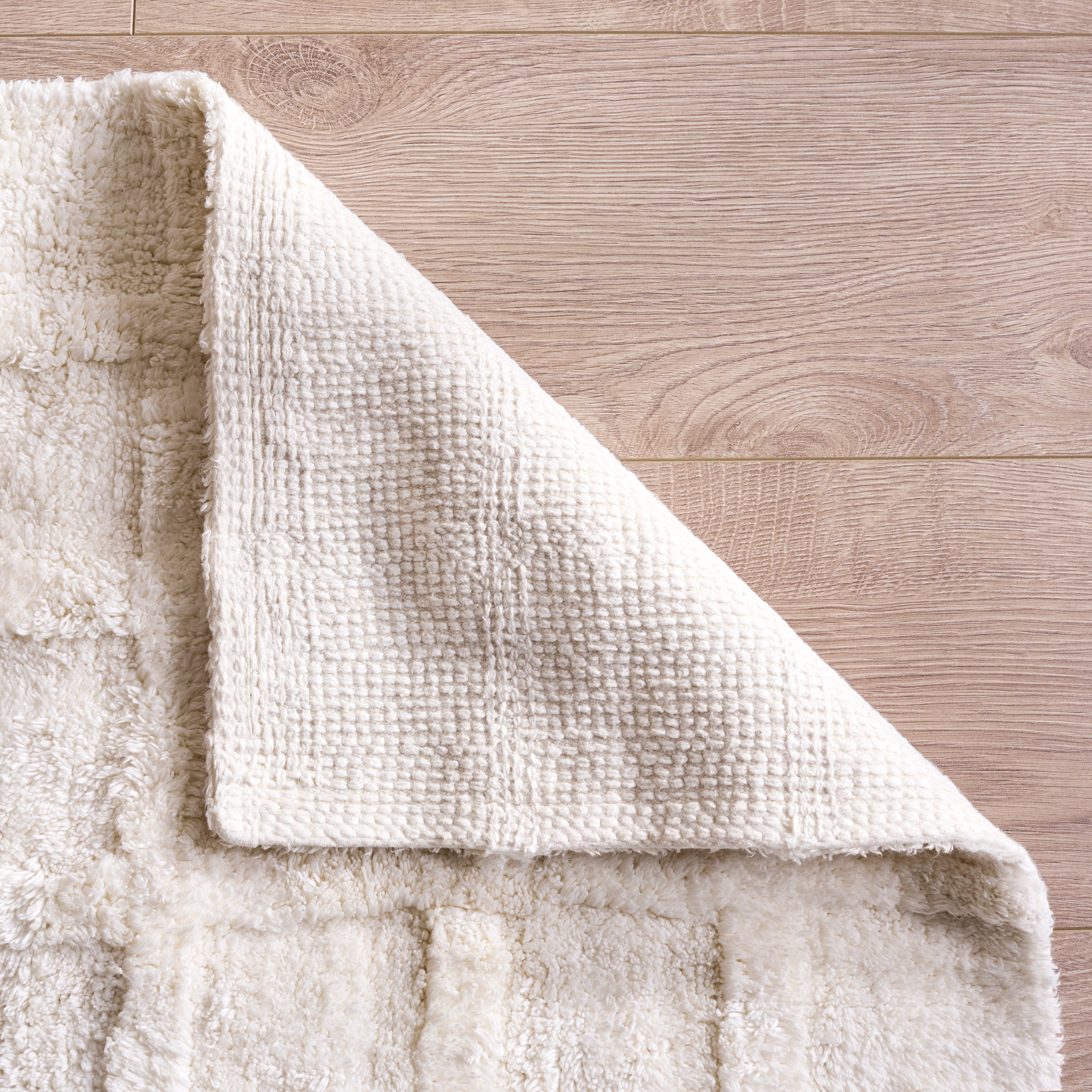 Transform your bathroom into a serene oasis with the Quinn waffle grid bathmat set. Designed in an elegant shade, this set of two bathmats brings a touch of tranquility and sophistication to your space. Crafted with a front made of 100 percent cotton, these bathmats are soft to the touch, offering a warm welcome every time you step out of the shower. The backing features latex for enhanced grip, ensuring stability on your bathroom floor. Hand-tufted with precision, each rug in the set measures 21 by 34 inches, fitting seamlessly into various bathroom sizes.