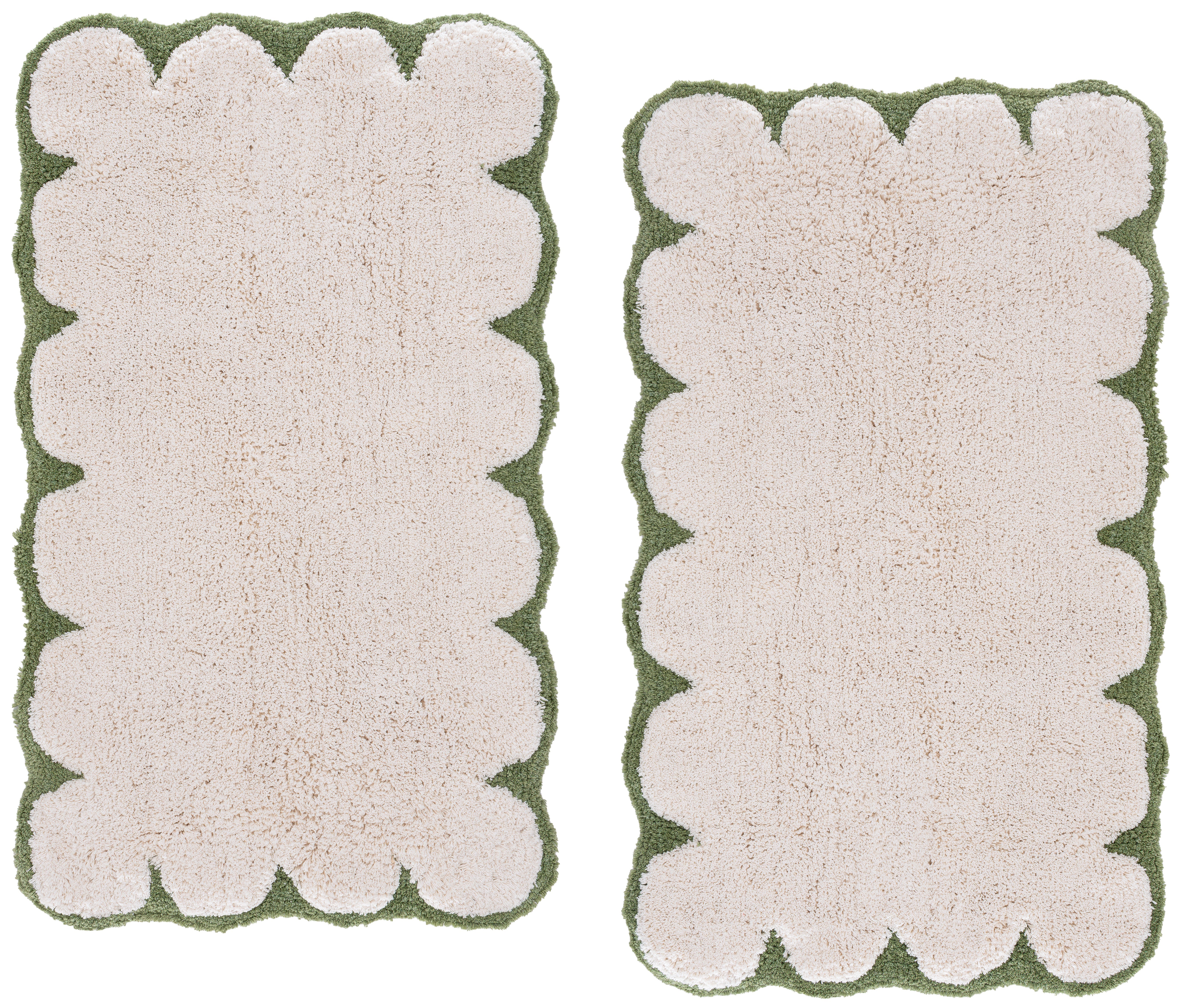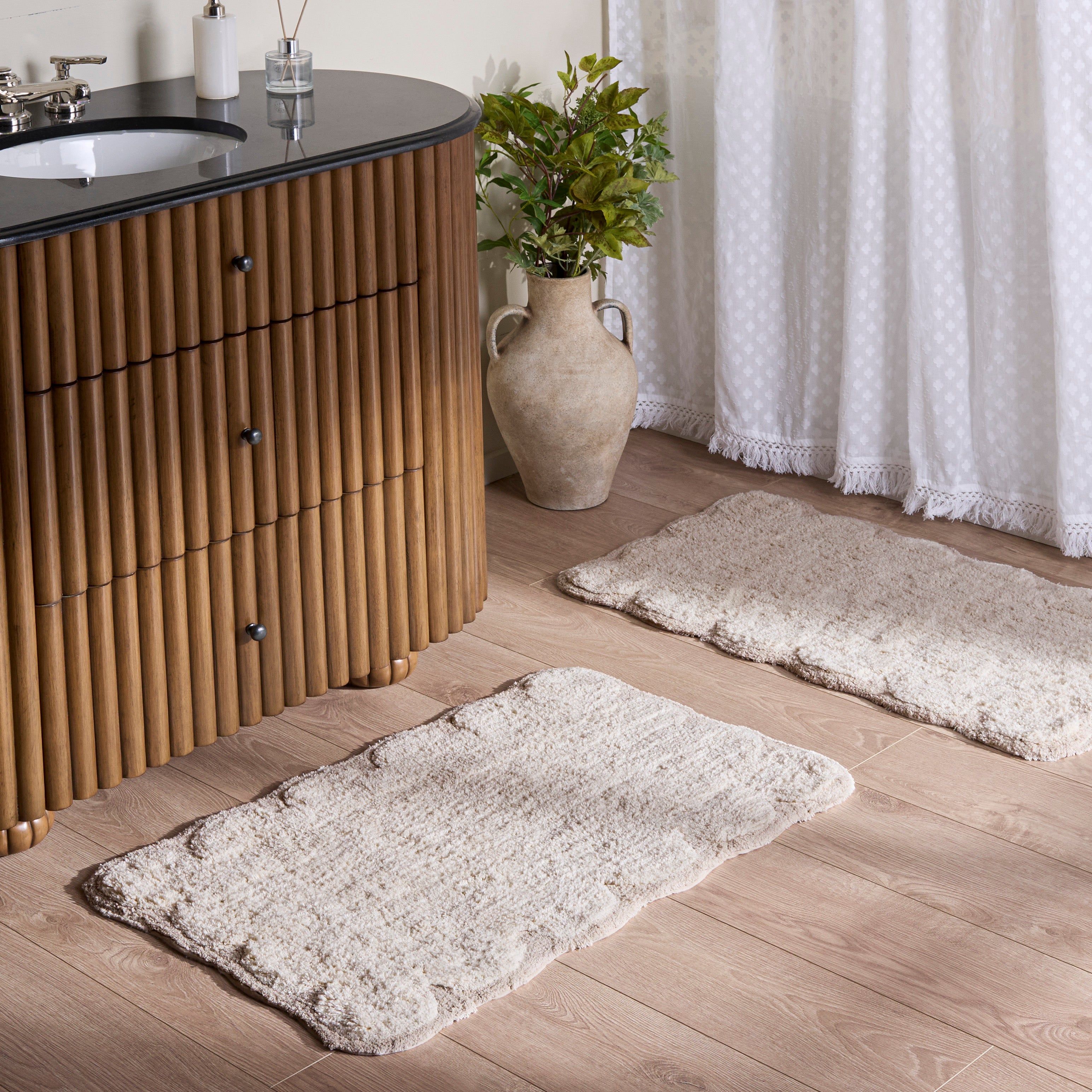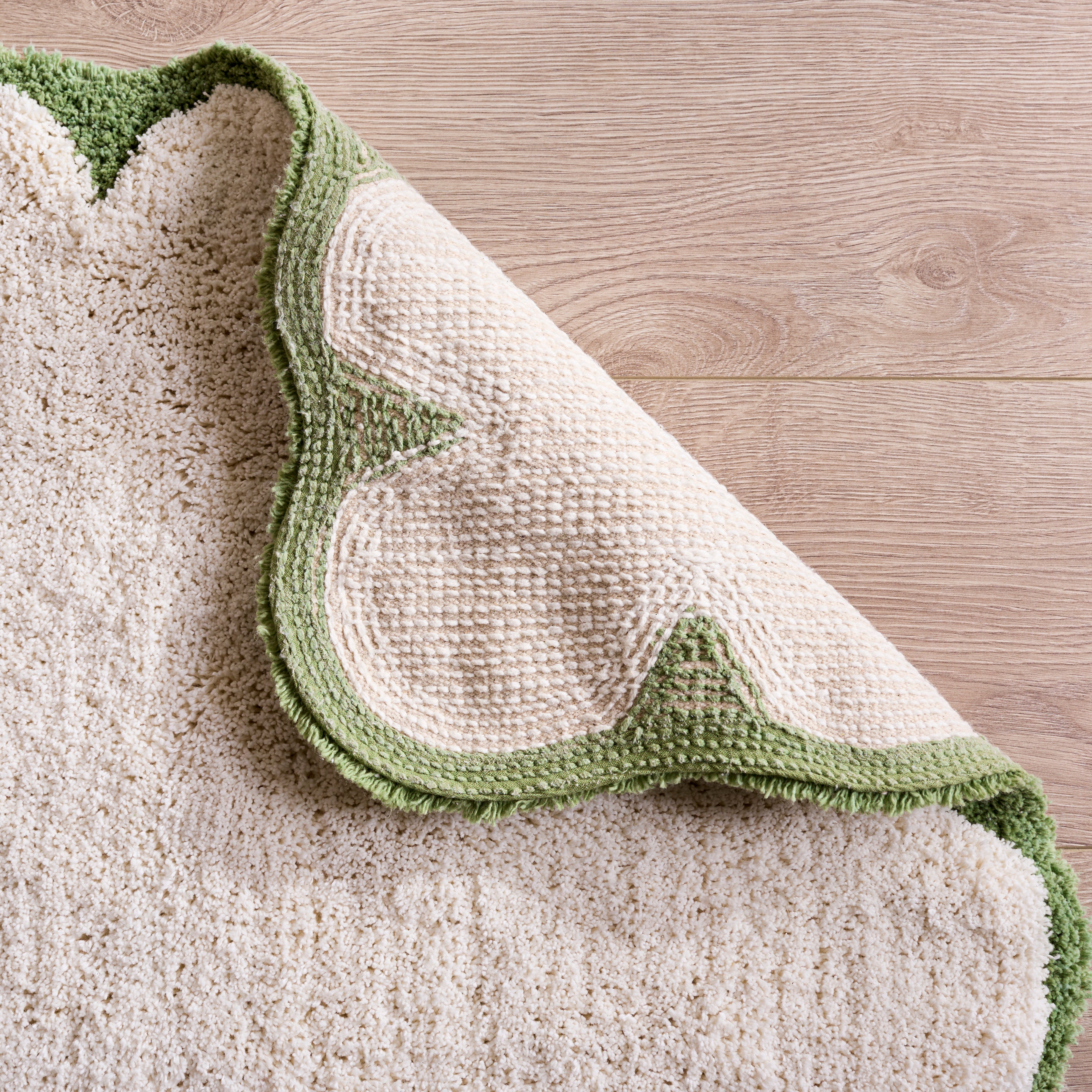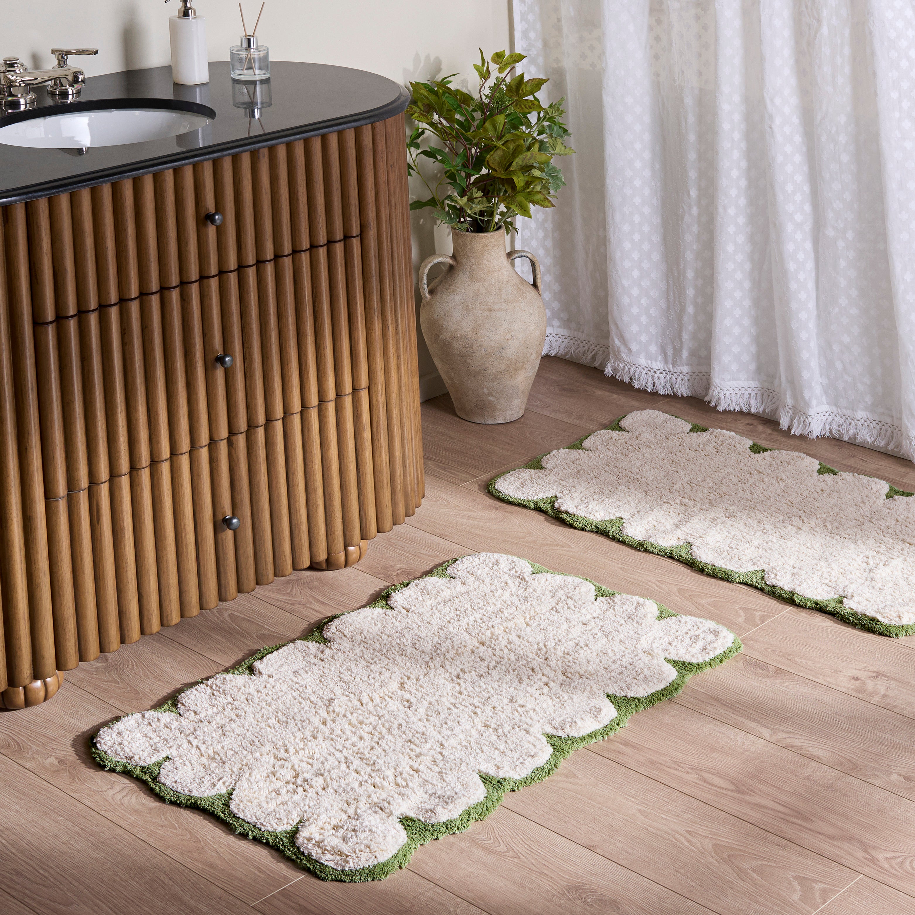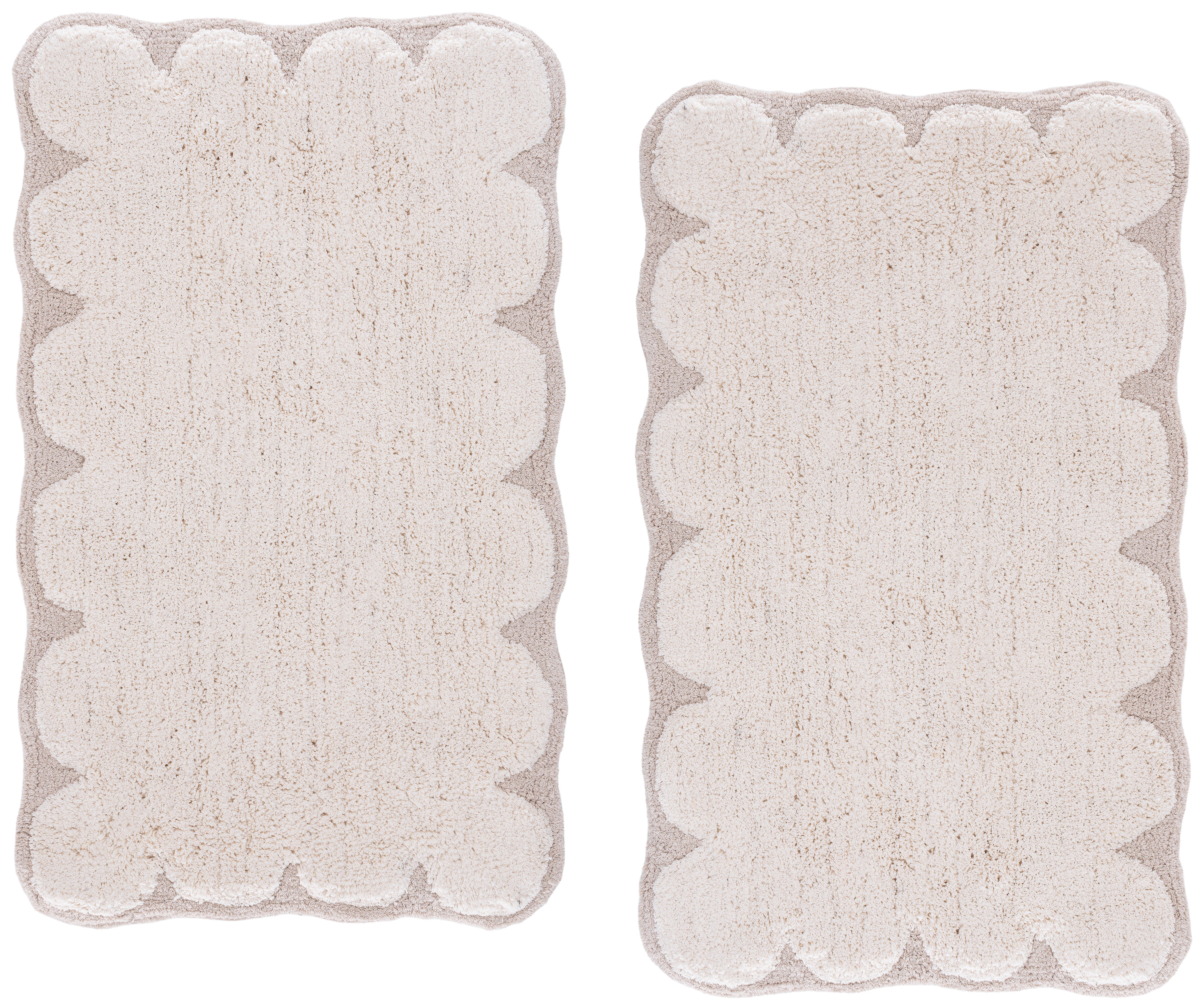 Elevate your bathroom decor with the Tully scalloped boarder bathmat set. Carefully hand tufted, these bathmats offer a touch of elegance and comfort to your daily routine. The front is crafted from 100 percent cotton, providing a soft feel underfoot that invites relaxation. The latex backing ensures that the mats stay in place, offering stability as you step out of the shower or bath.