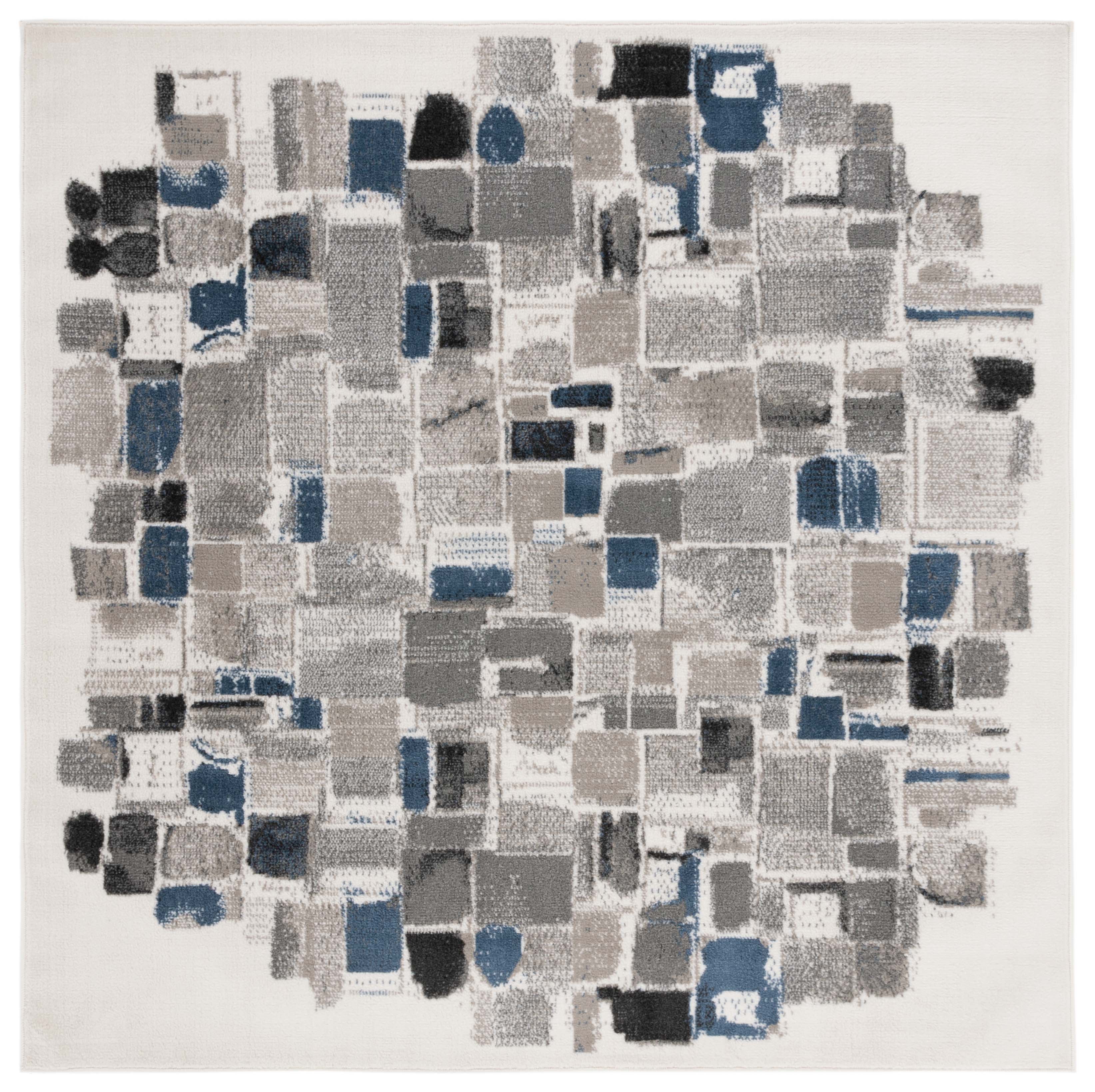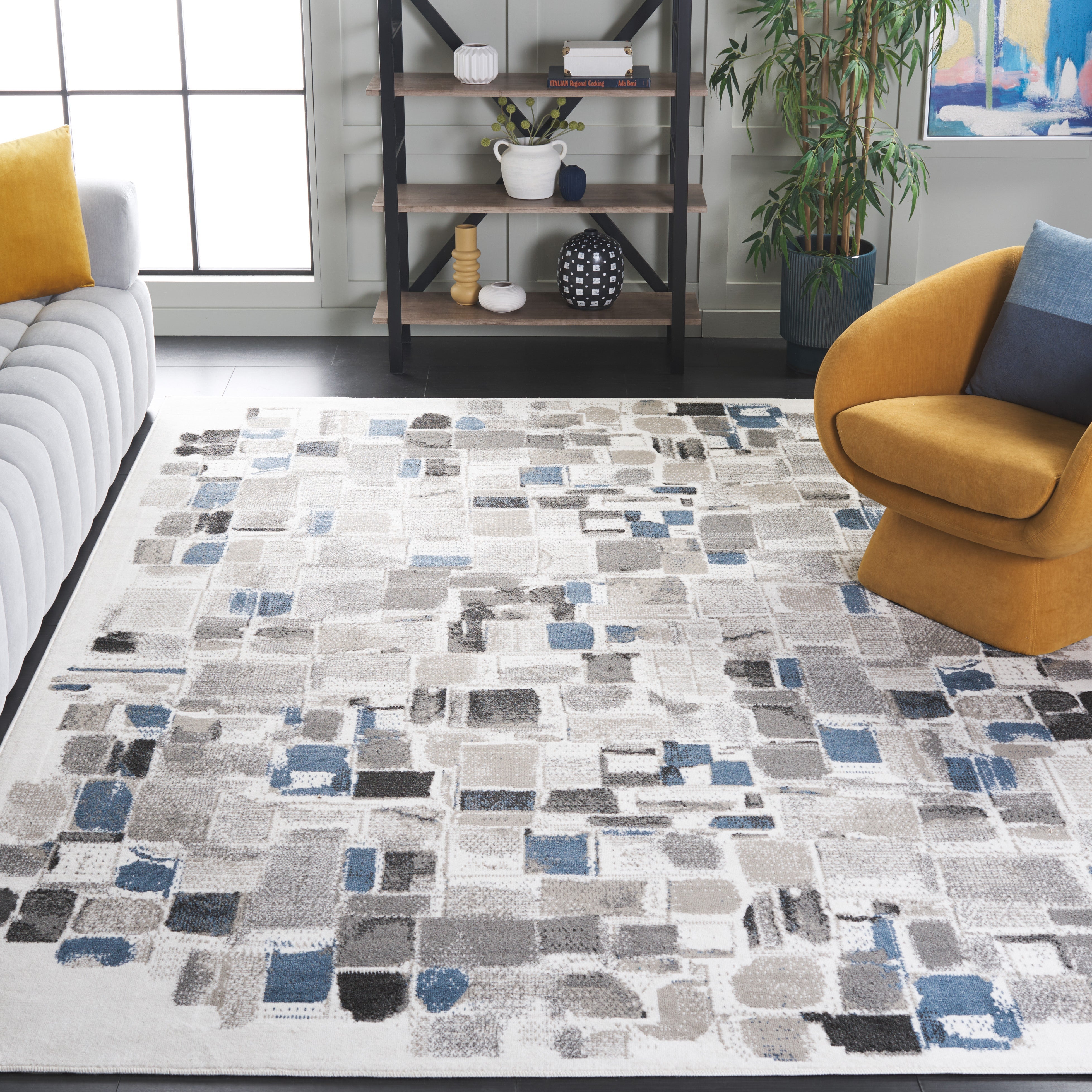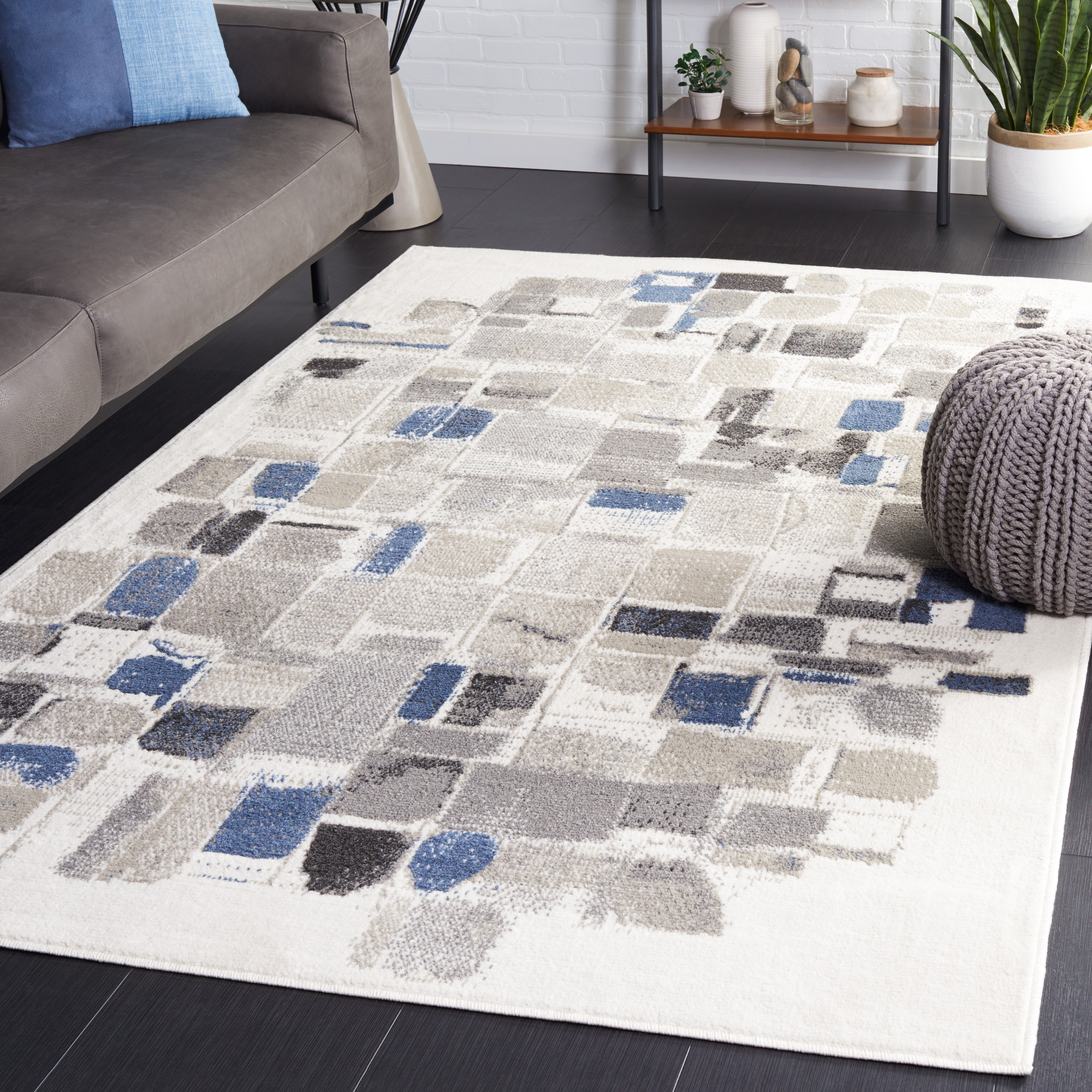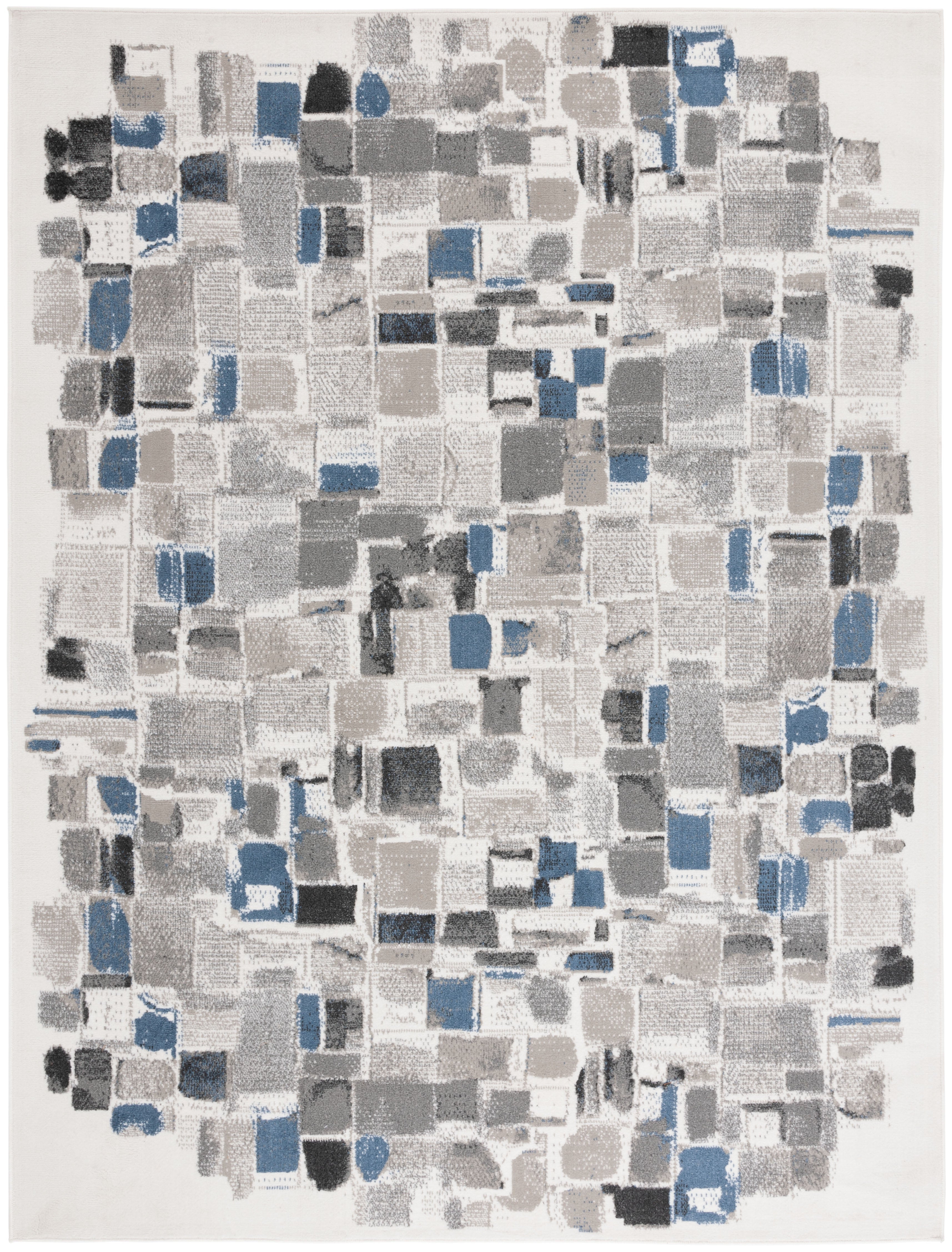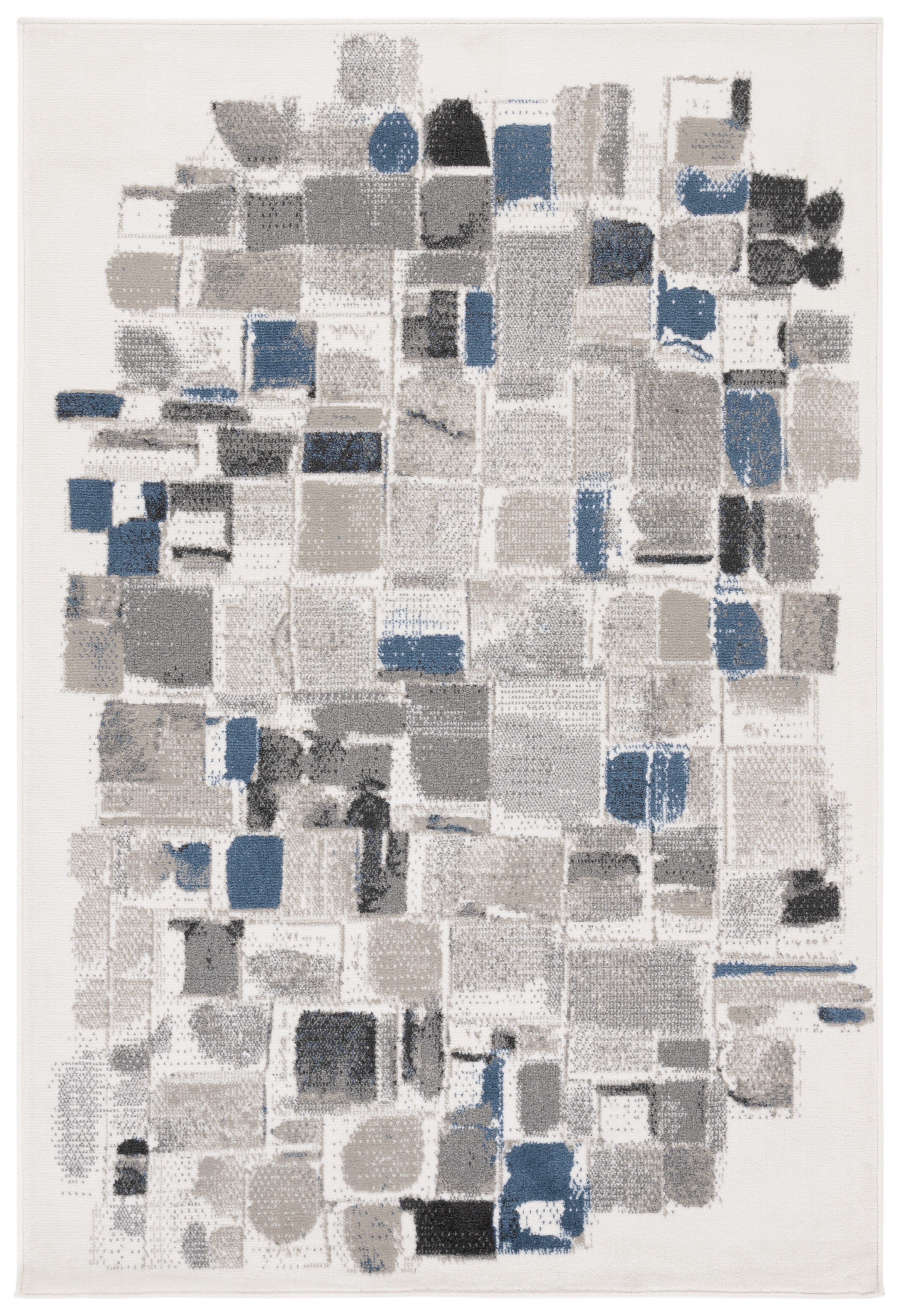 The rug features a captivating ivory and grey navy color palette that effortlessly complements diverse interior designs. Its array of abstract patterns offers a modern touch that can pull together any room's decor. The varied shades of blue, combined with neutral tones, make this rug a statement piece that's both bold and subtle.