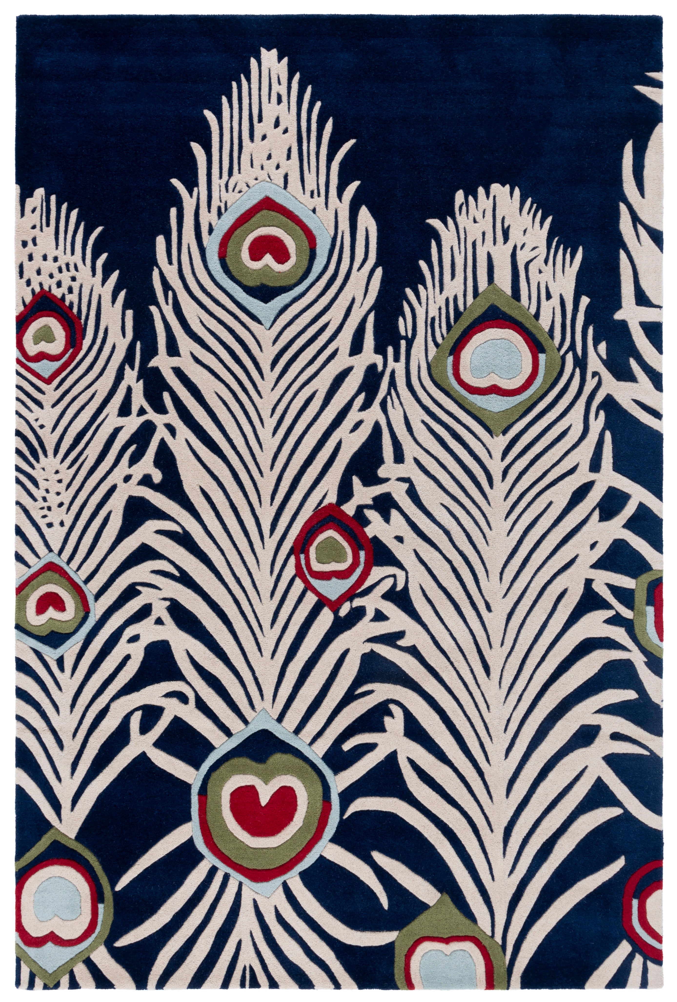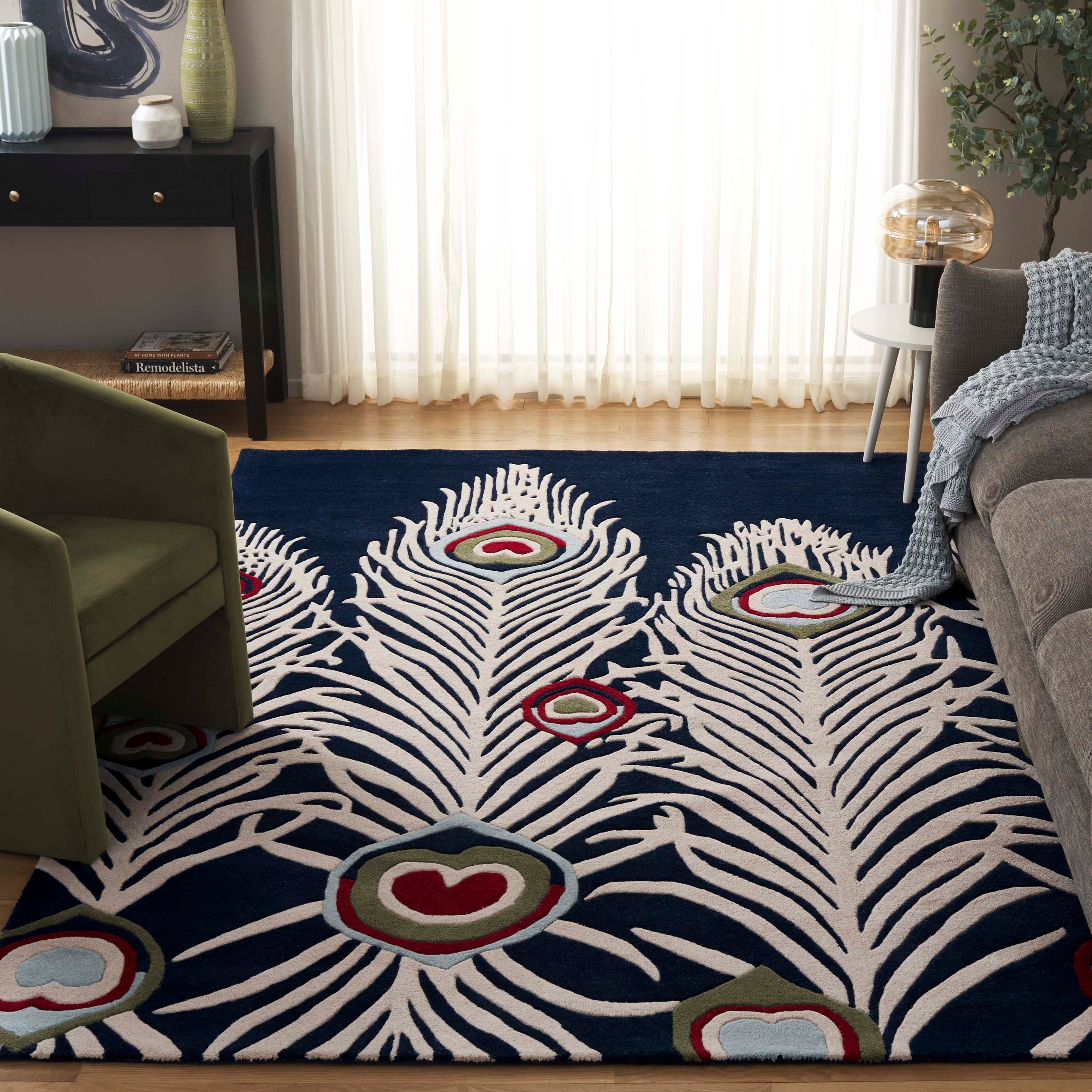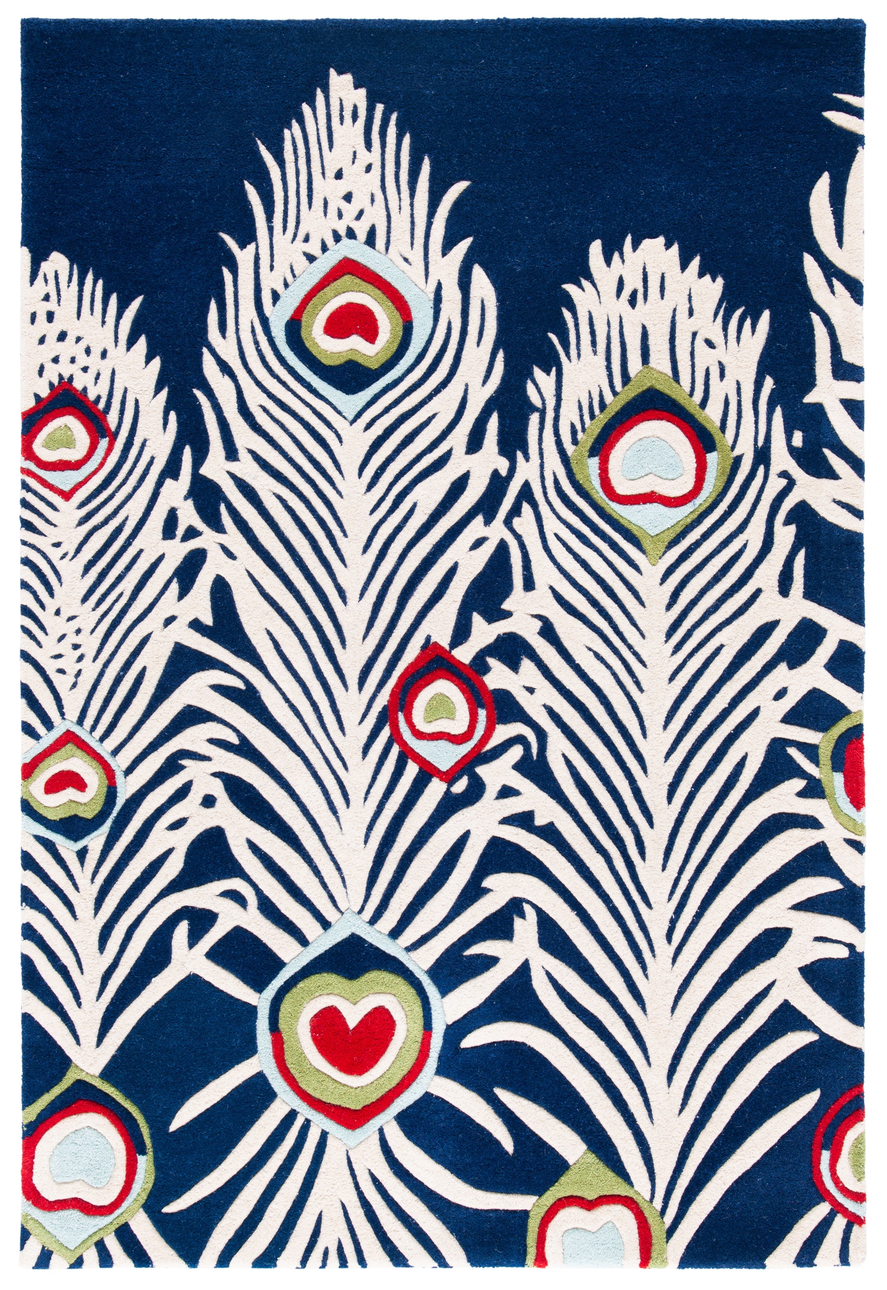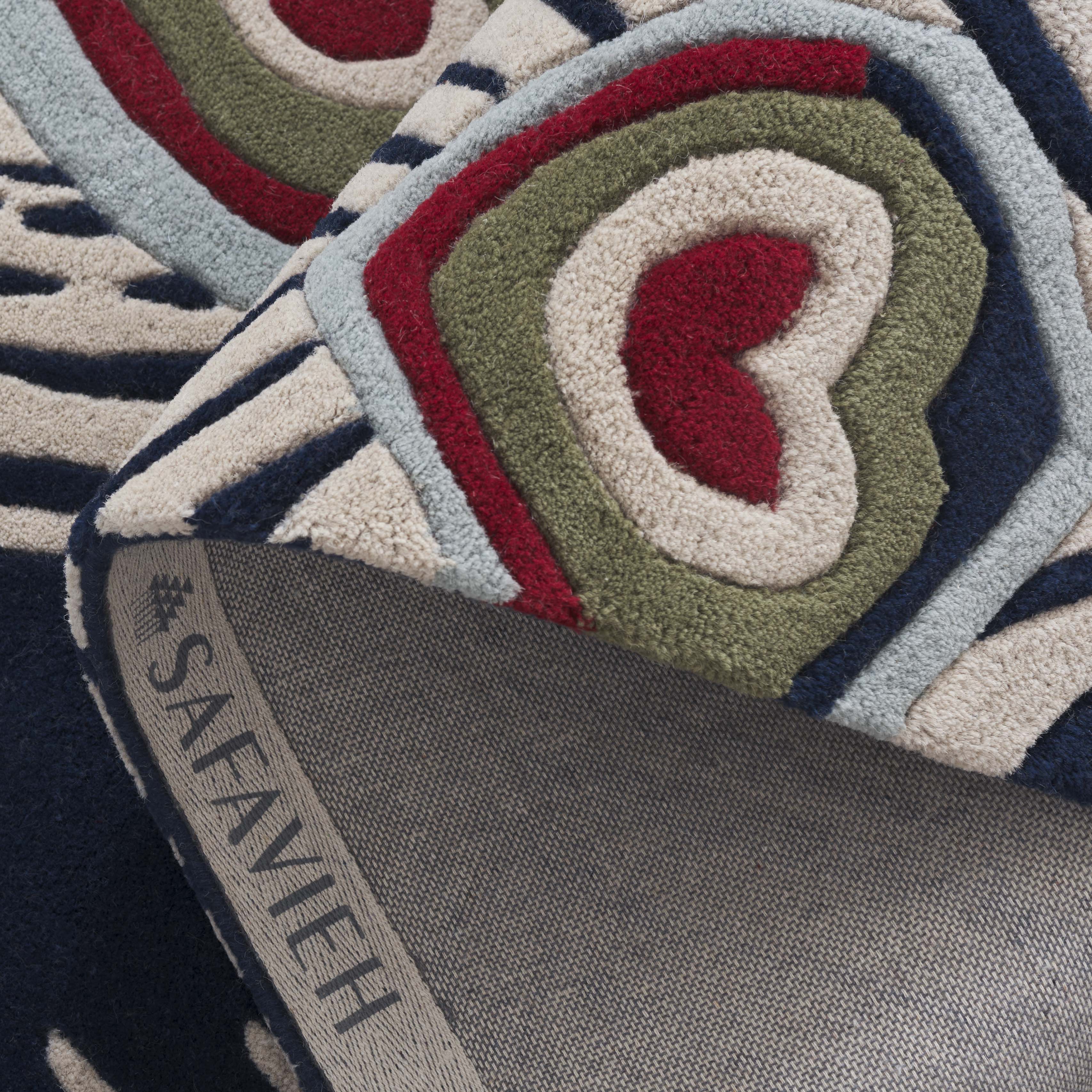 This hand-tufted treasure is meticulously crafted from a sumptuous blend of wool and viscose, offering both durability and a luxurious feel underfoot. The deep blue and ivory hues make for a stunning canvas, brought to life with a vibrant pattern that features whimsical feather-like motifs and playful geometric shapes with heart accents, suggesting a fusion of nature-inspired elements and modern design sensibilities. Its plush height adds a layer of comfort that invites you to step on and enjoy the softness. Perfect for adding a touch of elegance to any small space, this rug is a blend of tradition and contemporary style that will enhance your home decor.