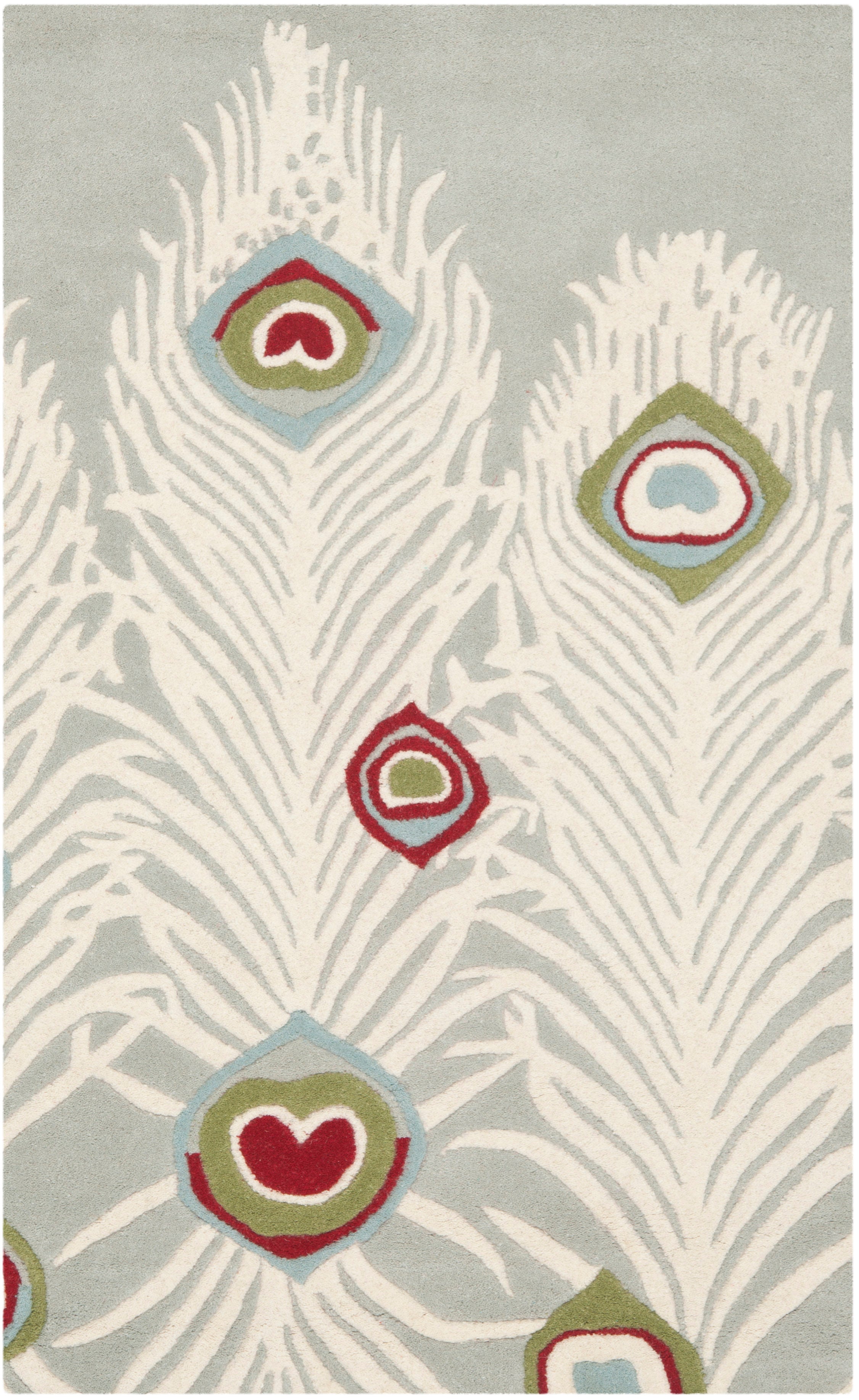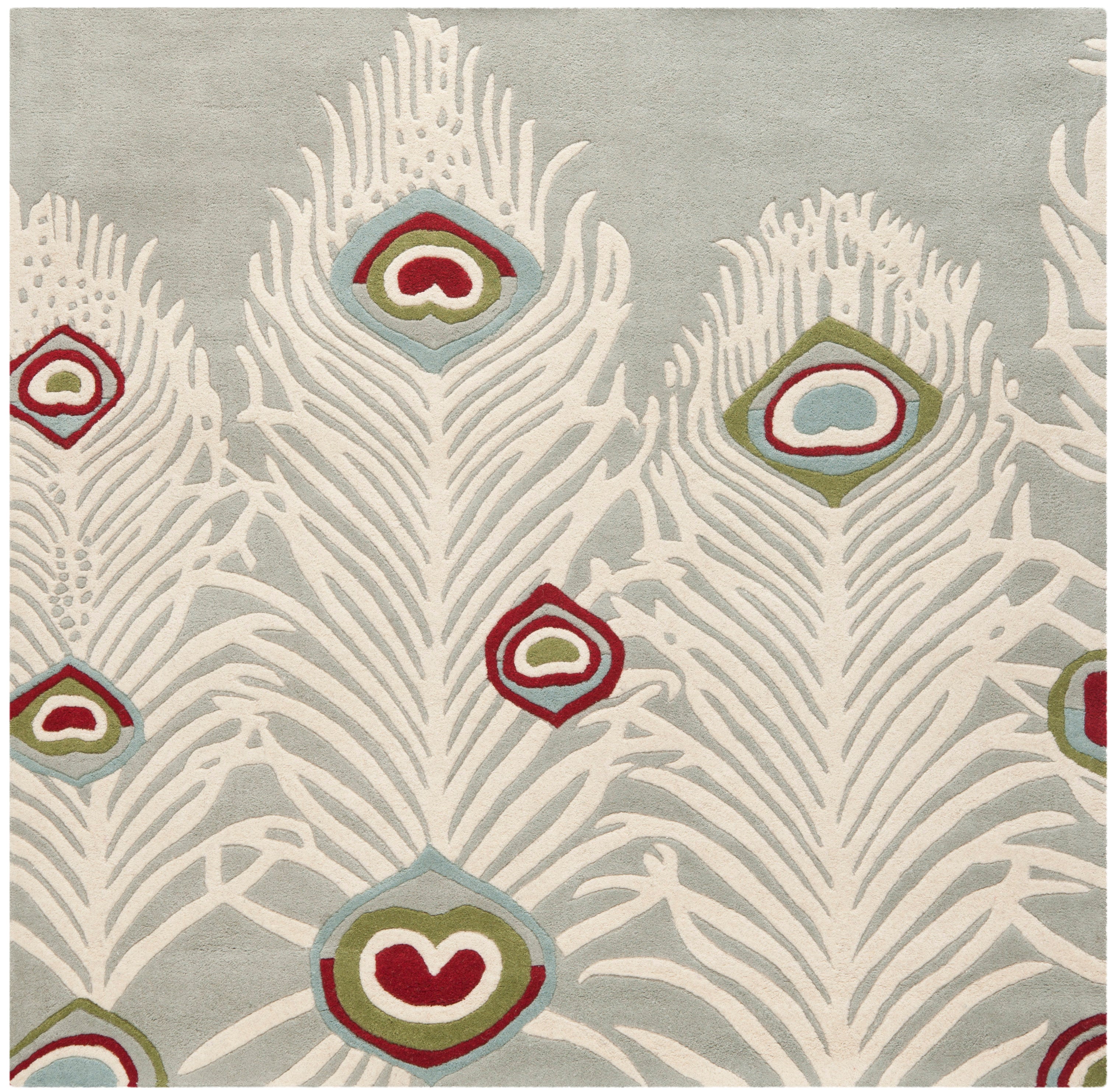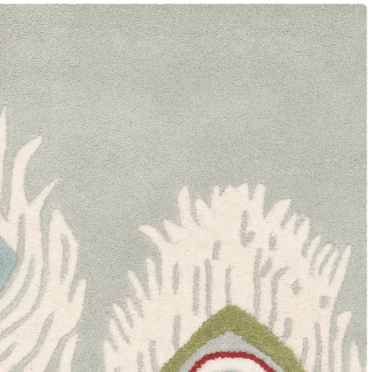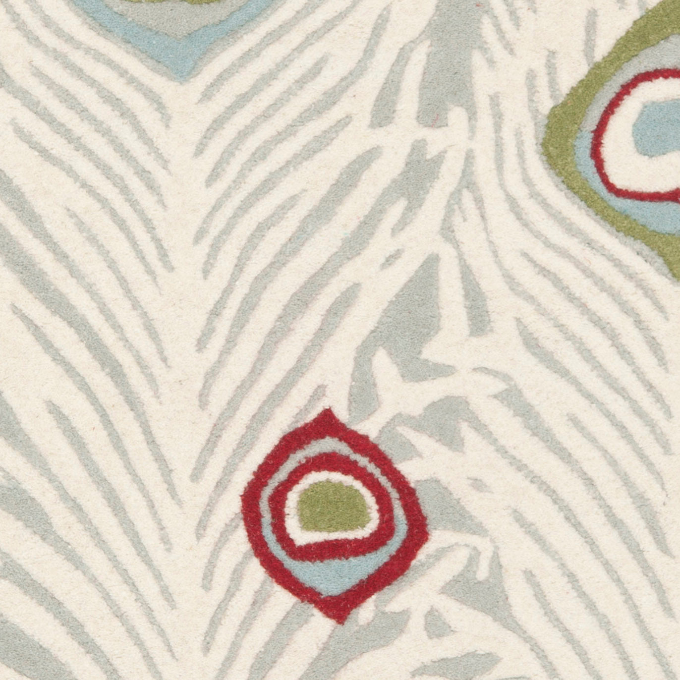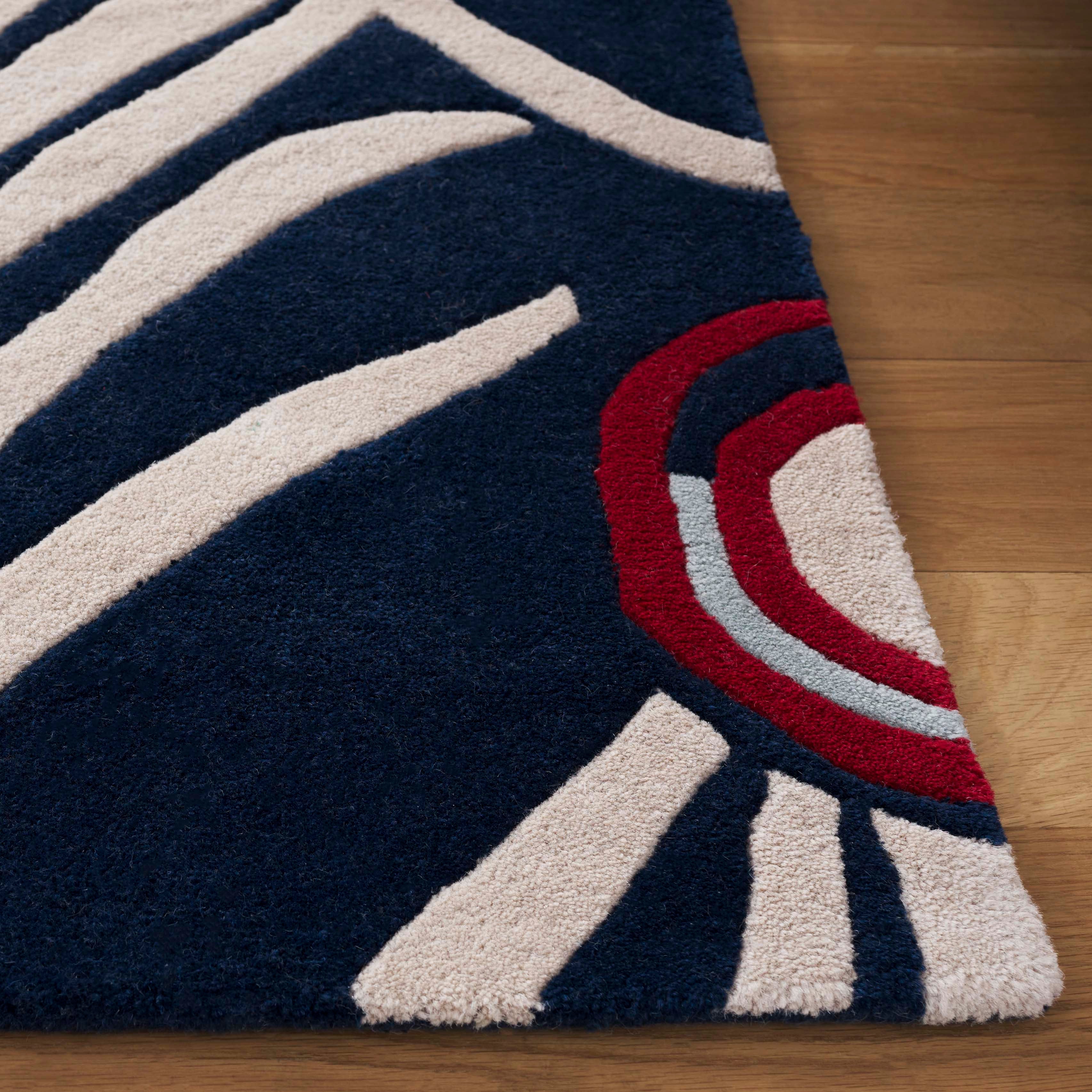 This hand-tufted treasure is meticulously crafted from a sumptuous blend of wool and viscose, offering both durability and a luxurious feel underfoot. The deep blue and ivory hues make for a stunning canvas, brought to life with a vibrant pattern that features whimsical feather-like motifs and playful geometric shapes with heart accents, suggesting a fusion of nature-inspired elements and modern design sensibilities. Its plush height adds a layer of comfort that invites you to step on and enjoy the softness. Perfect for adding a touch of elegance to any small space, this rug is a blend of tradition and contemporary style that will enhance your home decor.