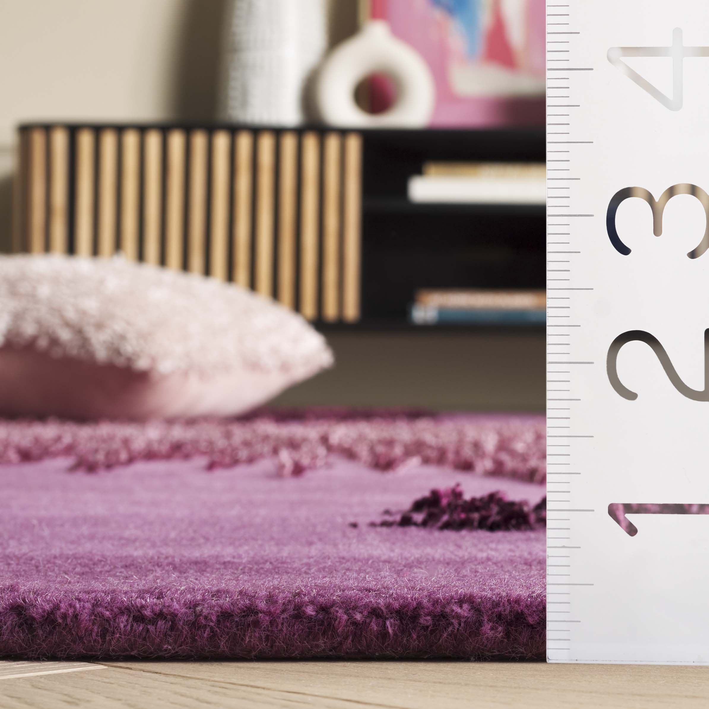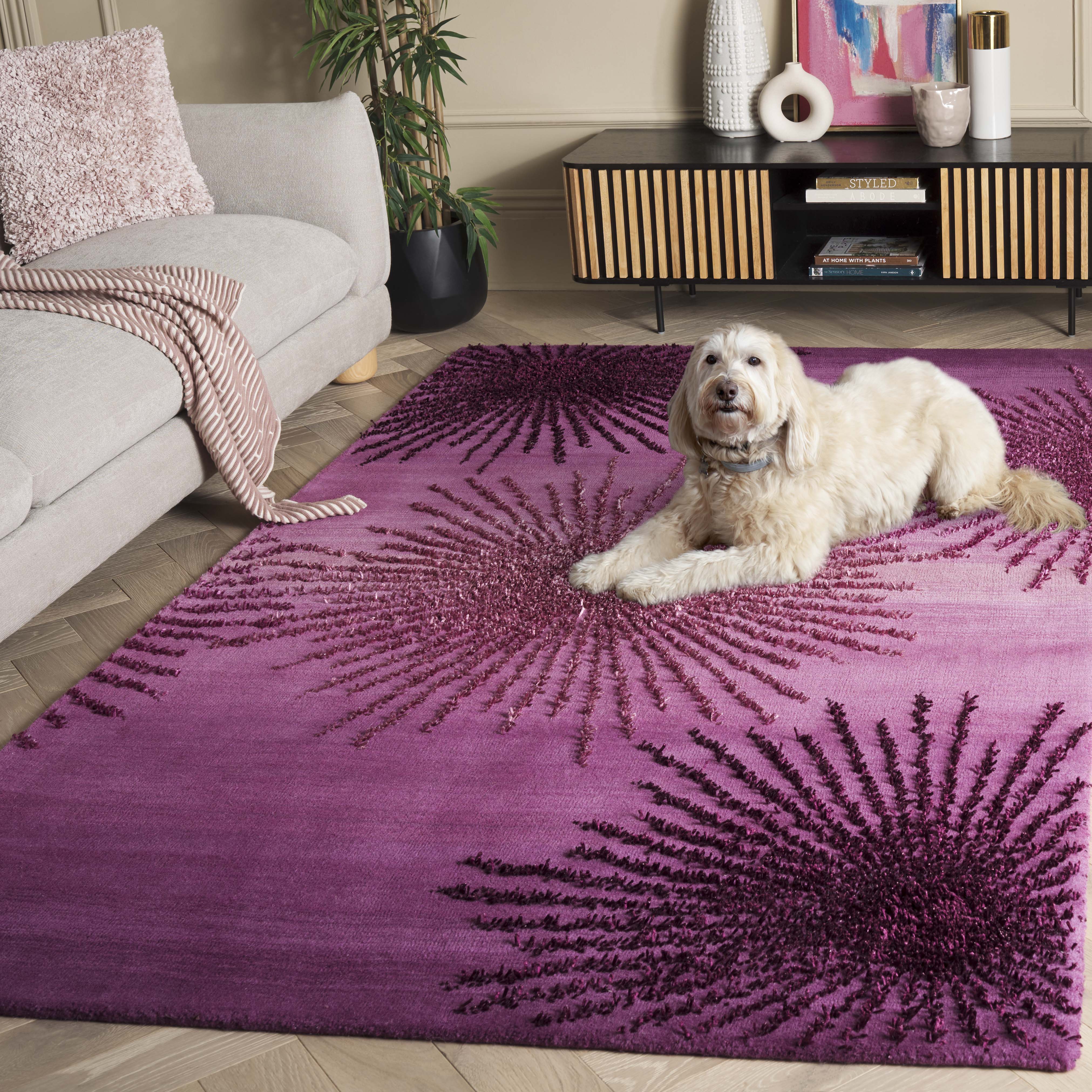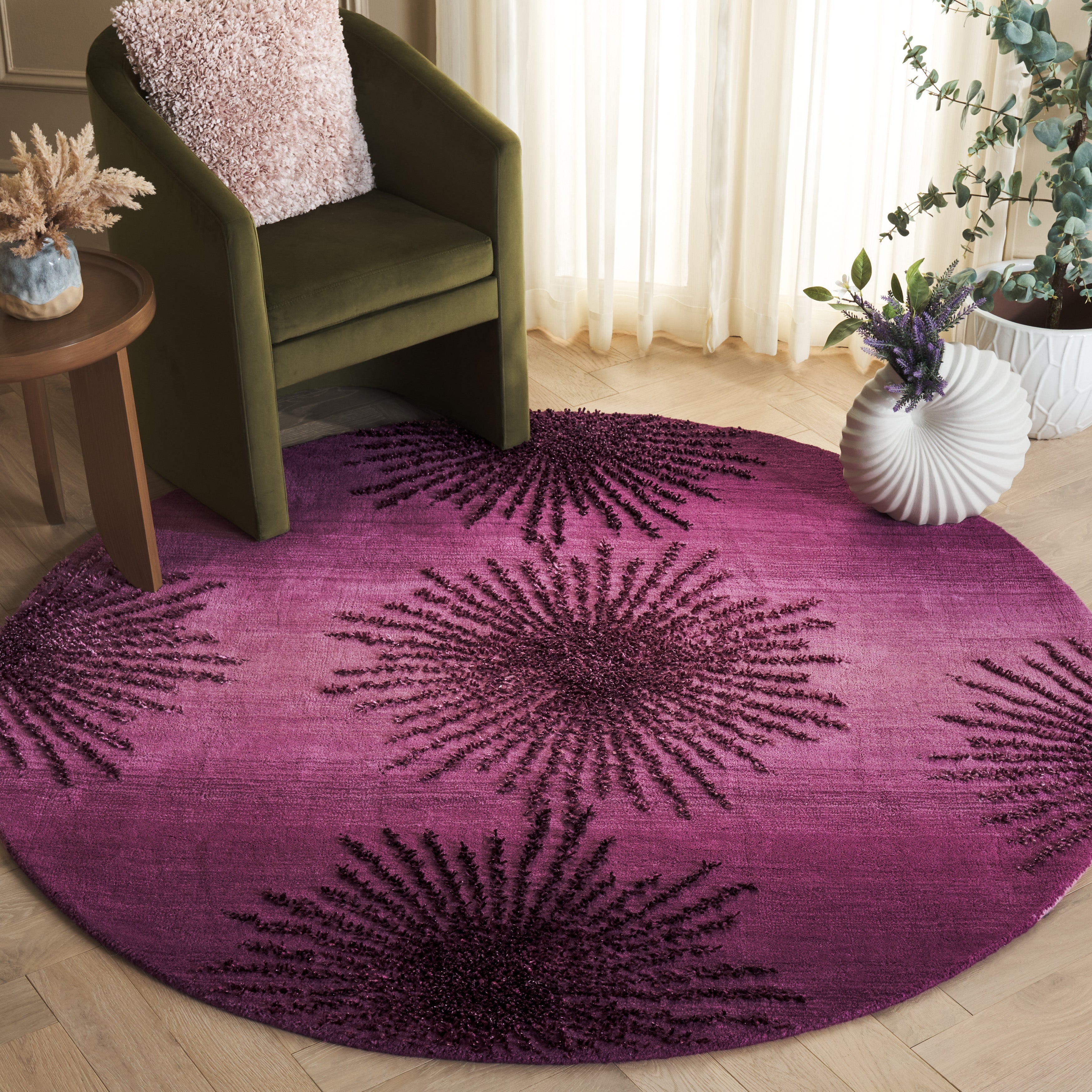 Designed to offer both comfort and style, the rug boasts a plush 5/8" pile height, creating a soft underfoot experience that's hard to resist. The premium wool construction ensures durability and longevity, while viscose accents add a subtle sheen and texture variation that enhances the depth and richness of the design.
