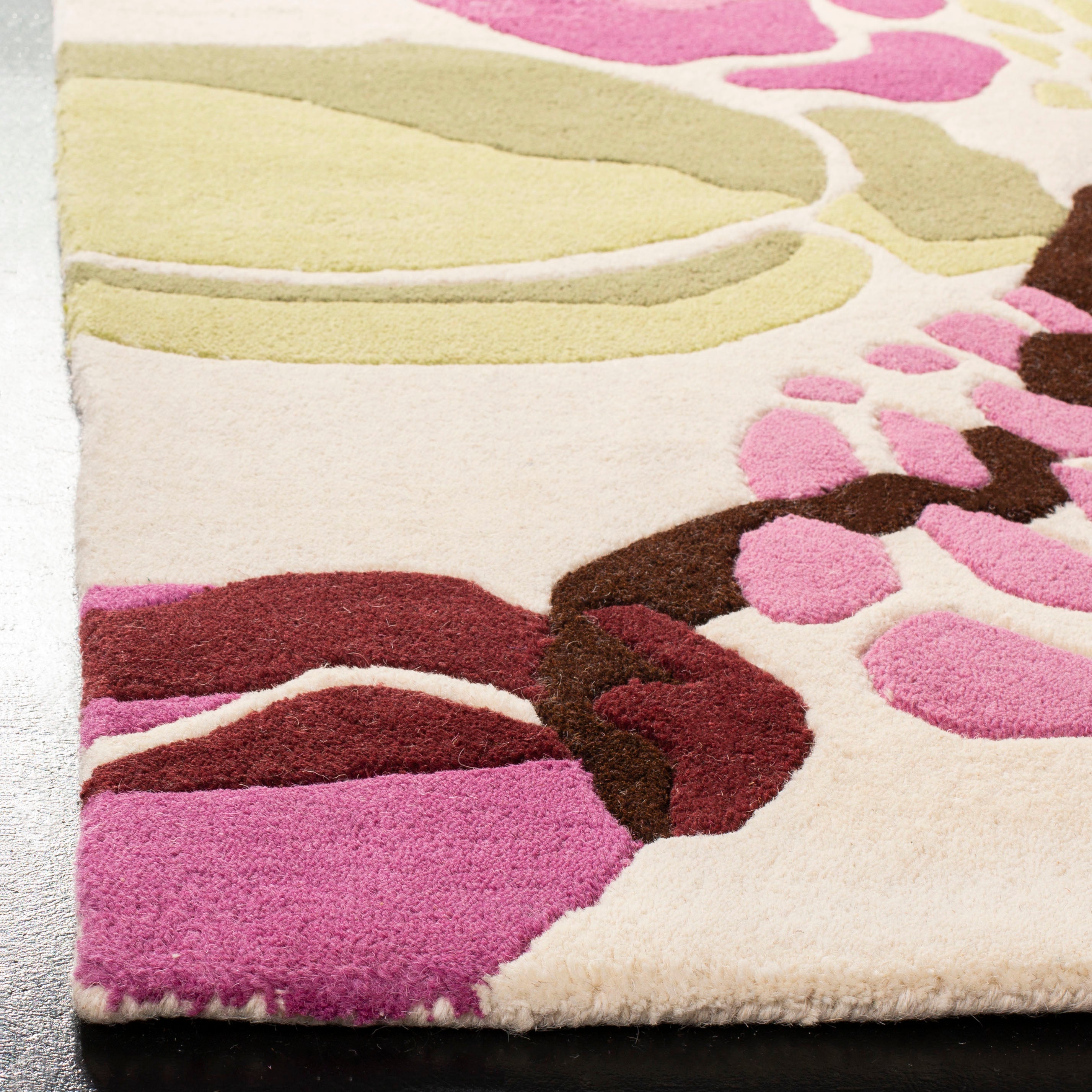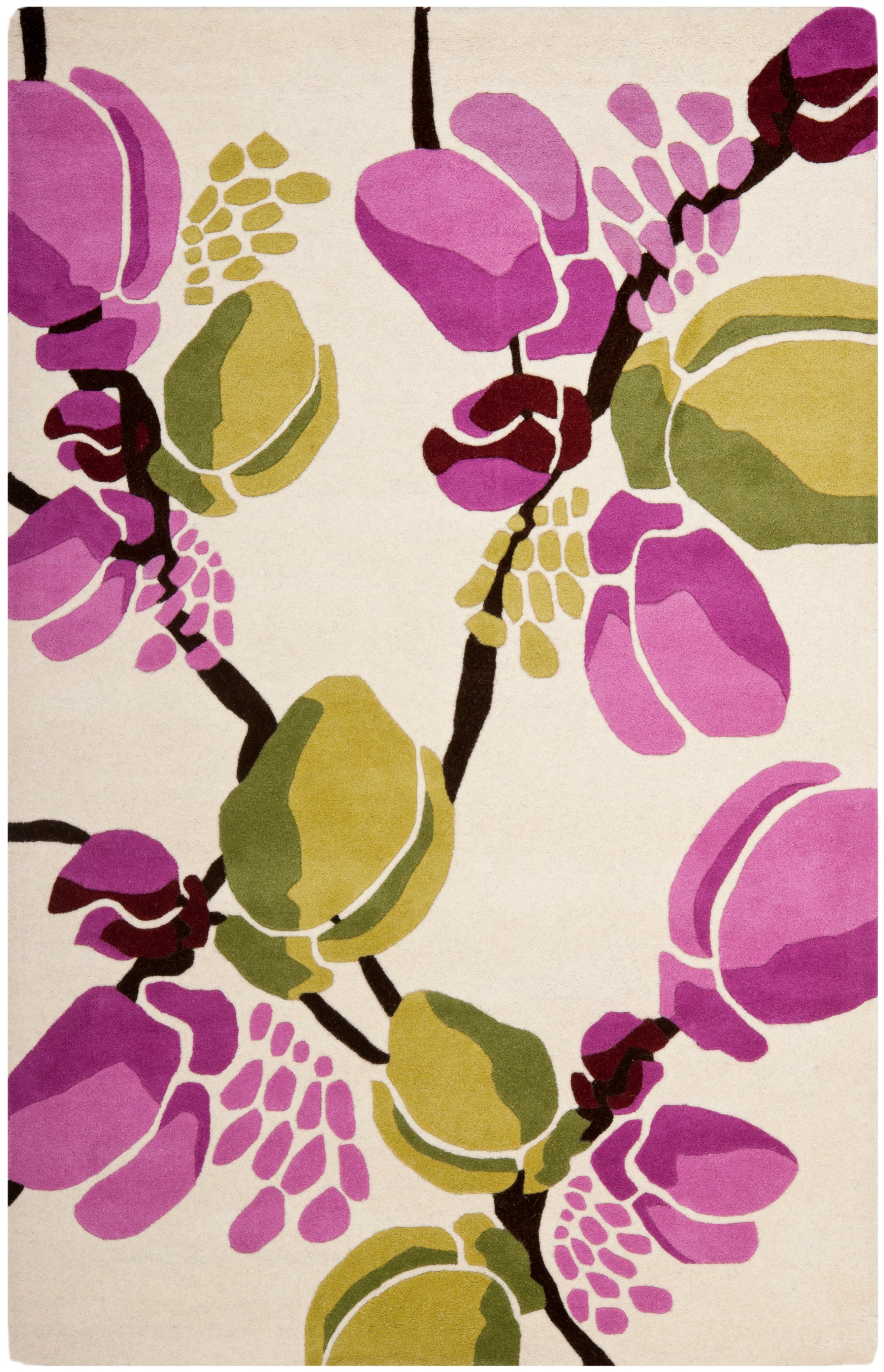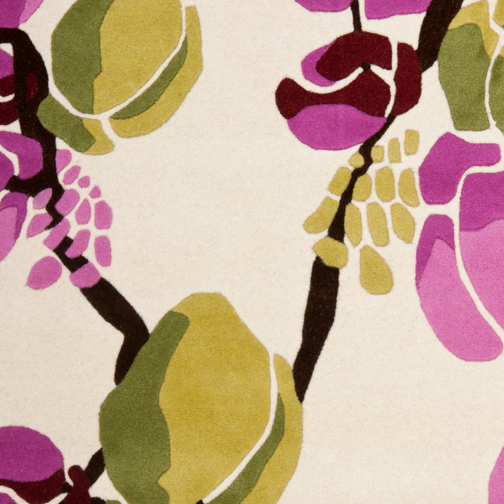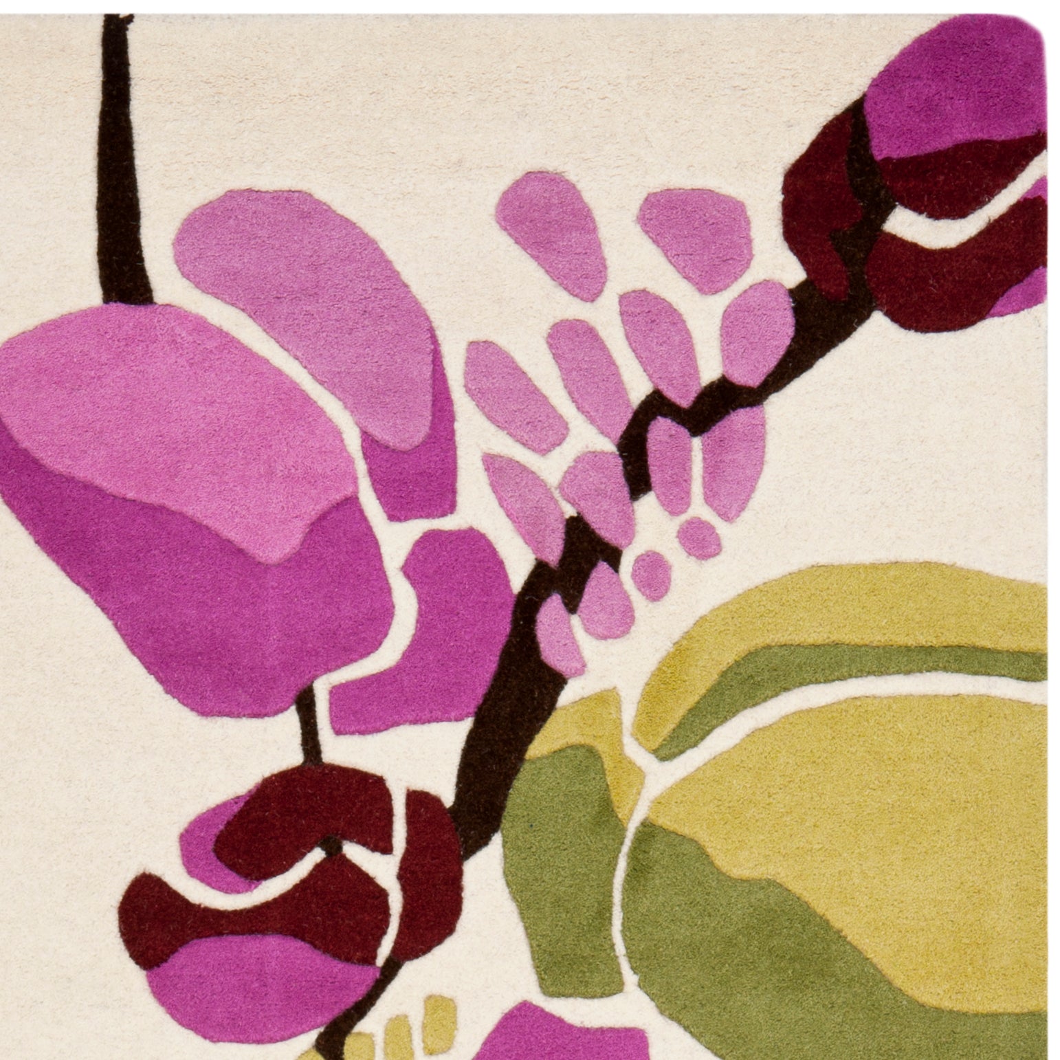 Each expertly crafted piece features an array of blossoming floral motifs, stretching across the rug in an organic and elegant dance. The bold contrast of the deep purples, soothing olives, and gentle ivory creates a stunning visual centerpiece for your room. The delicate balance of wool's durability and viscose's subtle sheen ensures that this rug is not only visually appealing but also luxuriously soft to the touch.