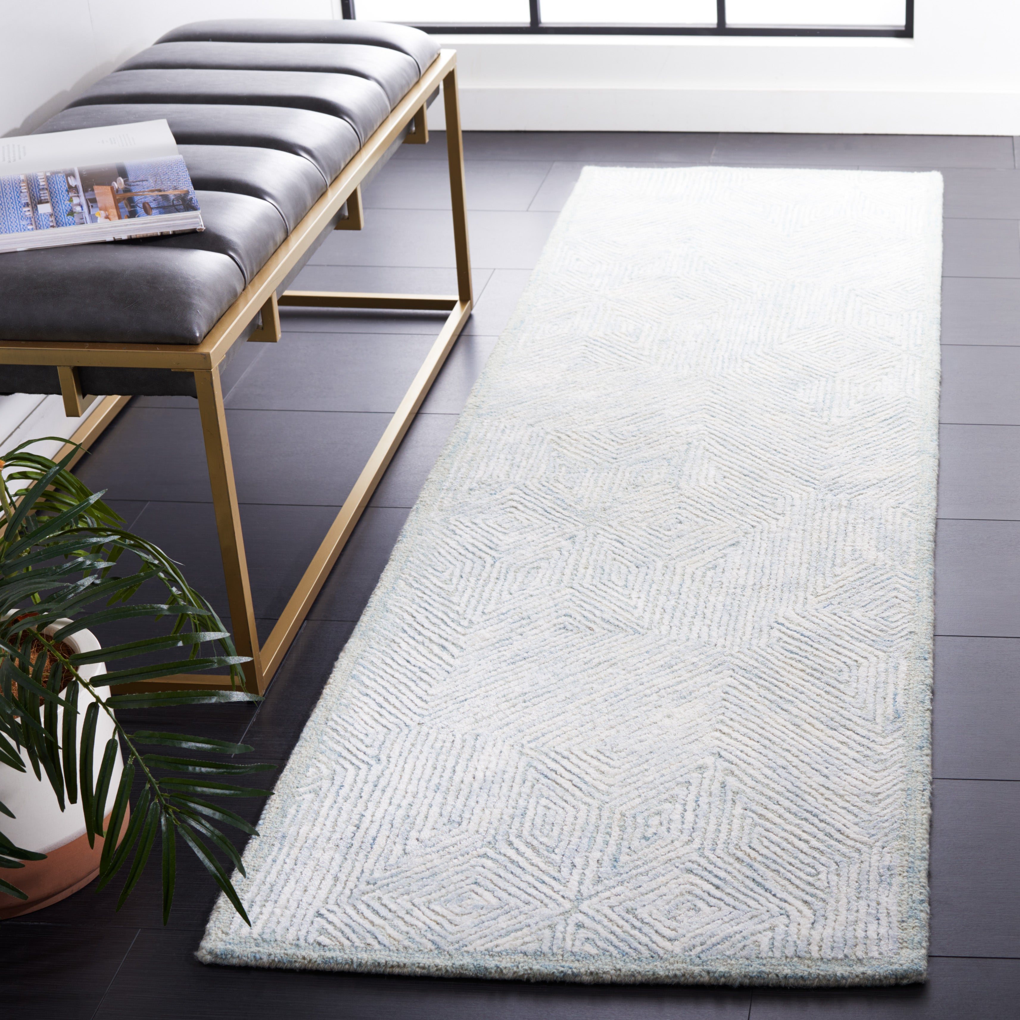 Introducing a chic and contemporary runner that brings elegance to any space. Measuring 2 feet 3 inches by 8 feet, this rug is beautifully crafted in a soothing blend of blue and grey. The geometric pattern adds a modern flair, making it a striking addition to hallways or narrow spaces.