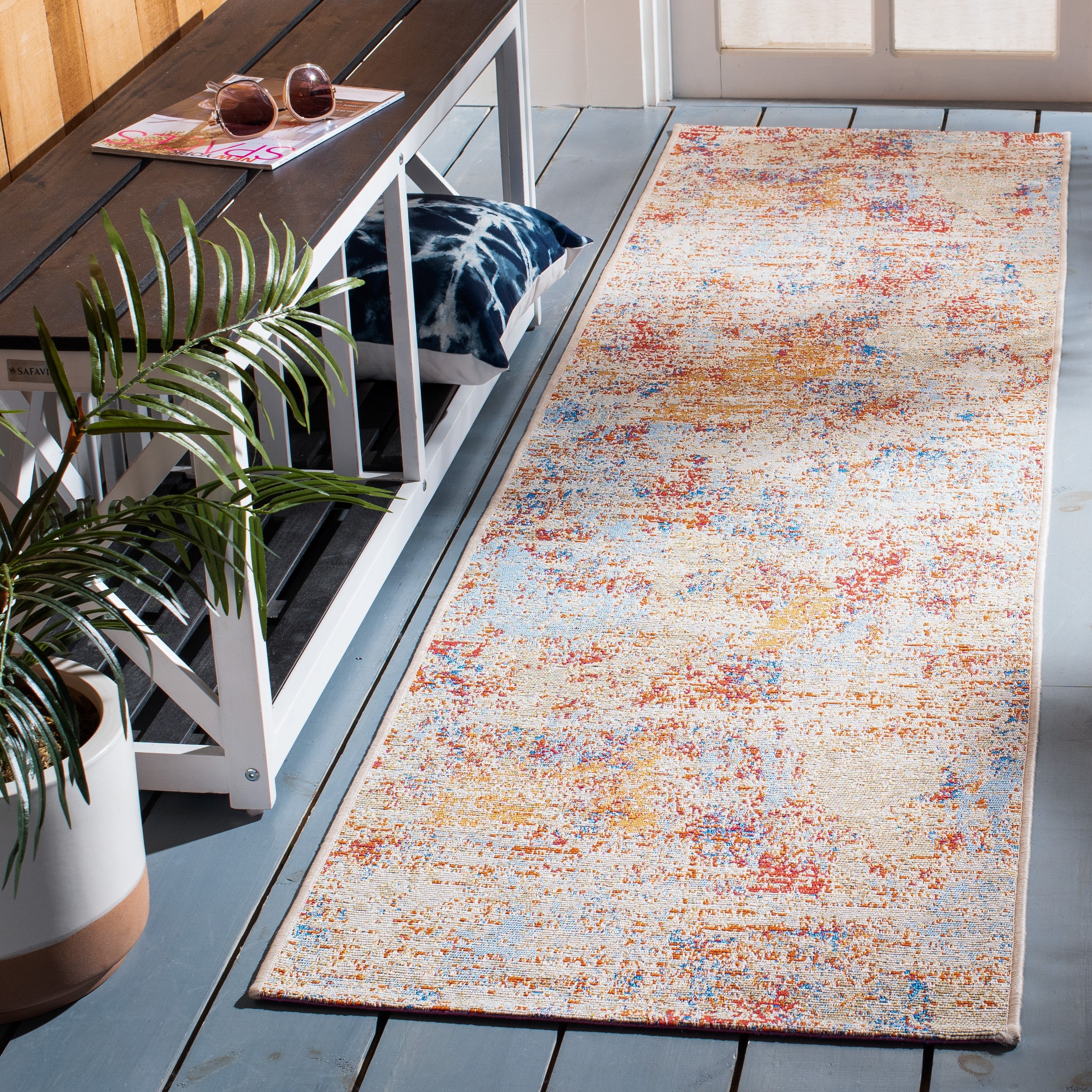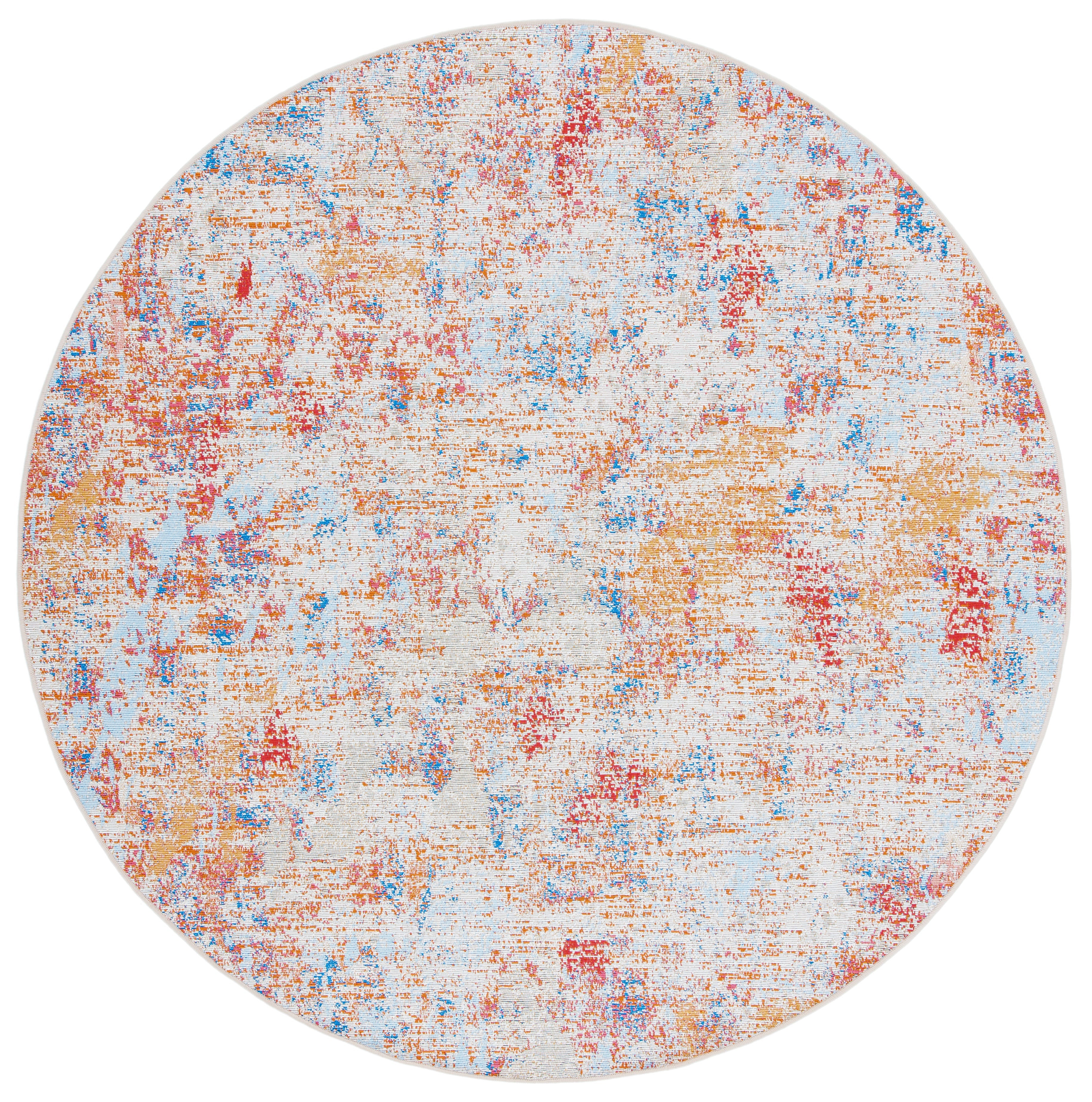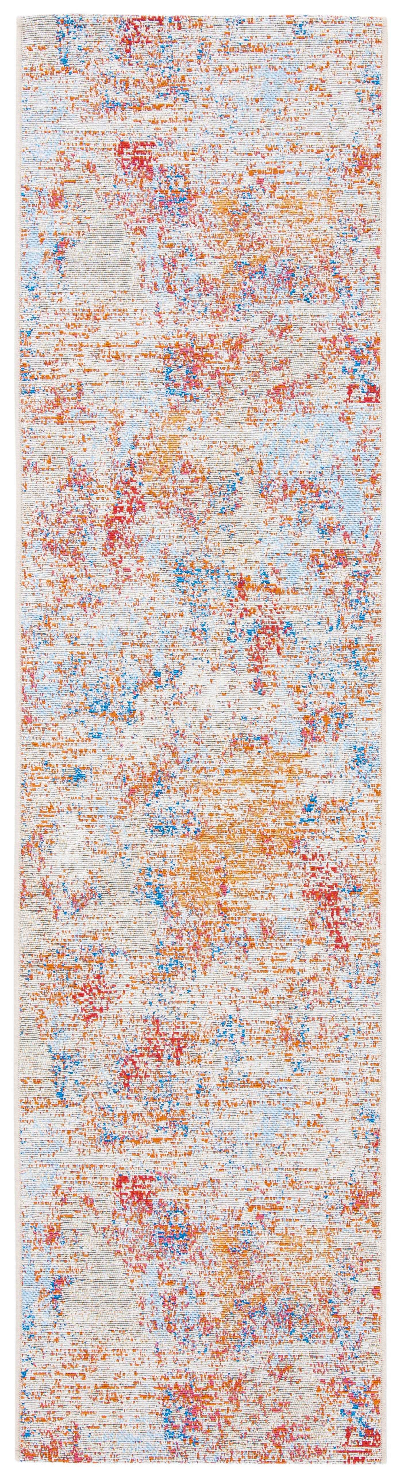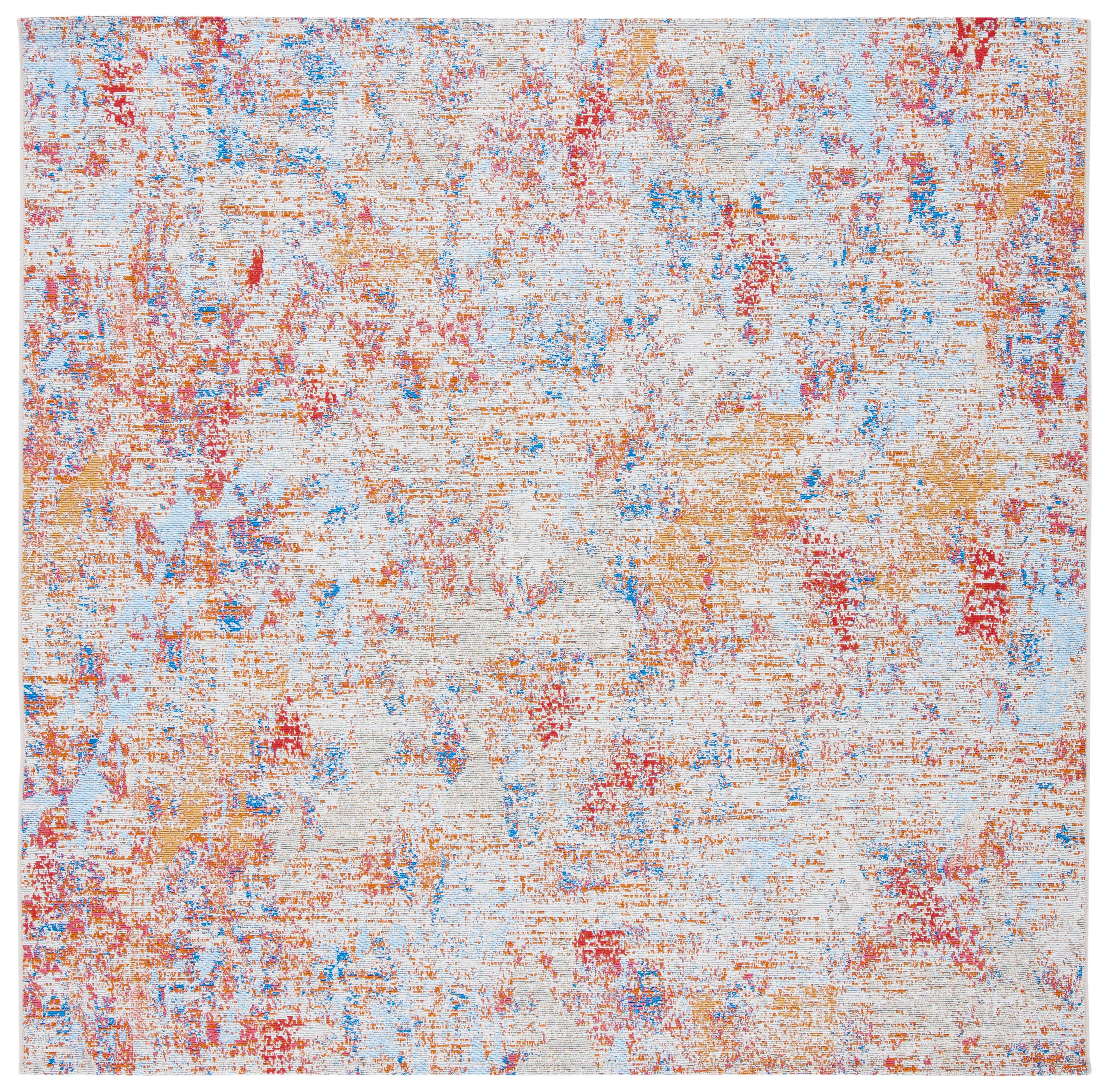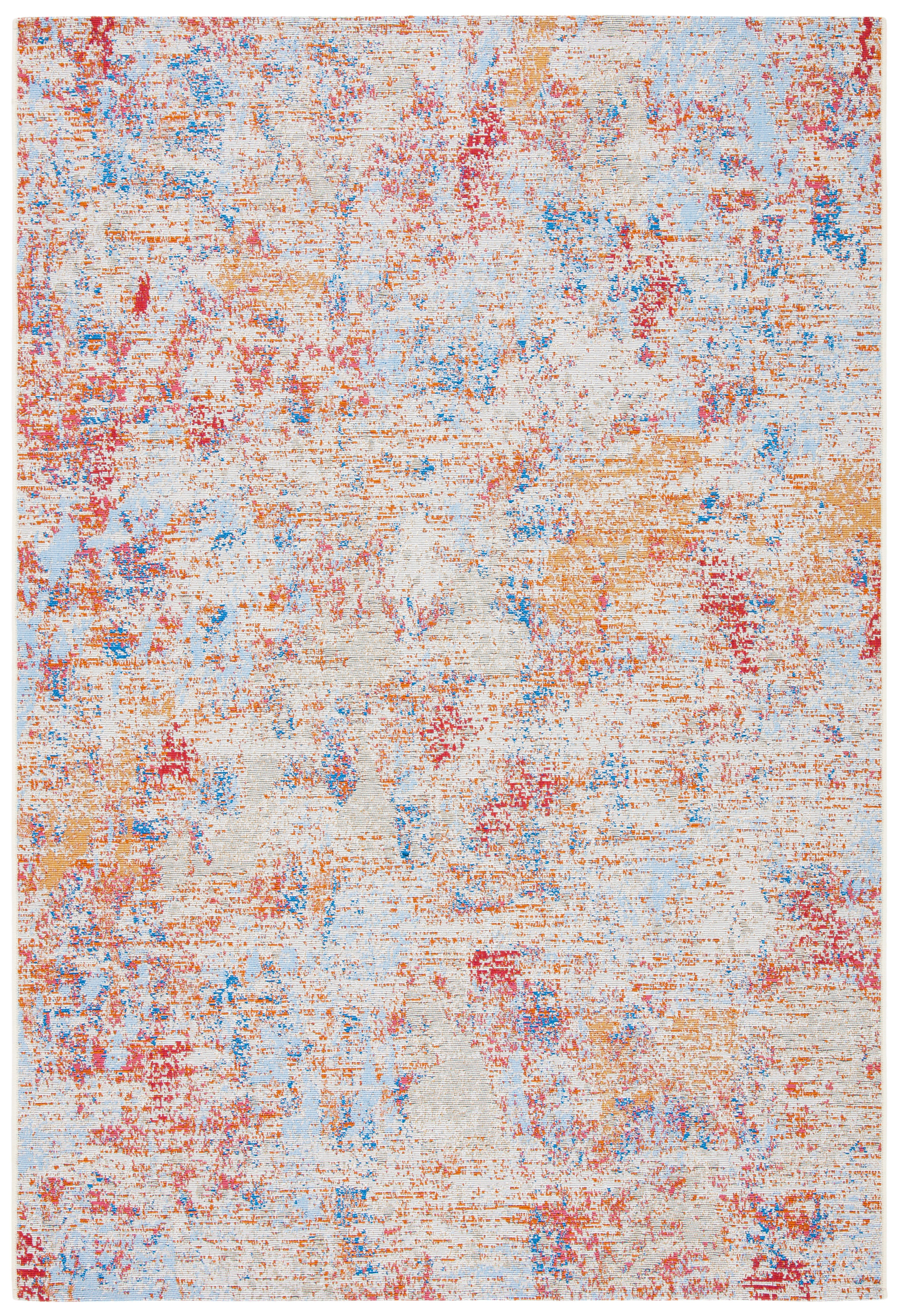 The rug's design boasts a modern blend of ivory and light blue tones, peppered with vibrant splashes of color that create a statement piece for any room or outdoor space. The abstract pattern evokes the look of an artist's canvas, offering an effortless contemporary flair that complements a wide range of decor styles.