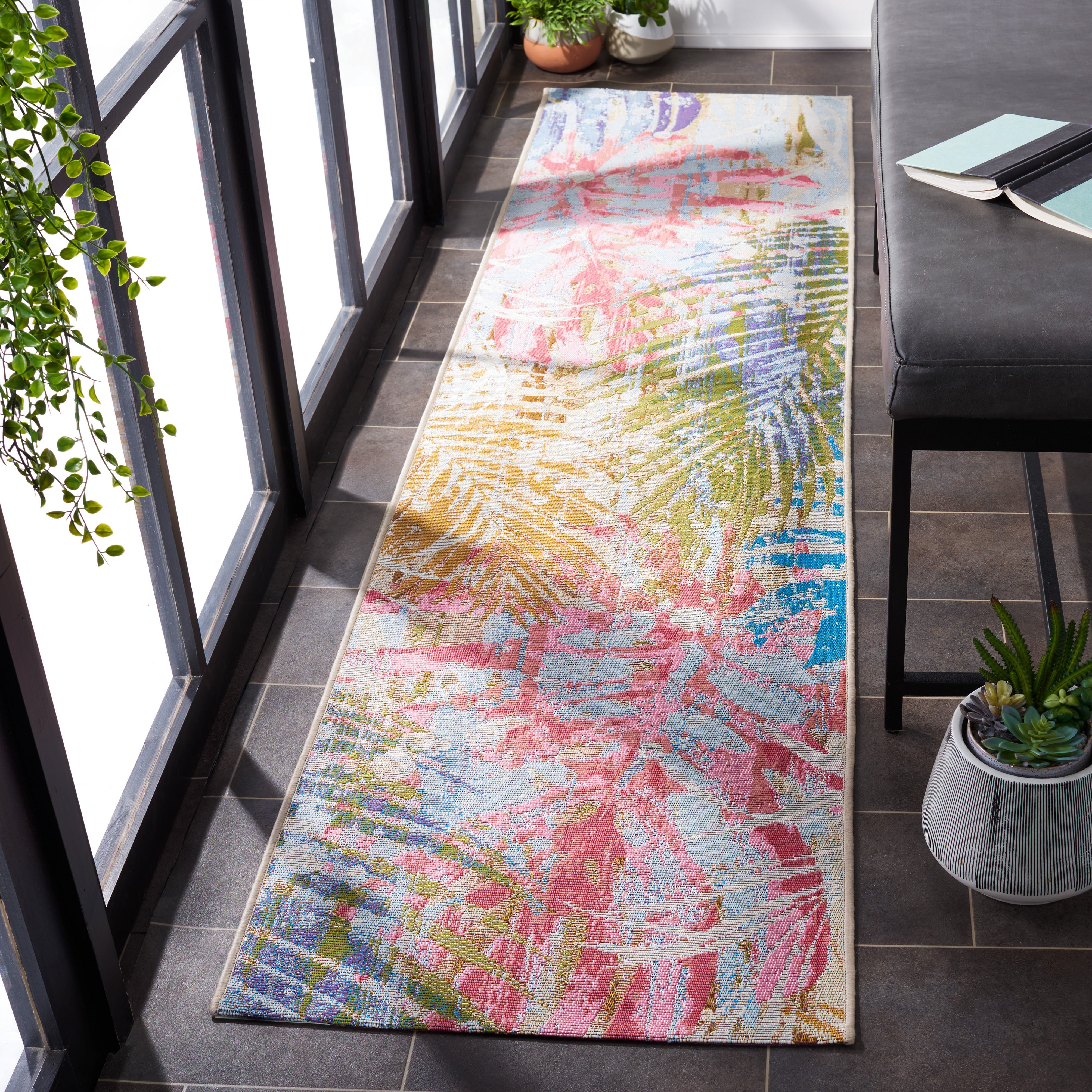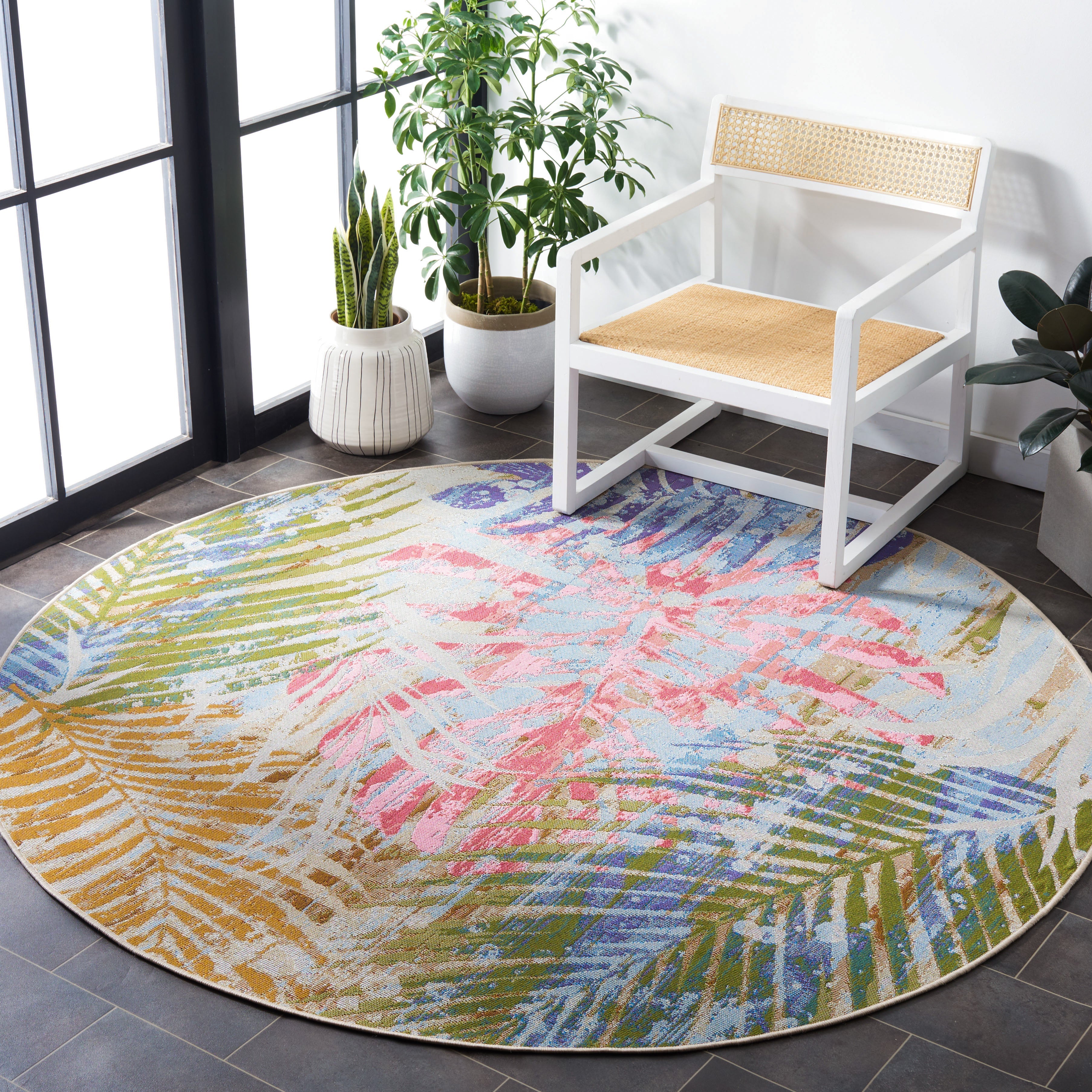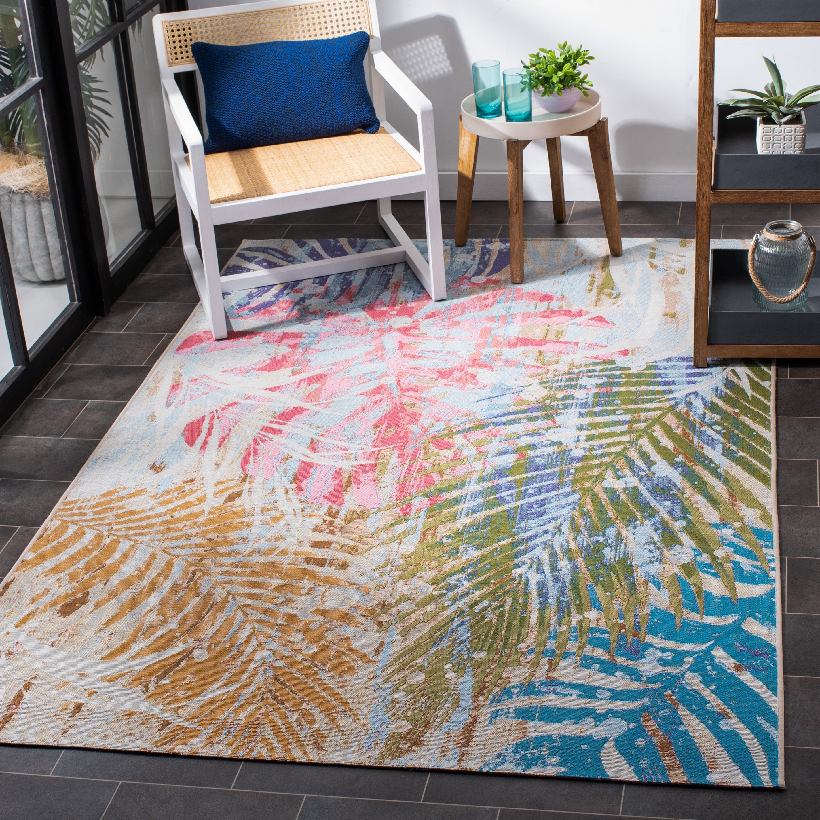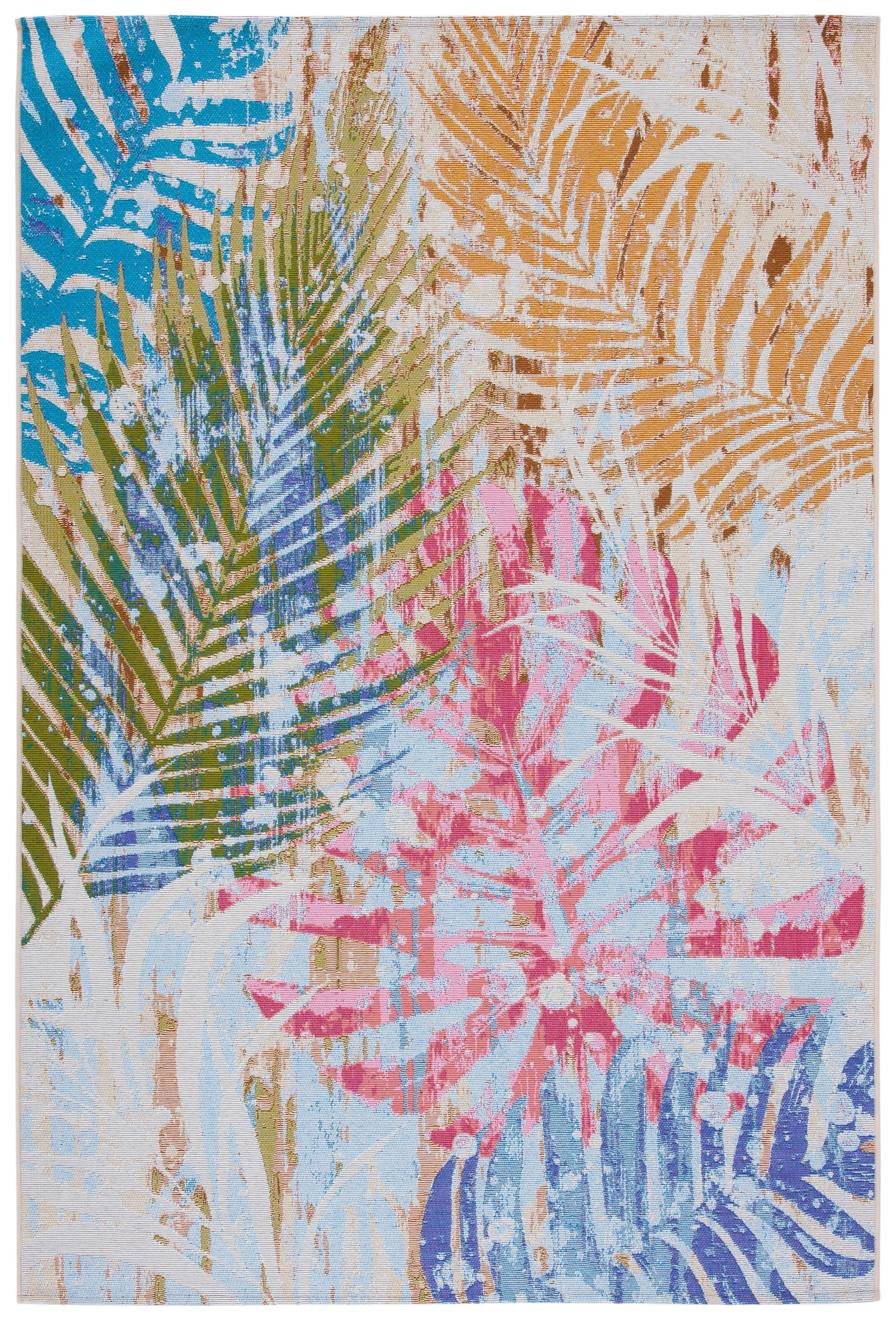 The rug's durable construction of 76% polypropylene and 23% polyester, reinforced with 1% backing material, ensures a long-lasting resilience that matches the timeless beauty of its pattern. Speaking of its design, the rug features a delightful mix of tropical and abstract elements, blending palm leaf silhouettes with a modern, painterly approach that adds an expressive touch to any setting.
