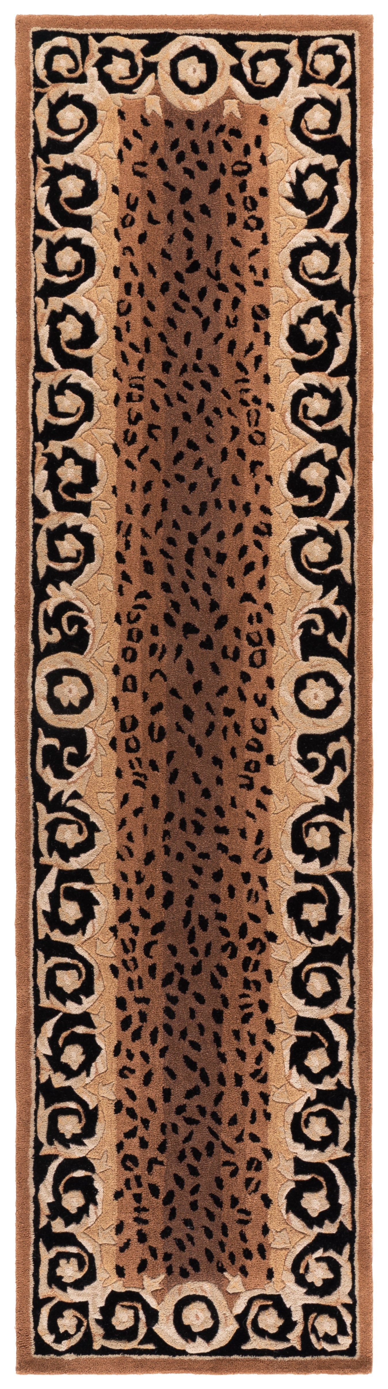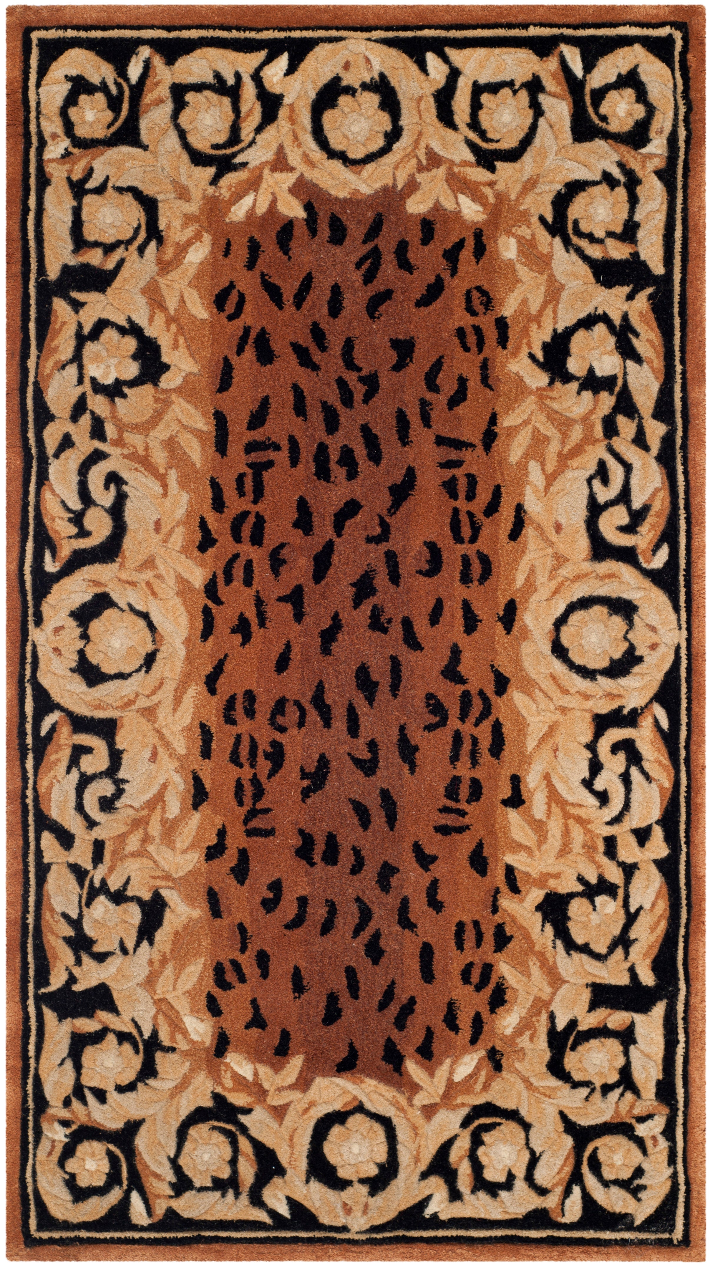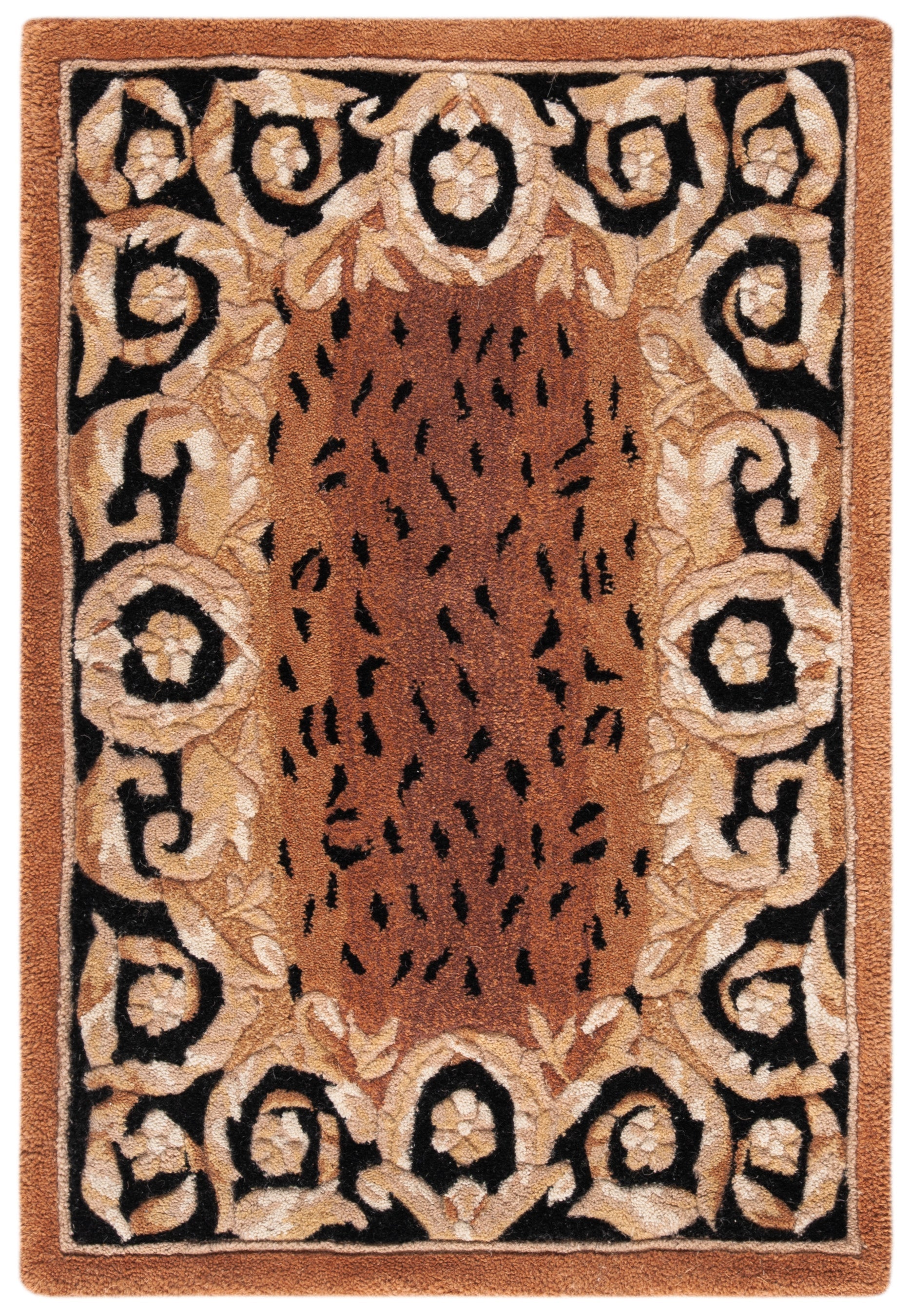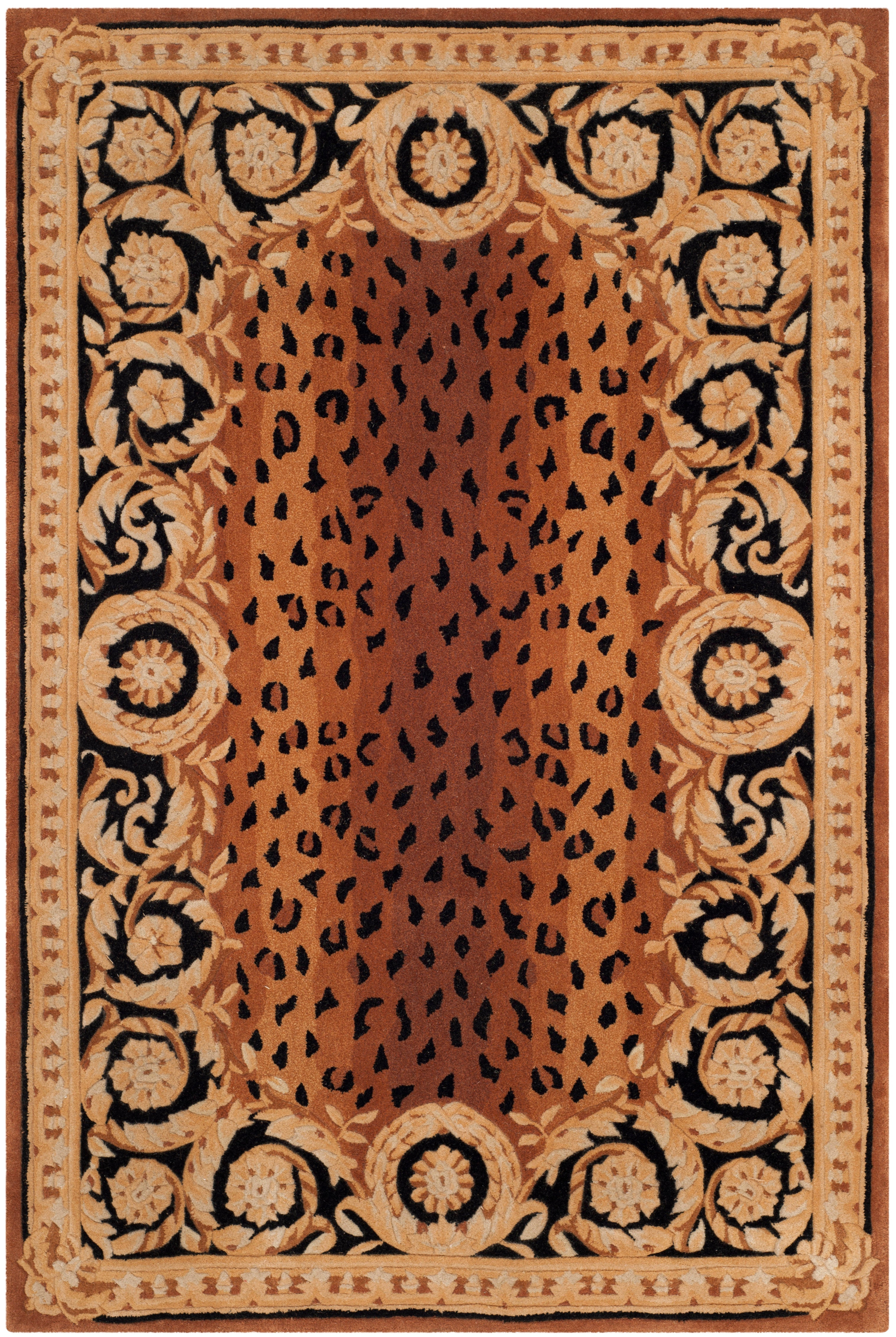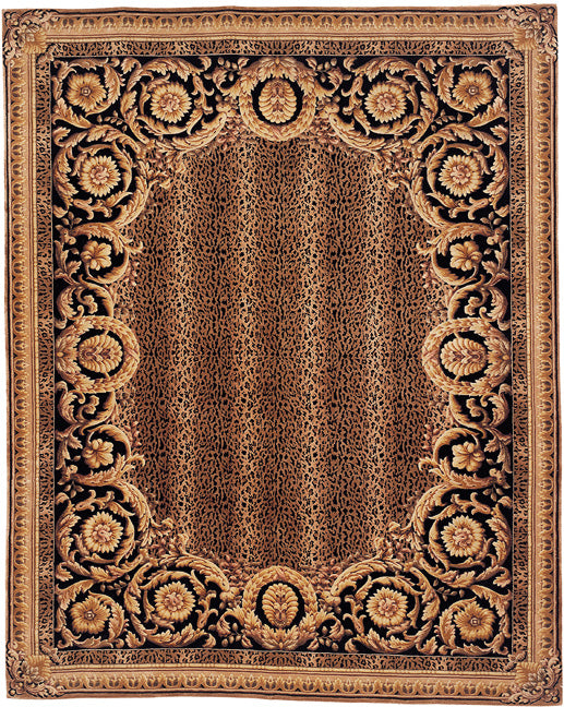 Crafted with the utmost care from the finest wool, our rug features a compelling black and gold color palette that commands attention and adds a touch of opulence to your home decor. The ornate design, as seen in the image provided, exhibits a rich blend of floral and vine motifs, bordered with an intricate pattern that frames the rug beautifully.