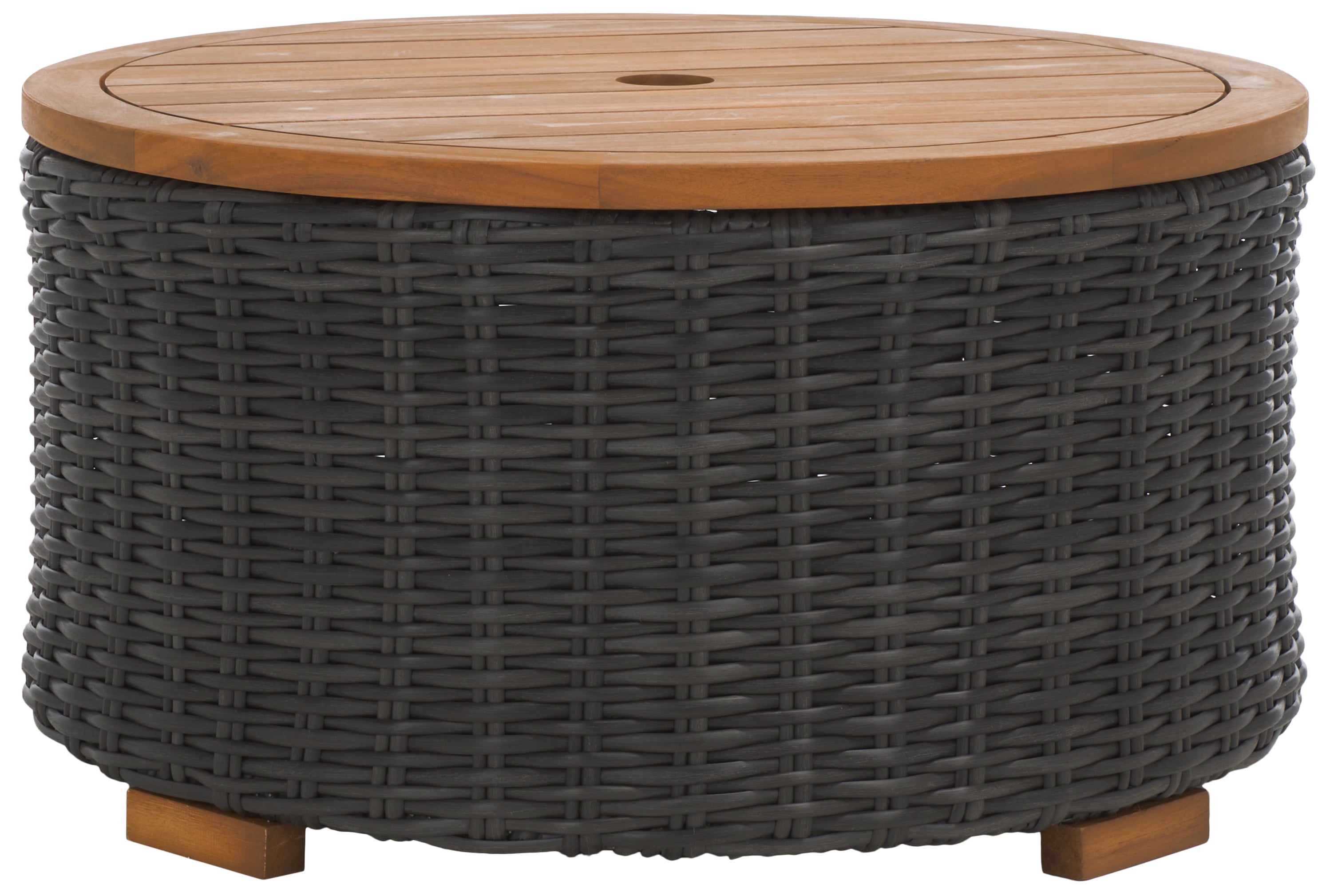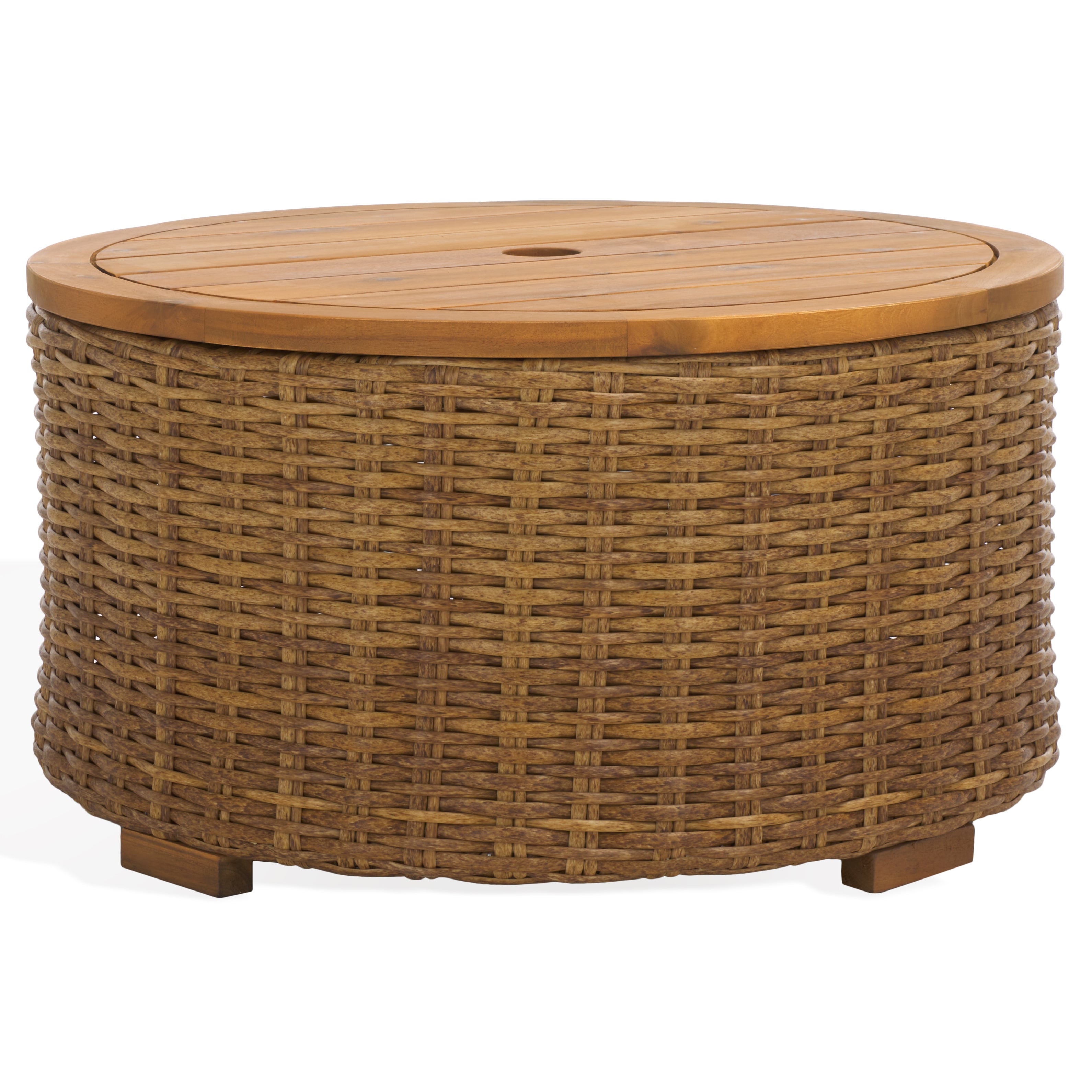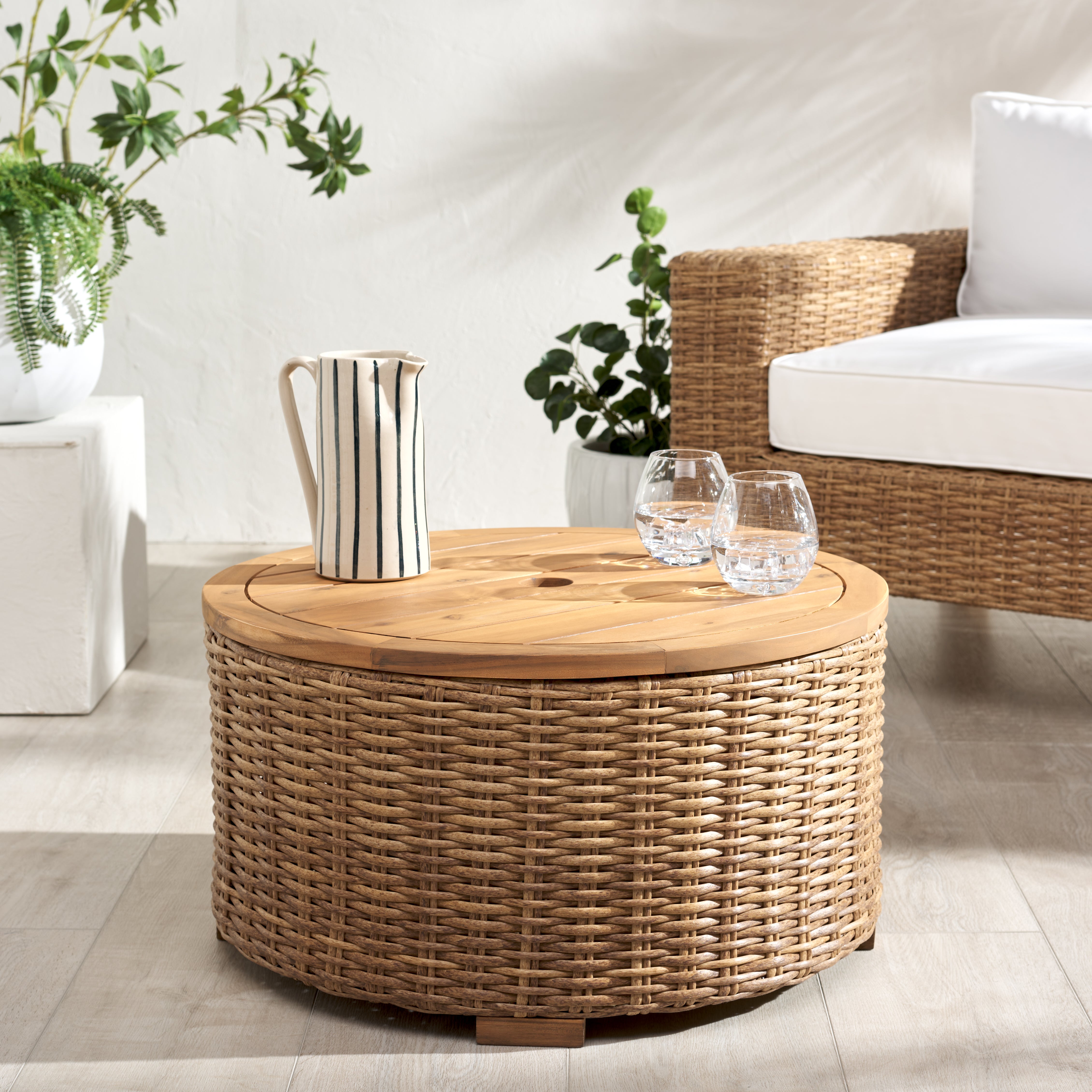 Give a chic and elegant update to your patio with our Anguilla outdoor coffee table. Our coffee table brings textural warmth and practical appeal to any outdoor space. An all-weather wicker weave lends breezy sophistication to the table. Its perfectly rounded tabletop is crafted from acacia with a stunning slatted detail. The tabletop can be removed to provide storage for dumping your coasters, throw pillows, and other essentials. Perched upon powder-coated legs, our coffee table can serve as an elegant and practical centerpiece for your patio, terrace, or sunroom.