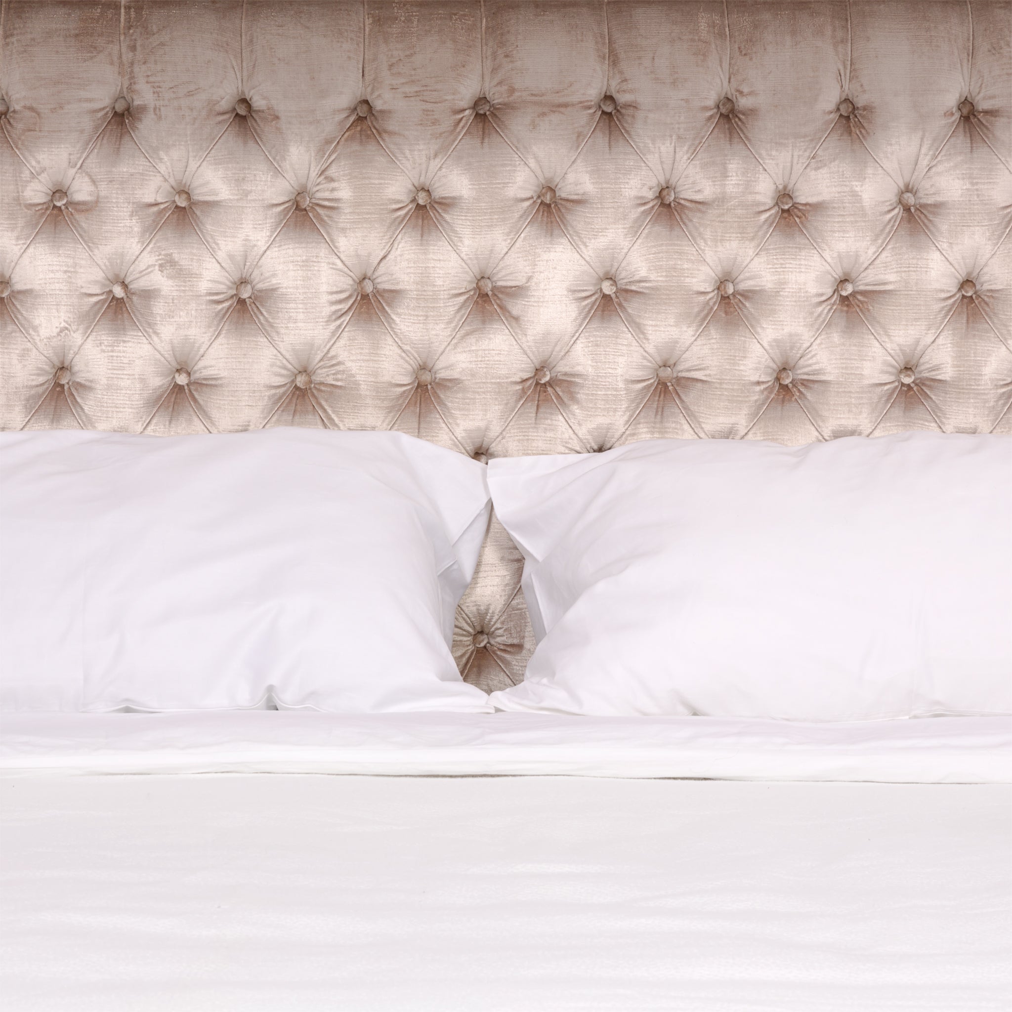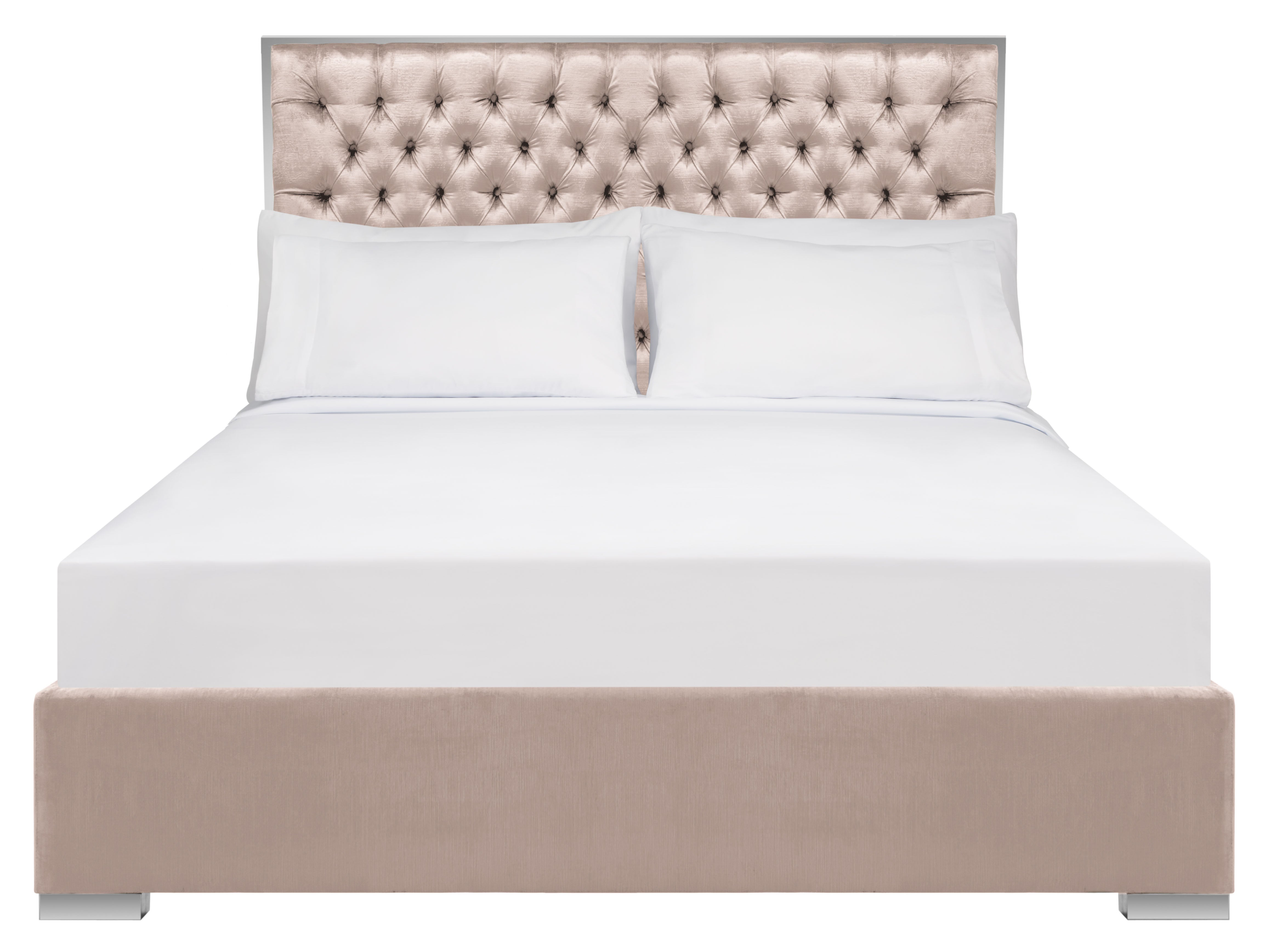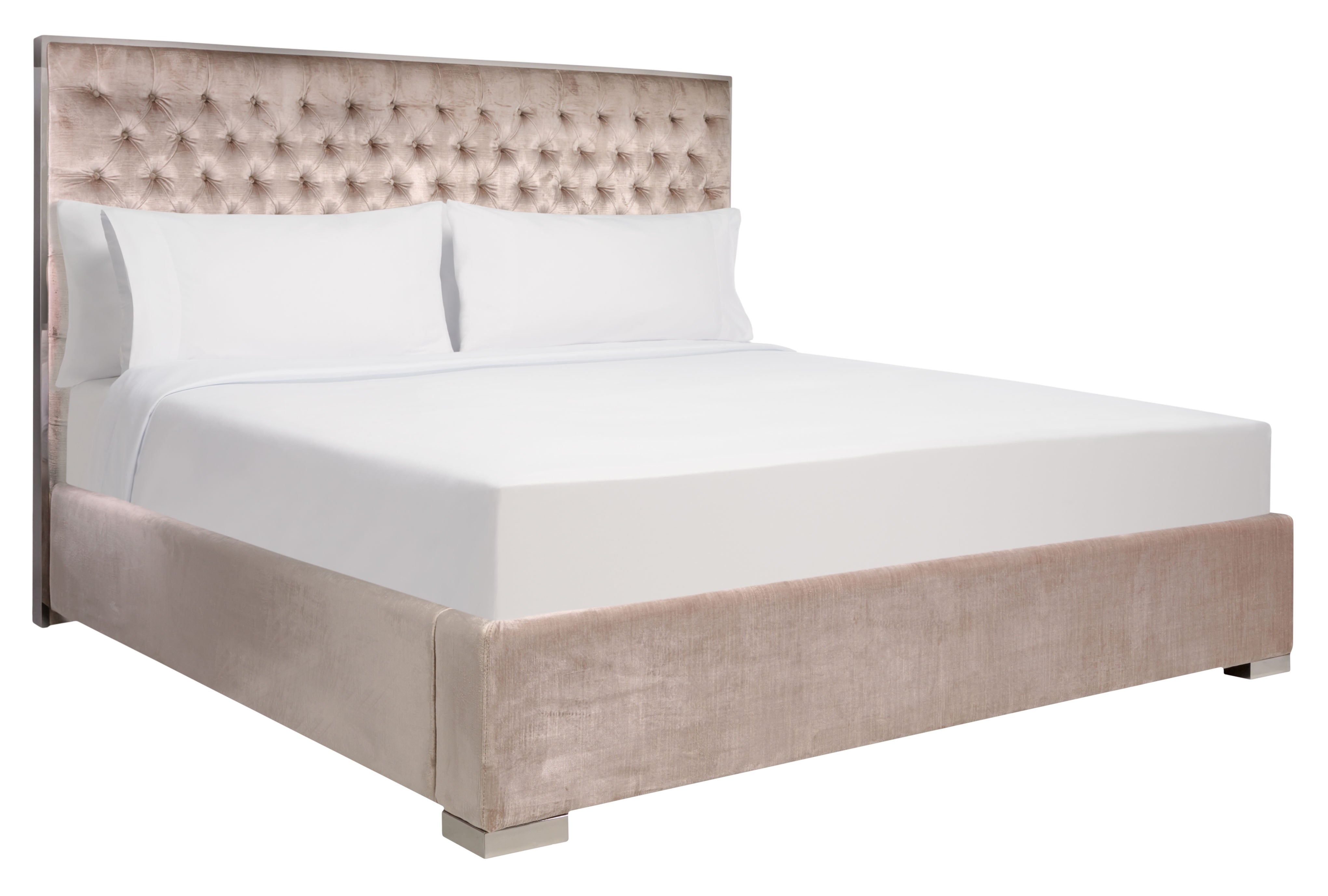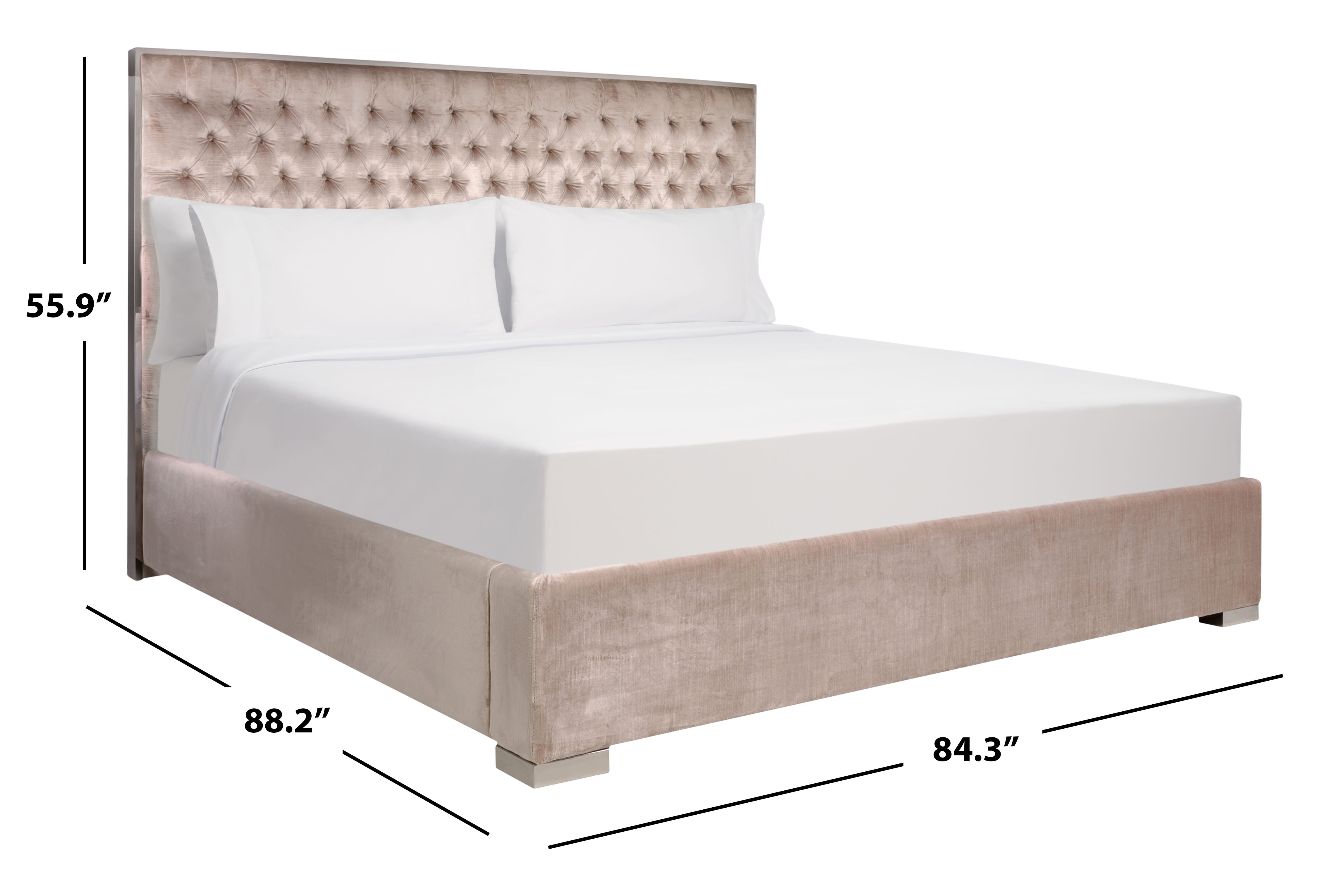The deep button tufting of a classic Chesterfield sofa is reimagined in a more modern interpretation of luxury in the fully upholstered Chester king bed by Safavieh Couture. Lavishly quilted and buttoned, and covered with pearl velvet in a lustrous blend of viscose and cotton yarns, this transitional king size bed is the ultimate blend of comfort, glamour and sophistication.