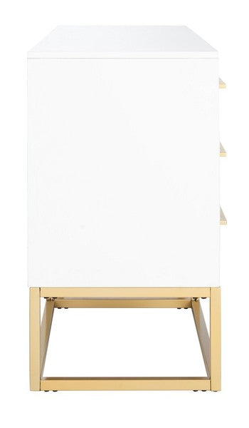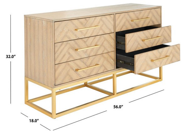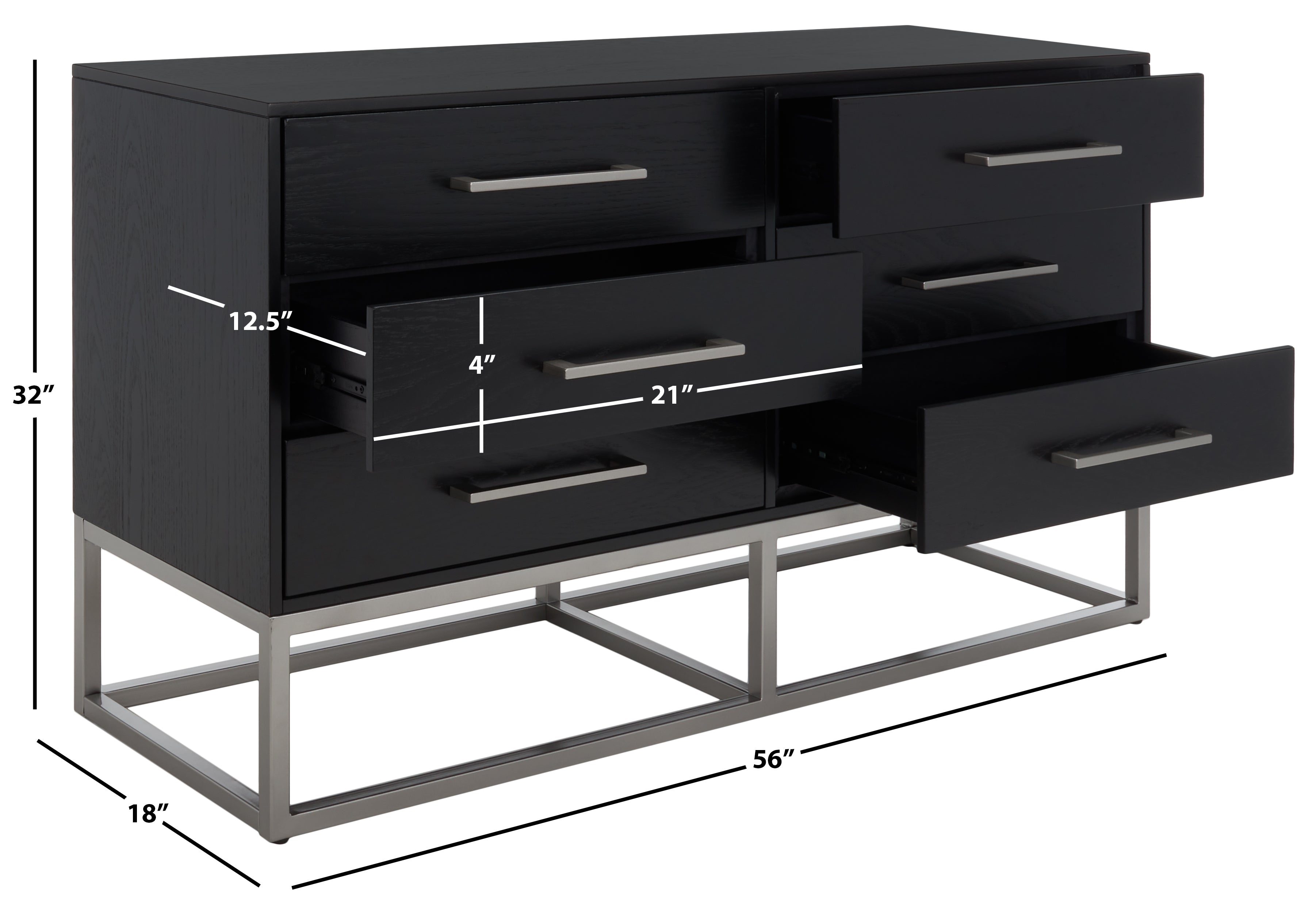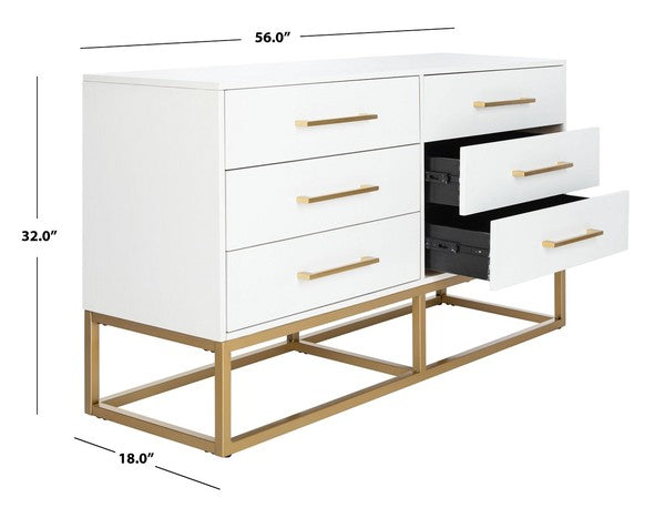 Alive with dynamic chic, this Estelle Dresser brings instant charm to any bedroom. Estelle's finish is glamorously accented by sleek metal pulls and matching open frame, making a bold modern statement. Storage-savvy designers love its six drawers.