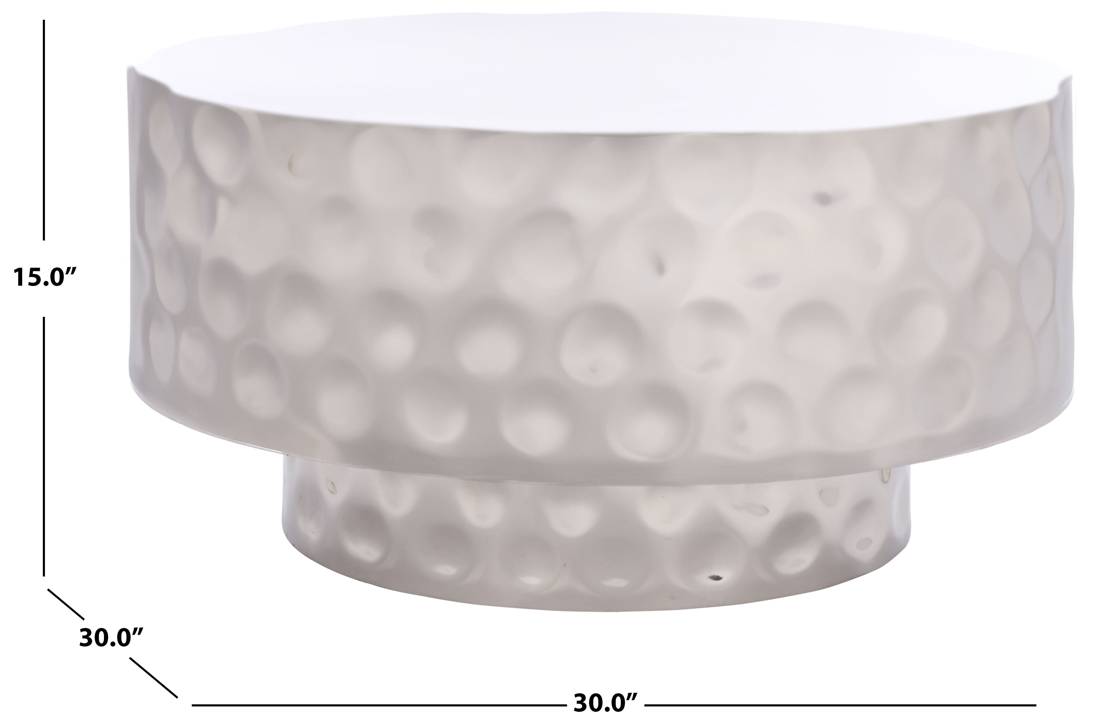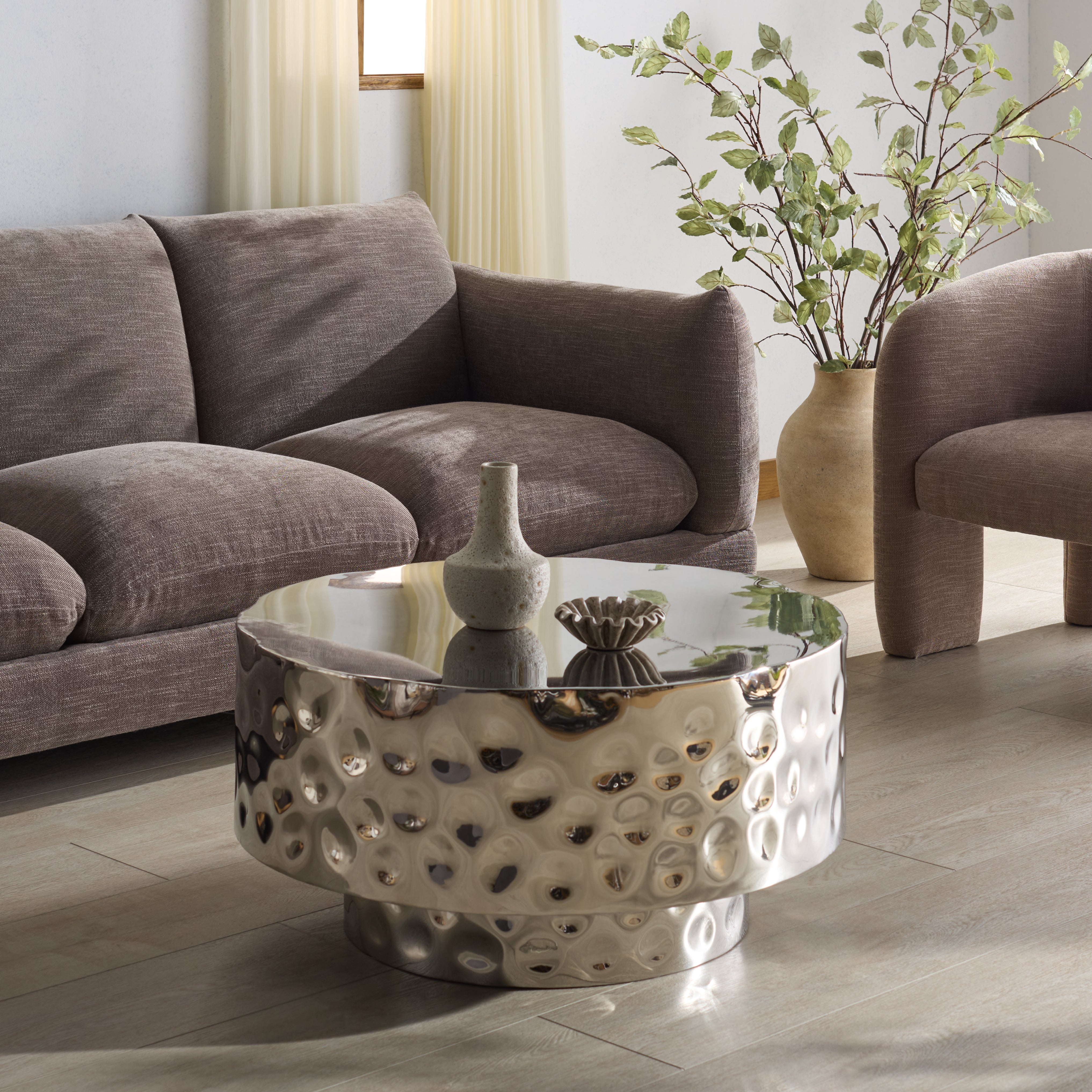 Introducing the Janalee Hammered Steel Coffee Table, a contemporary masterpiece that infuses an understated elegance into any living space. Crafted from robust stainless steel and iron, this coffee table displays a gorgeous chrome finish that effortlessly merges with all kinds of interior decor. The stunning hammered texture of this coffee/cocktail table instantly elevates the aesthetic appeal of your space. Designed to display a blend of strength and beauty, it also provides ample surface space for your beverages, books, or decor pieces. With a versatile blend of functionality and fashion, the Janalee Chrome Coffee Table invites you to revel in the world of stylish home furnishings. It translates outstanding craftsmanship into a contemporary furniture piece that is hard to miss. Get ready to step into a world of modern elegance with Janalee.