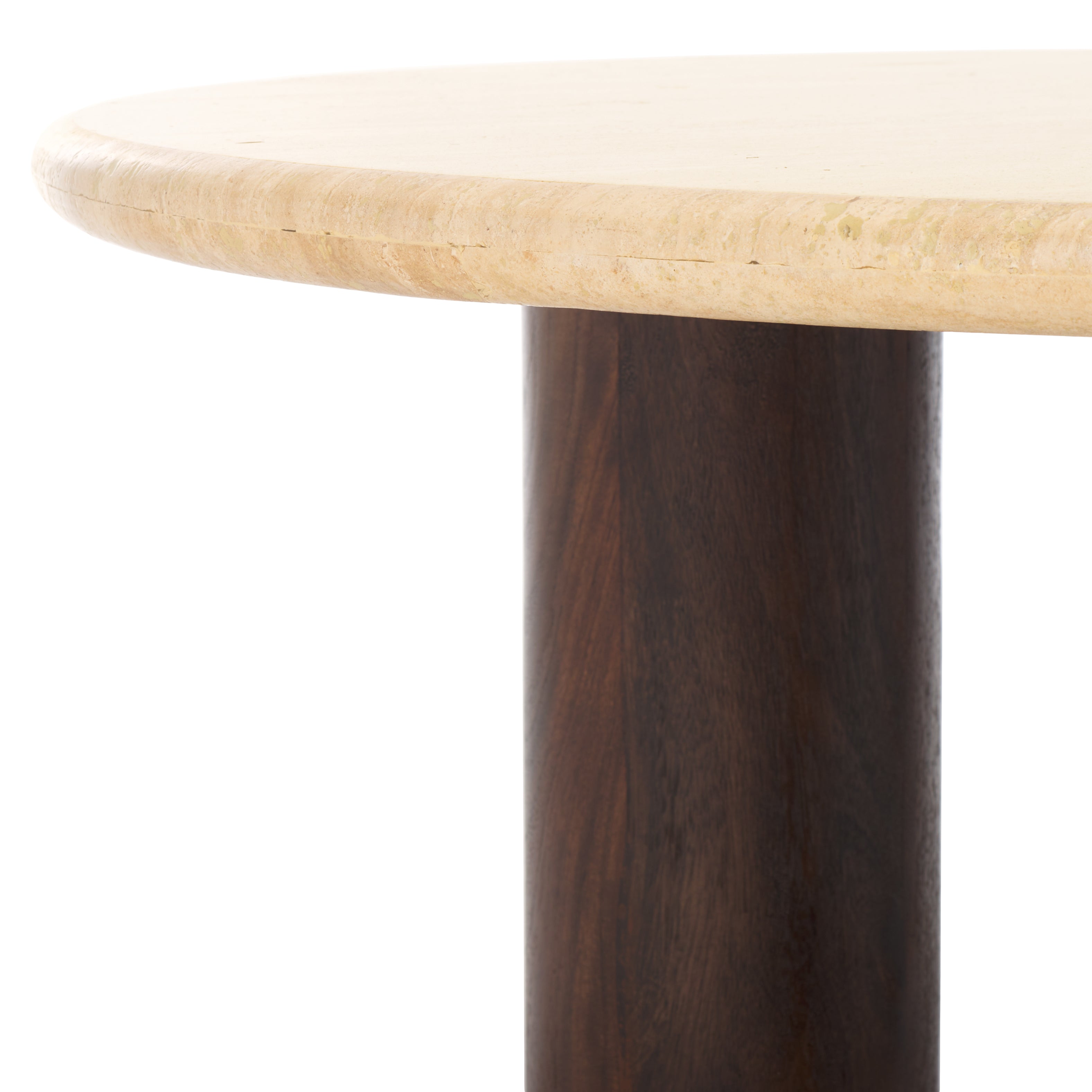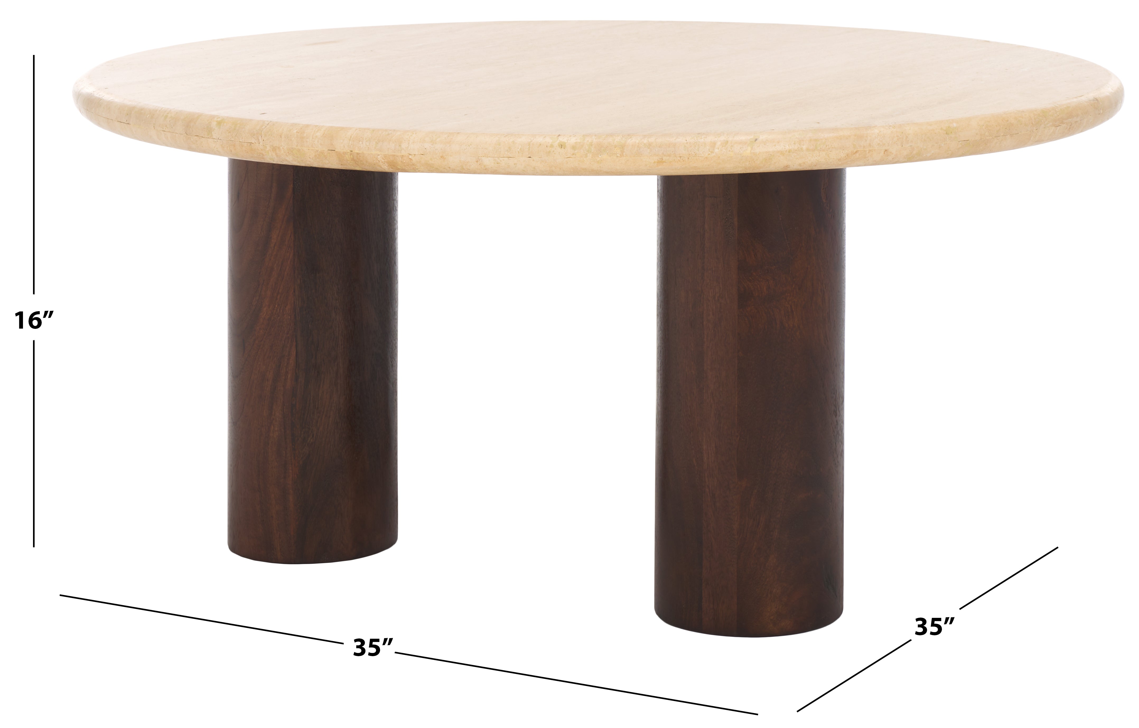 Anchor your living space with the dramatic and eye-catching presence of our Jennamira coffee table. The clean geometry and exaggerated proportions of our table offer rich character and dimension. A round travertine top sits upon oversized mango wood legs to cut a sturdy and stylish silhouette. Its dramatic profile calls attention to the rich natural textures. Showcasing a deep brown finish, the coffee table can serve as a stunning centerpiece for your lounge, bedroom, or home office. It can offer a sculptural foundation for your beloved decor items.