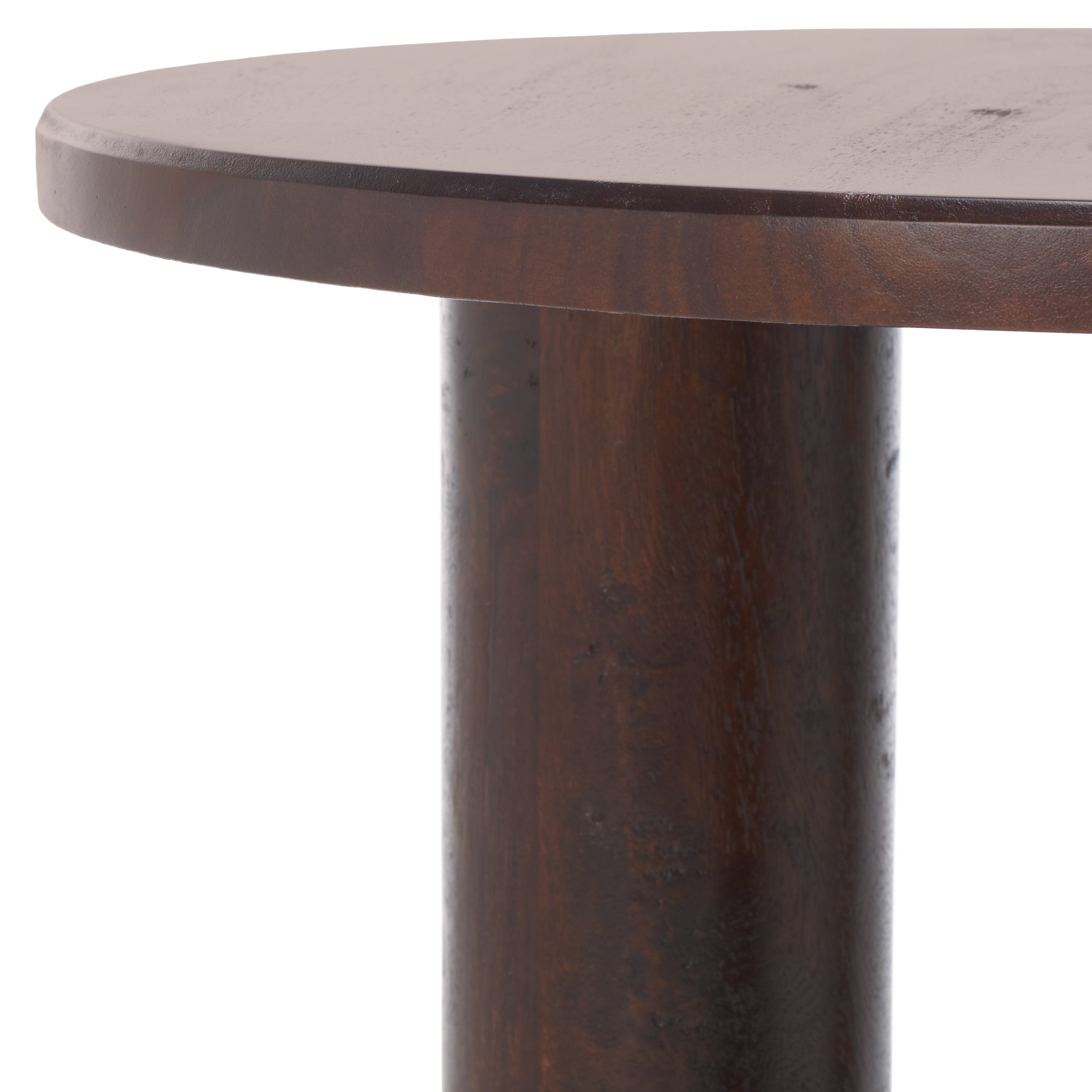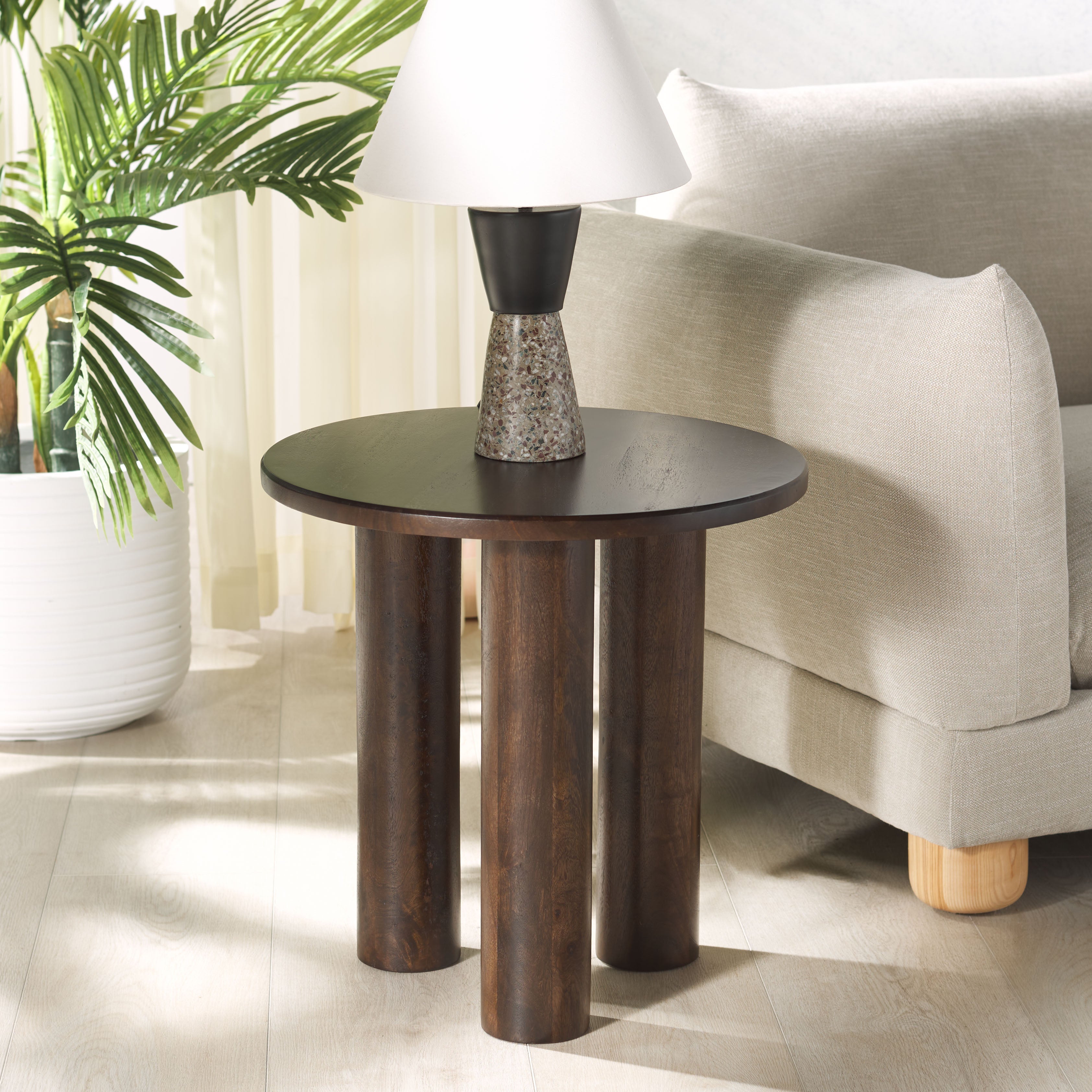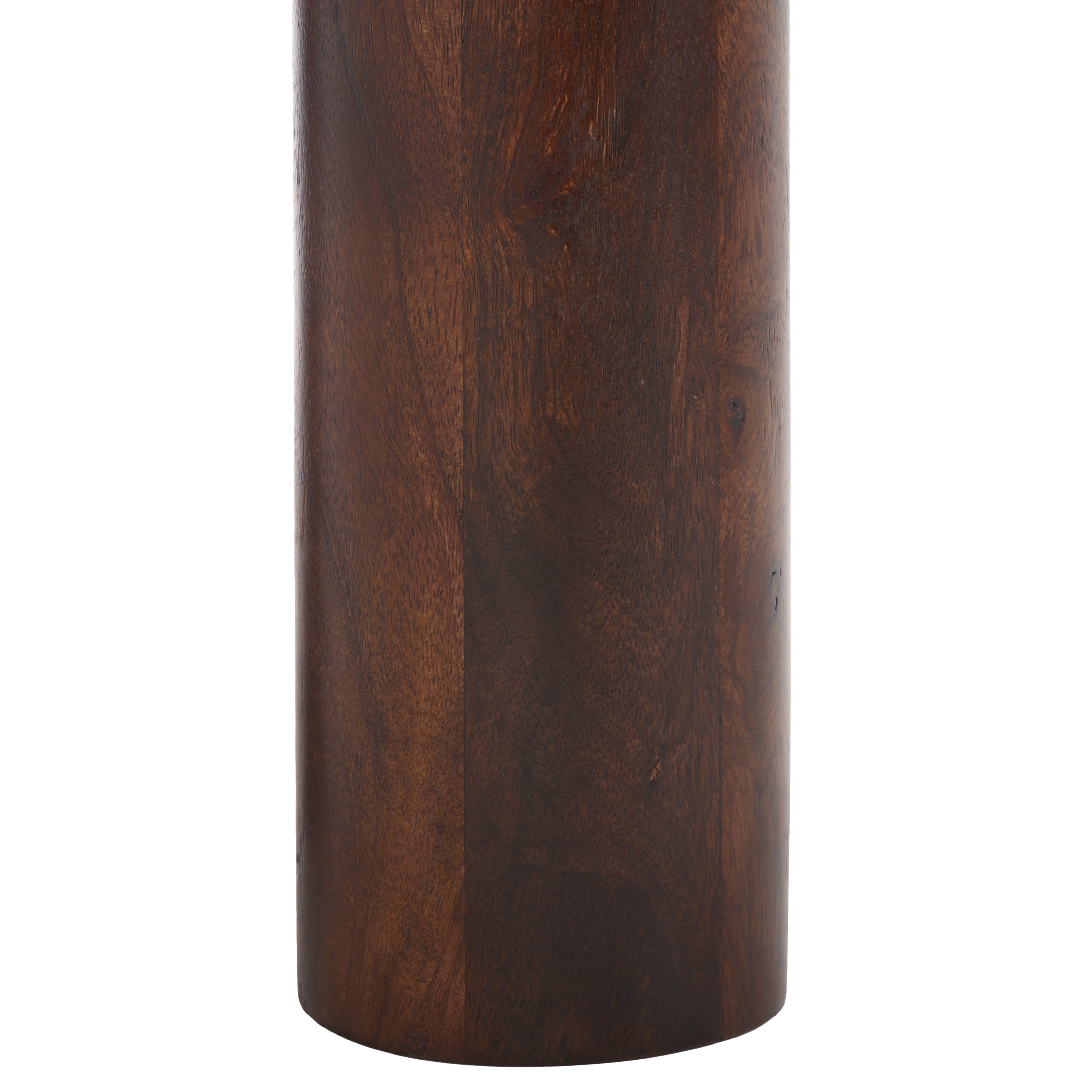 Invite modern drama to your space with our bold and sculptural Jennamira accent table. The clean geometry and exaggerated proportions of our table lend rich character and dimension to any corner. A round tabletop sits elegantly upon oversized cylindrical legs to cut a sturdy and stylish silhouette. Its dramatic profile calls attention to the detail-rich grains of Mango wood. Seasoned with a dark brown finish, our accent table can serve as a charming focal point next to your sofa, armchair, or bed. It can offer a sculptural foundation for your favorite decor items.