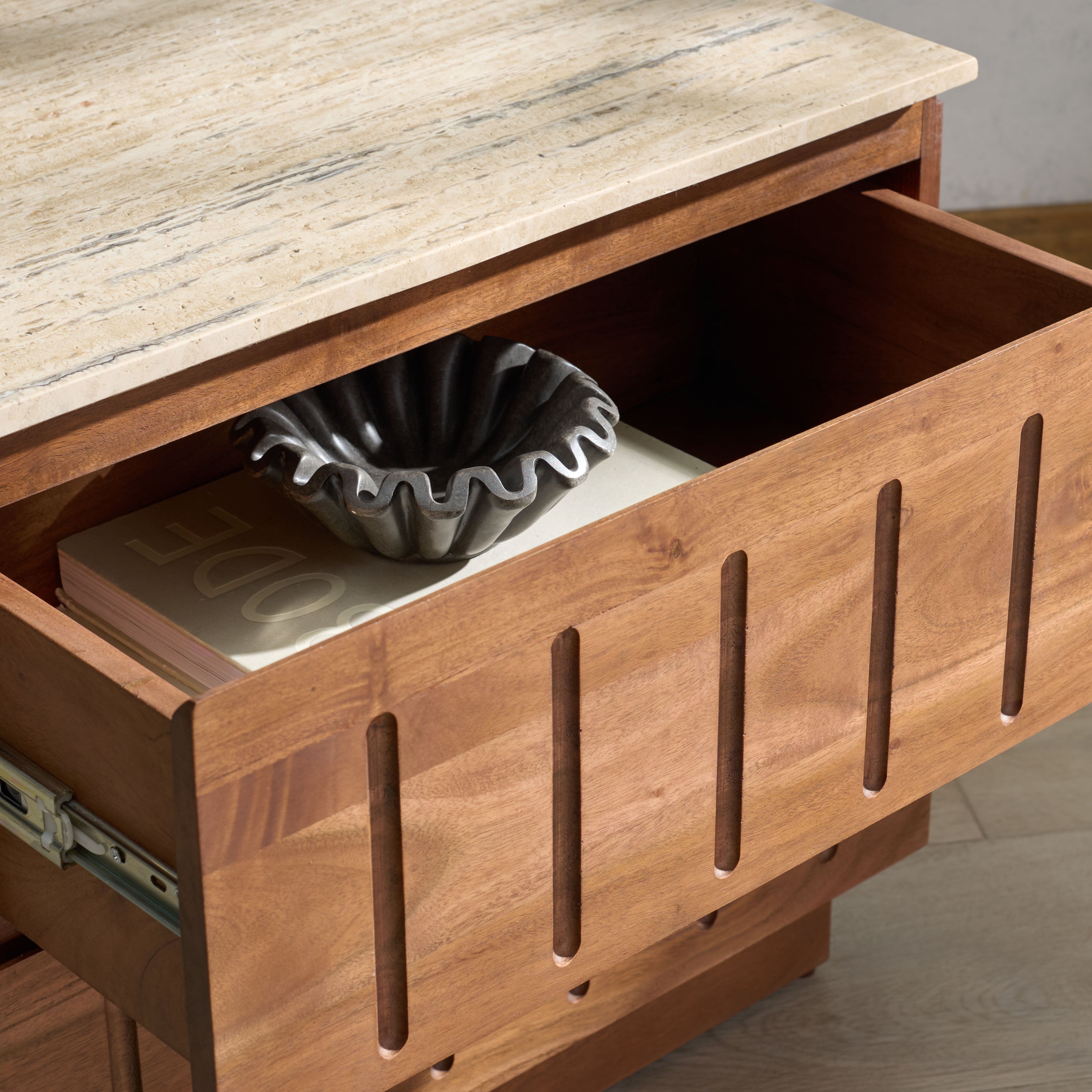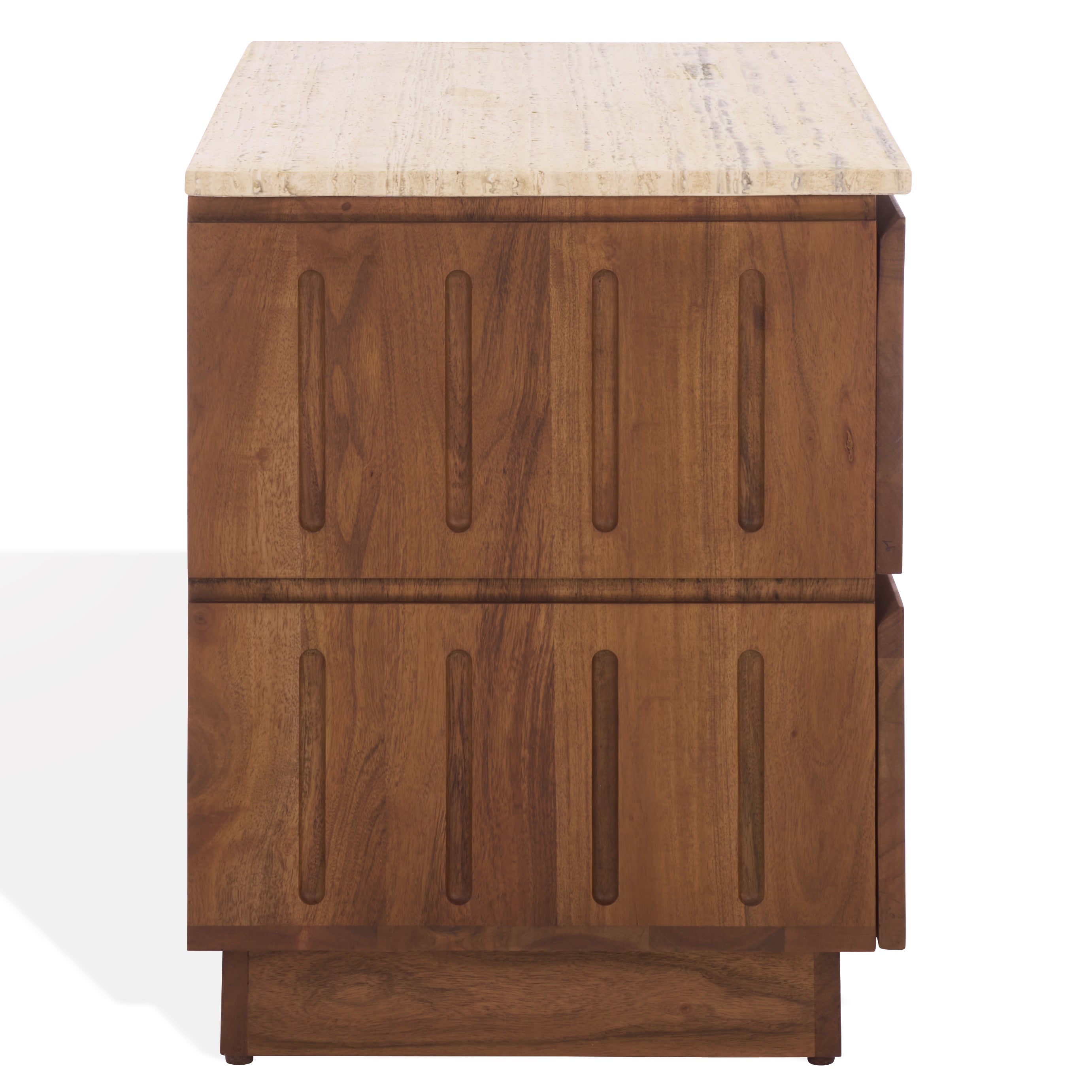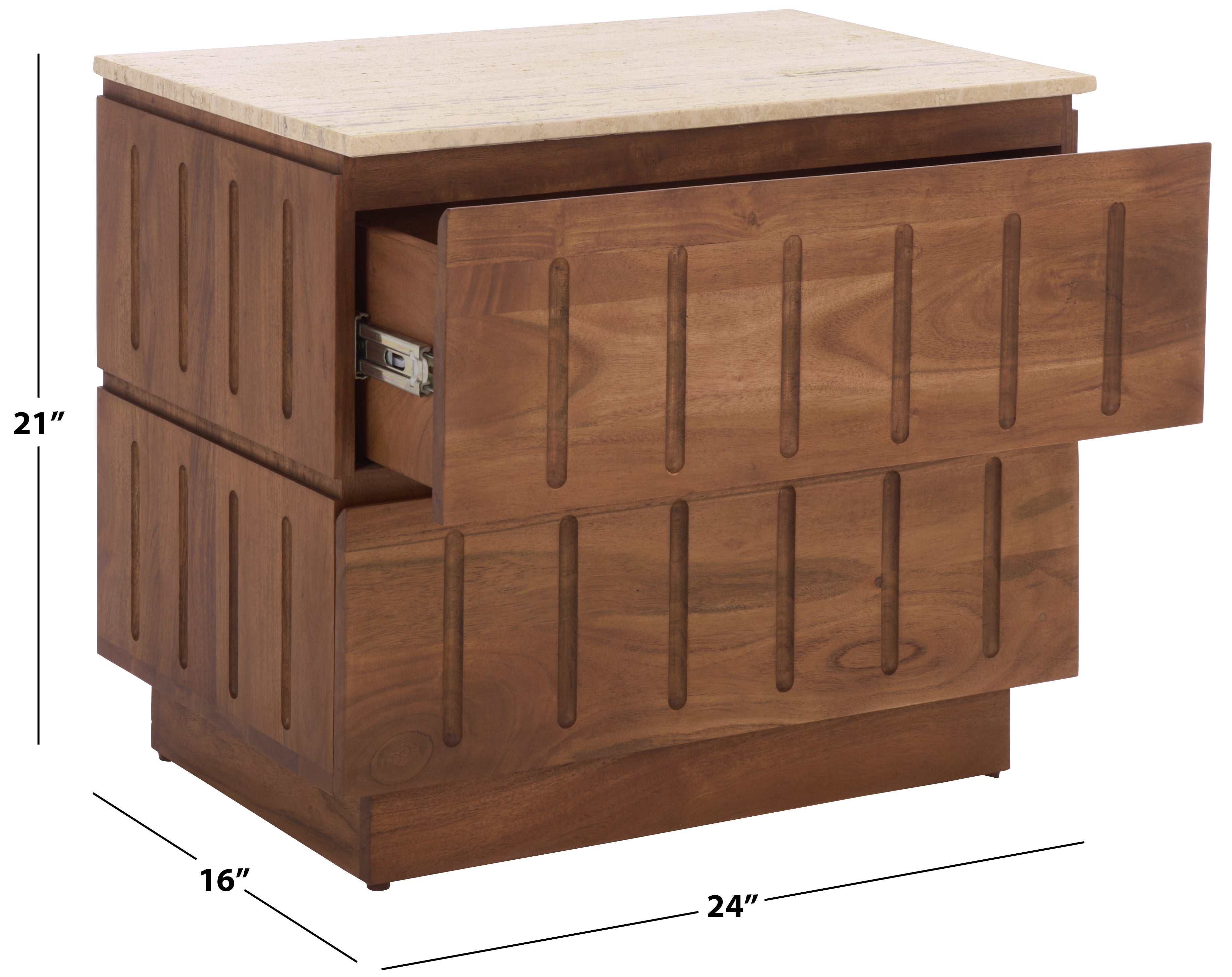Enhance your living space with the Kaylissa Travertine Top 2 Drawer Nightstand. This piece combines the elegance of travertine and the rich tones of walnut to deliver a stunning addition to your bedroom decor. The smooth marble top provides a sleek surface that complements the wooden frame, offering both style and functionality. Perfectly balanced with two spacious drawers, this nightstand delivers ample room to store your essentials while adding an element of sophistication to your environment. Its understated design blends seamlessly with various decor styles, making it a versatile choice for any setting. The unique character of natural materials ensures that each piece is distinct. Experience the harmonious blend of form and function with the Kaylissa Nightstand and transform your bedroom into a serene and stylish retreat. Let this piece be the understated accent that ties your space together, offering a touch of elegance and practicality to your everyday life.