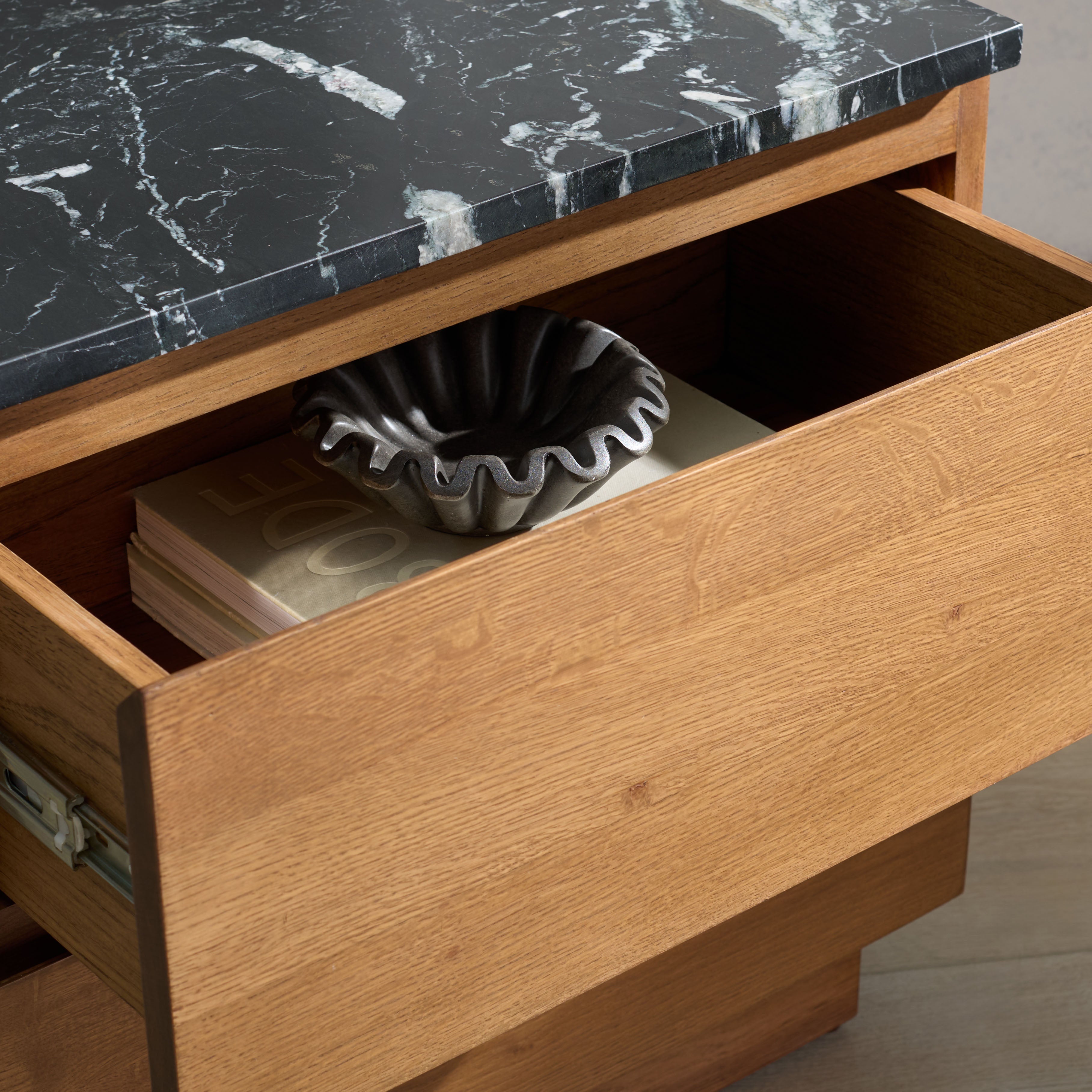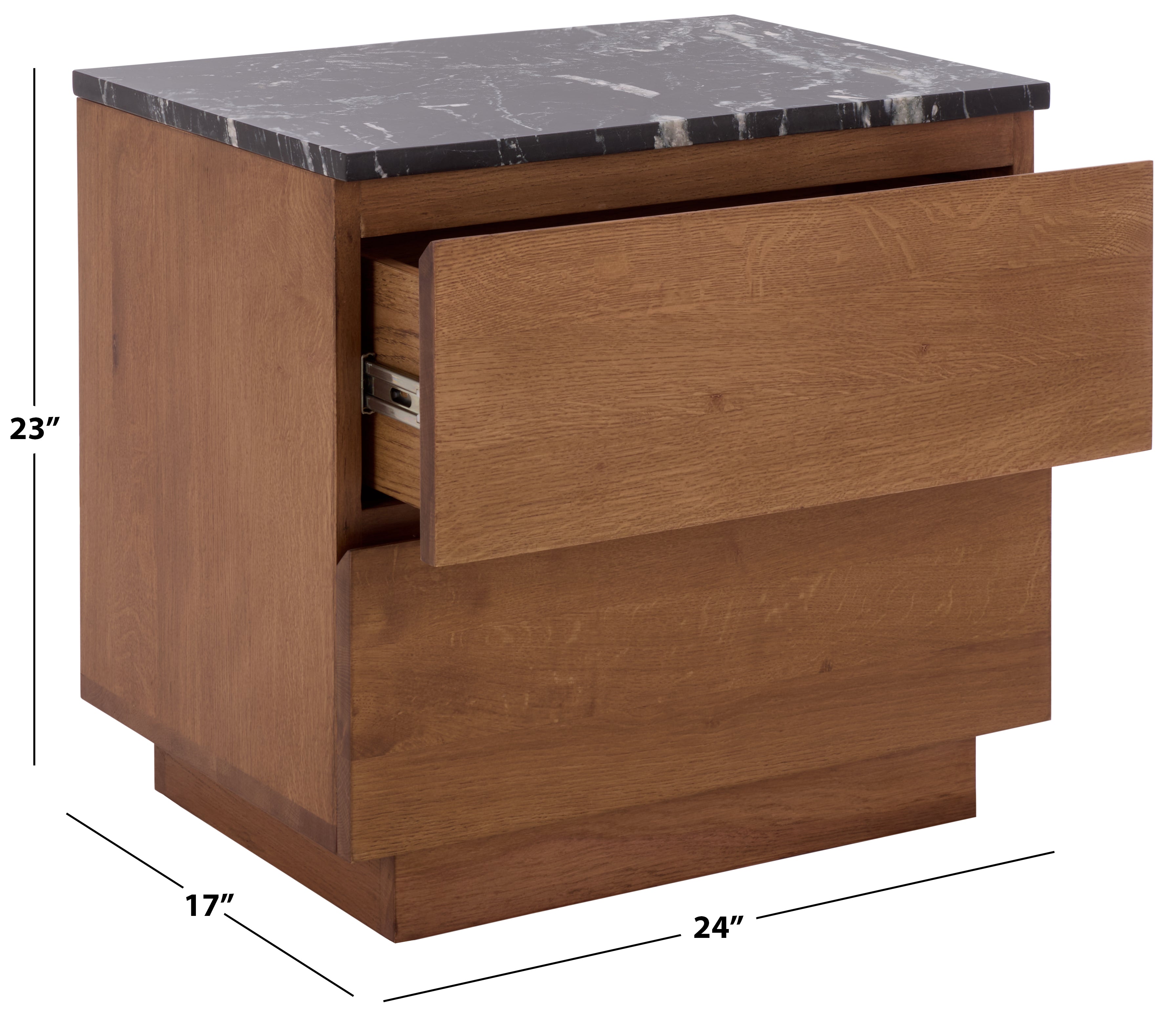 Elevate your bedroom decor with the Lilybelle marble top 2 drawer nightstand, where timeless design meets modern elegance. Featuring a stunning marble surface paired with sleek walnut and black finishes, this piece blends natural beauty with refined craftsmanship. The dual drawers offer ample storage space for your evening essentials, making it both functional and stylish. Crafted from a harmonious mix of marble and wood, it serves as a versatile addition to any bedside. Use its spacious top to display decor or keep your nighttime necessities within reach. The nightstands bold look adds an undeniable touch of sophistication to your living space, making it an ideal choice for those who appreciate style combined with utility. Transform your bedroom into a retreat of charm and character with this exquisite nightstand.