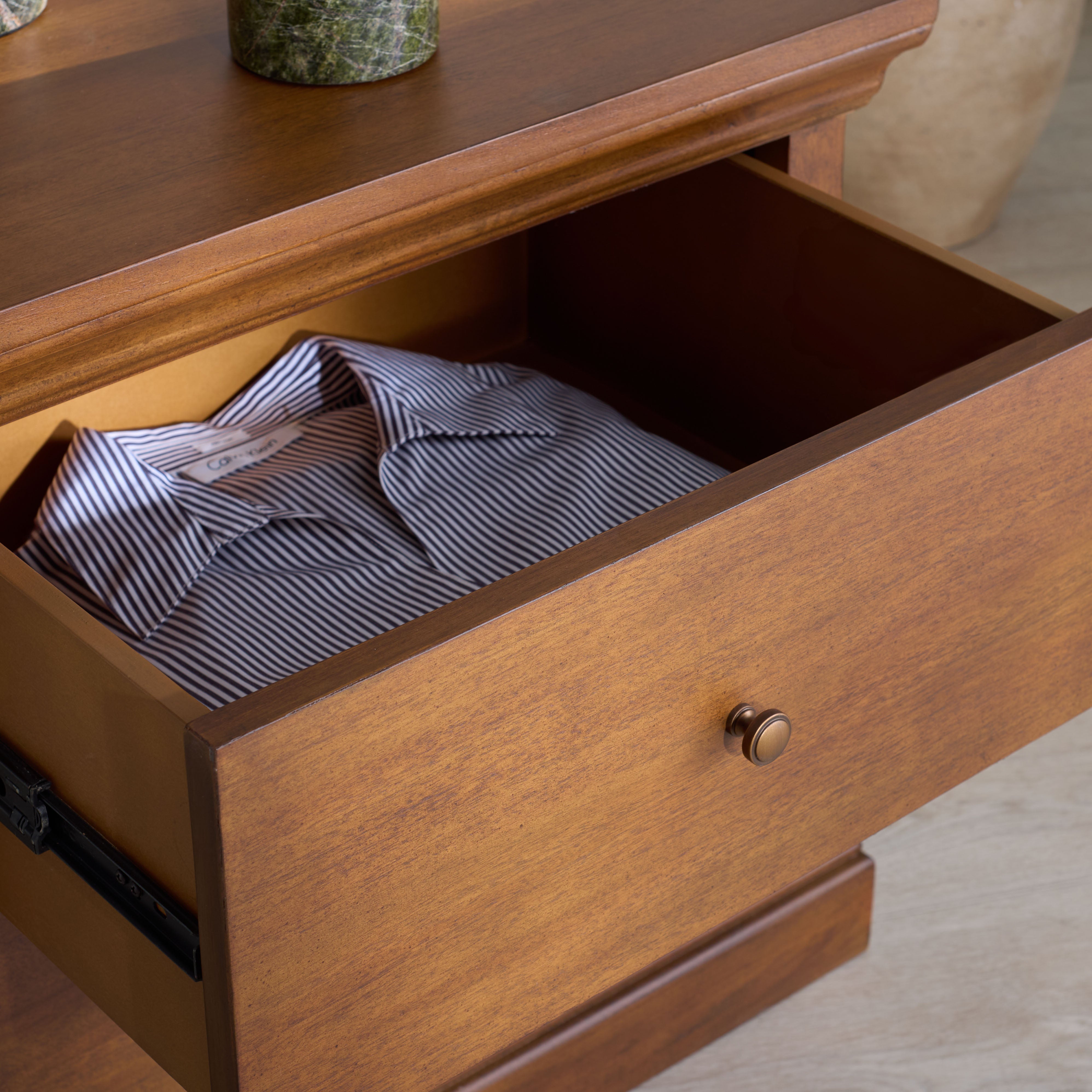 Transform your bedroom into a haven of style and organization with the Lizzy 2 Drawer Wood Nightstand in Walnut. This exquisite piece effortlessly combines form and function. Crafted with care, the rich walnut finish exudes warmth and sophistication, bringing a touch of elegance to any decor. The nightstand features two spacious drawers, providing ample storage for your bedside essentials, ensuring everything you need is within arm's reach. Made from durable wood with sleek metal accents, the Lizzy nightstand strikes the perfect balance between classic charm and modern flair. Its clean lines emphasize its minimalist design, creating a timeless piece that complements any room. Whether you're updating your decor or adding a focal point, the Lizzy nightstand is designed to elevate your space with its understated beauty. Enhance your bedroom's appeal today with this must-have piece that is as functional as it is stylish.