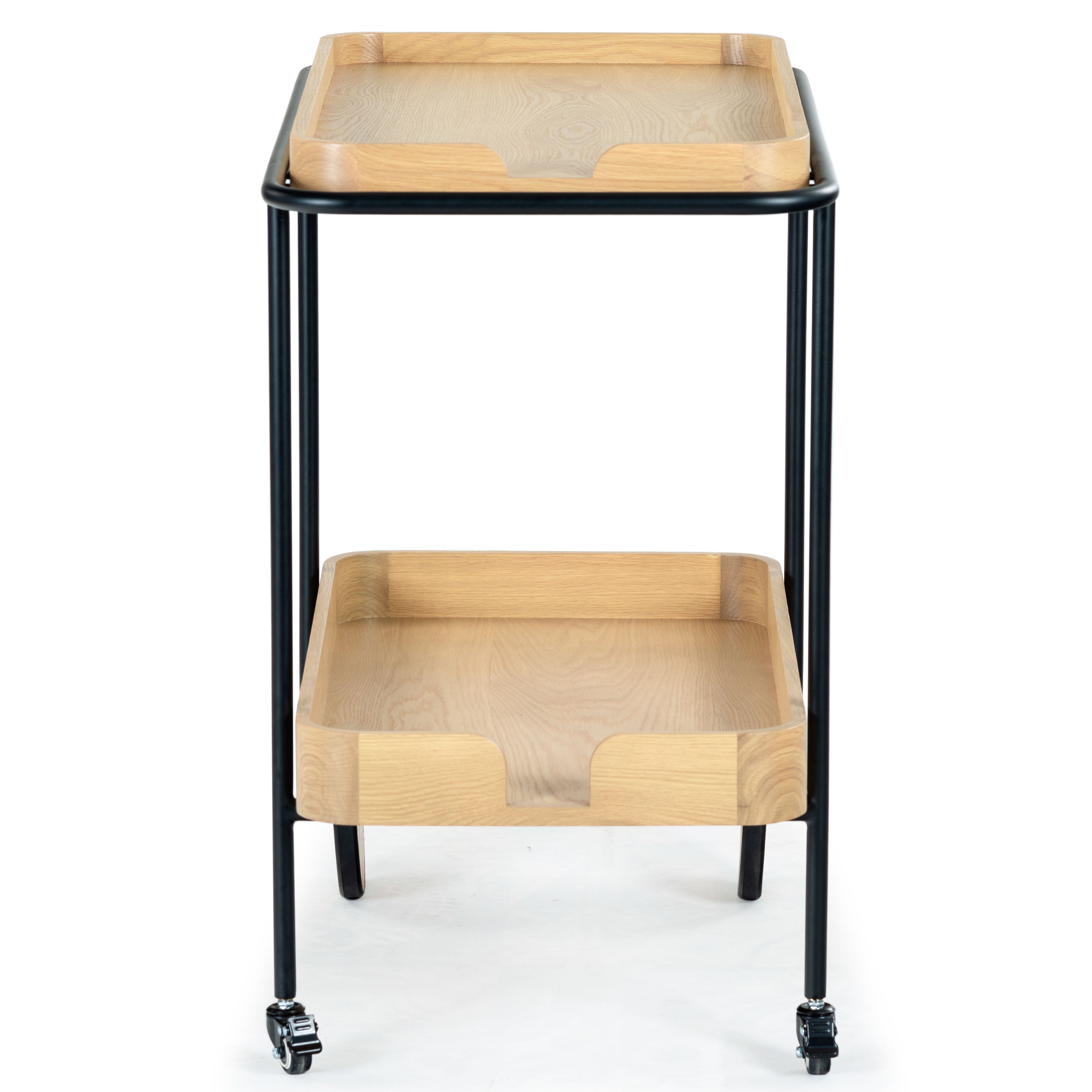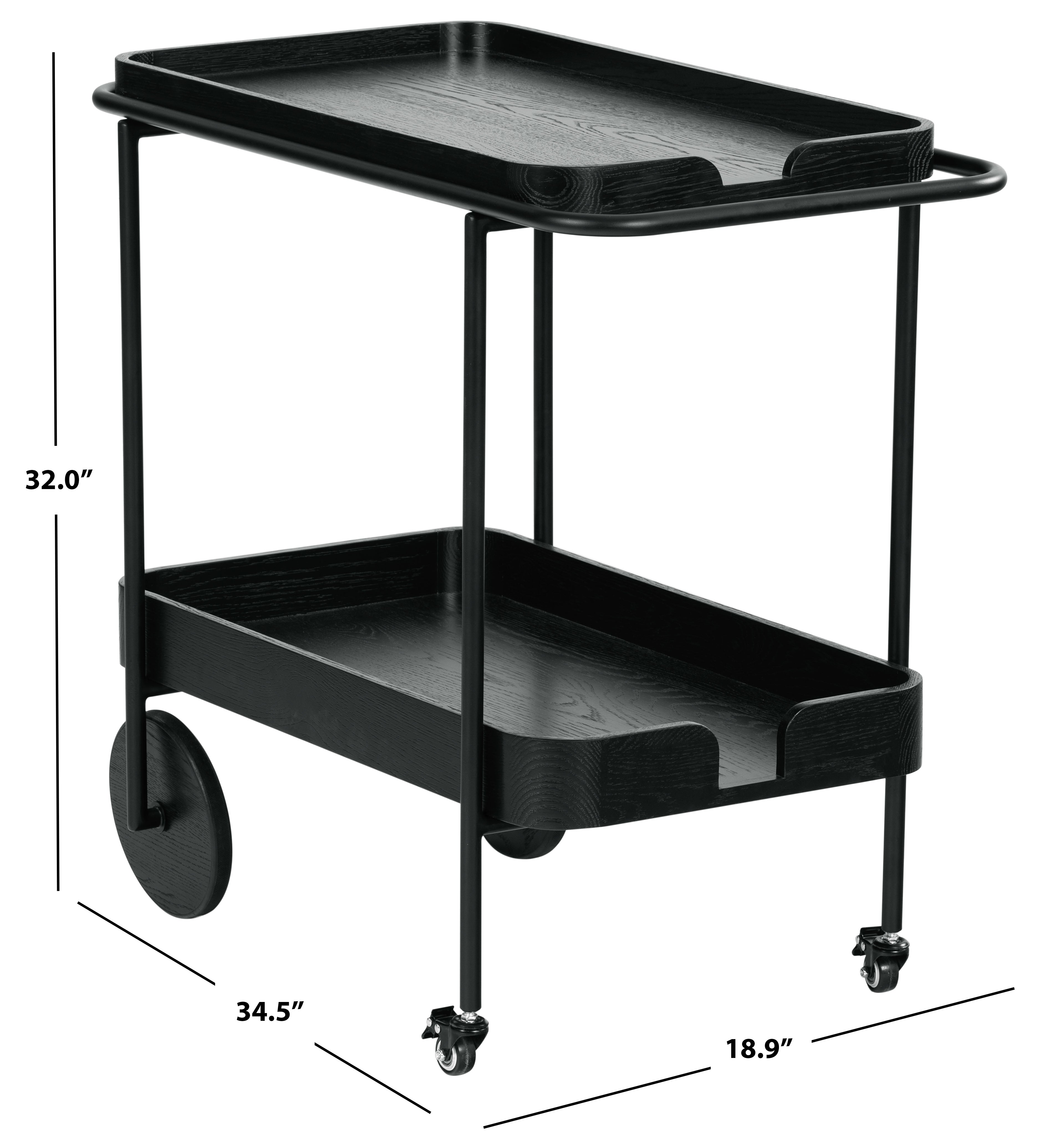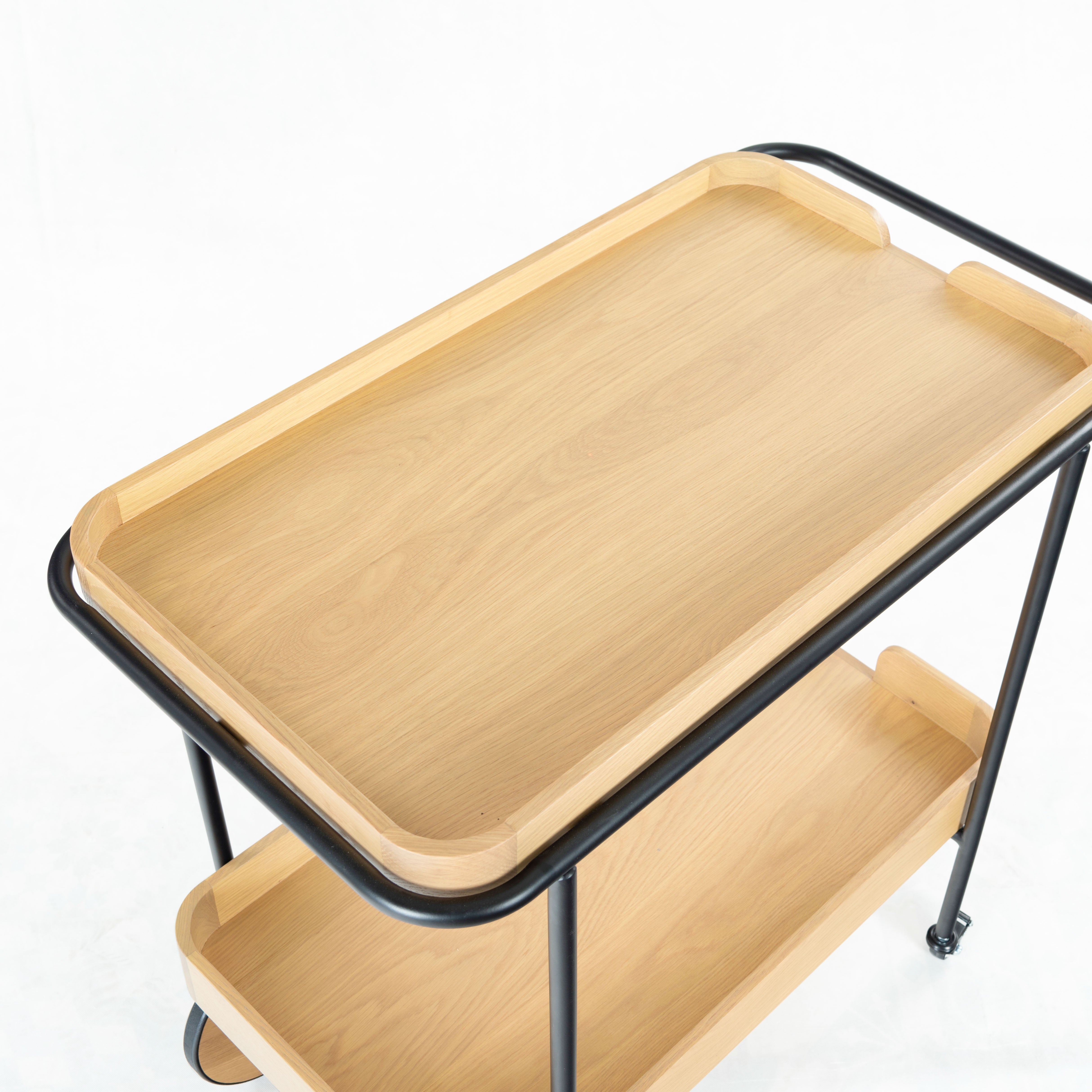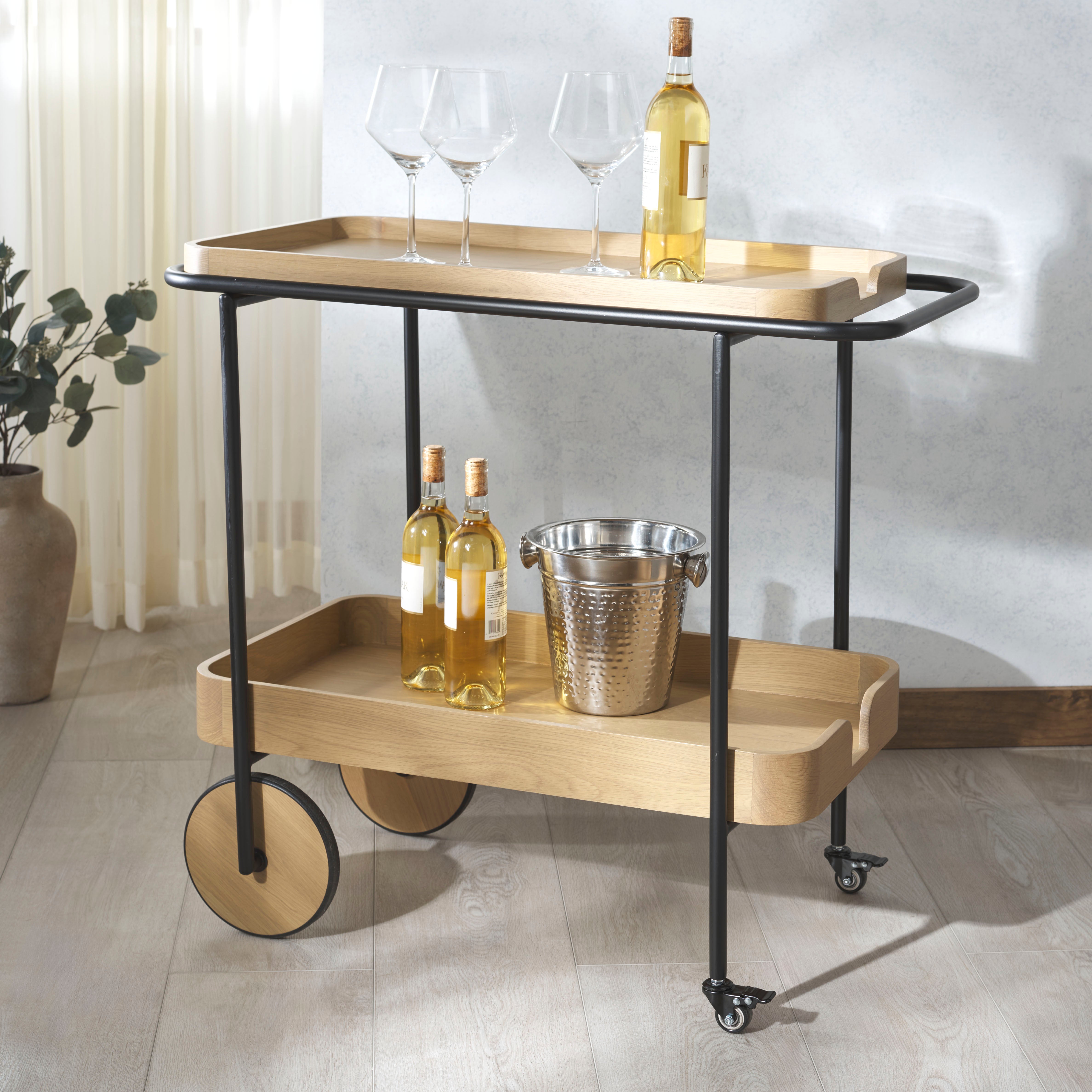 Introducing the Malek Wood and Metal 2 Shelf Bar Cart, a perfect fusion of functionality and style. With its natural and black color schemes, this bar cart exudes a minimalist and sophisticated aesthetic that complements a variety of interior decor. Constructed from sturdy oak wood and veneer, this bar cart boasts of robustness and durability. Its iron framework further adds to its sturdy build while lending a sleek, modern touch to its overall appearance. Whether you're hosting a lavish cocktail party or entertaining a few friends on a casual evening, this bar cart will not disappoint. With its ample storage and smooth rolling wheels, serving up your favorite beverages has never been easier or more stylish. Make the Malek Wood and Metal 2 Shelf Bar Cart an integral part of your social gatherings and let the good times roll.