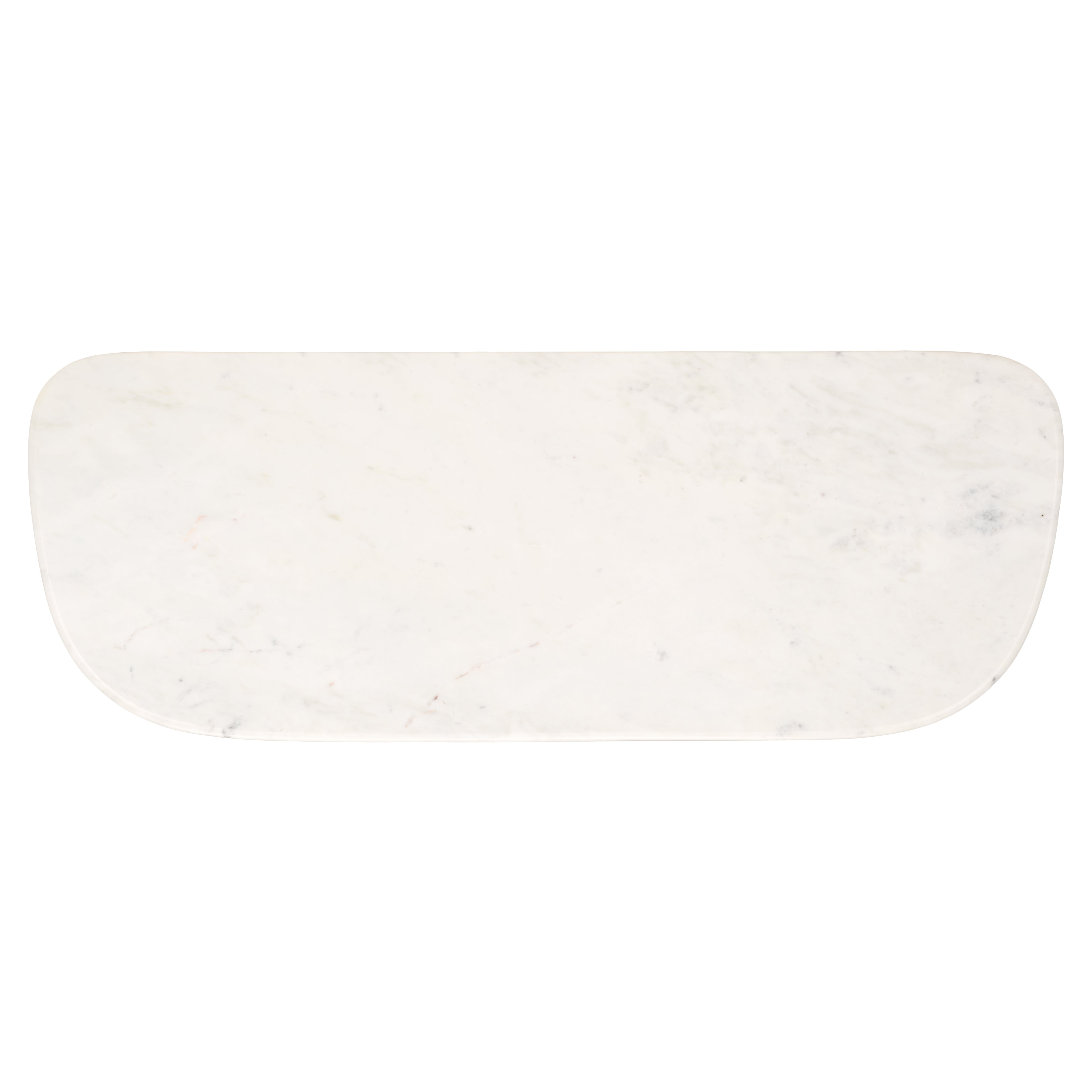 Liven up any corner with the chic and inviting presence of our Marilynn console table. The table makes an impact with its bold geometric profile and unique blend of materials. A gently rounded tabletop sits upon three cylindrical legs to offer eye-catching drama. Its chunky legs are covered with a cock veneer to create a beautiful contrast with the white marble top. Offering rich textures and a room-brightening appeal, our console table remains the perfect complement to your lounge, entryway, dining or bedroom. It can create an eye-catching vignette of your favorite decor items.