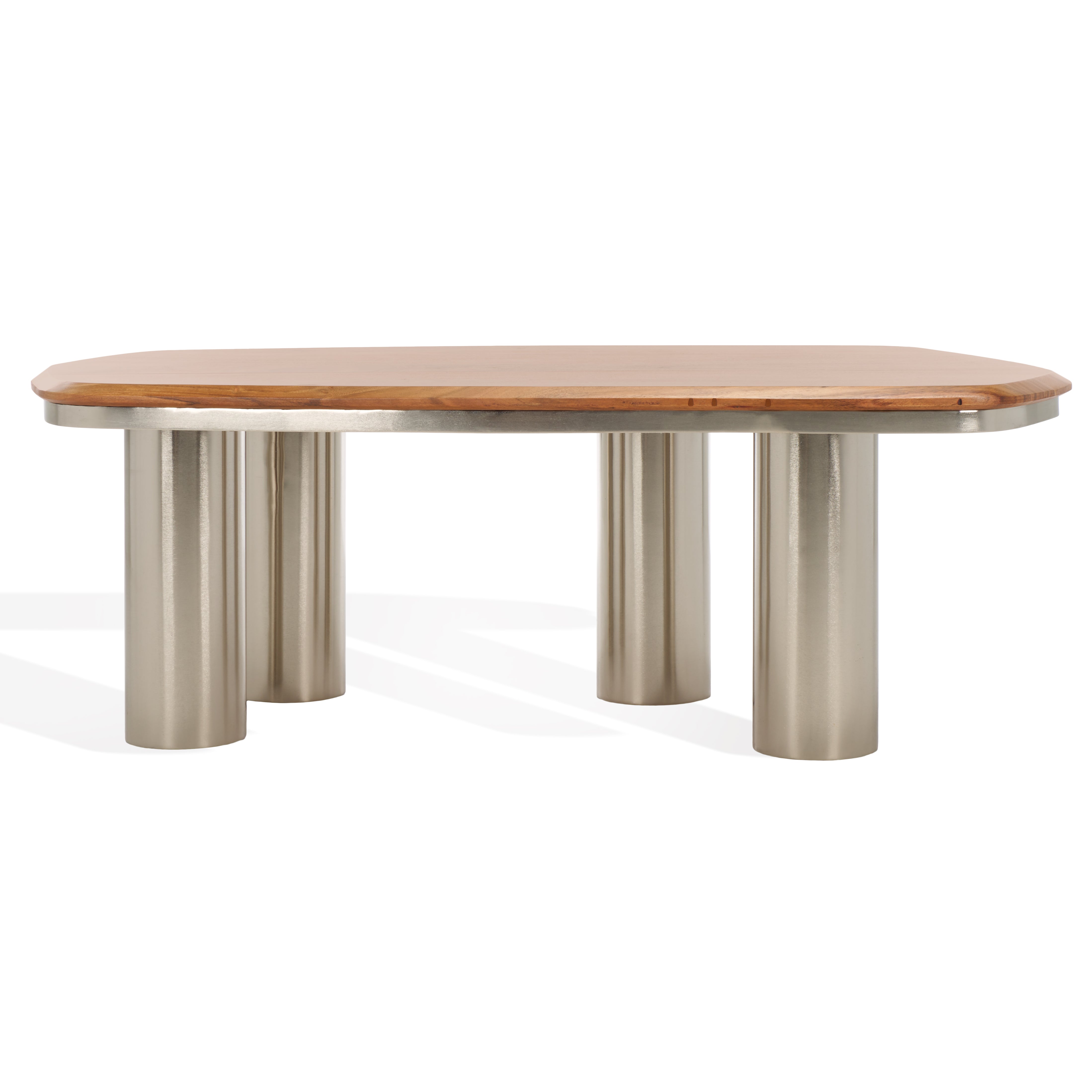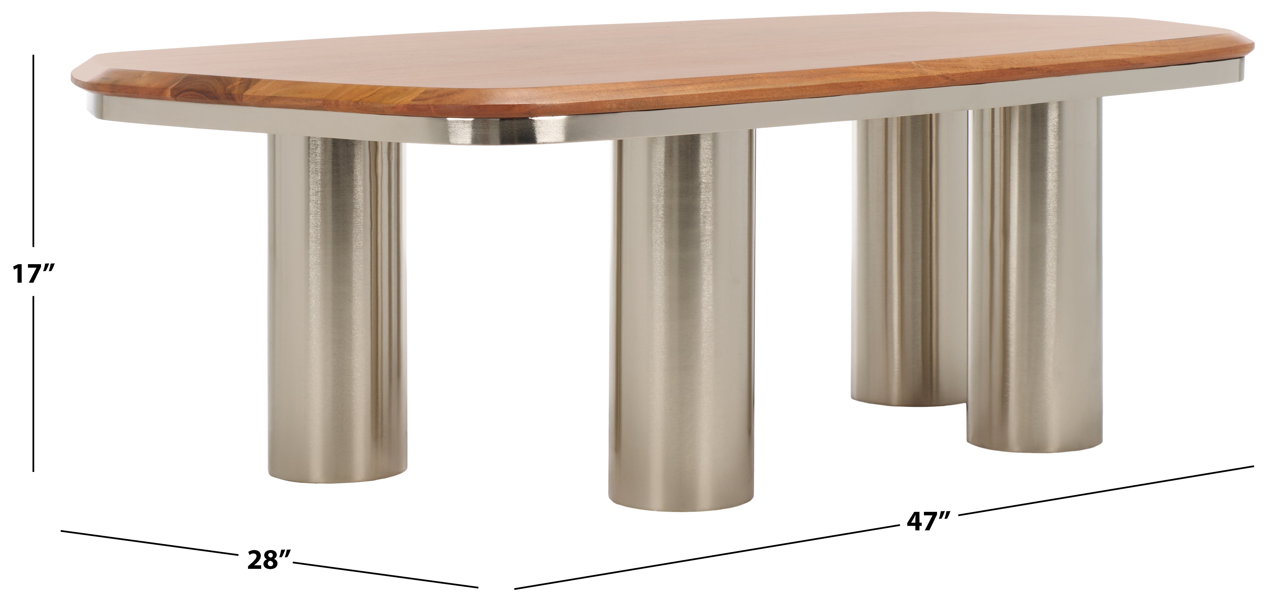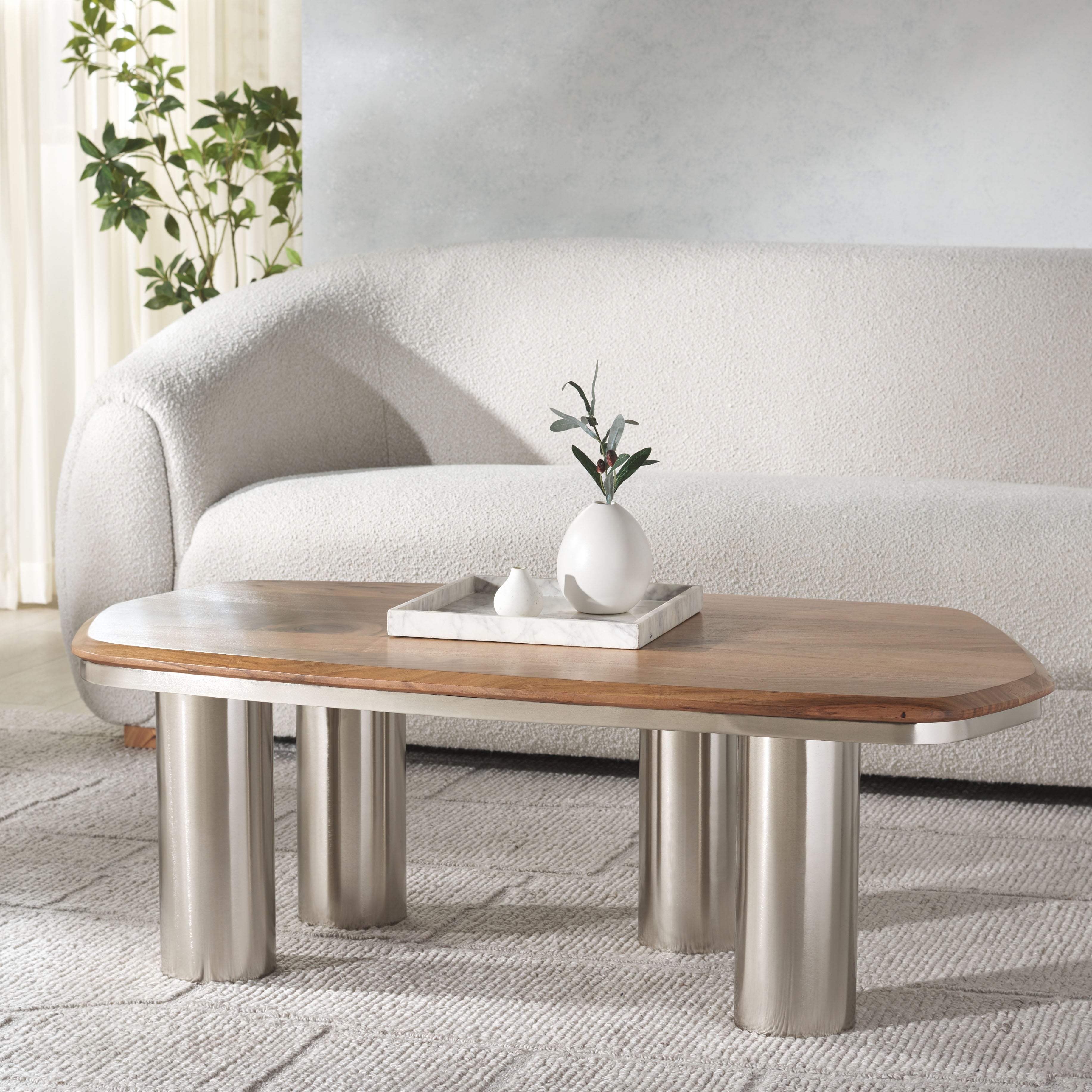 Give a warm and luxe upgrade to your living space with our Osborn coffee table. Mixing material in a sleek and sculptural design, the table lends distinct character and charm to any corner. The asymmetric shape of its tabletop offers a chic and inviting appeal. A silver lining upon its beveled edges creates a stunning contrast with the organic warmth of acacia wood. Elevated upon oversized cylindrical legs, the coffee table can serve as a contemporary sculpture. It can add plenty of visual interest and elegance to your lounge, bedroom, or home office.