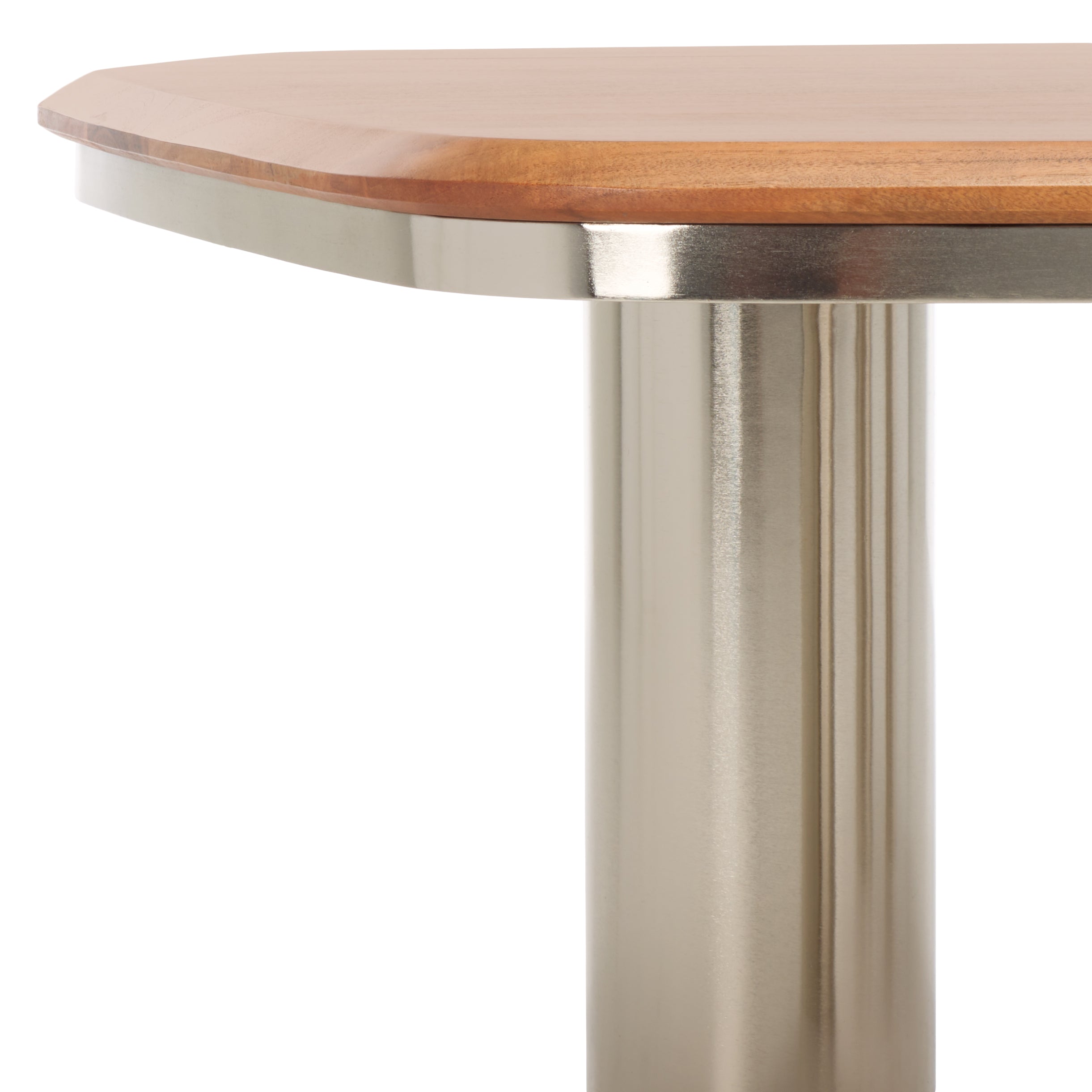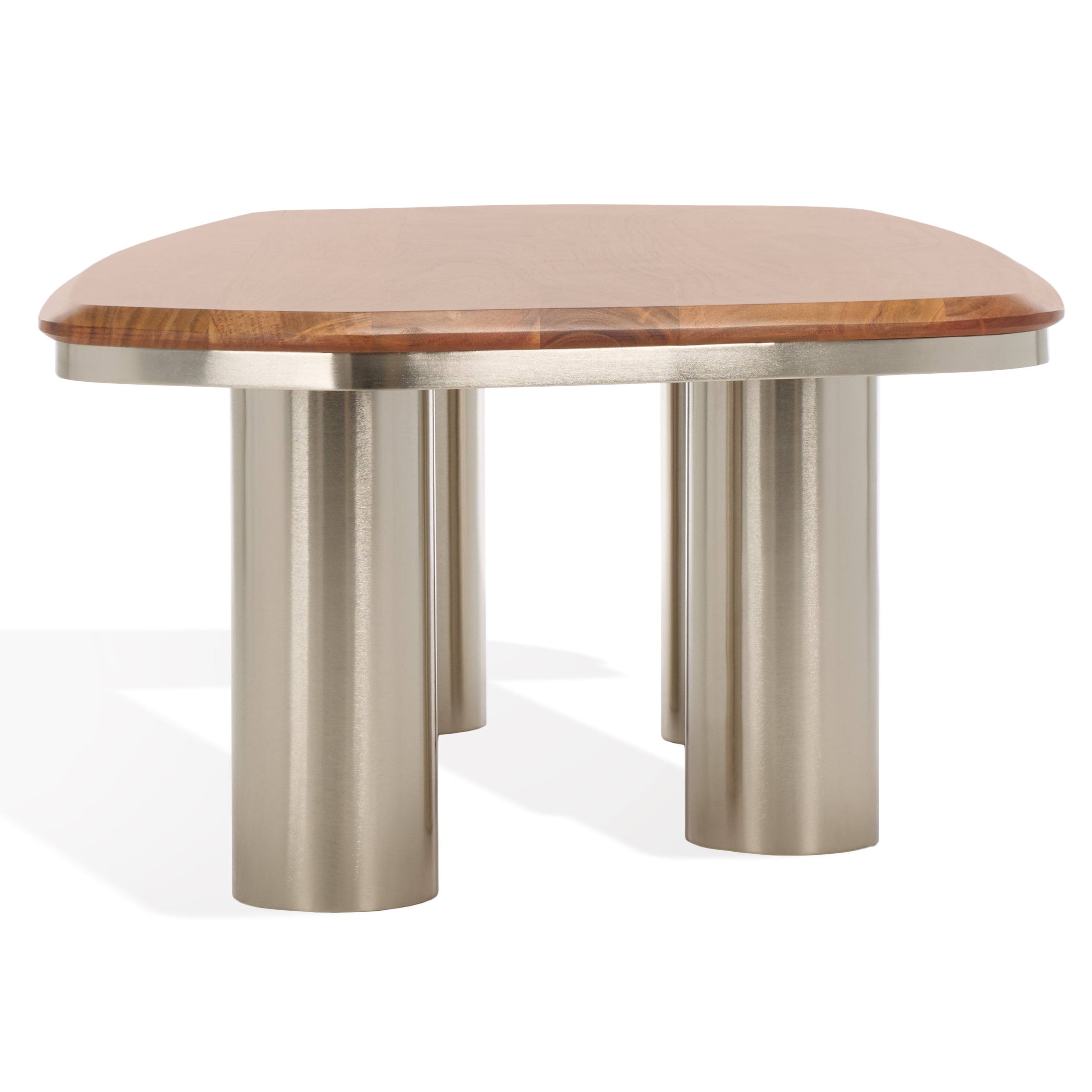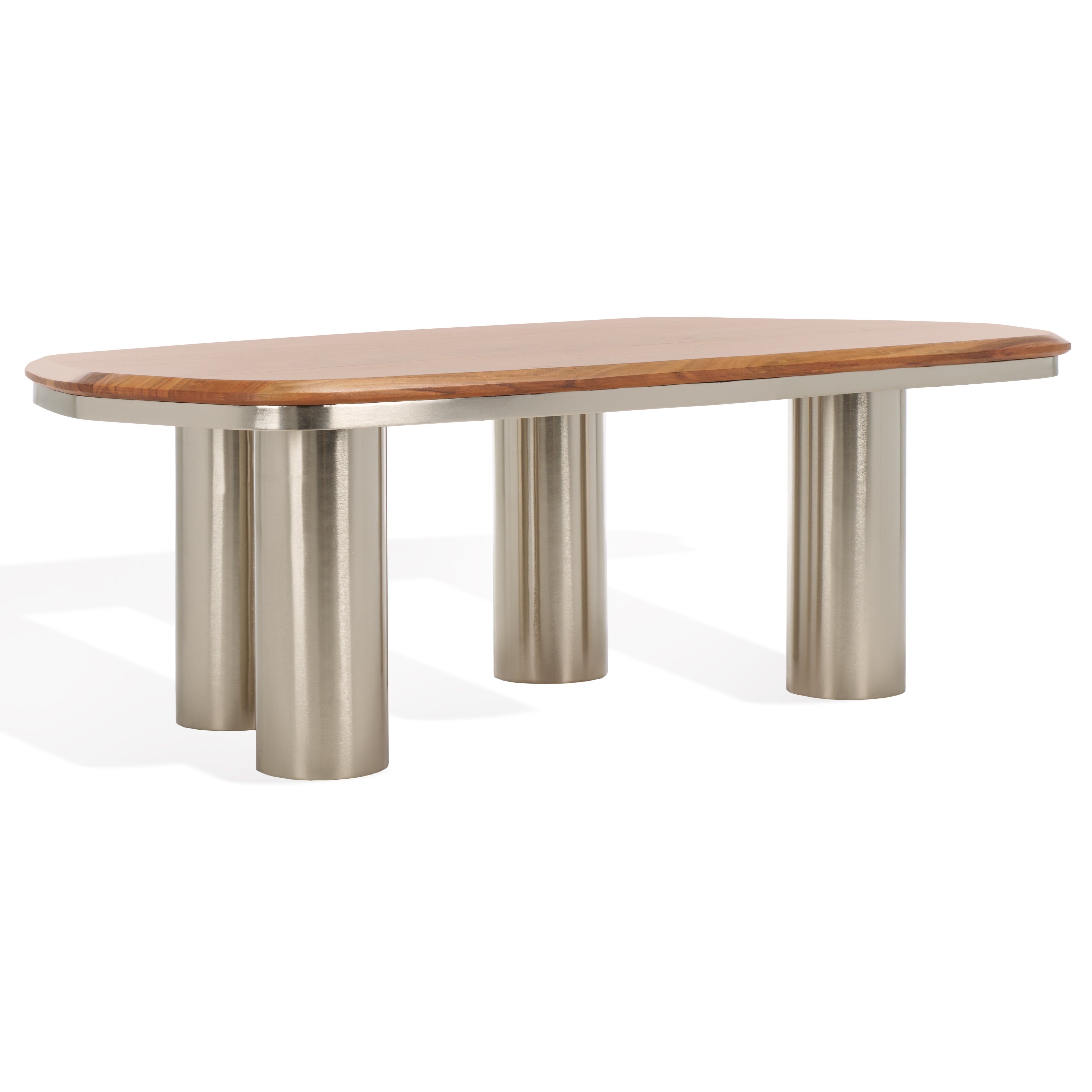 Give a warm and luxe upgrade to your living space with our Osborn coffee table. Mixing material in a sleek and sculptural design, the table lends distinct character and charm to any corner. The asymmetric shape of its tabletop offers a chic and inviting appeal. A silver lining upon its beveled edges creates a stunning contrast with the organic warmth of acacia wood. Elevated upon oversized cylindrical legs, the coffee table can serve as a contemporary sculpture. It can add plenty of visual interest and elegance to your lounge, bedroom, or home office.