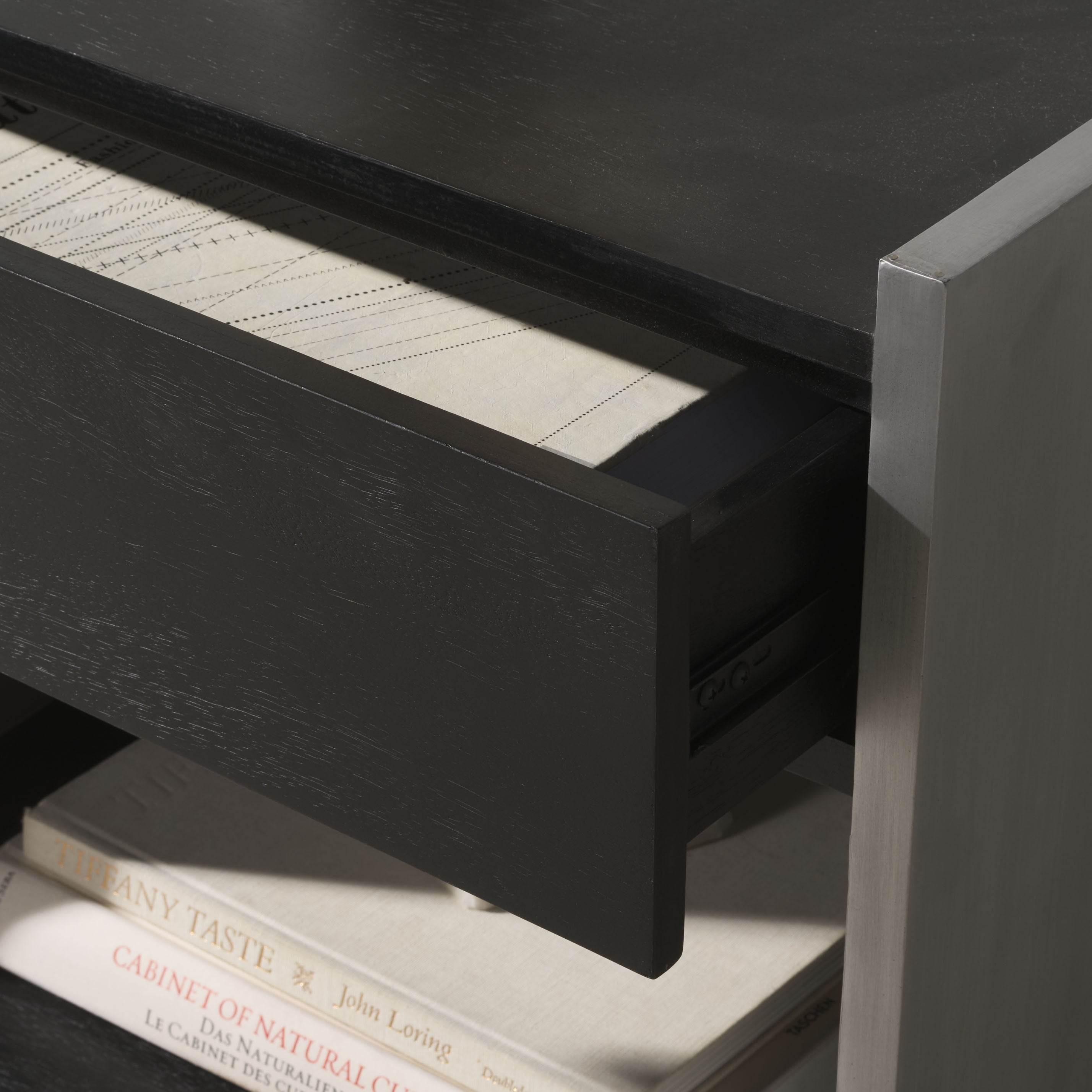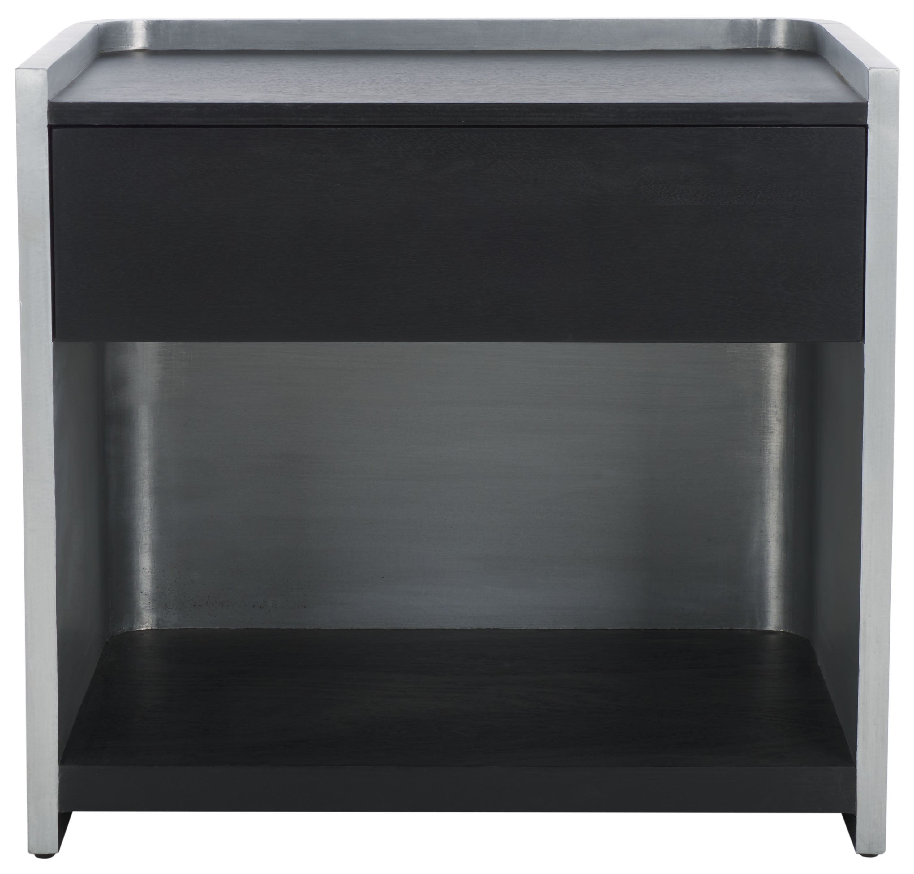 Introduce a touch of subtle elegance to your bedroom decor with the Ottawa Wood and Aluminum Nightstand. Crafted from the highest quality Mango Wood and framed by robust Aluminum, this nightstand combines durability, functionality, and style. The lustrous finish of the black wood beautifully complements the shimmering silver tones of the aluminum, resulting in a striking yet harmonious blend. Offering ample space to store your bedtime essentials, the Ottawa Nightstand is more than just a piece of furniture, it is an embodiment of craftsmanship. Whether placed next to your bed or as an accent table in any room, this nightstand will raise the aesthetic quotient of your home. Embrace the charm and intricate design of the Ottawa Wood and Aluminum Nightstand. Elegance and utility now come hand in hand, effortlessly enhancing your everyday living.
