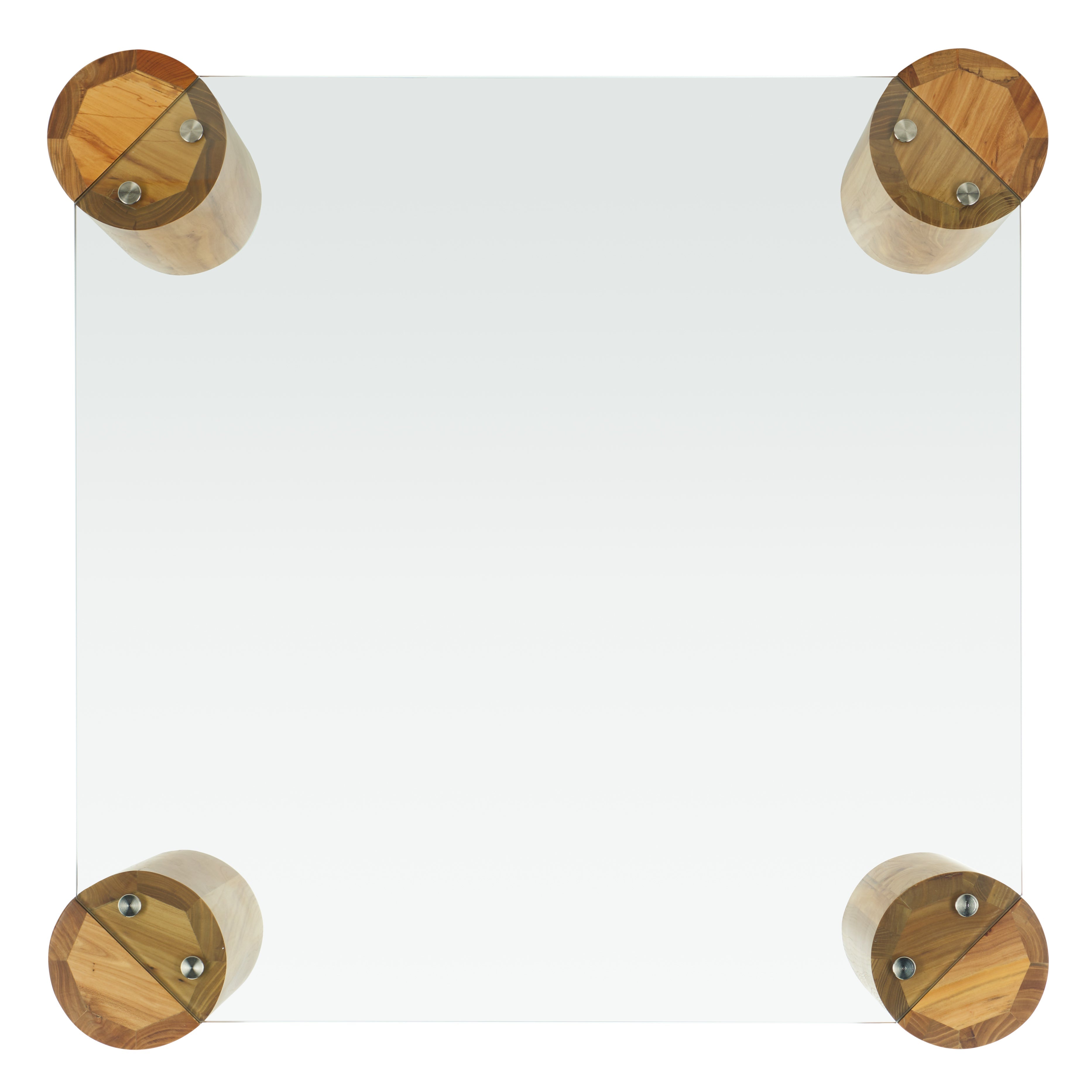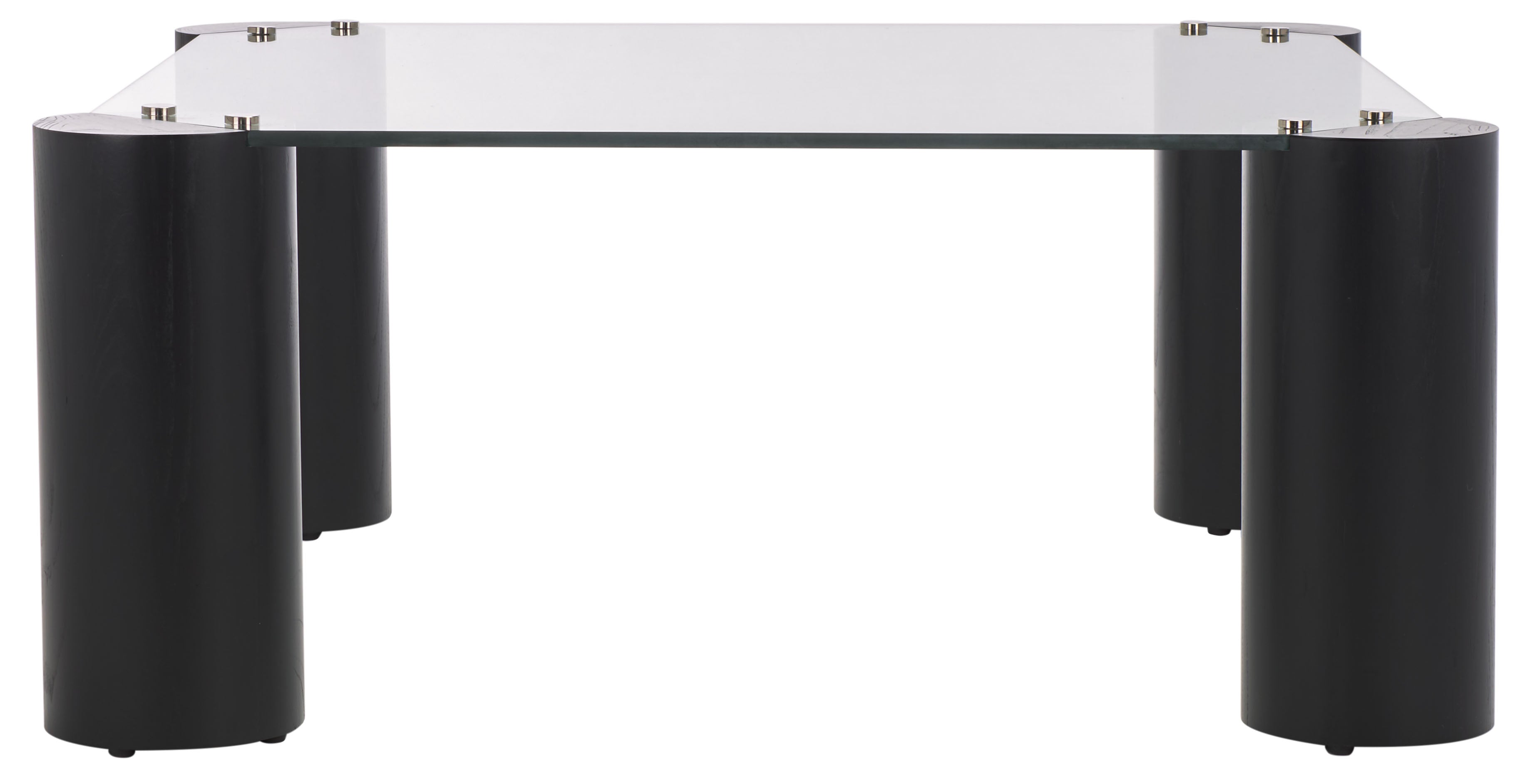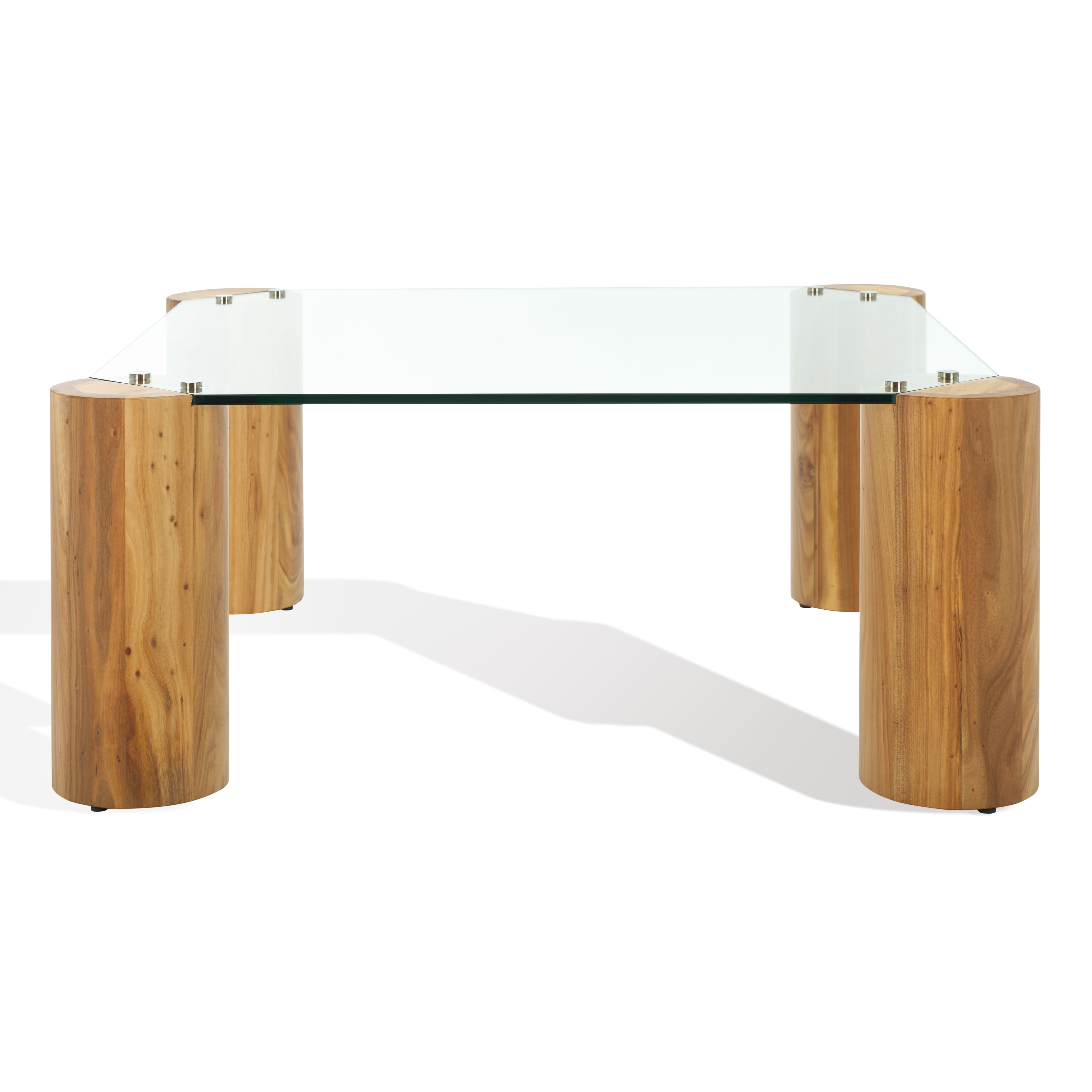 Anchor any room with the refined drama and elegance of our Robbie square coffee table. The coffee table makes a charming statement with its contrasting material and geometry. A glass tabletop creates a stunning contrast with the chunky wooden legs. Its square tabletop sits with tapered edges to attain a beautiful floating effect. The cylindrical legs showcase the rich grains of Elmwood to attain a warm and sophisticated appeal. Featuring a spacious tabletop, our coffee table provides the perfect perch for your favorite decor items and beverages.