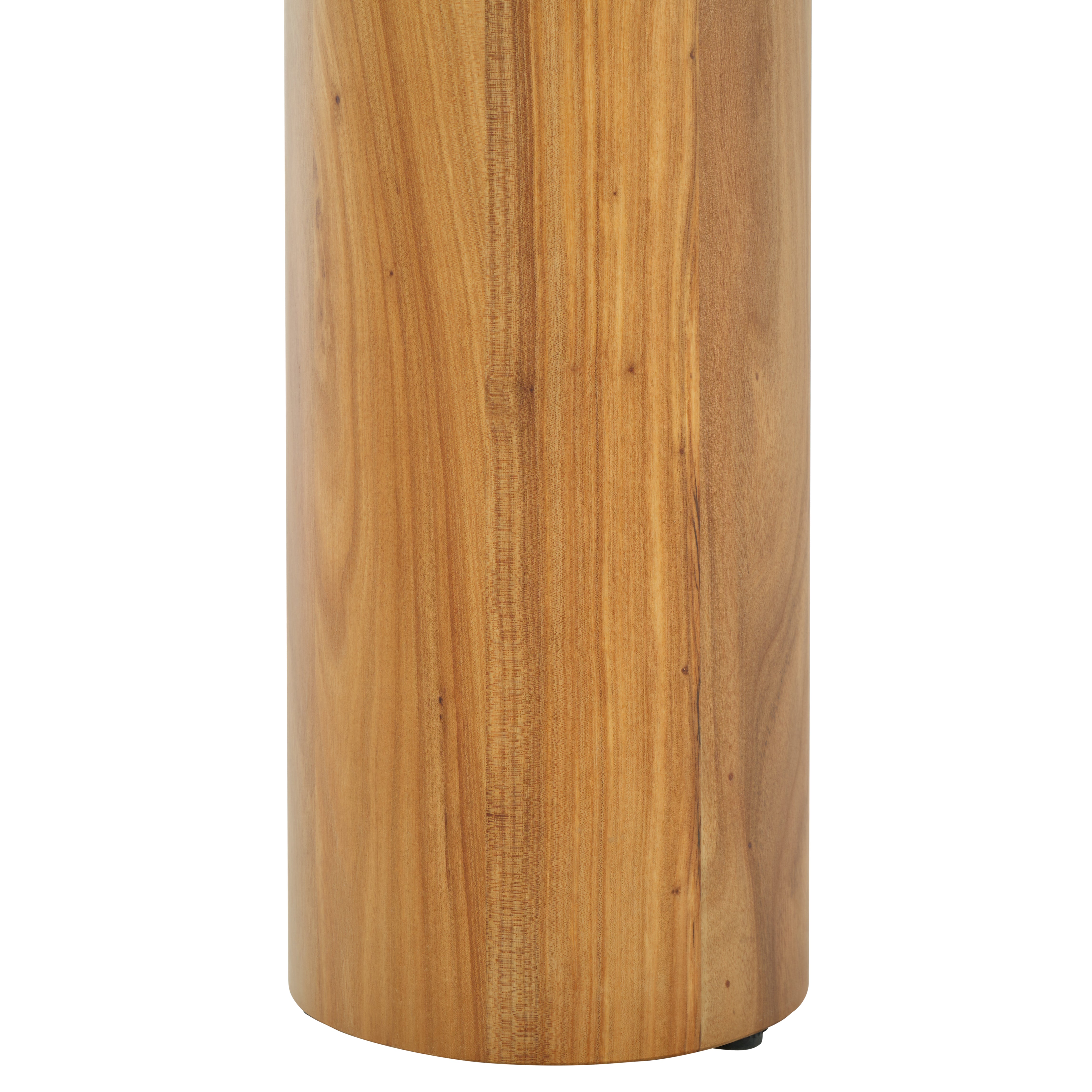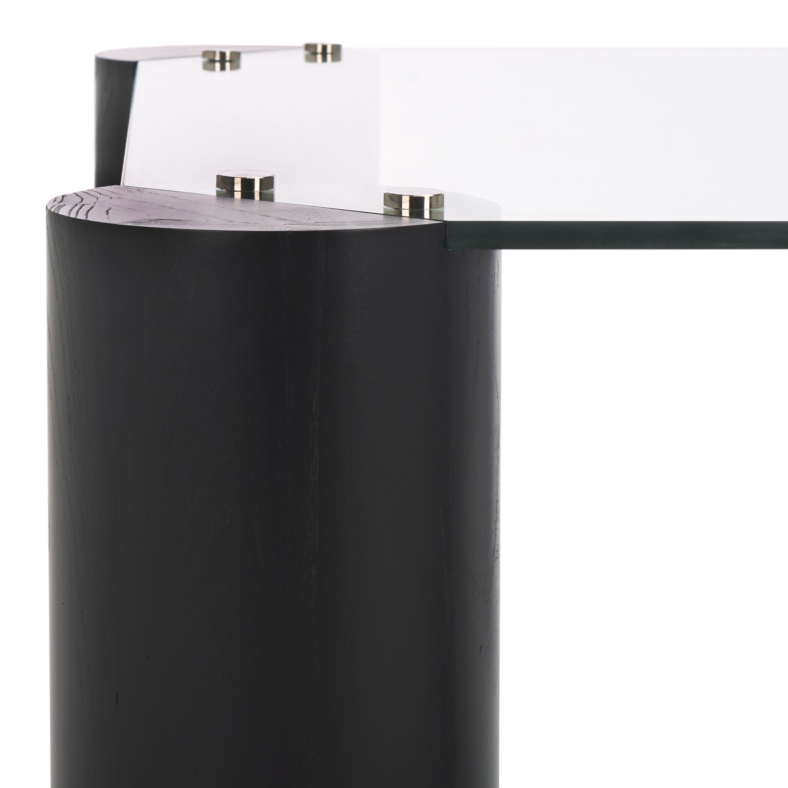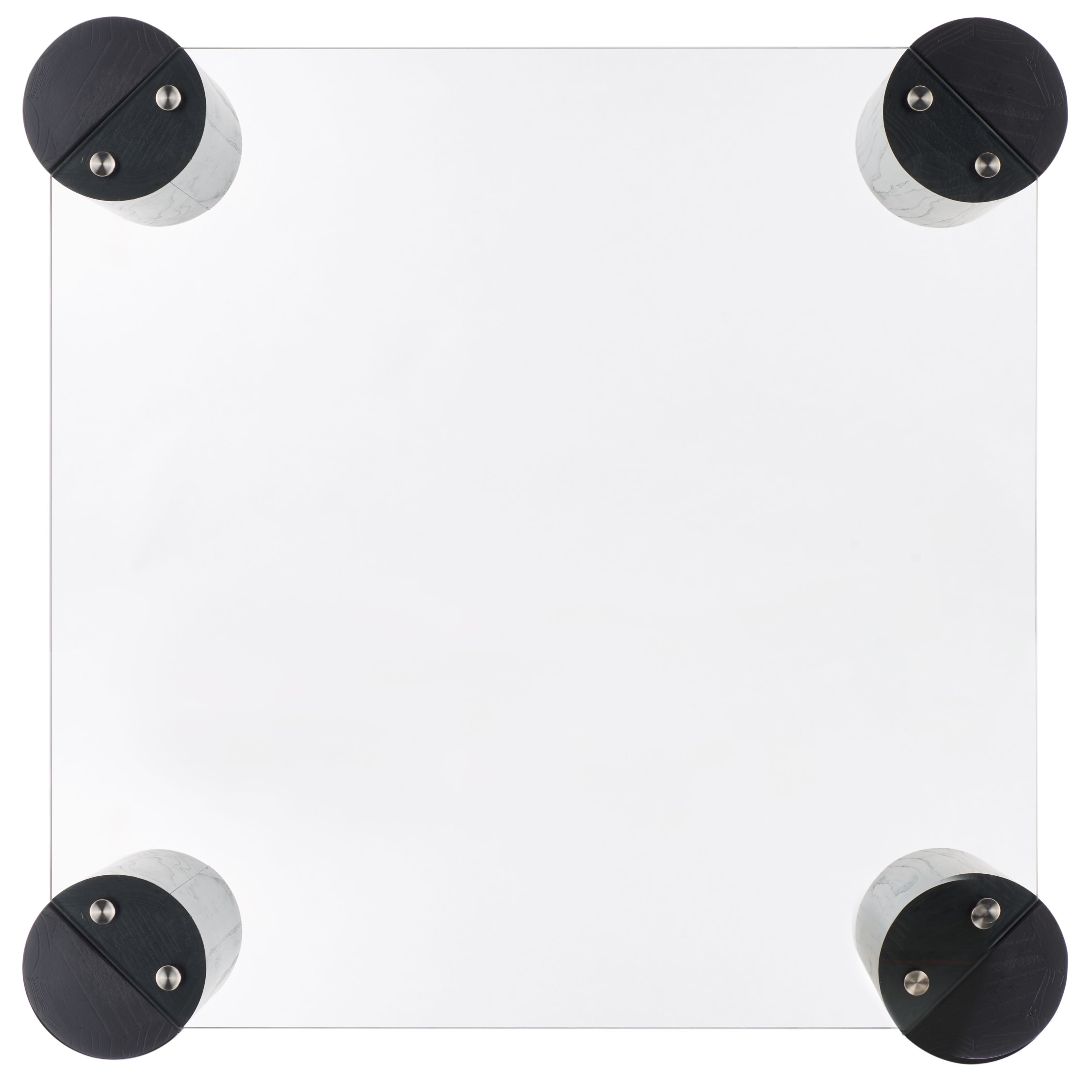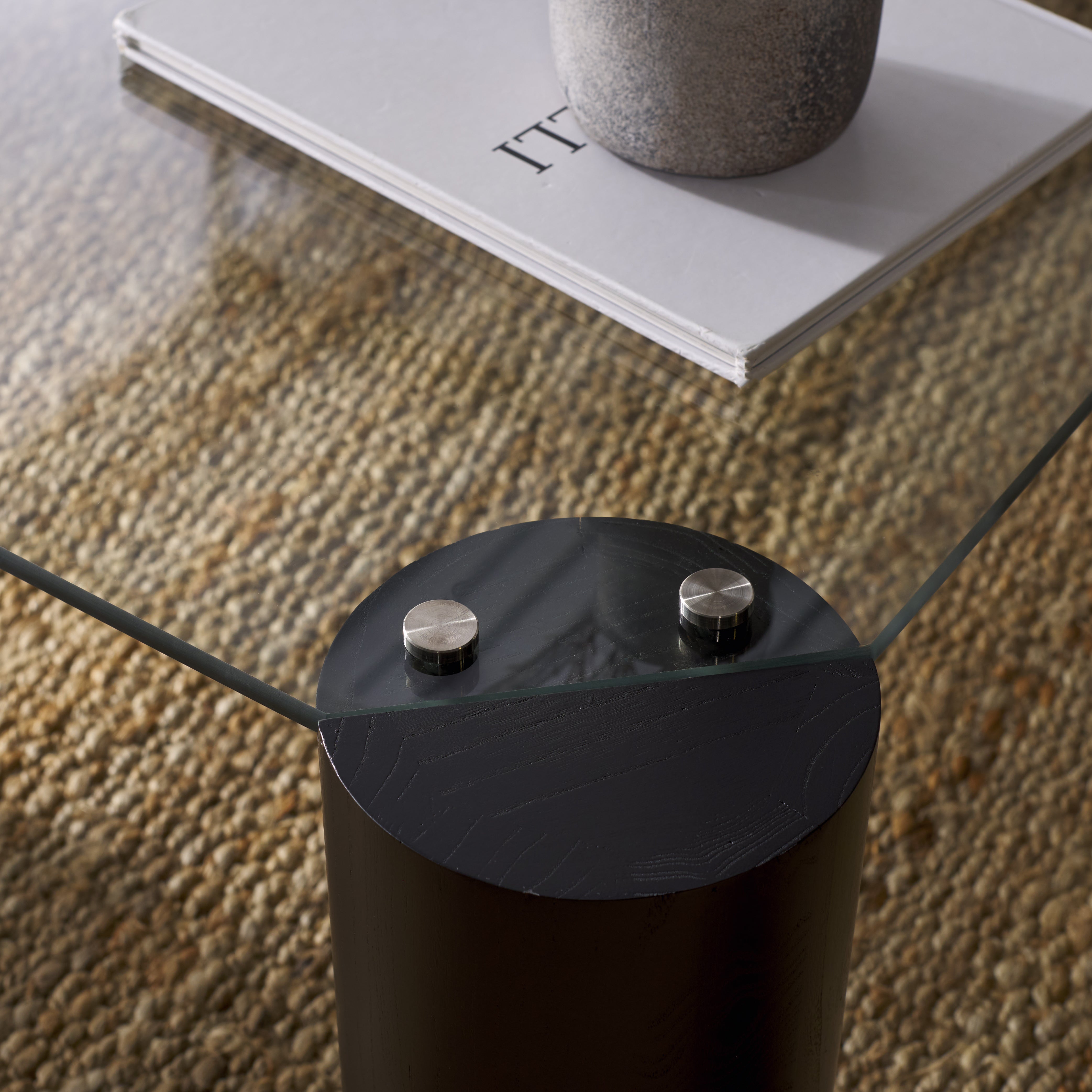 Anchor any room with the refined drama and elegance of our Robbie square coffee table. The coffee table makes a charming statement with its contrasting material and geometry. A glass tabletop creates a stunning contrast with the chunky wooden legs. Its square tabletop sits with tapered edges to attain a beautiful floating effect. The cylindrical legs showcase the rich grains of Elmwood to attain a warm and sophisticated appeal. Featuring a spacious tabletop, our coffee table provides the perfect perch for your favorite decor items and beverages.