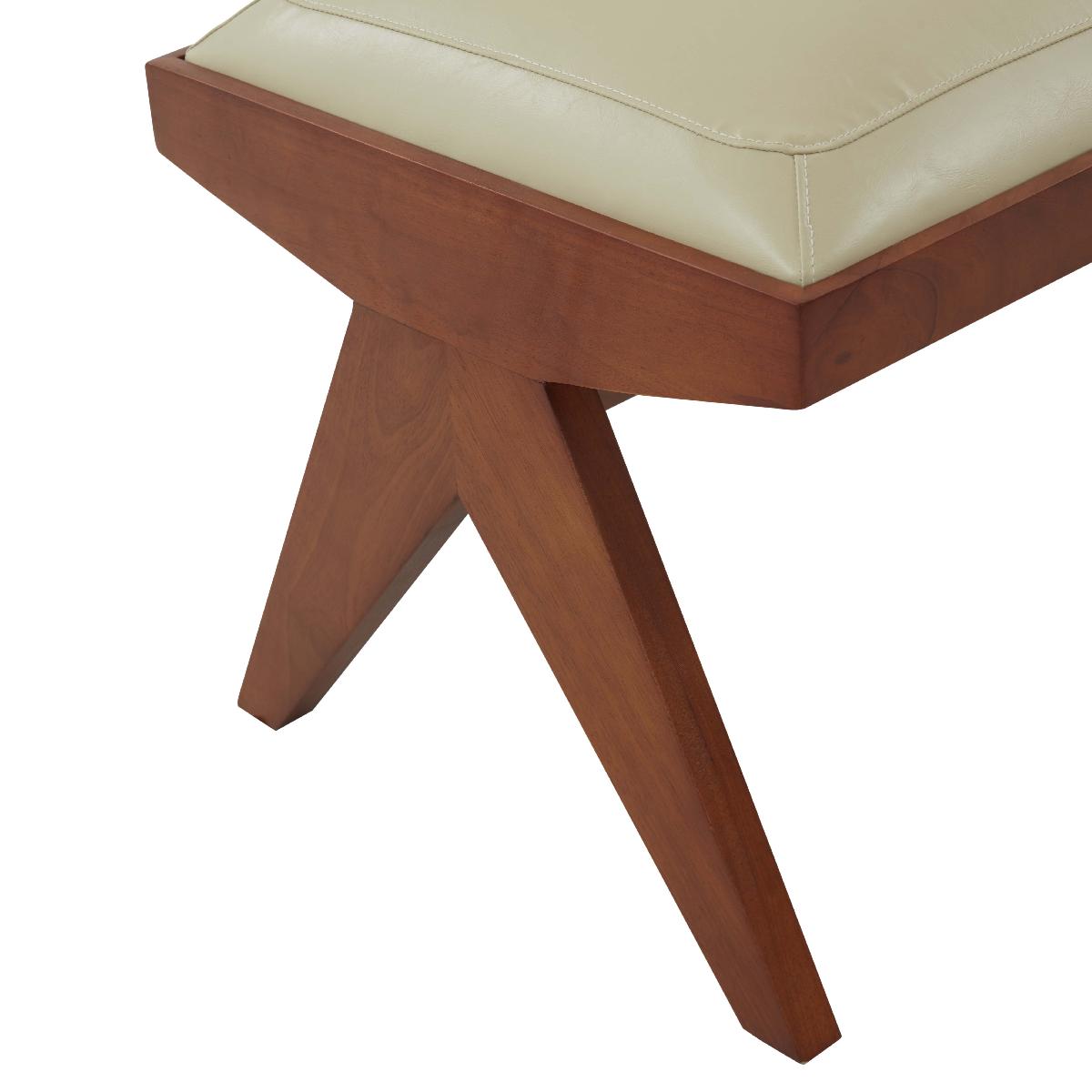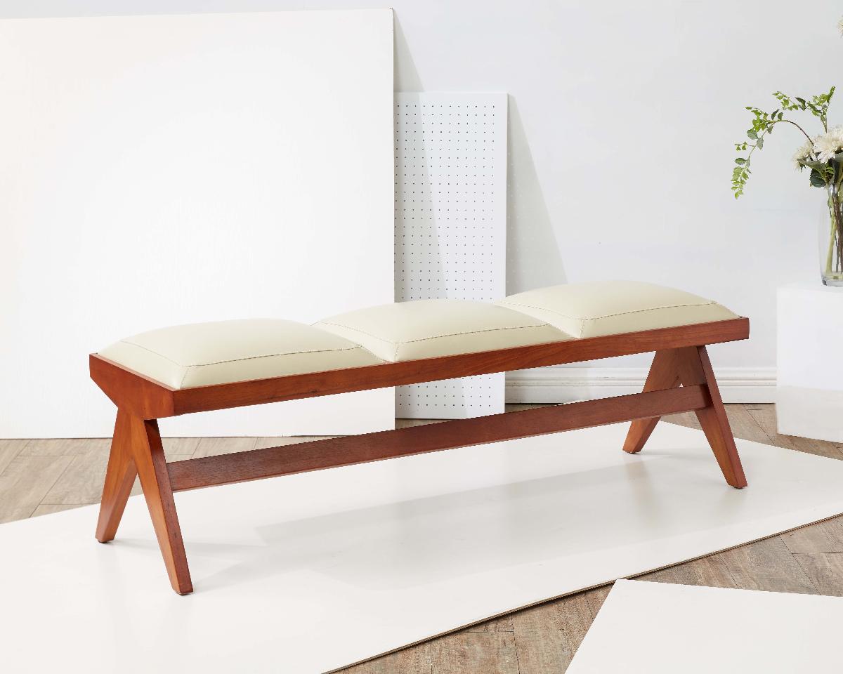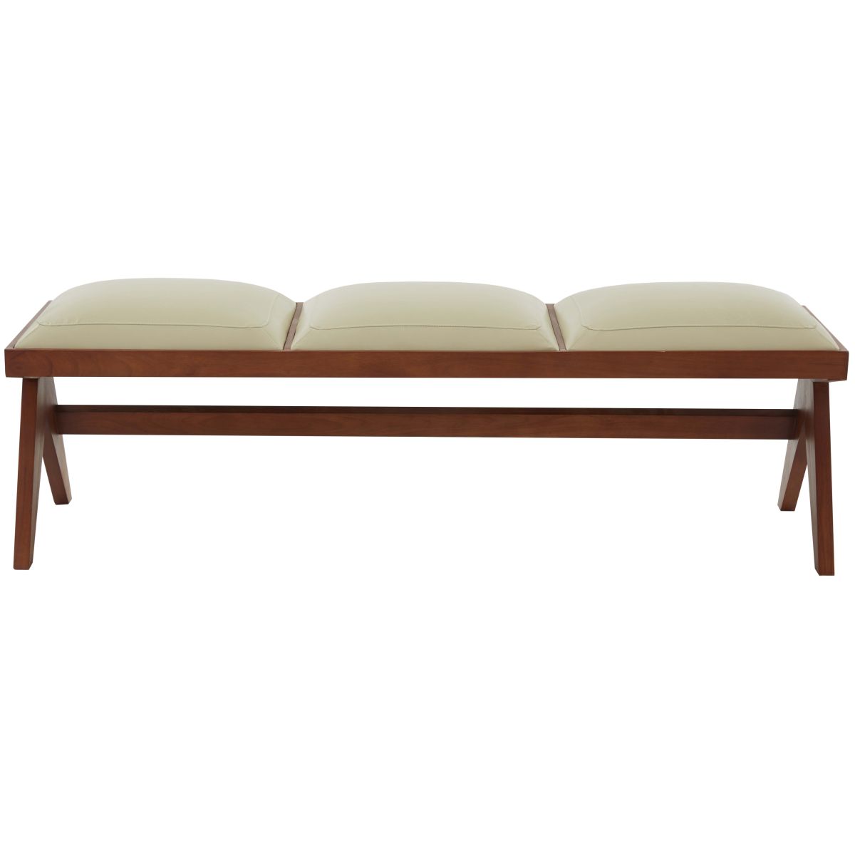 Make a classy and chic statement with our Roselli bench. A blend of rich materials and exquisite details, our bench lends a polished and elevated touch to any corner. It stands out with its sleek angular legs crafted from solid wood to add modern dimensions and charm to your home. Featuring three generously cushioned and well-defined seats in cream-colored vegan leather, our bench attains a luxe and welcoming presence in any room. It can provide extra seating in an entryway or complements the foot of your bed for a stylish impact.