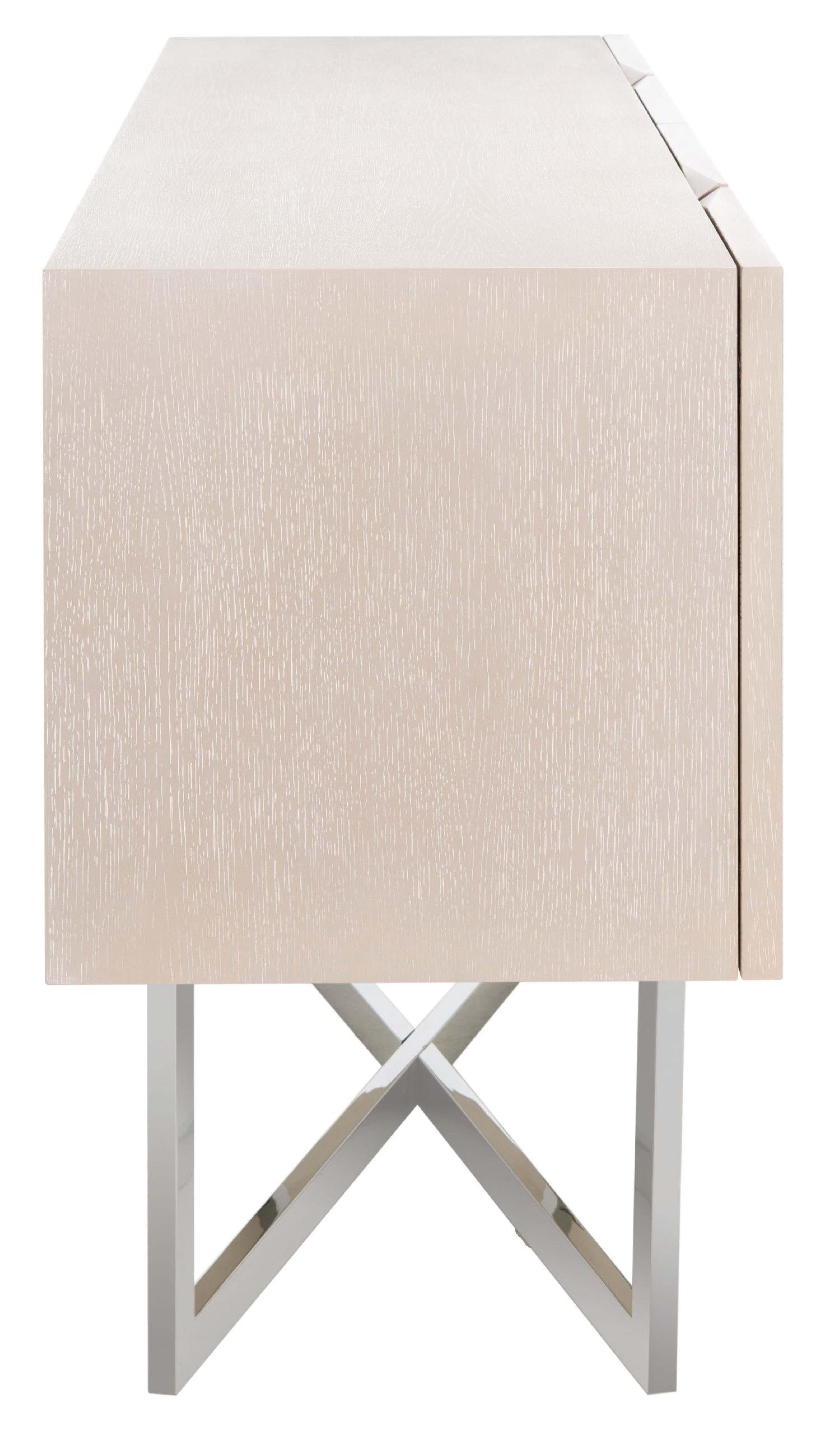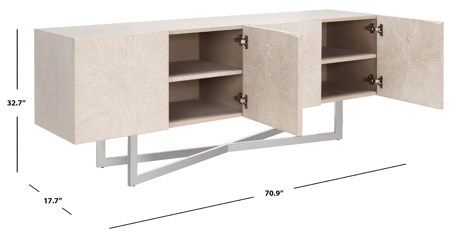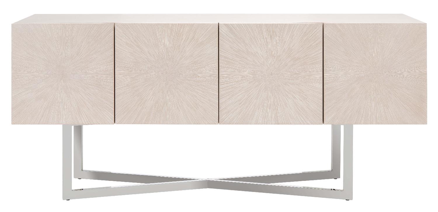 A high-fashion icon of penthouse-chic living, this Zena Buffet is a showstopper. The sunburst-style wood grain of Zena's four light grey doors provide a simultaneously subtle yet dramatic sense of motion, and a crossed nickel base further enhances its decorative depth.