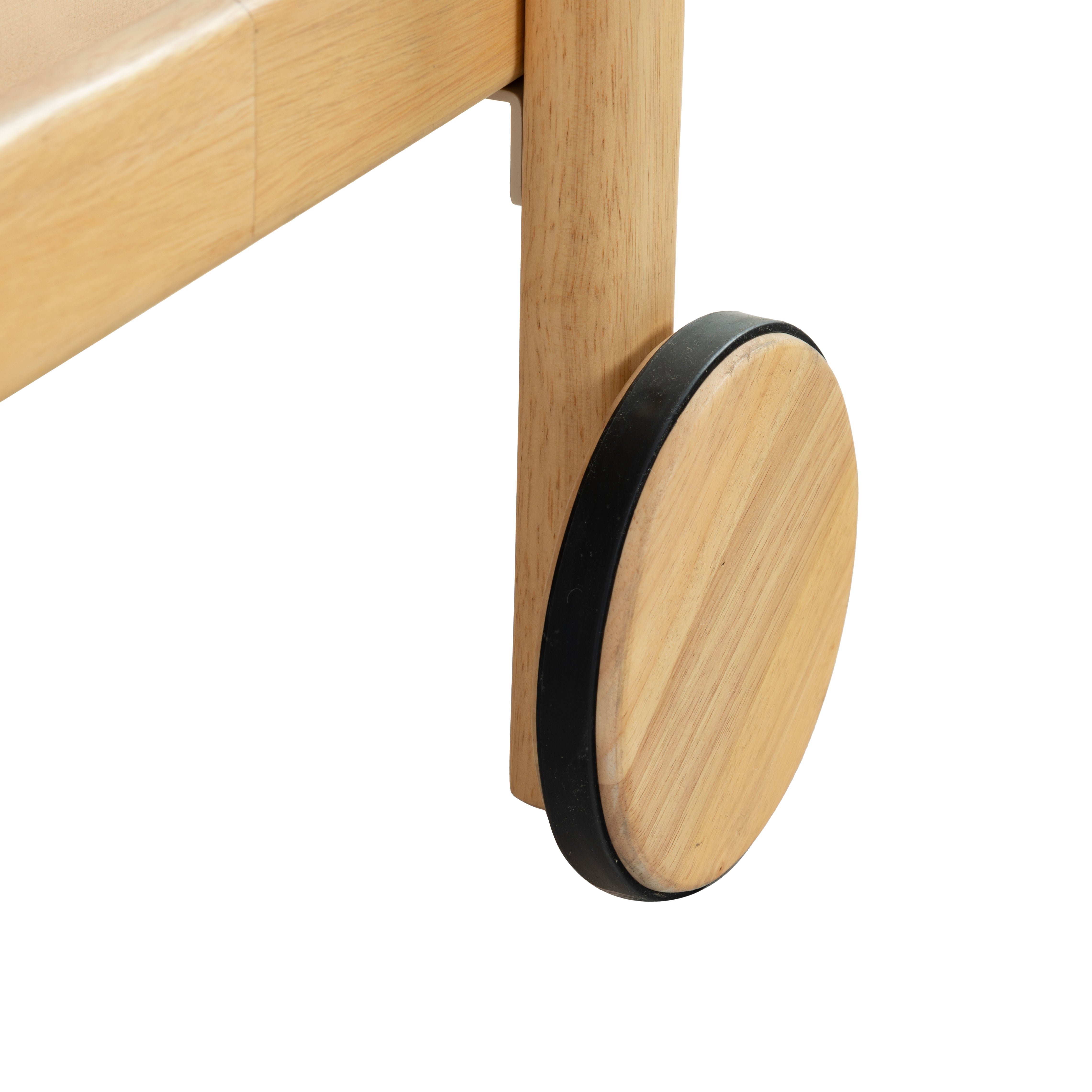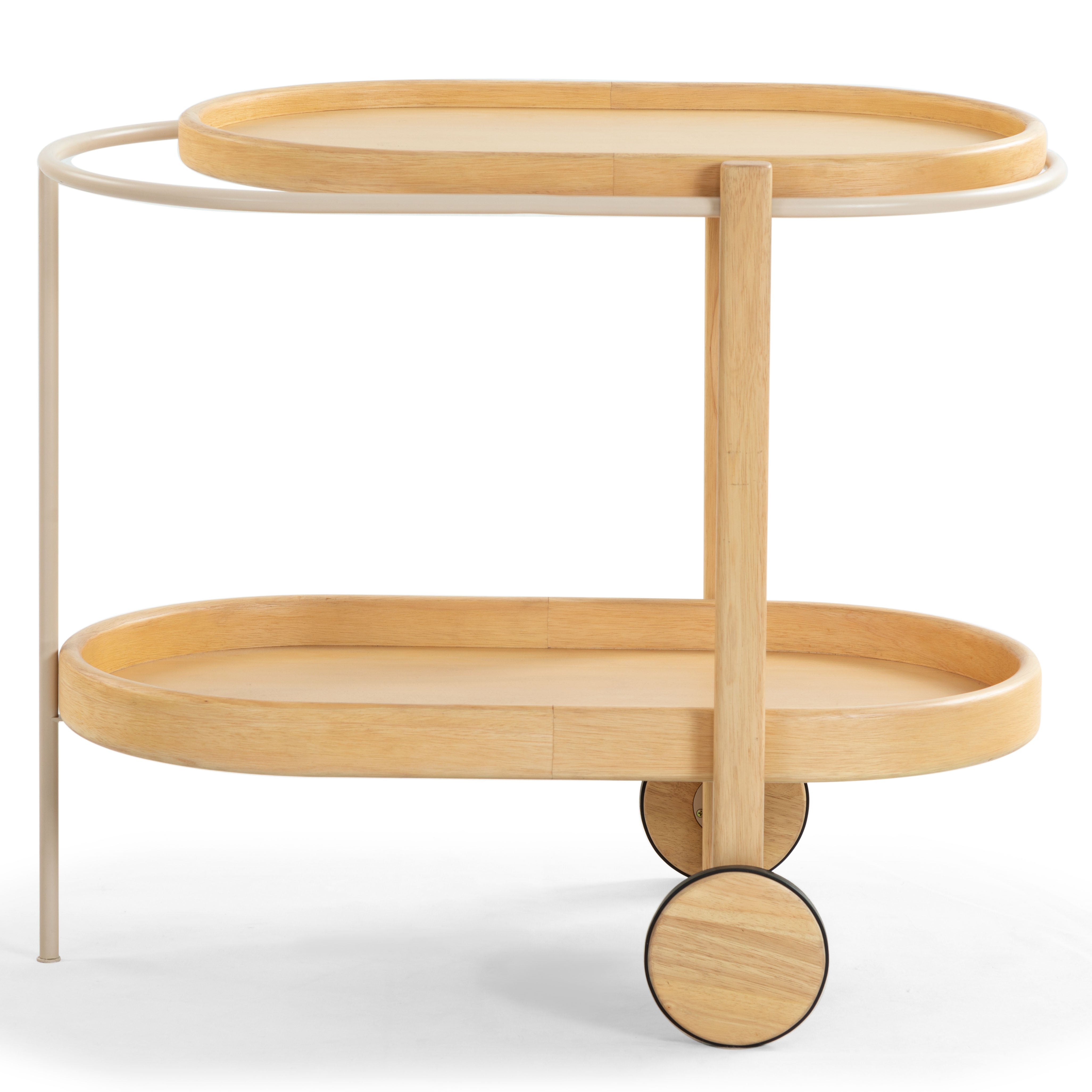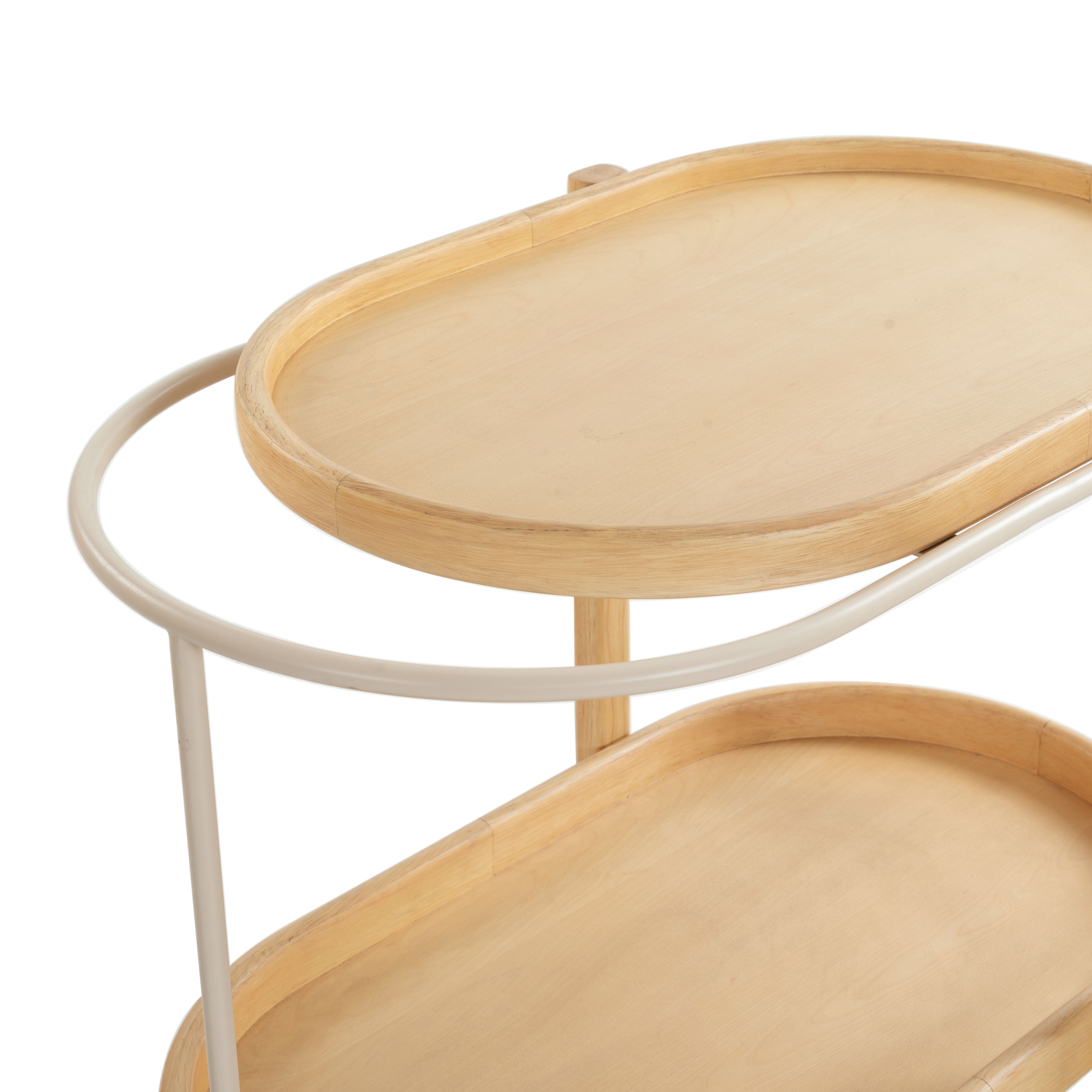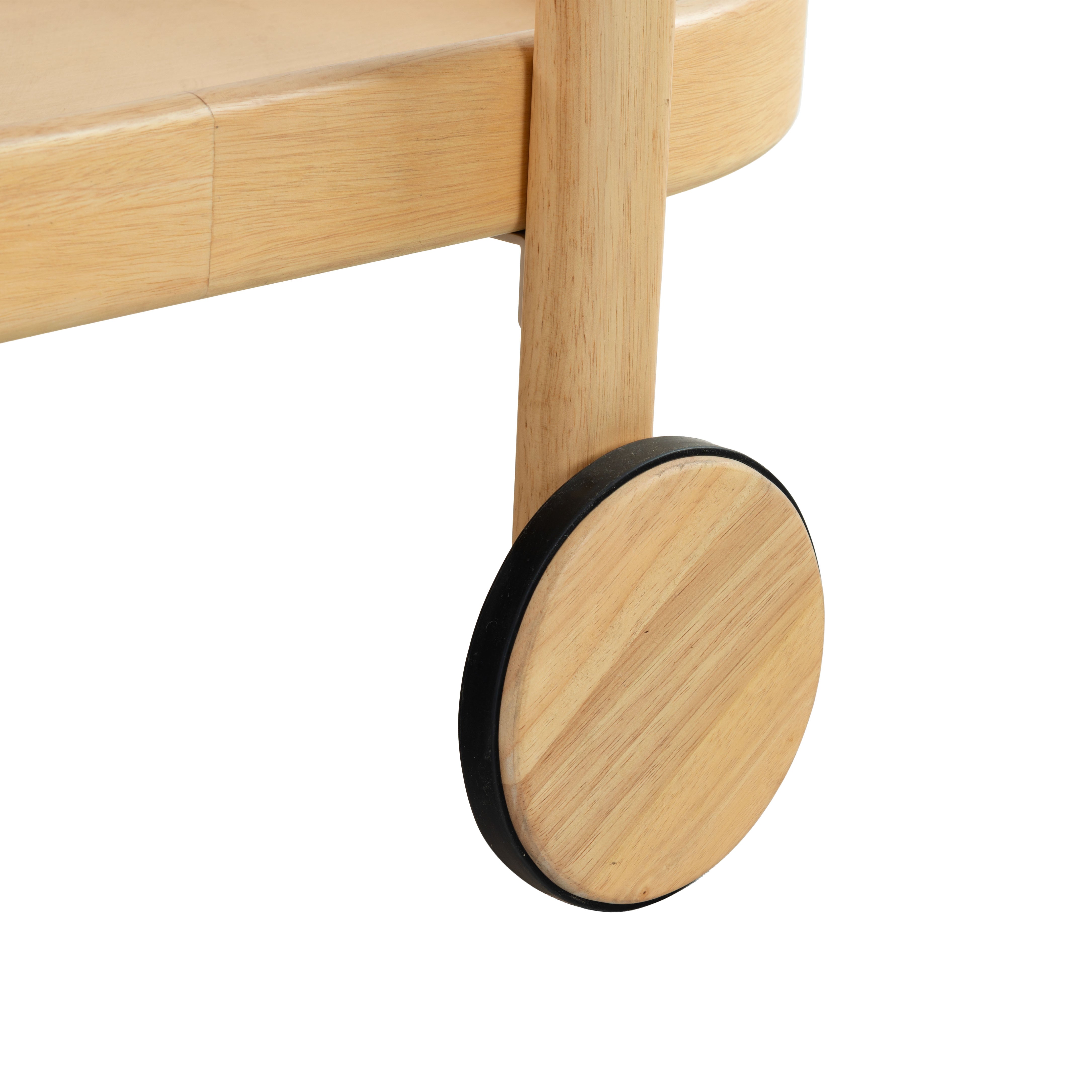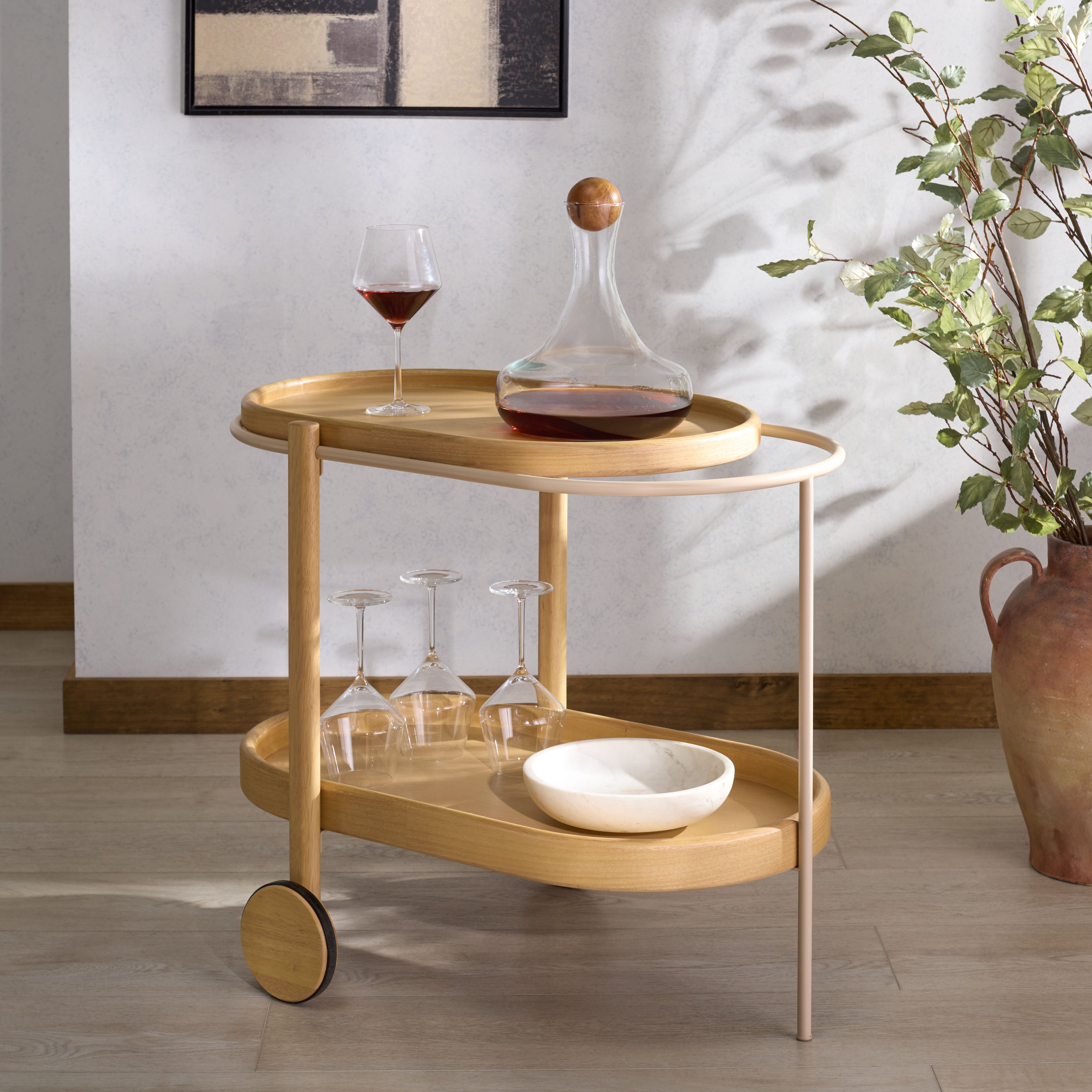 Introducing a captivating blend of style and functionality: the Trianna Wood Oval 2 Shelf Bar Cart in a delightful Natural finish. Crafted entirely from wood, this bar cart adds a touch of rustic elegance to any home or entertainment space. Its oval design is not just unique but also offers generous surface area, perfect for showcasing and serving your favorite drinks and hors doeuvres.