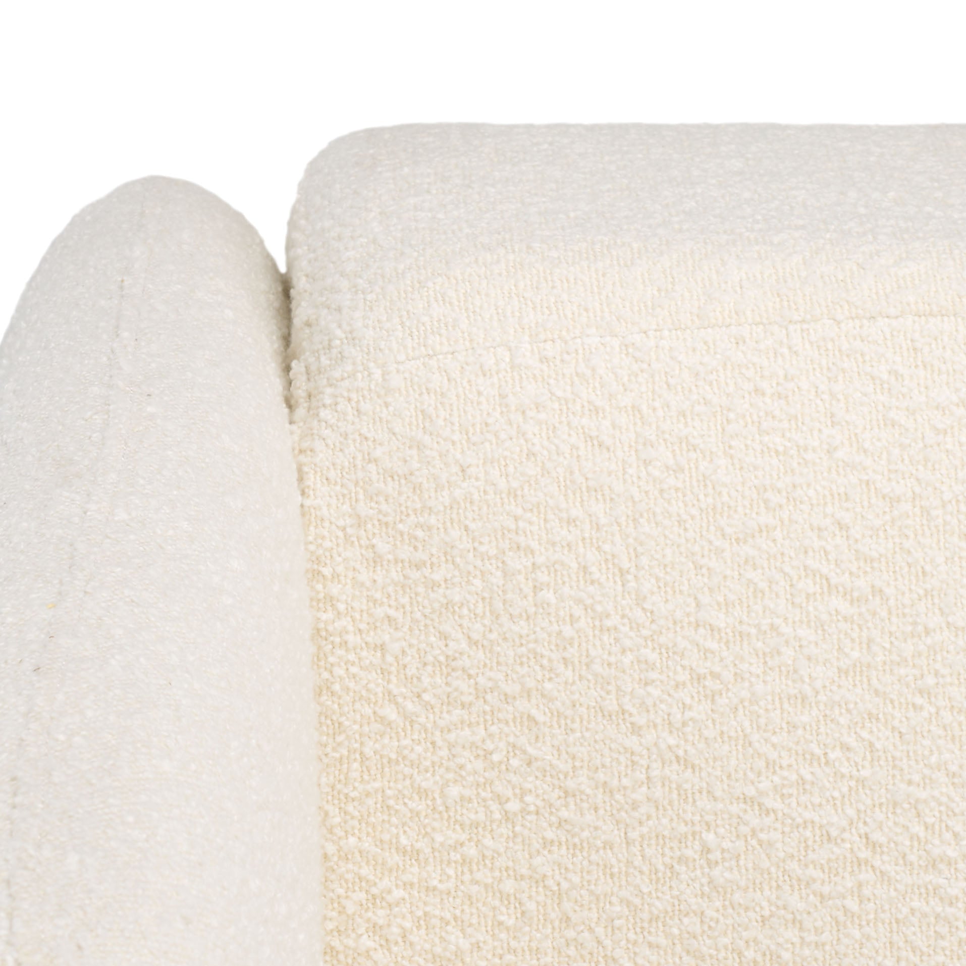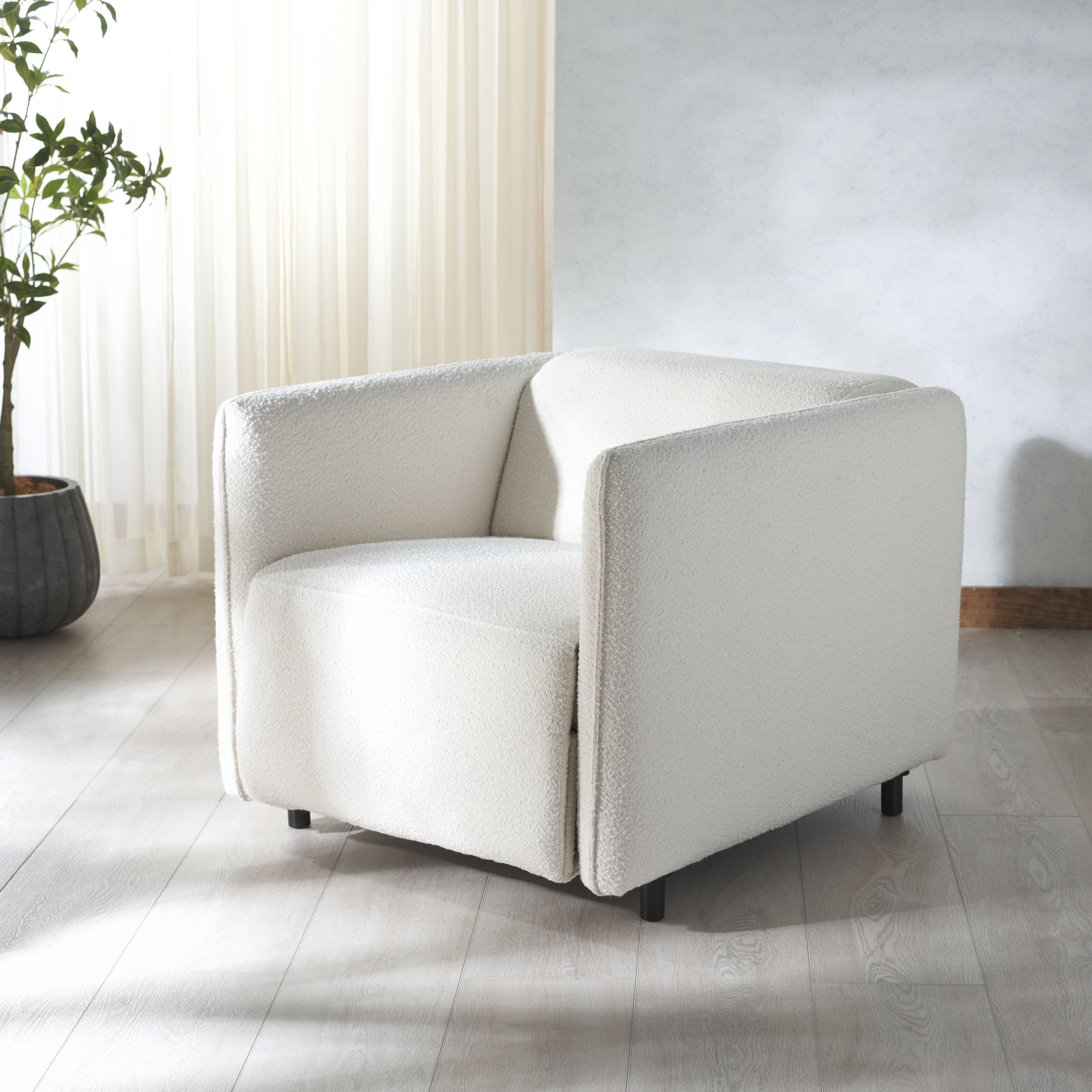 Enjoy a plush and comfy respite with our Macilena Recliner. The clean lines and crisp upholstery of our chair fashion a modern look with mid-century undertones. It's sheltering arms and deep seat envelop you in effortless comfort. The clever design and neat tailoring of our accent chair conceal the reclining mechanism to offer the perfect blend of style and functionality. Fully upholstered in the rich textures of boucle in an ivory hue, our recliner remains the perfect spot to read, relax, and lounge in any corner of your home.
