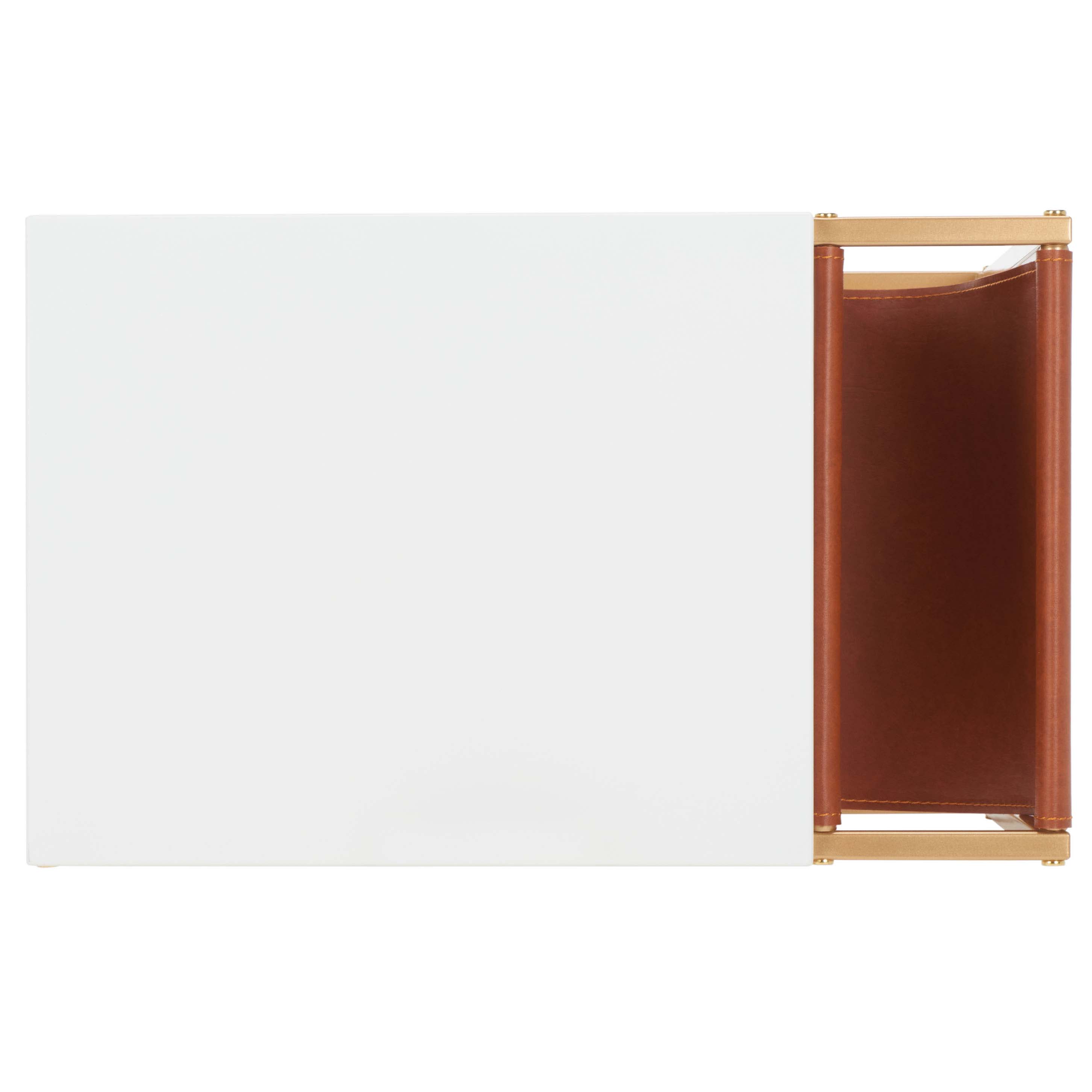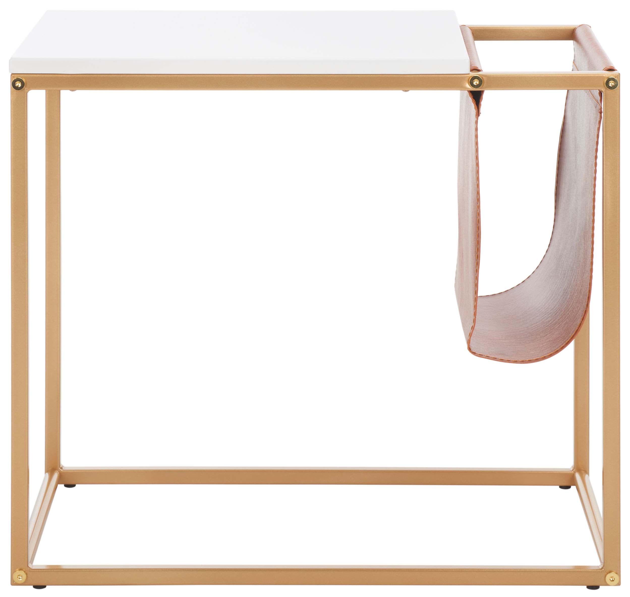 Embrace the sleek style and functional appeal of our Eugina side table. Featuring a clean-lined and tailored profile, our side table delivers industrial undertones. Its white wooden tabletop and gold metallic base receive a subtle pop of color with a handy pocket, adorned in brown faux leather fabric. Durable and mildew resistant, the end table stores your newspaper and magazine while providing adequate space to place your morning cup. Place beside a sofa or armchair, the end table creates the perfect reading nook.