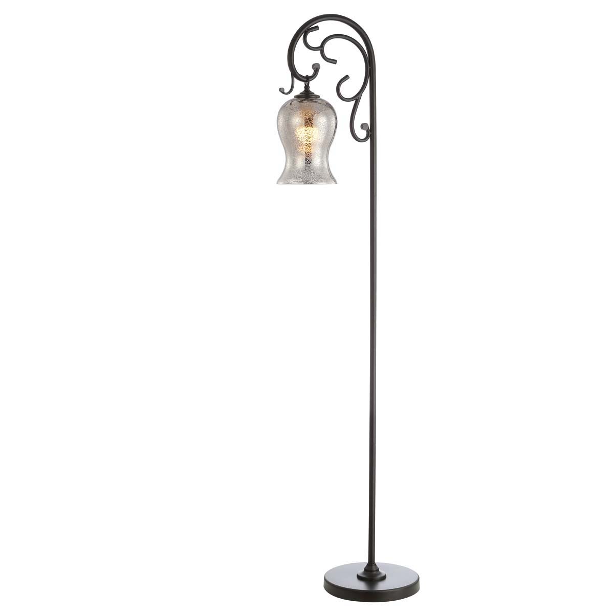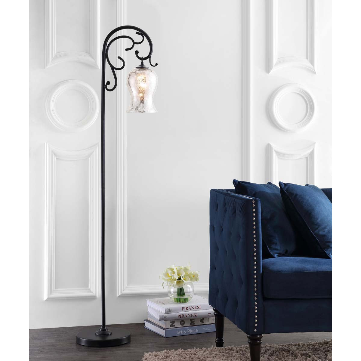Transform any room into an enchanting interior with this elegant black floor lamp. Finely crafted to showcase its delicate scrolls, this updated spin on the Victorian bridge lamp features a dramatic lantern style authentic silver and ivory glass shade.