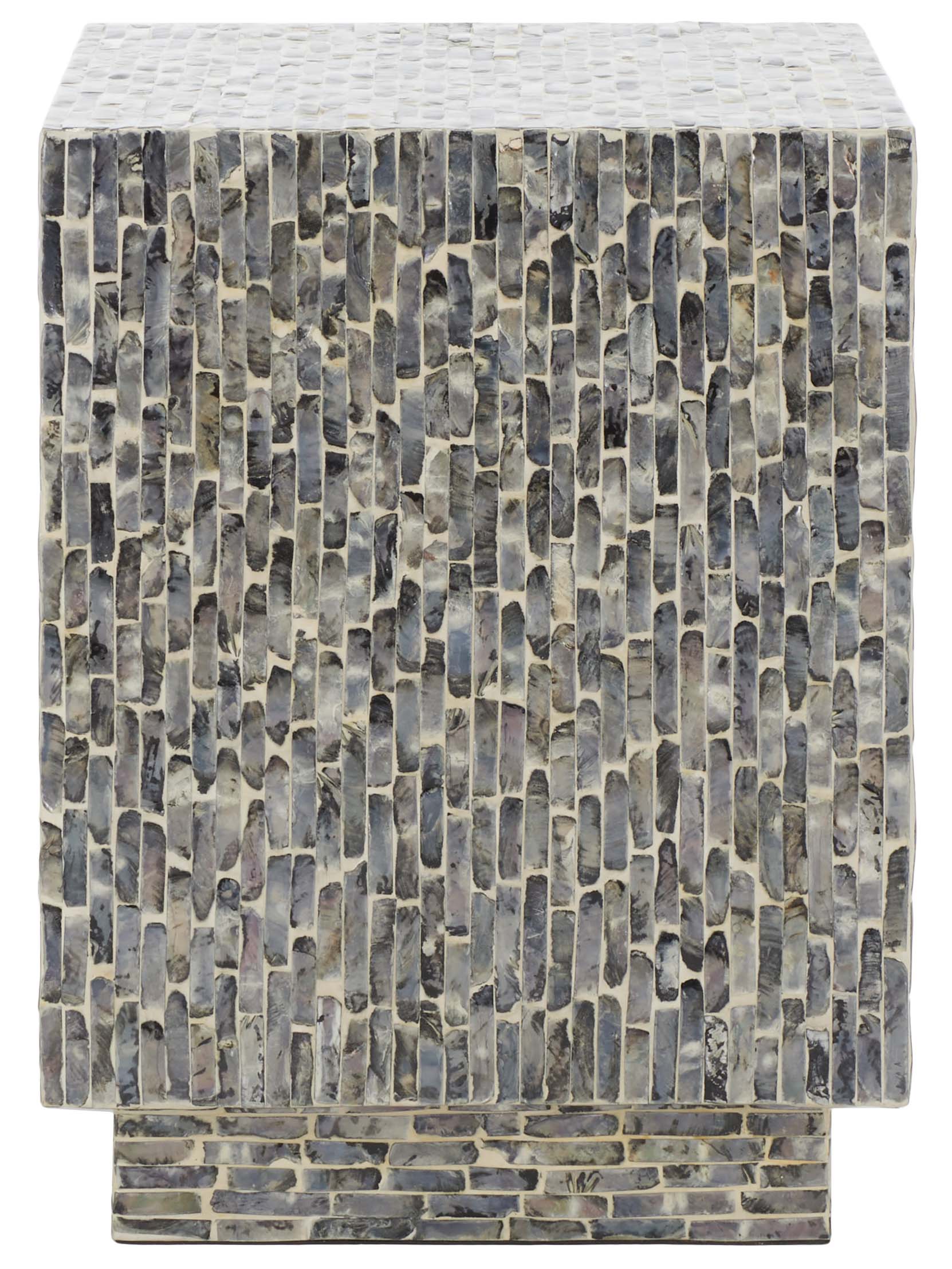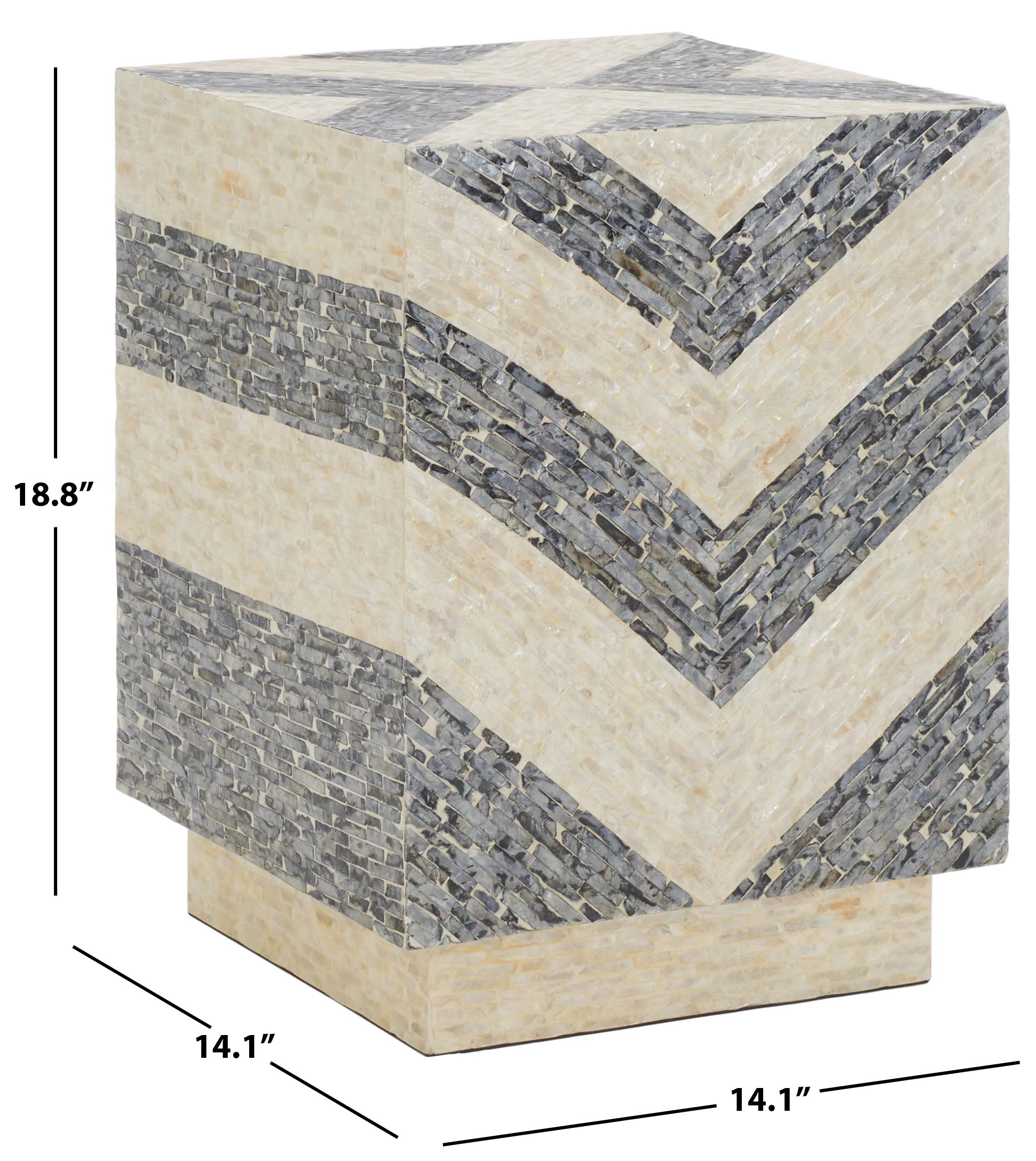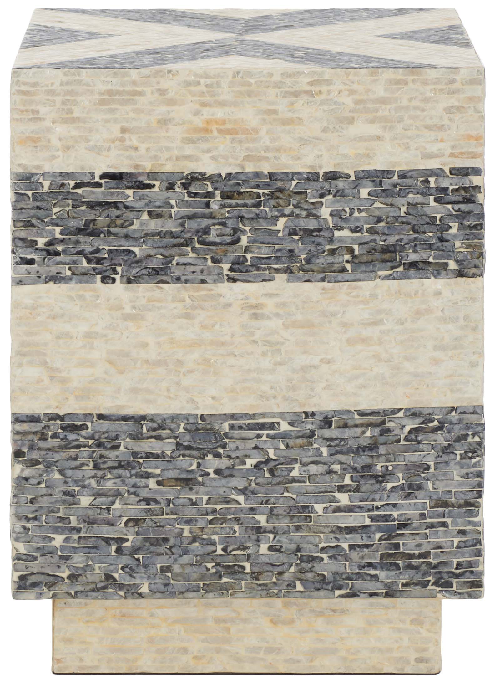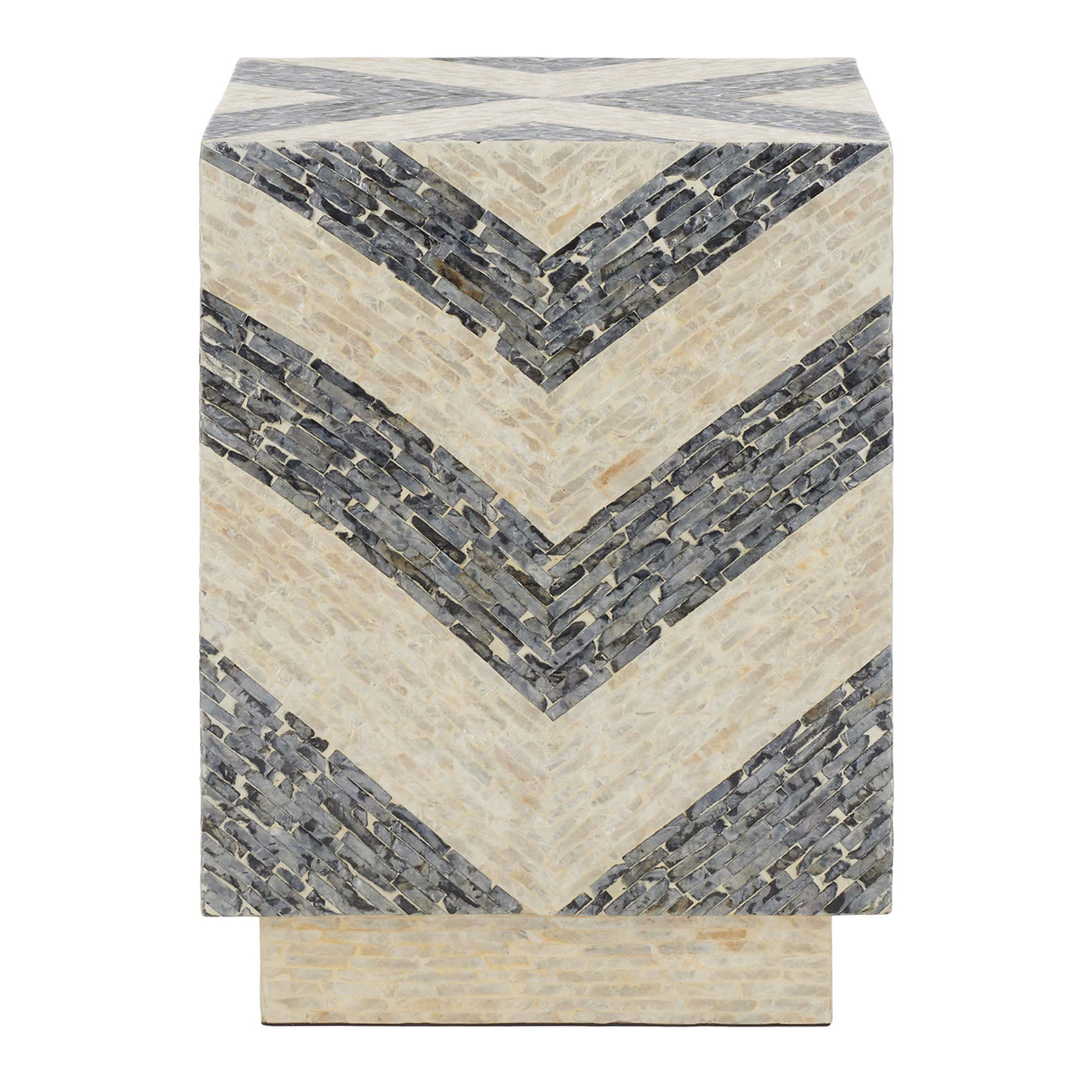 A hypnotic must-have for the elegant artistic interior, this Blythe Stool is absolutely breathtaking. Blythe boasts lavish tonal depth in the white and dark grey tones of its subtly shimmering capiz shell inlay, further enhanced by its eye-catching stepped tile pattern within streaming oversized chevrons.