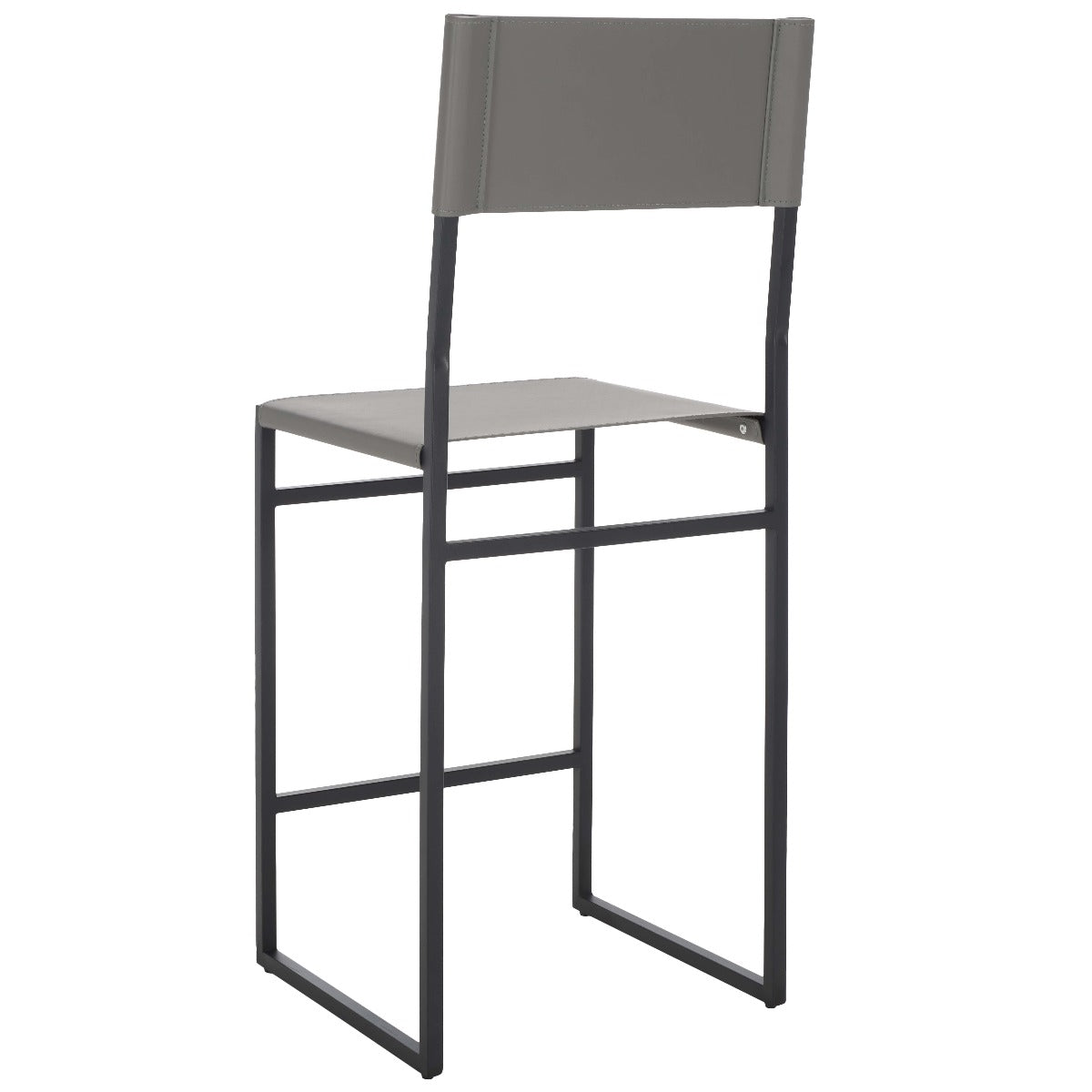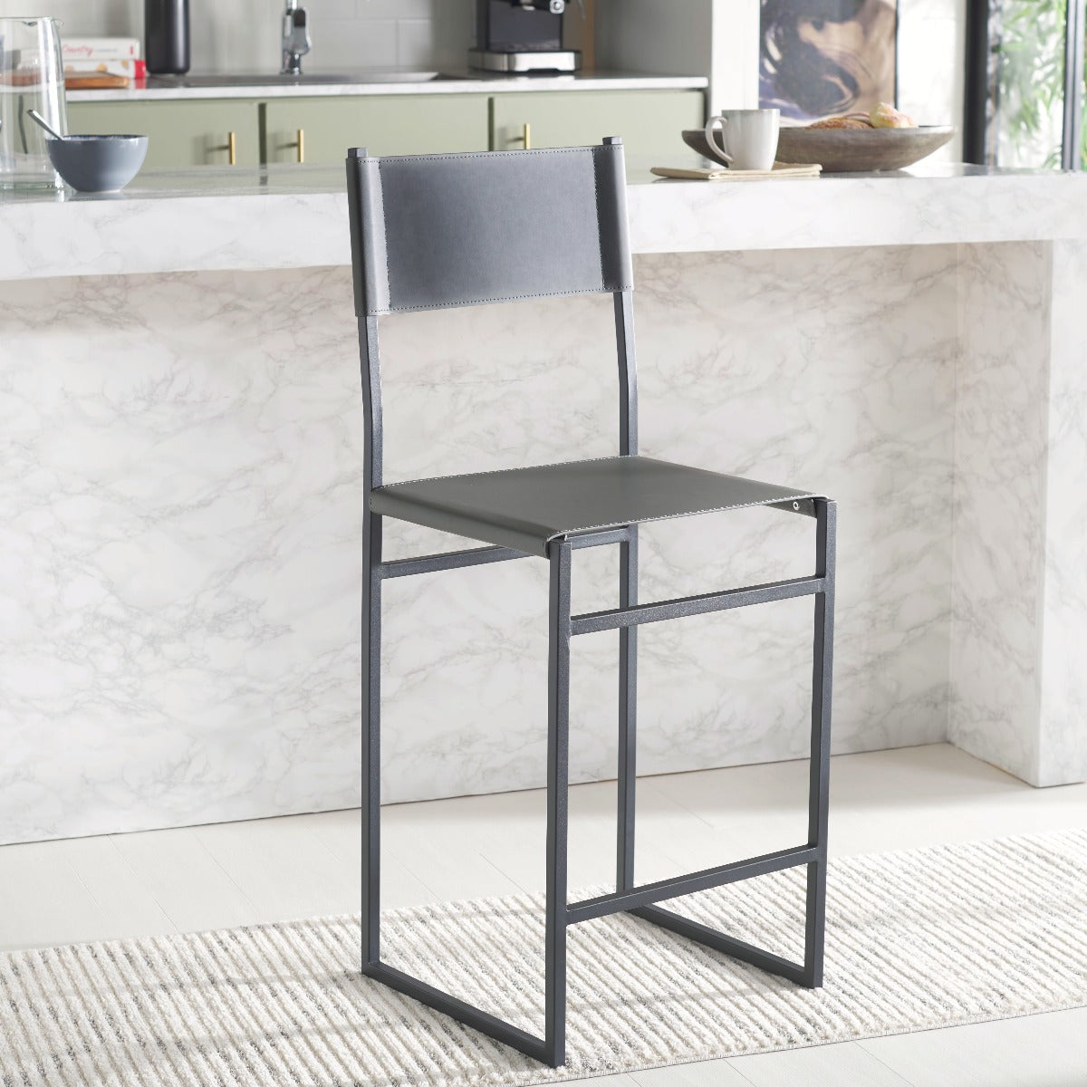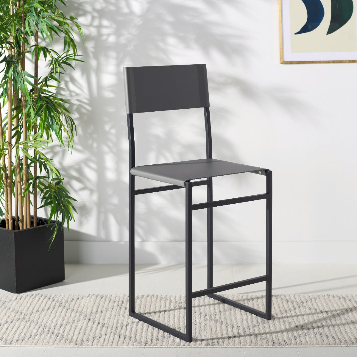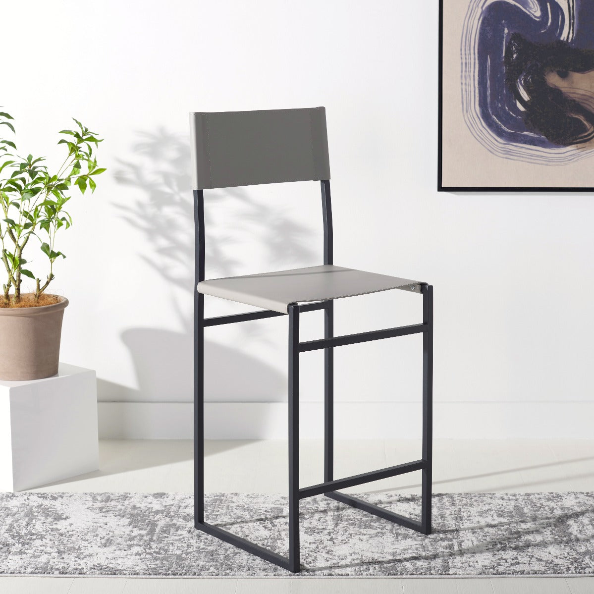 Give a sleek and stylish update to your home with our Layne counter stool. Our minimal and clean-lined stool stands out with a mid-century industrial vibe. Stunning regenerated leather wraps through and around its black metallic frame. Adorned in light grey leather, our versatile counter stool opens up any compact space with its sleek and minimal style. The stool is perfectly scaled to complement your kitchen counter, high dining areas, and work table.