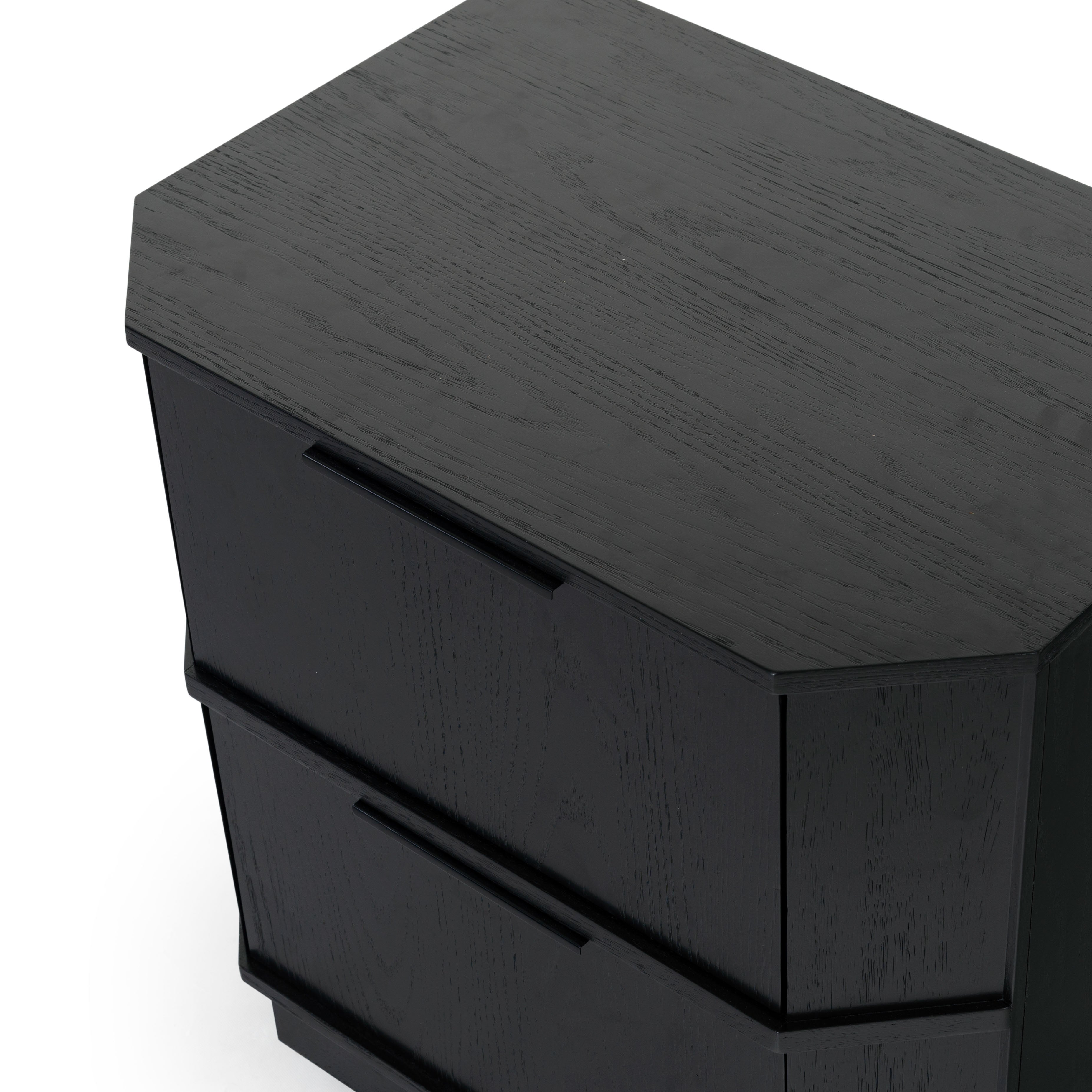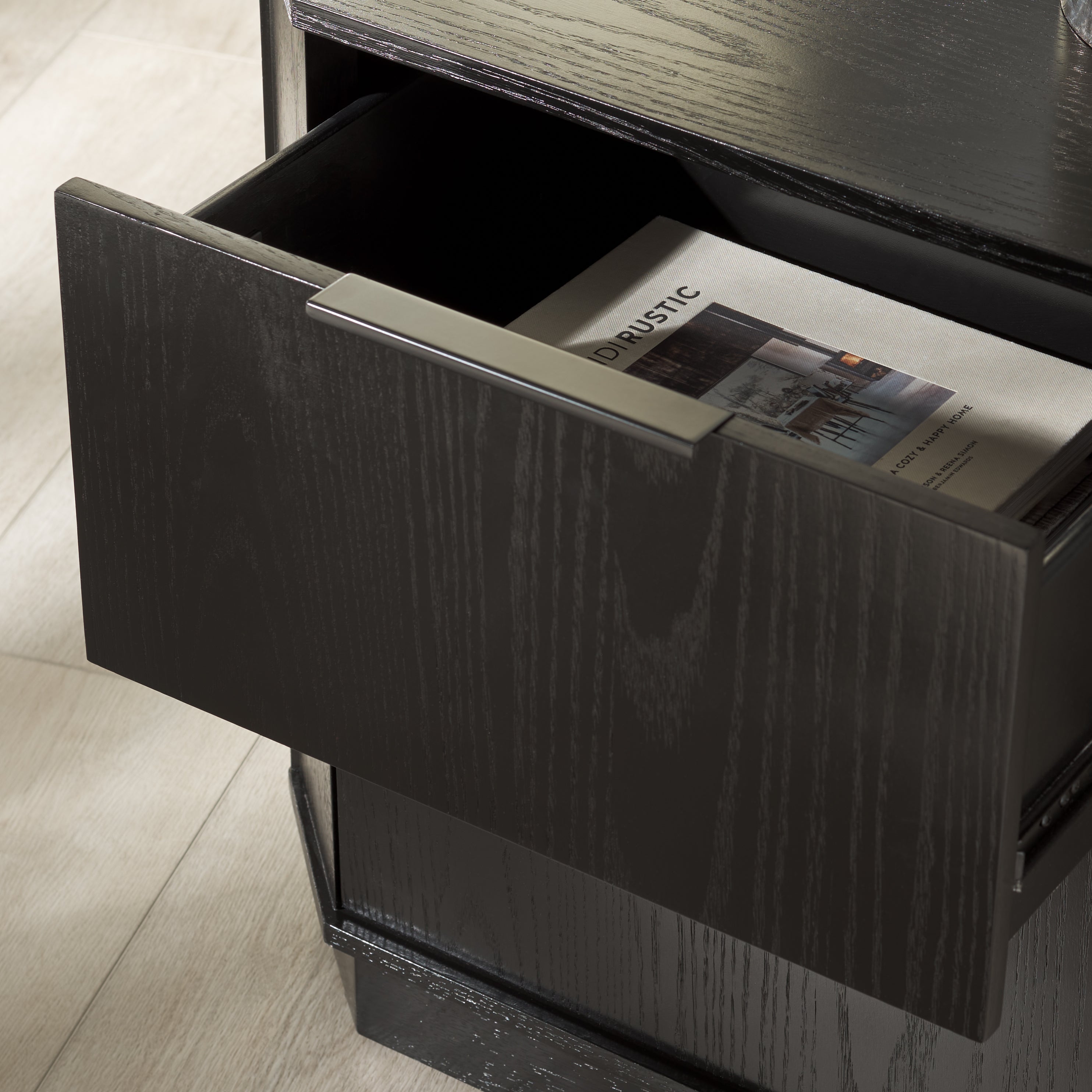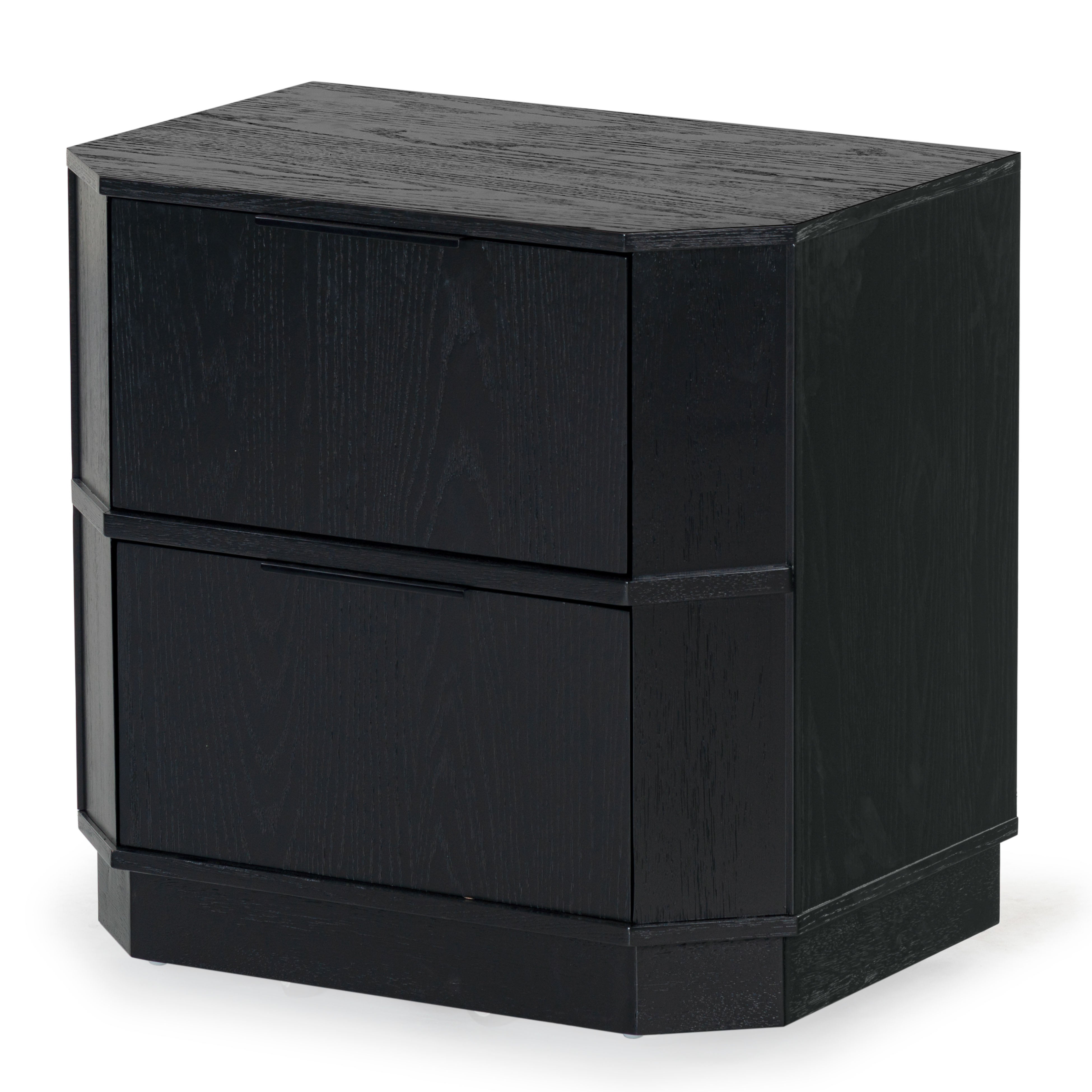 Introducing the Aerilyn Curved Front 2 Drawer Nightstand - a timeless addition to your living space. This nightstand stands out in a sophisticated black finish or medium oak. Crafted from a thoughtful combination of solid rubberwood, oak veneer, plywood and manufactured wood, this piece showcases strength and durability. Its curved front design and two spacious drawers enhance not only storage capacity but also its visual appeal. A smooth iron frame lends a modern touch to this classic piece, capturing the essence of contemporary style. This nightstand isn't just furniture - it's your statement of elegance. Welcome this versatile masterpiece into your home and bask in homely inspiration. Bring on the cozy night-time reading sessions!