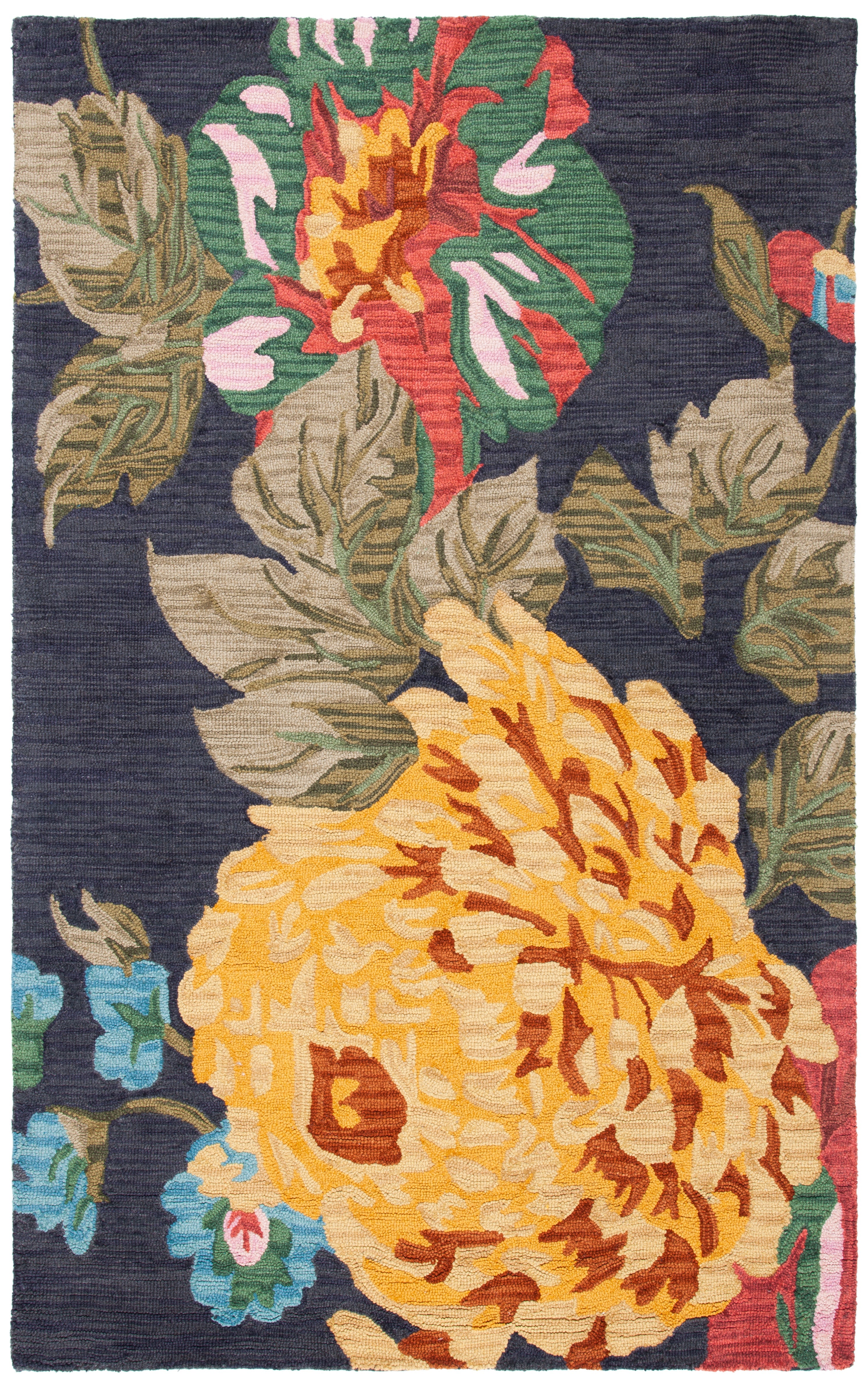 Boasting an opulent black background, the rug comes alive with a vibrant multi-colored floral pattern that commands attention. The rich palette features bold yellows, reds, and greens, bringing warmth and character to any area.