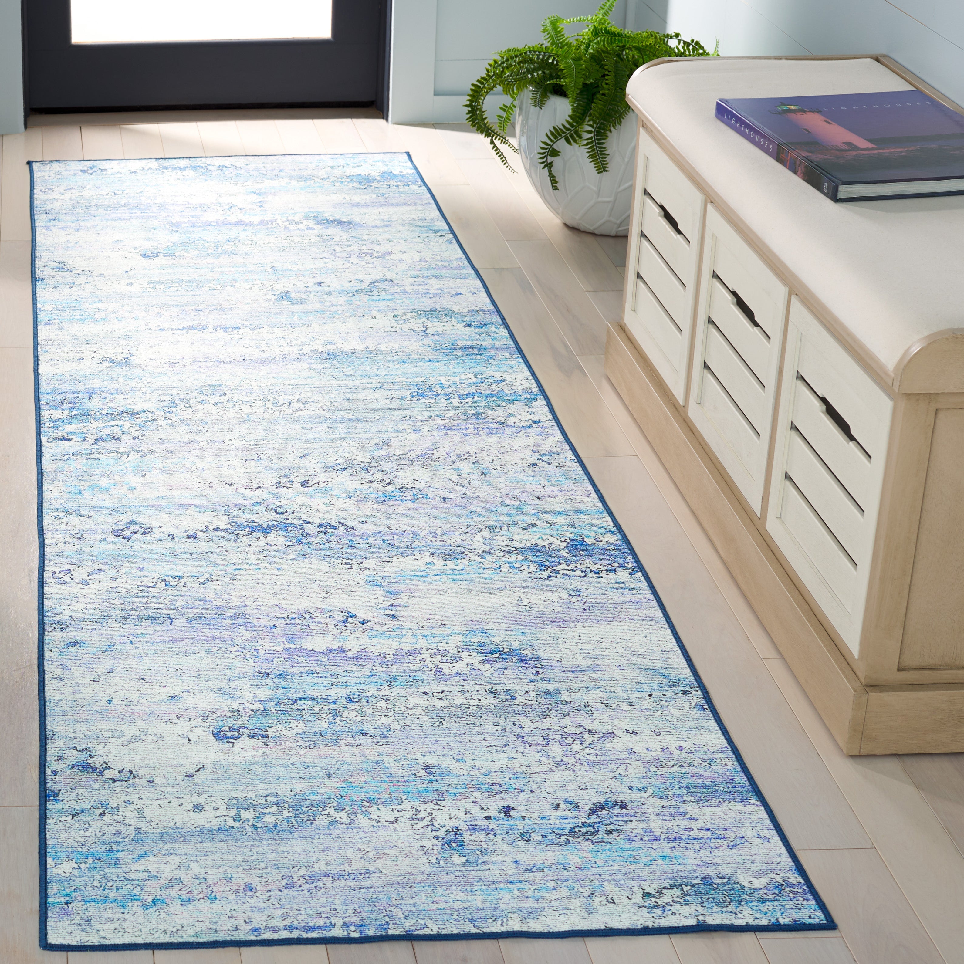 Designed with a harmonious blend of grey and blue hues, the rug's transitional style integrates seamlessly with a variety of decors, from modern to classic, adding a touch of sophistication to any hallway or narrow space. The subtle, distressed pattern provides a contemporary look that captures the essence of time-honored craftsmanship.