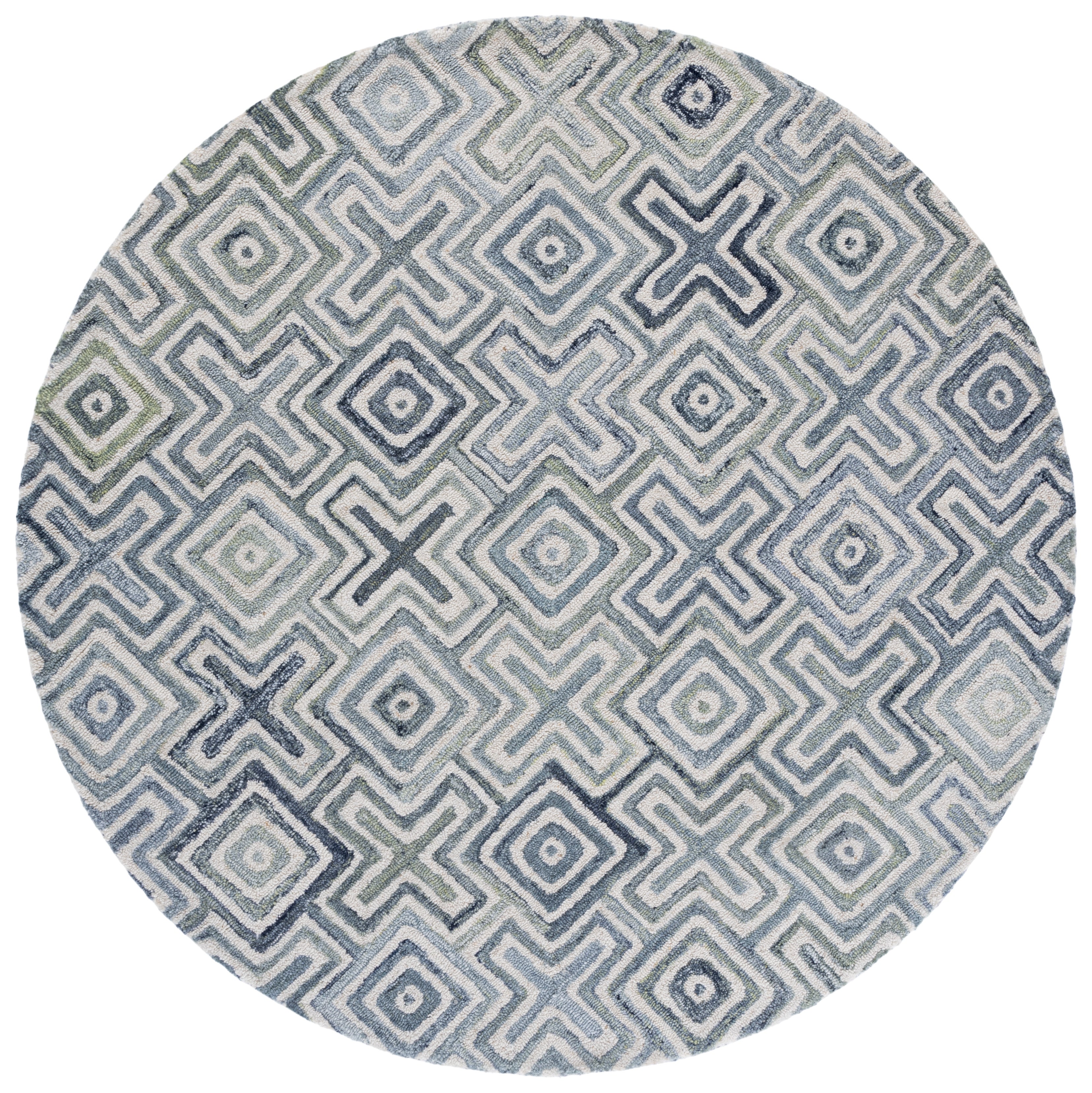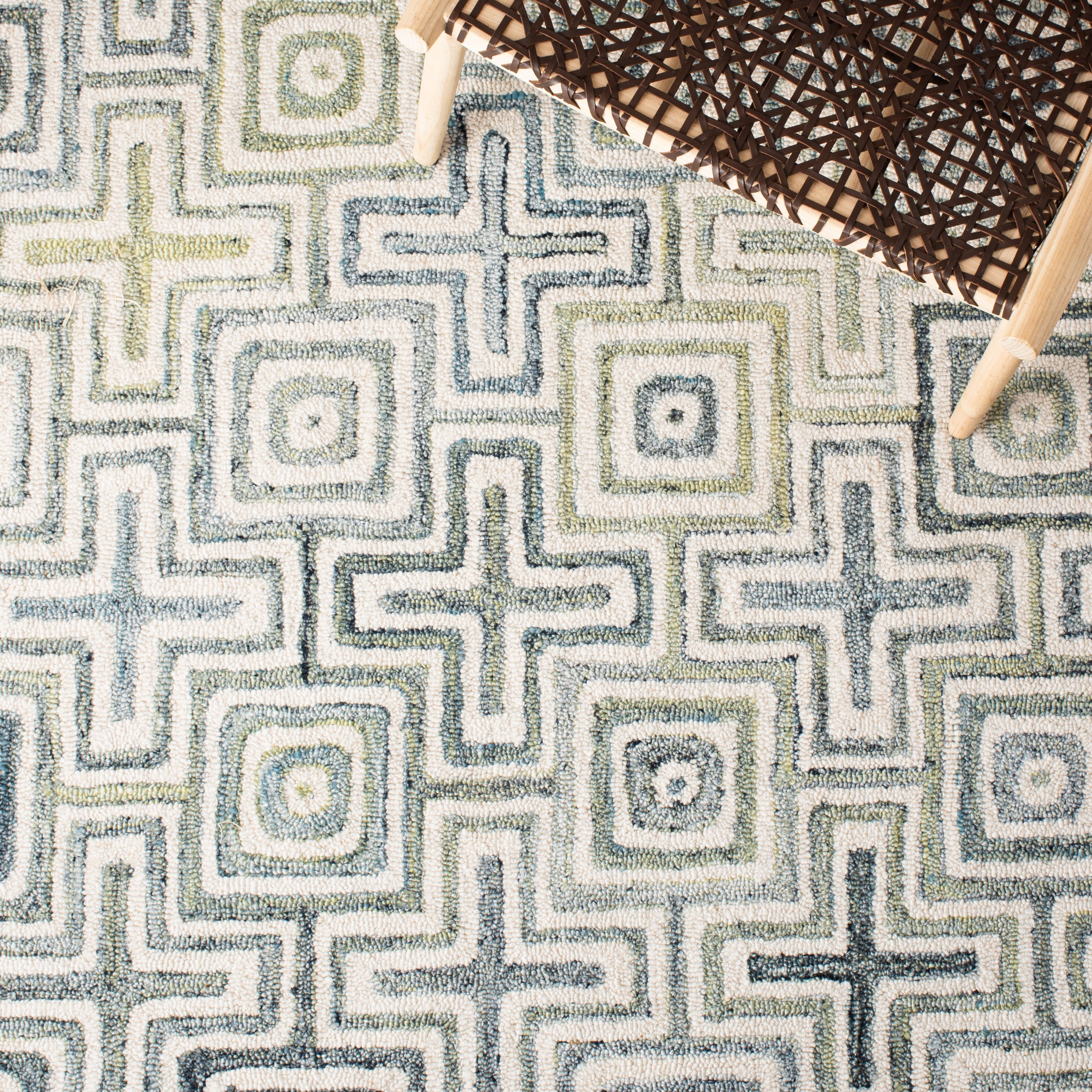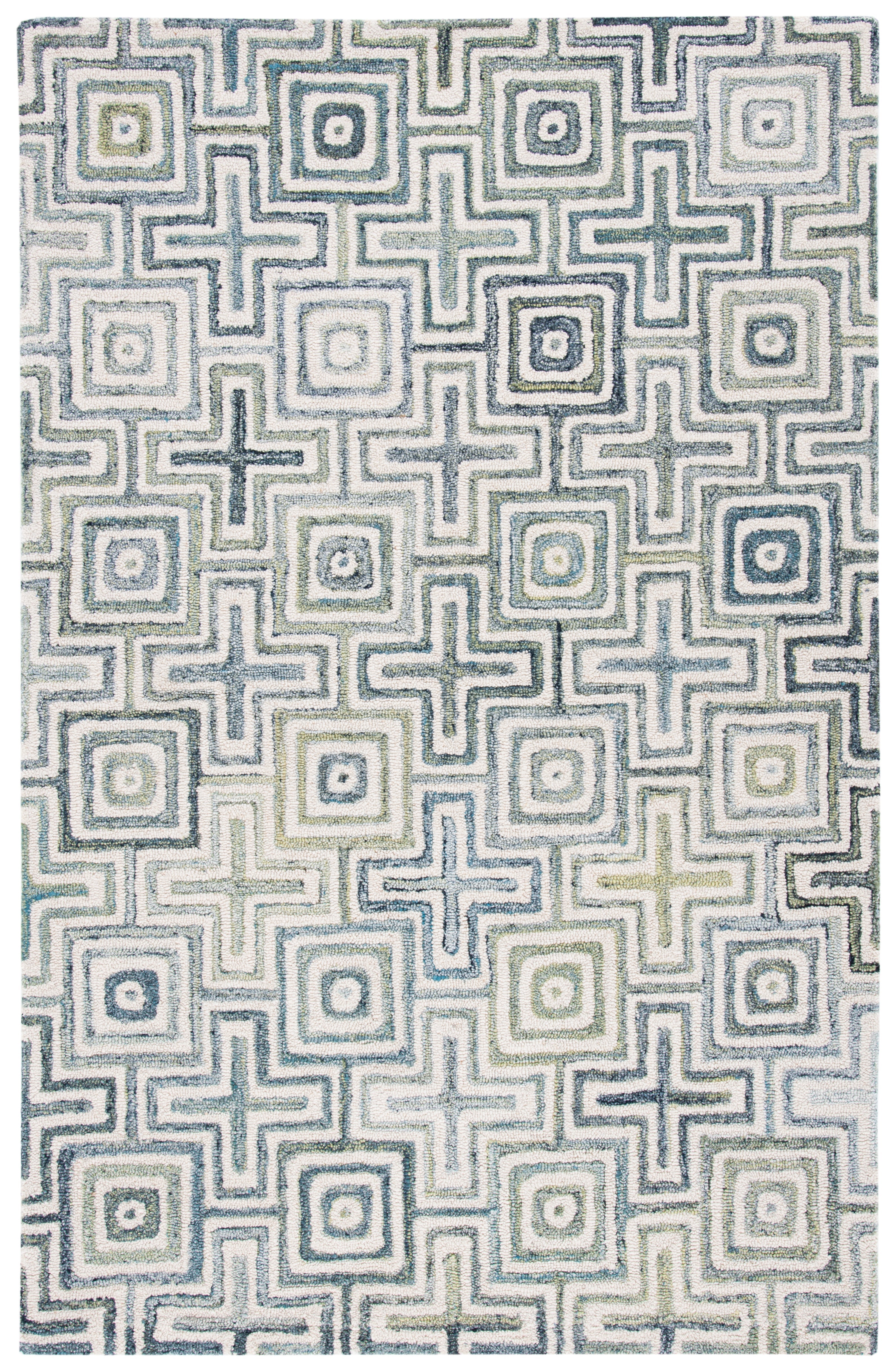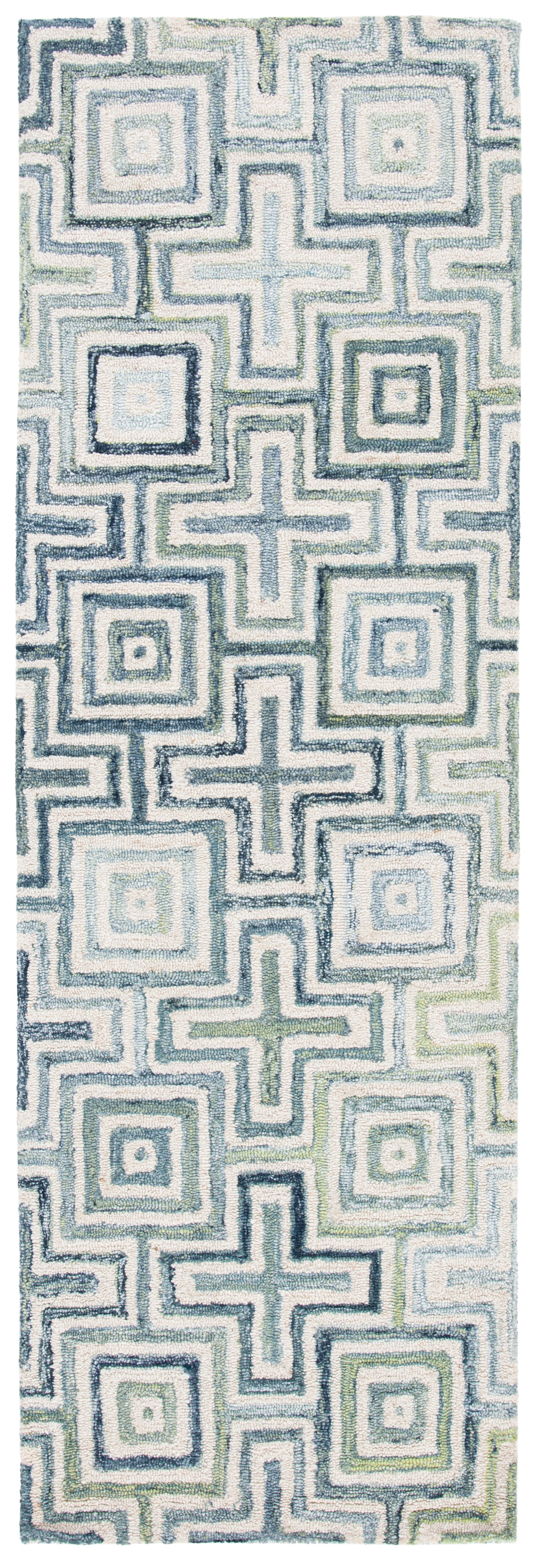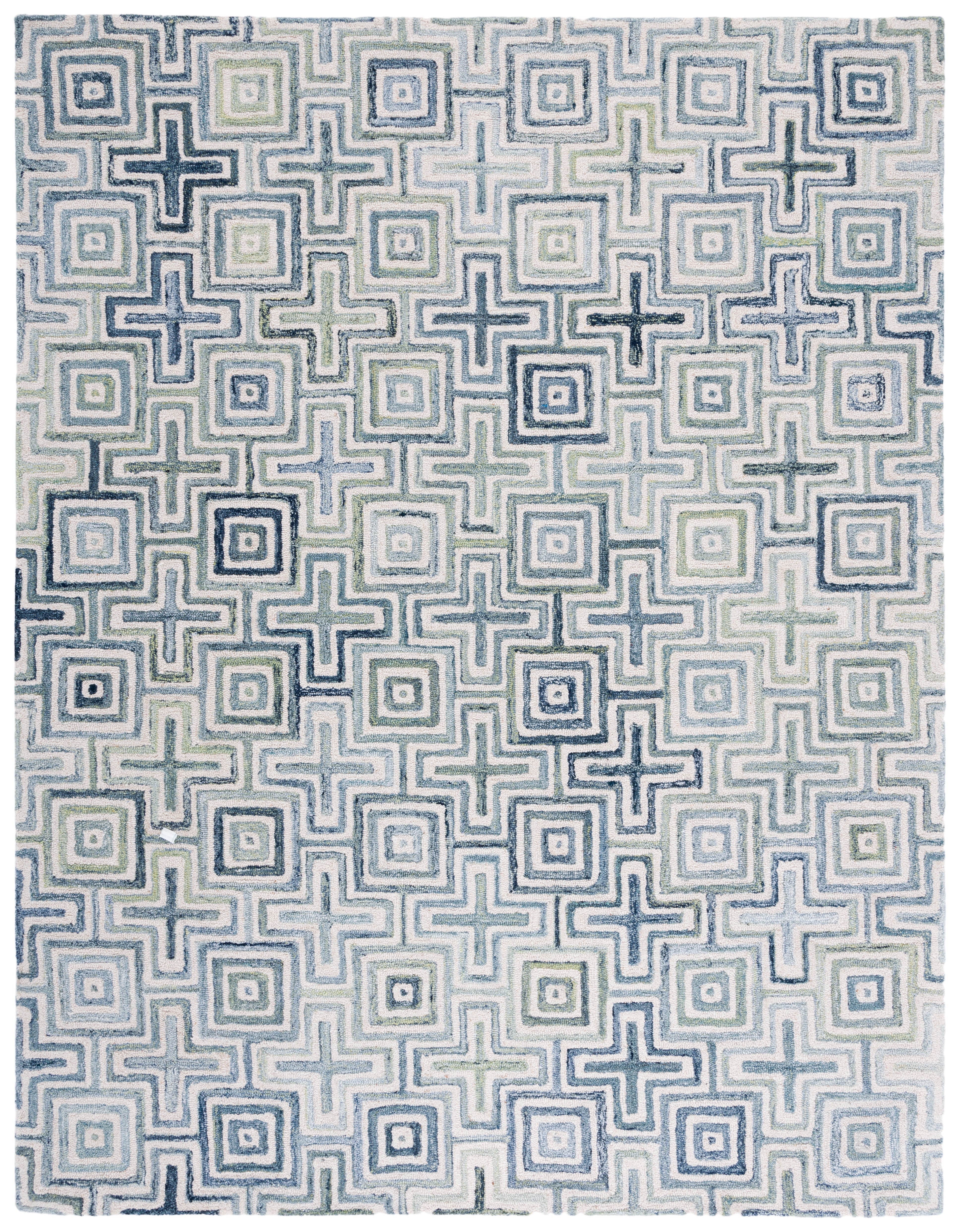 The rug boasts a harmonious Ivory/Blue color palette, imbued with a modern geometric pattern that exudes timeless charm. The design features interconnected squares and rectangles in varying tones of blue, outlined with a subtle hint of green, creating a visual texture that is both sophisticated and captivating.