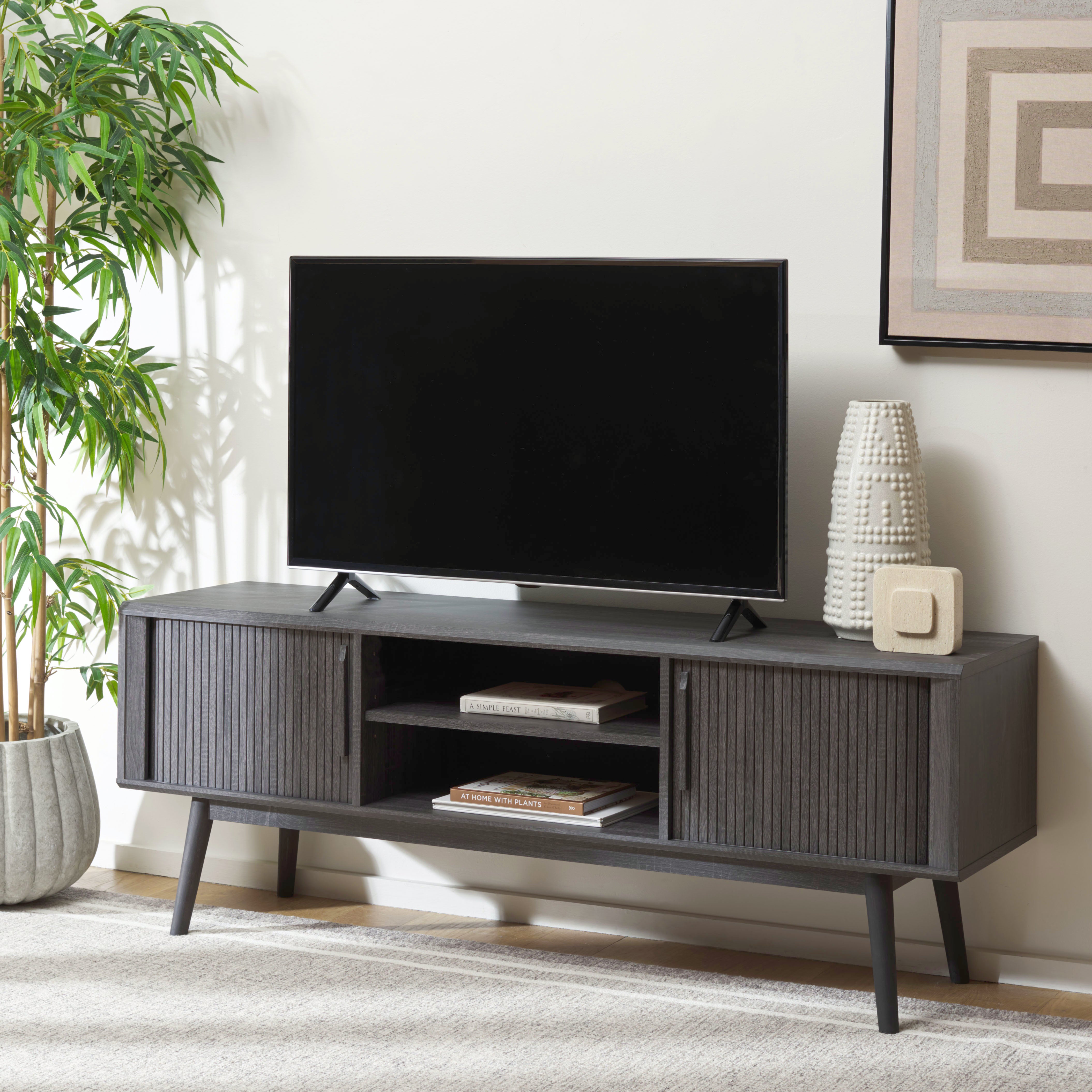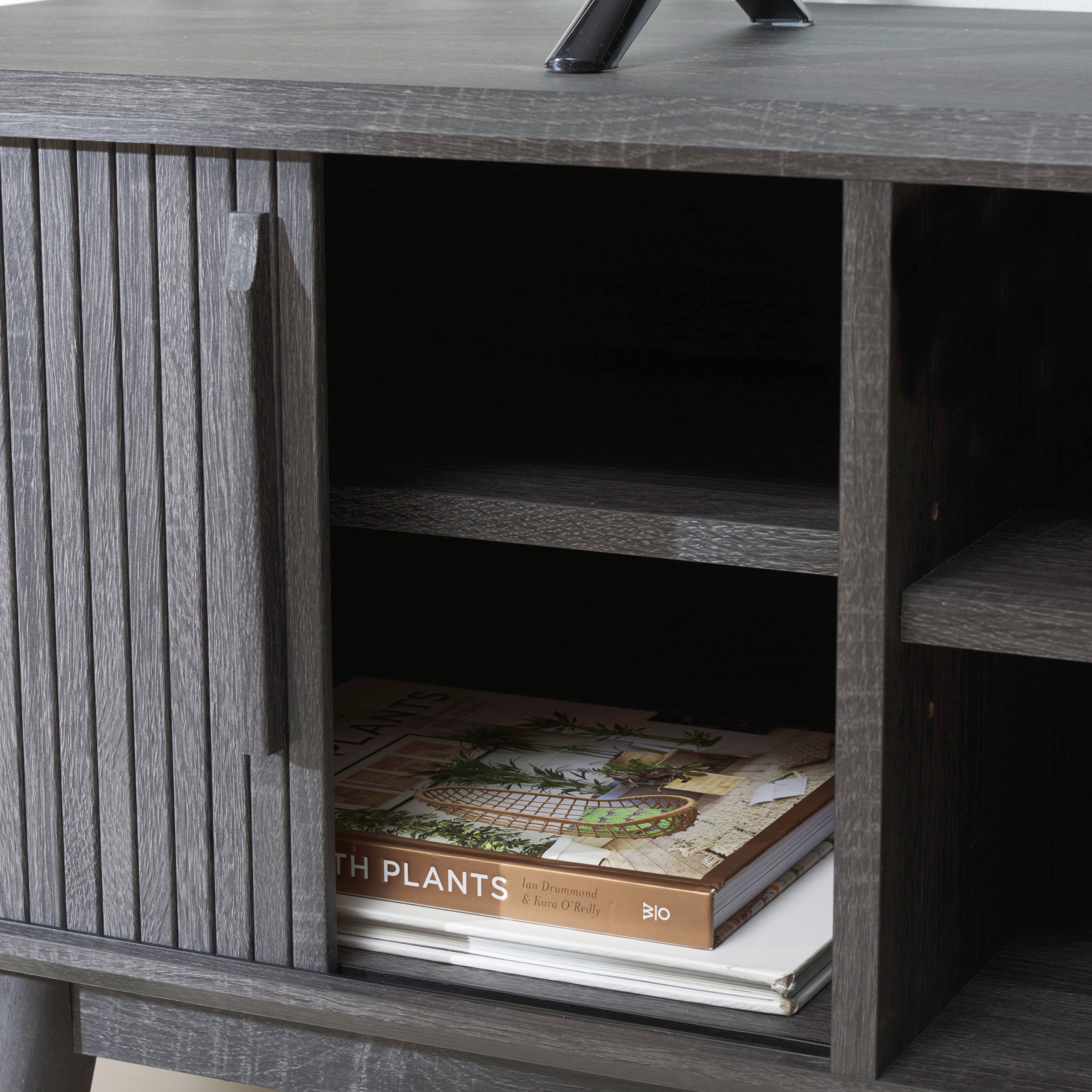 Organize your home with our sophisticated and highly functional Aphra media stand. It showcases the timelessness of mid-century design in a thoughtfully detailed and streamlined design. The clean and linear profile of the media unit is perched upon tapered legs. It showcases rich grains of wood in a distressed black finish to attain a versatile and charming appeal. The tambour sliding doors add definition and dynamic functionality to our media stand. Featuring adjustable shelves and rear cut-outs, the storage unit is sure to keep all your media essentials organized.