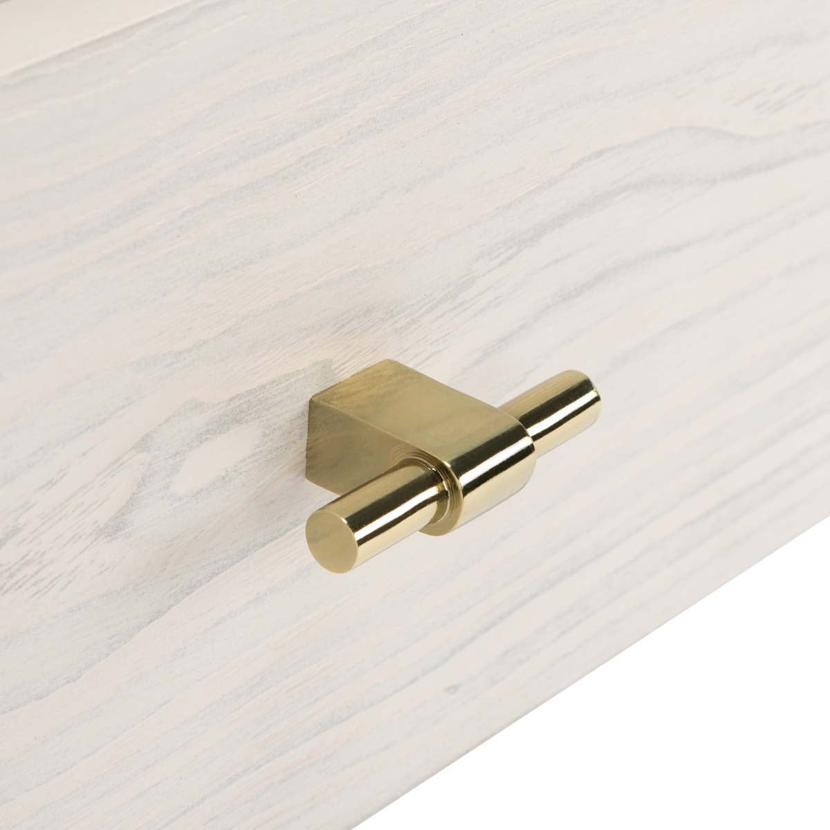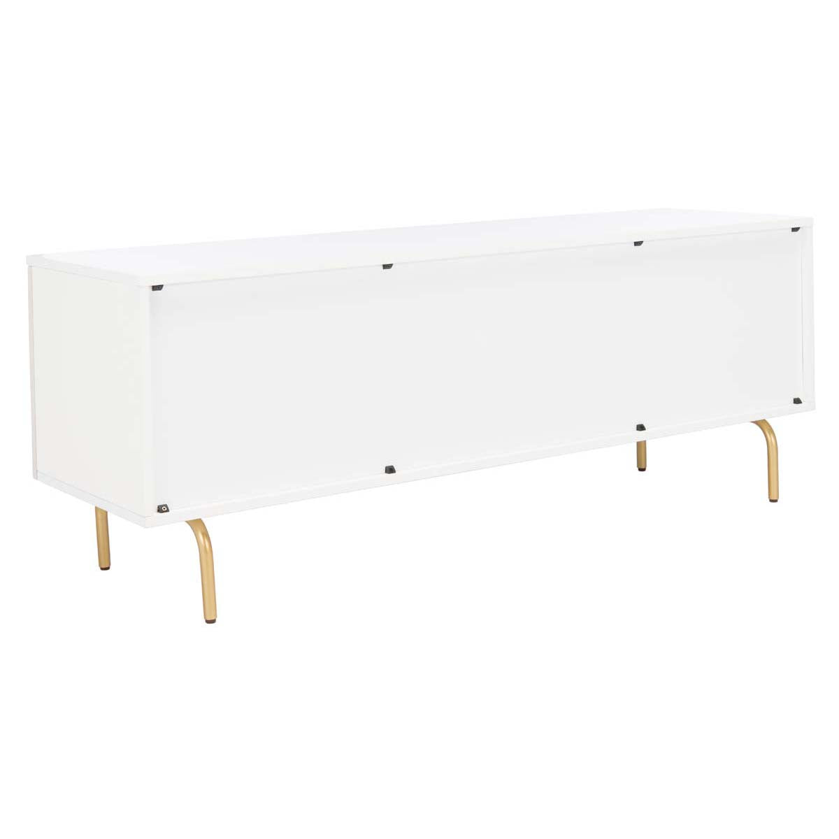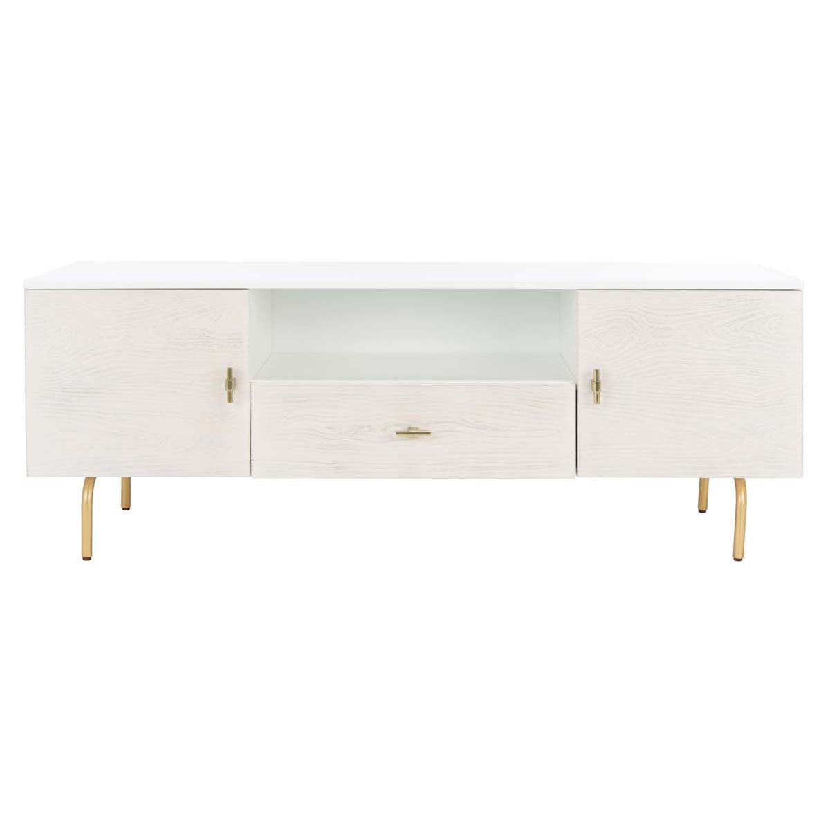 A captivating blend of luxurious materials and elegant lines, this contemporary TV stand transforms any living room into a glamorous entertainment center. Crafted of luxurious mahogany wood, a white and white wash finish complement its rich gold legs.