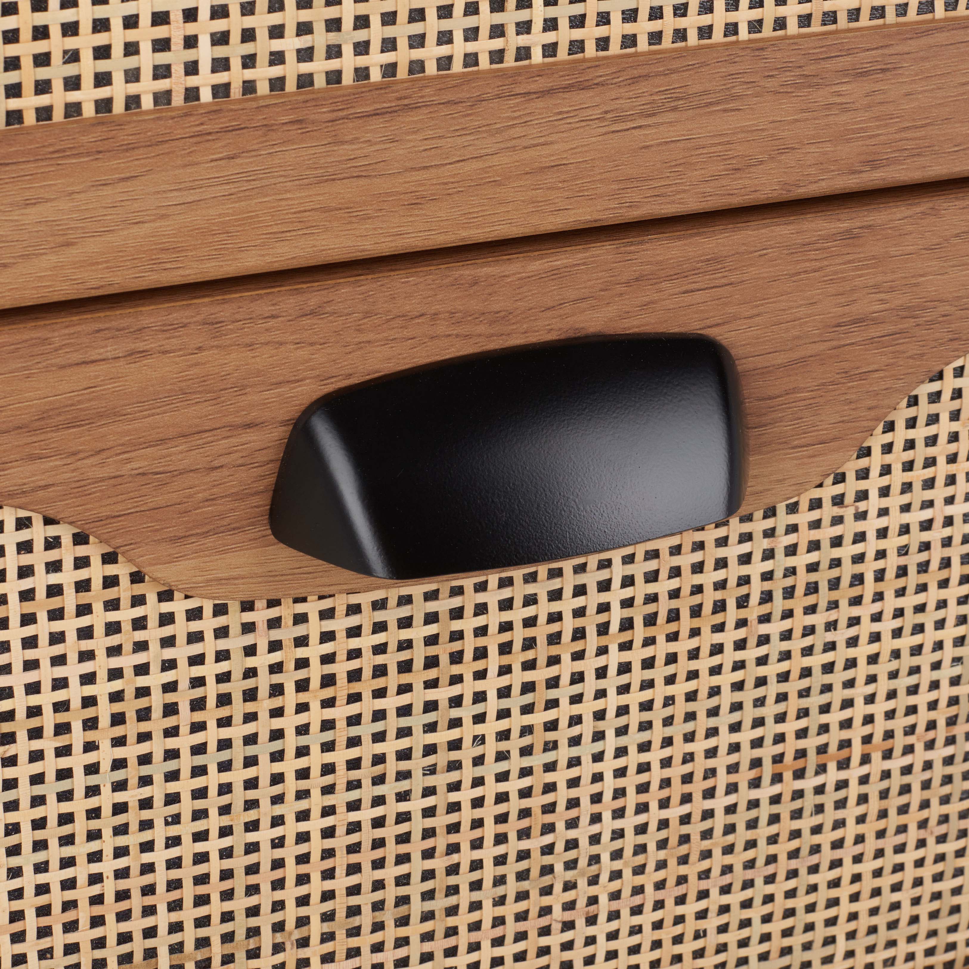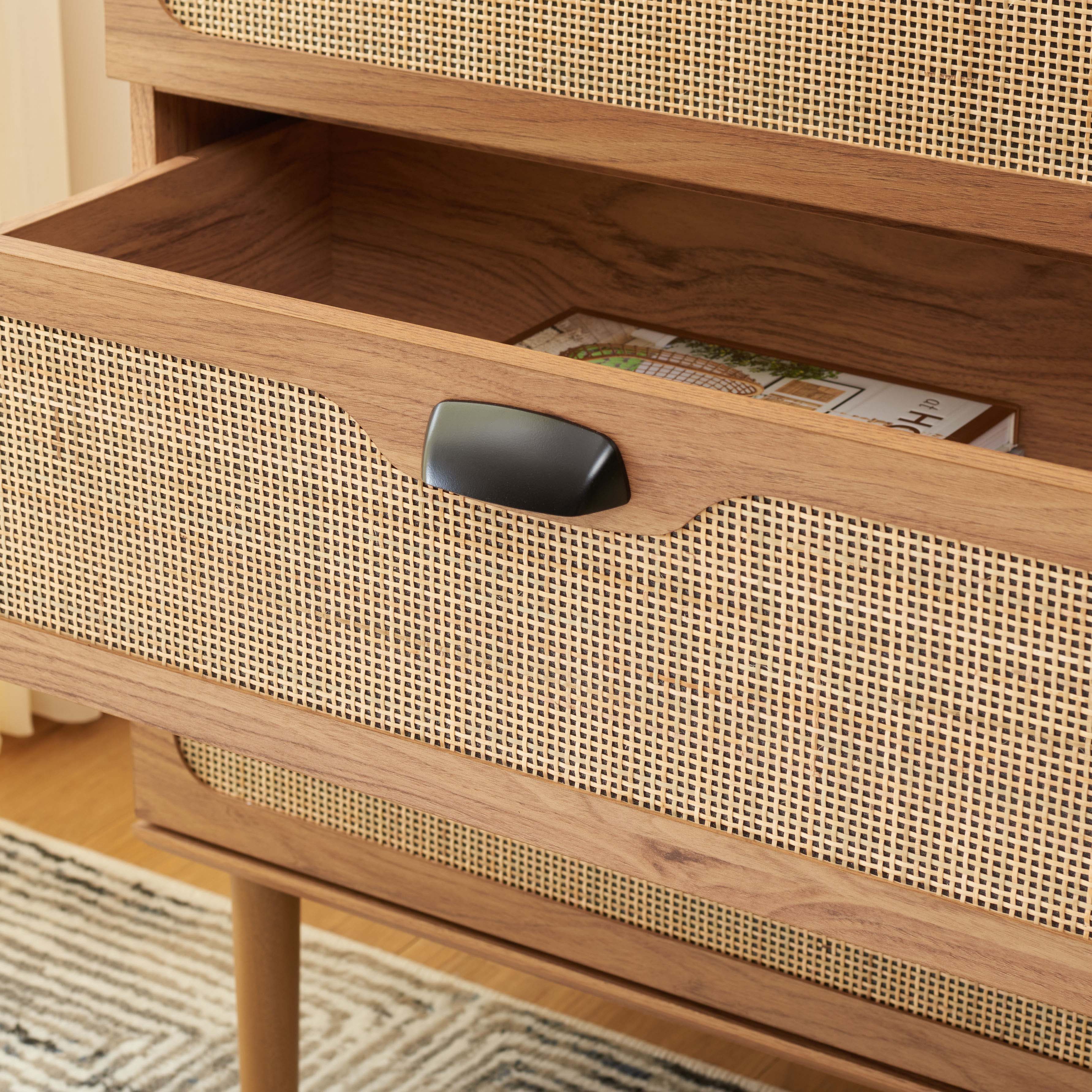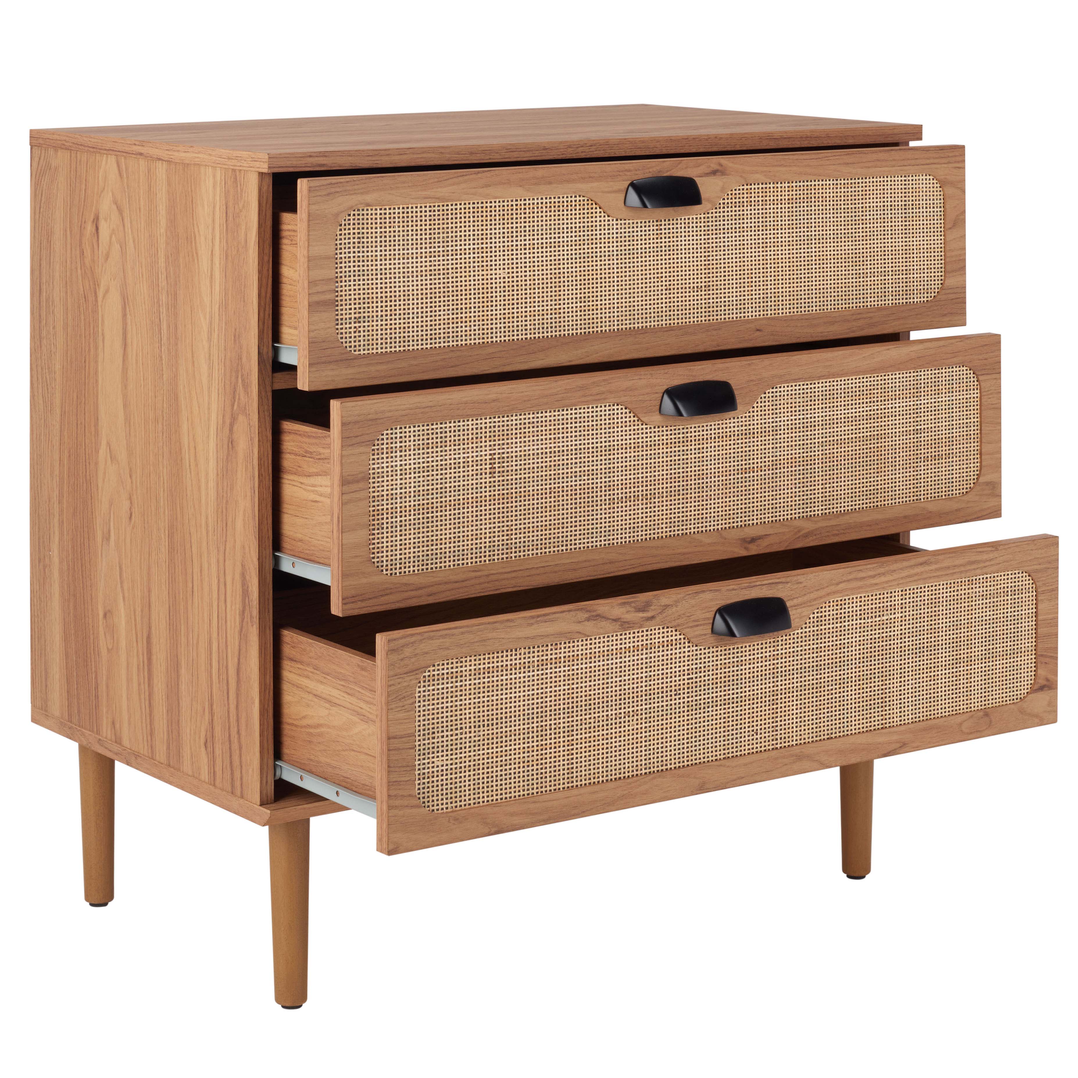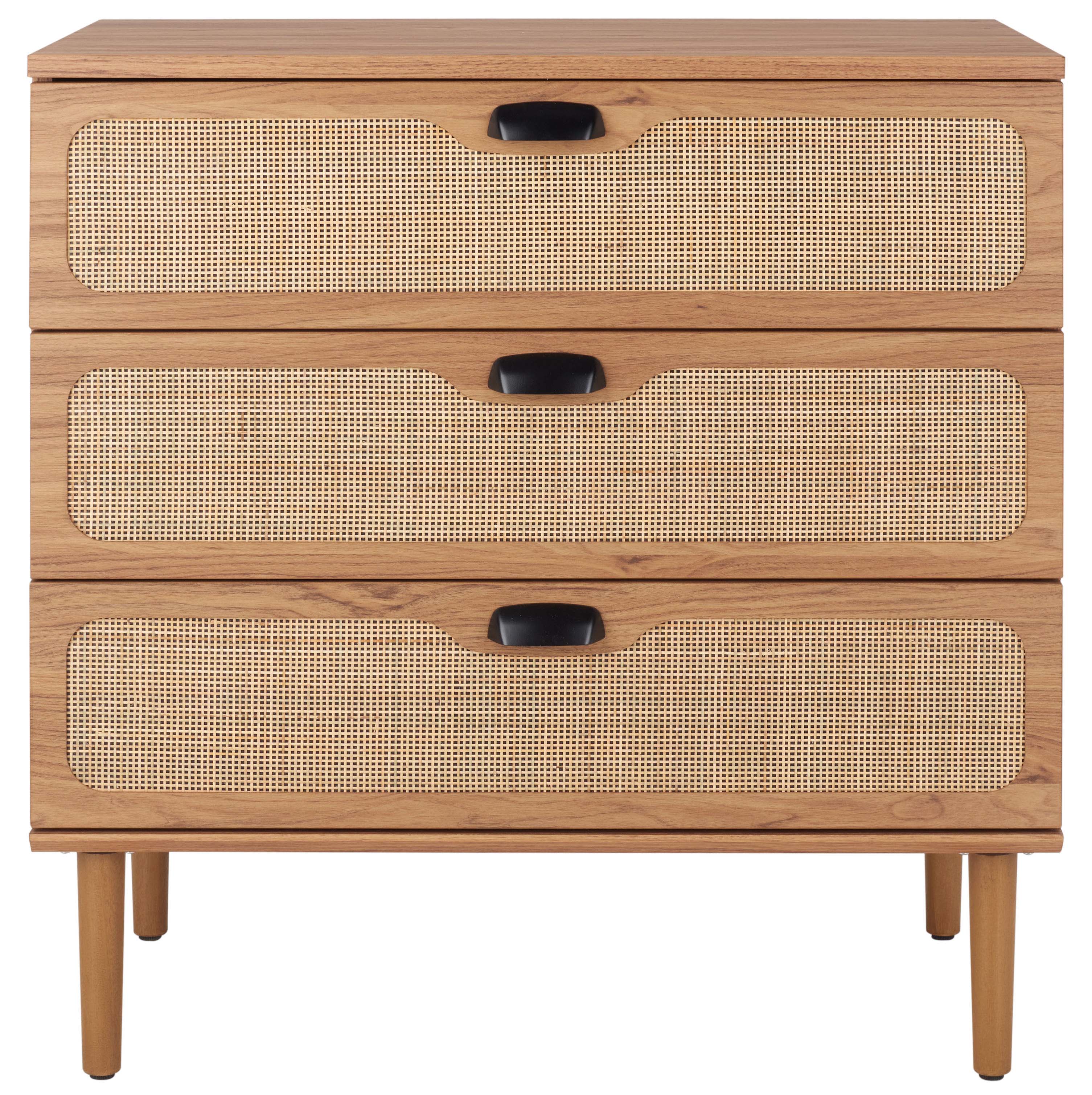 Enrich your home with the warmth and textural elegance of our exclusive chest. The sleek and clean-lined profile of the chest is enlivened with a rattan mesh. Its rich textural appeal is complemented with an oak veneer to bring a dose of warmth to your home. Completed with sleek metal pulls, our chest combines timeless aesthetics with an airy and breezy look. It features three roomy drawers to keep all your belongings and essentials organized behind its elegant and inviting facade.