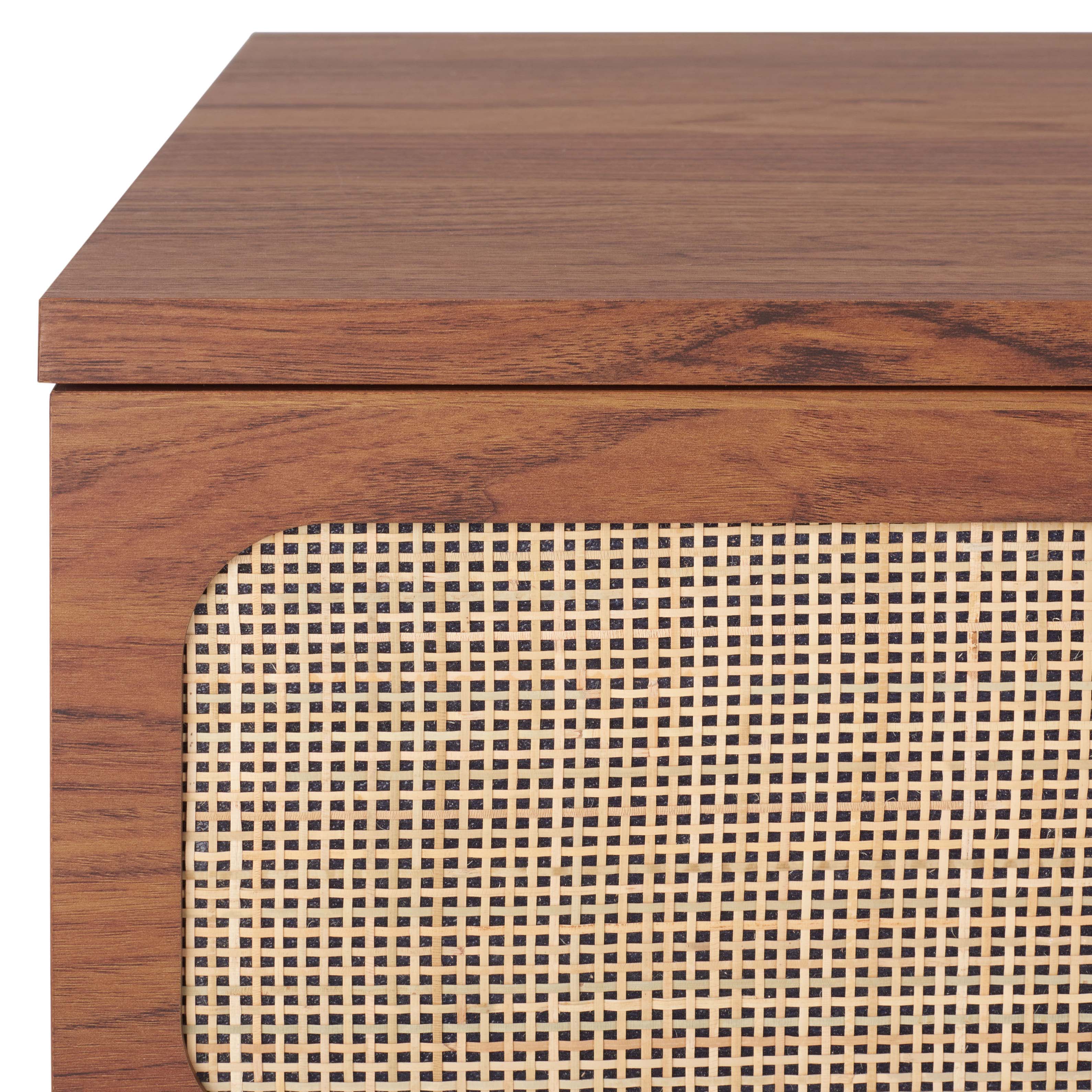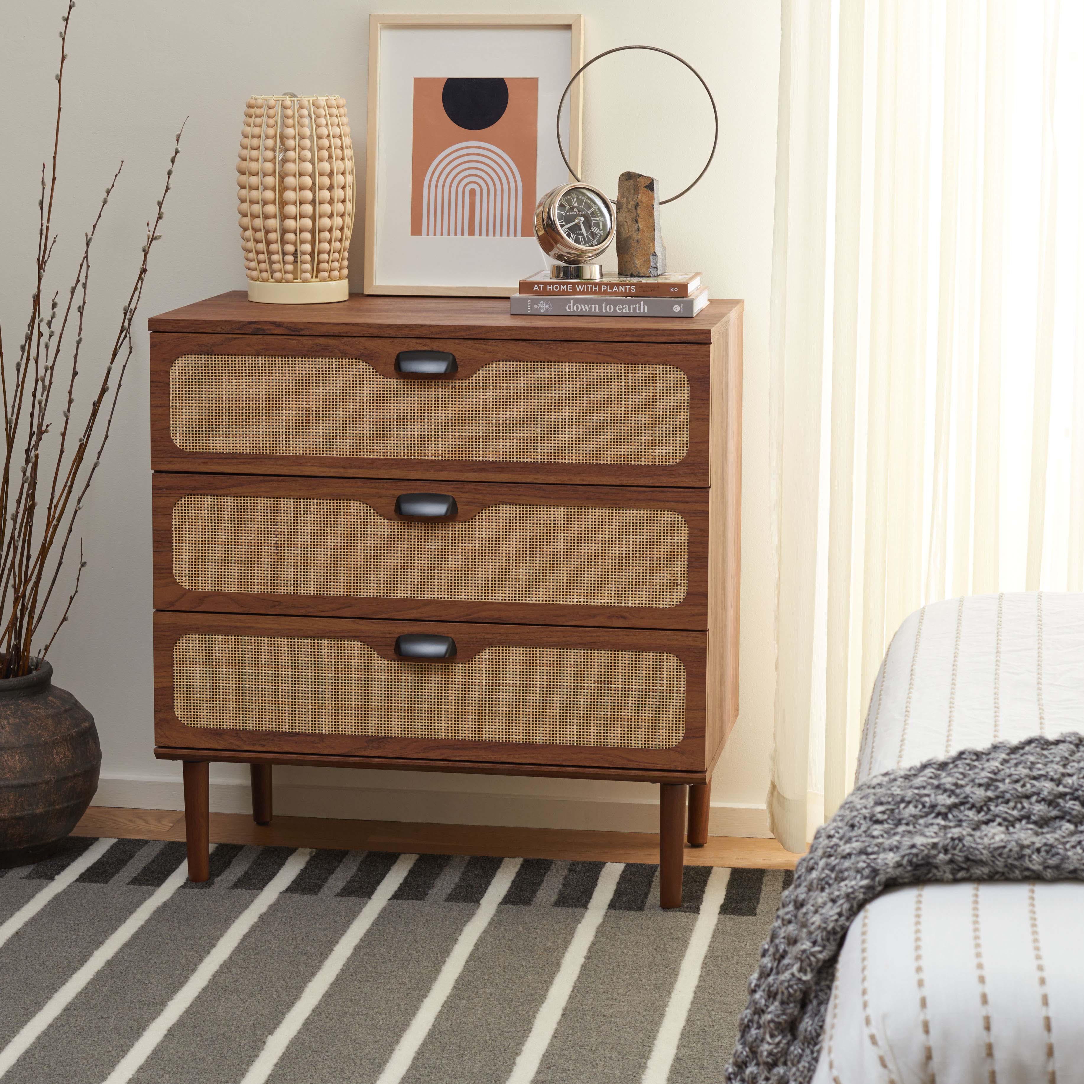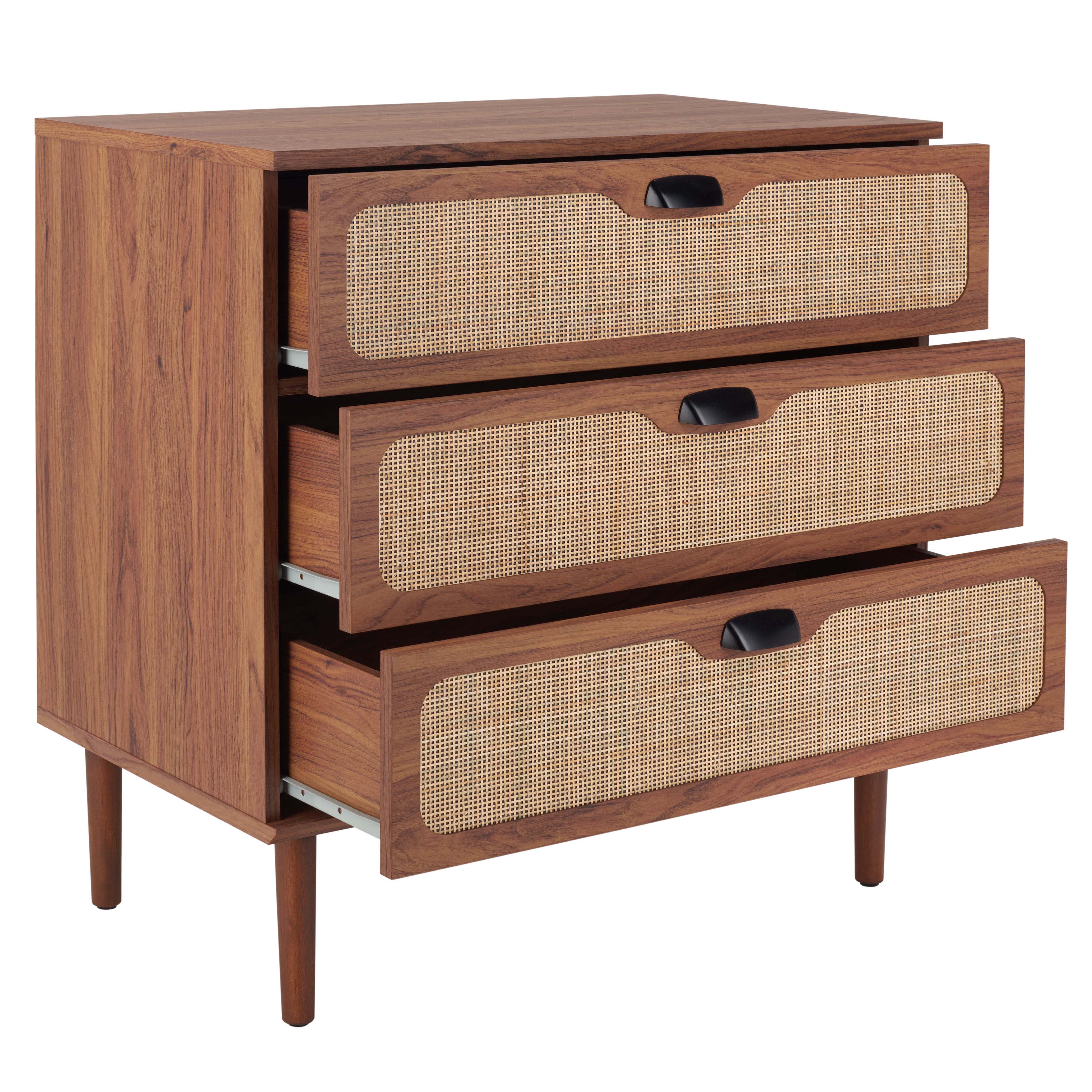 Enrich your home with the warmth and textural elegance of our exclusive chest. The sleek and clean-lined profile of the chest is enlivened with a rattan mesh. Its rich textural appeal is complemented with a walnut veneer to bring a dose of warmth to your home. Completed with sleek metal pulls, our chest combines timeless aesthetics with an airy and breezy look. It features three roomy drawers to keep all your belongings and essentials organized behind its elegant and inviting facade.