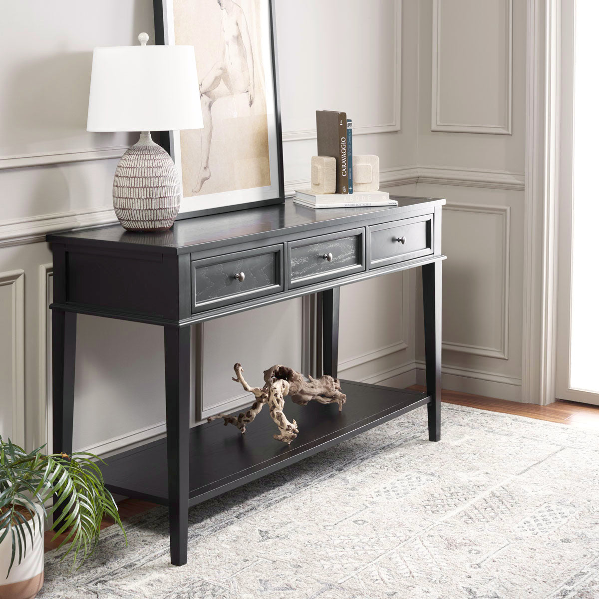 Simple lines and purity of function lend a timeless quality to the Shaker inspired Manelin console with tapered legs, three drawers and lower shelf. Crafted of pine in a black finish, this console is at home in country, rustic or transitional settings.