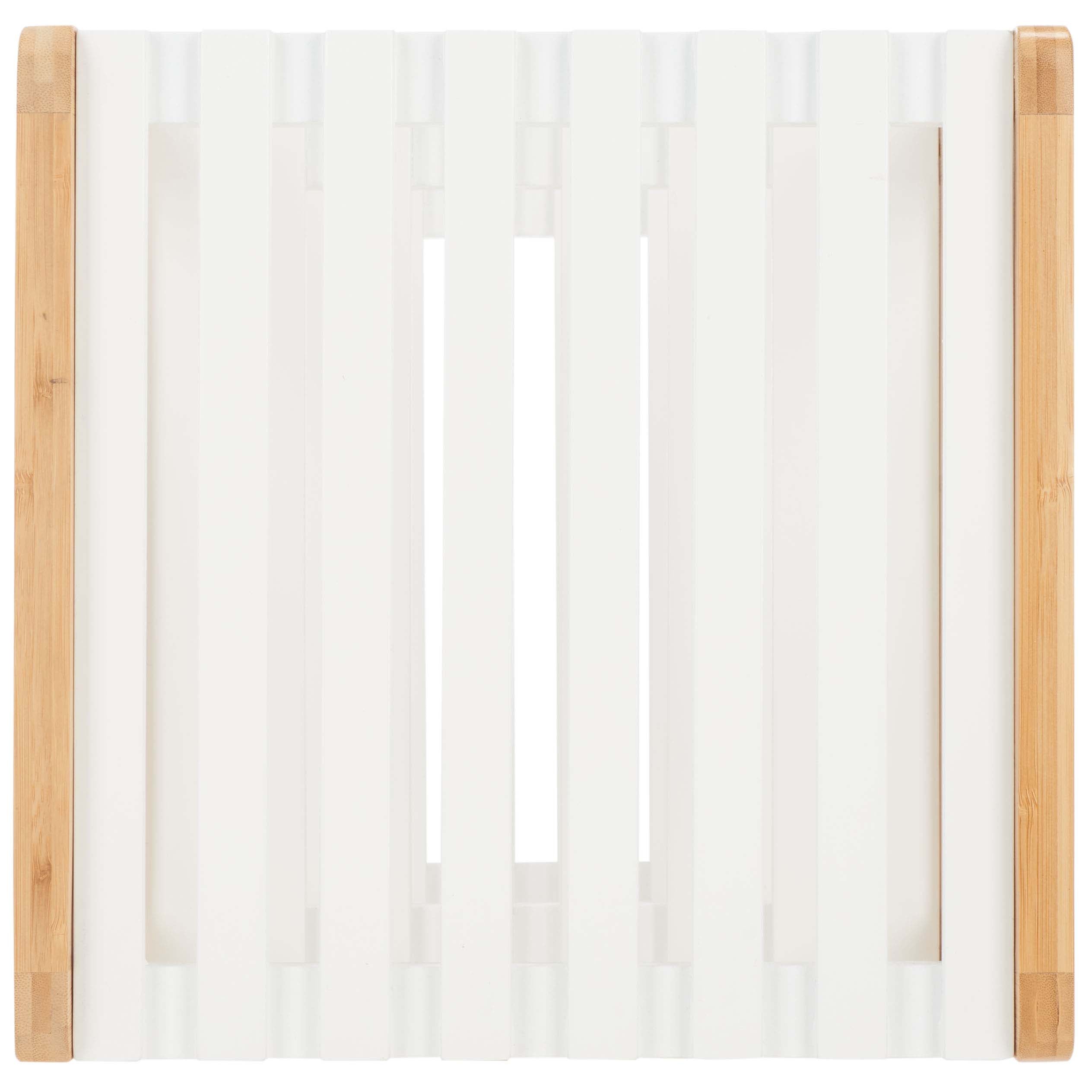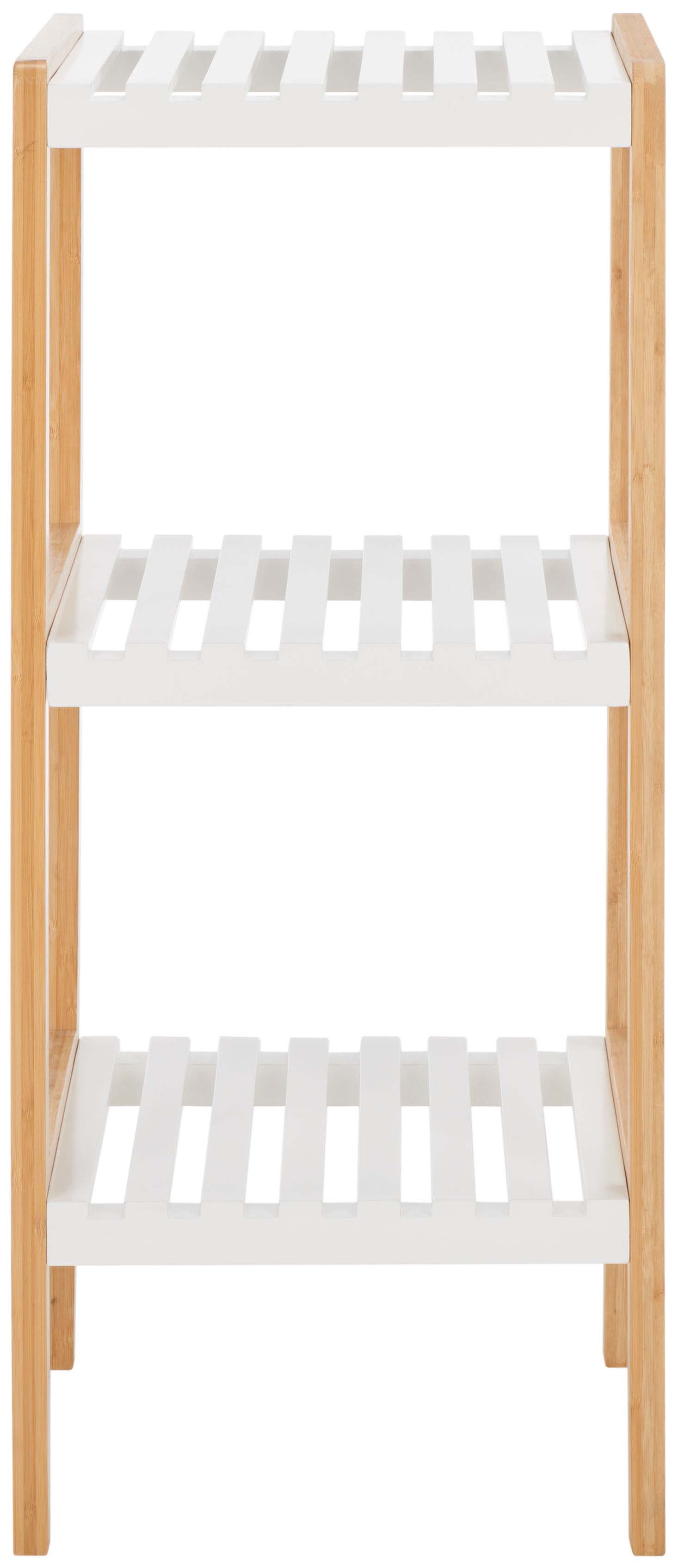 Optimize your storage needs with our handy and space-friendly Paxter three-tier shelf. A bamboo frame and three white shelves vouch for a minimal and functional design. Each shelf is slated to offer a practical and airy surface to hold all your bath essentials. A perfect fit for any compact space, our versatile shelf complements your bath or laundry room, providing a handy surface to hold all the bath linens and toiletries.