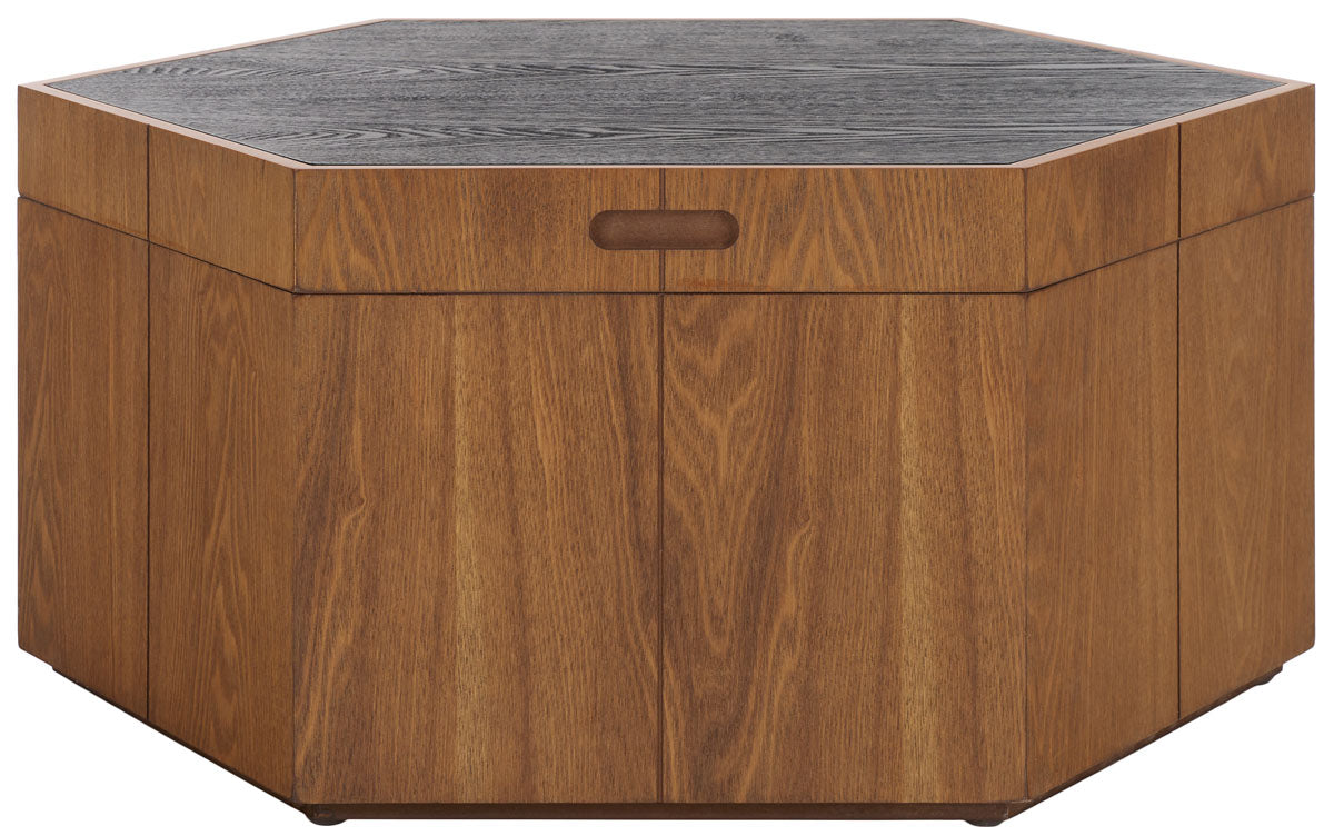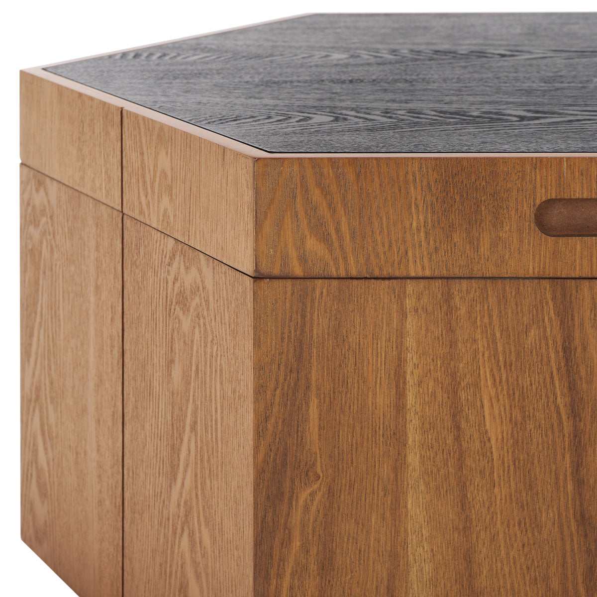Add a functional and stylish feature to your home with our Rafaela hexagon coffee table. The sleek geometric appeal of the table is accentuated by a hexagon-shaped tabletop. Each side is enlivened with the rich and lively textures of natural brown veneer to bring a dose of warmth to your home. The end table is completed with a black tabletop that lifts to reveal roomy storage underneath. Our charming coffee table can store all your knick-knacks and keep essentials within each reach to keep your space organized at all times.