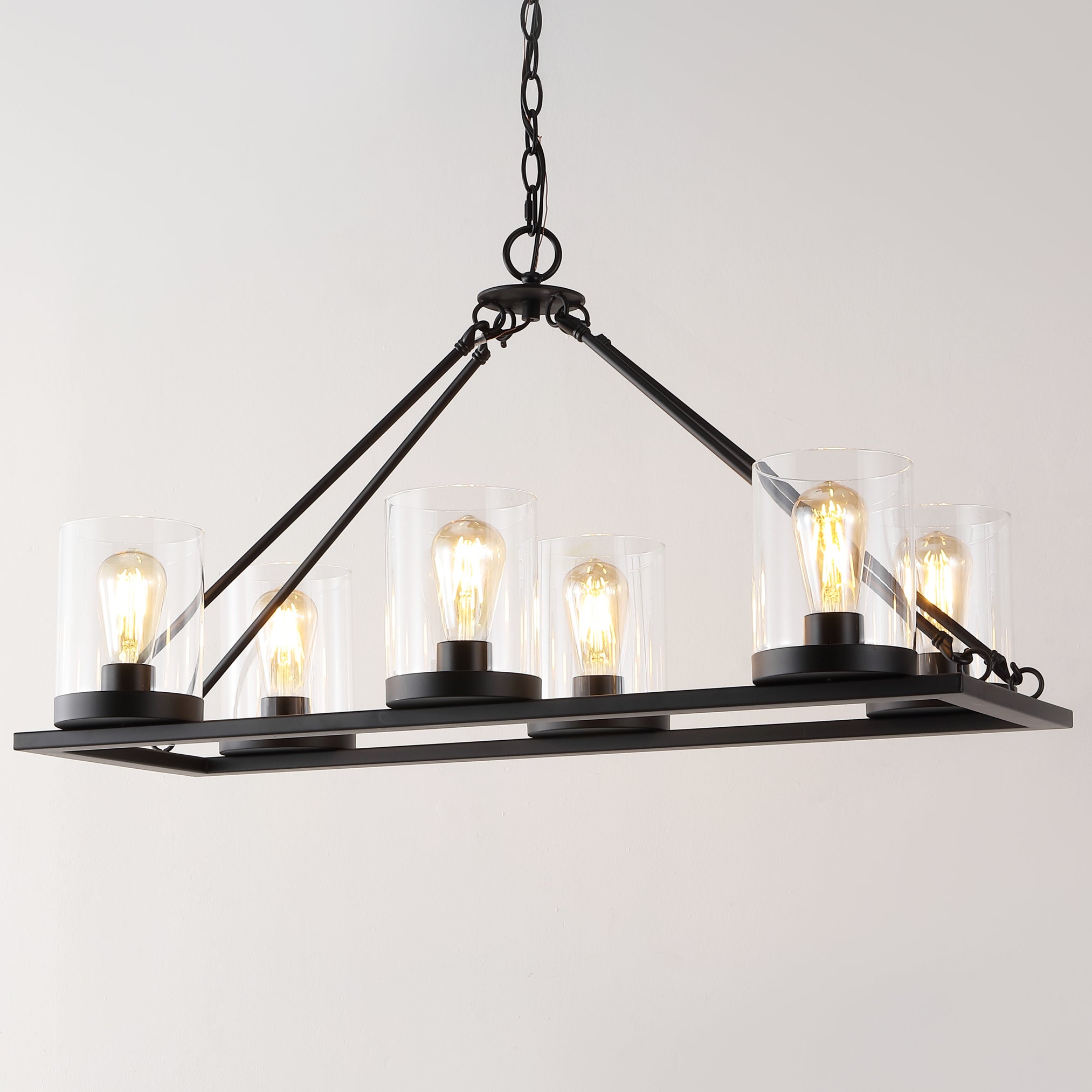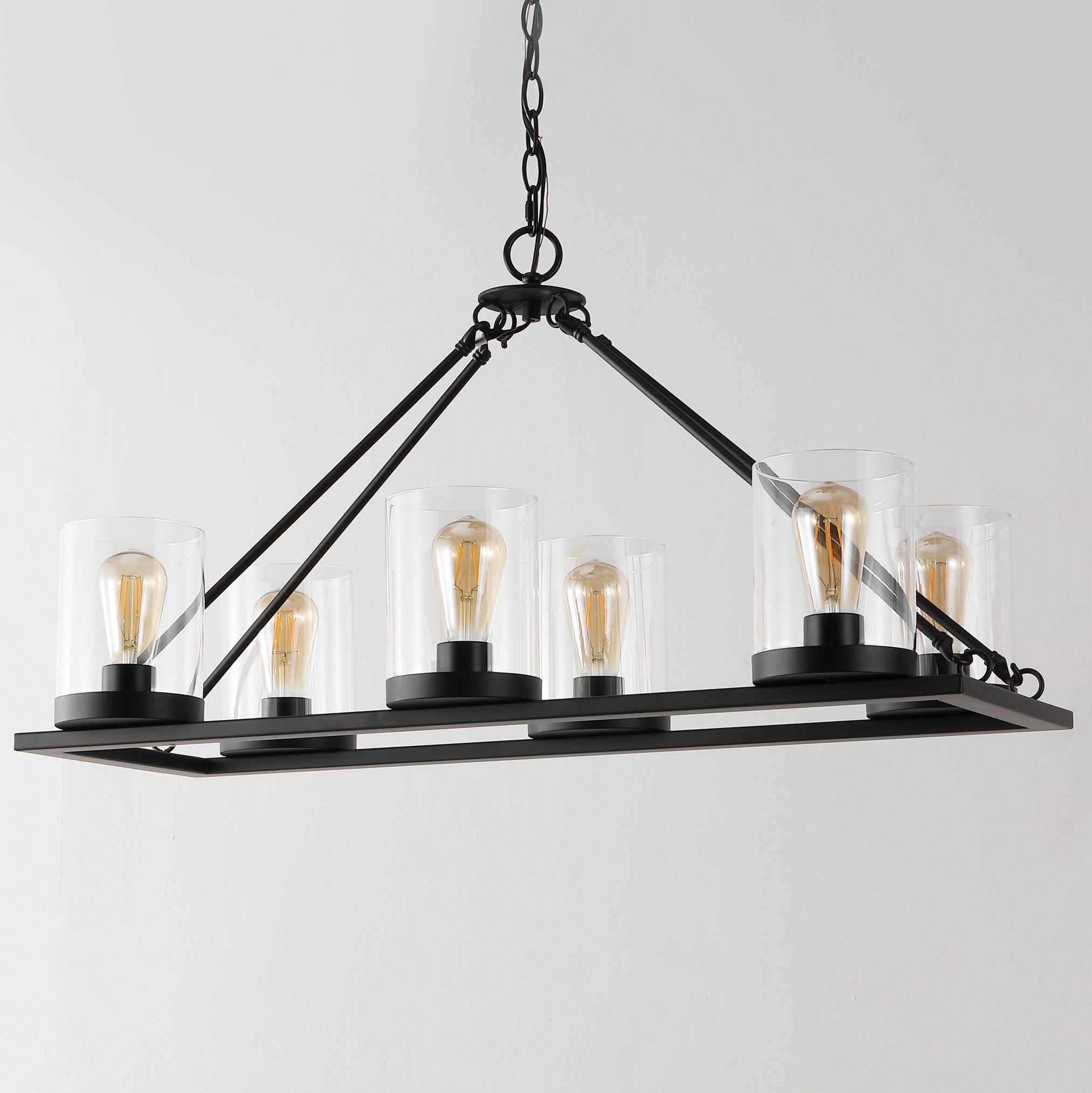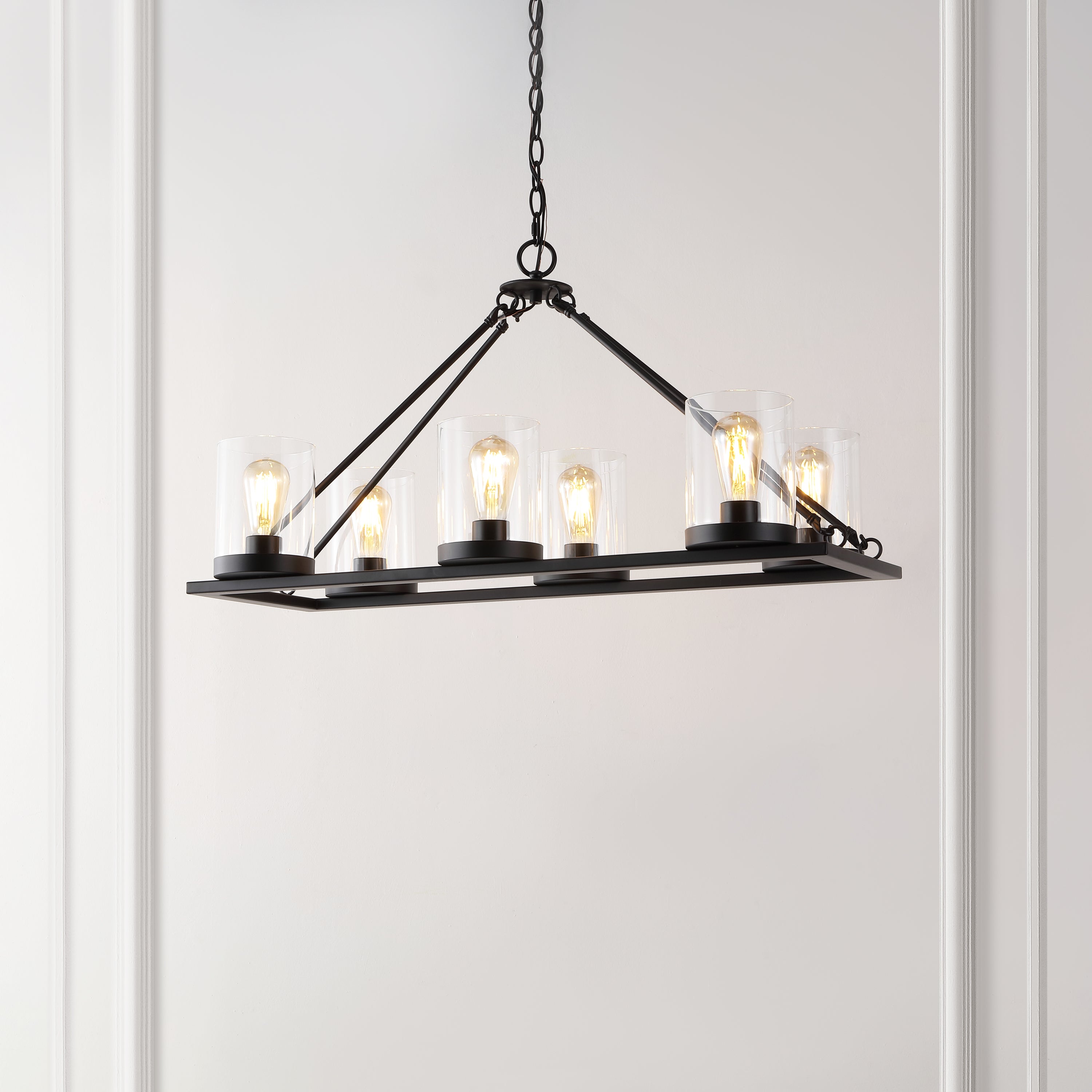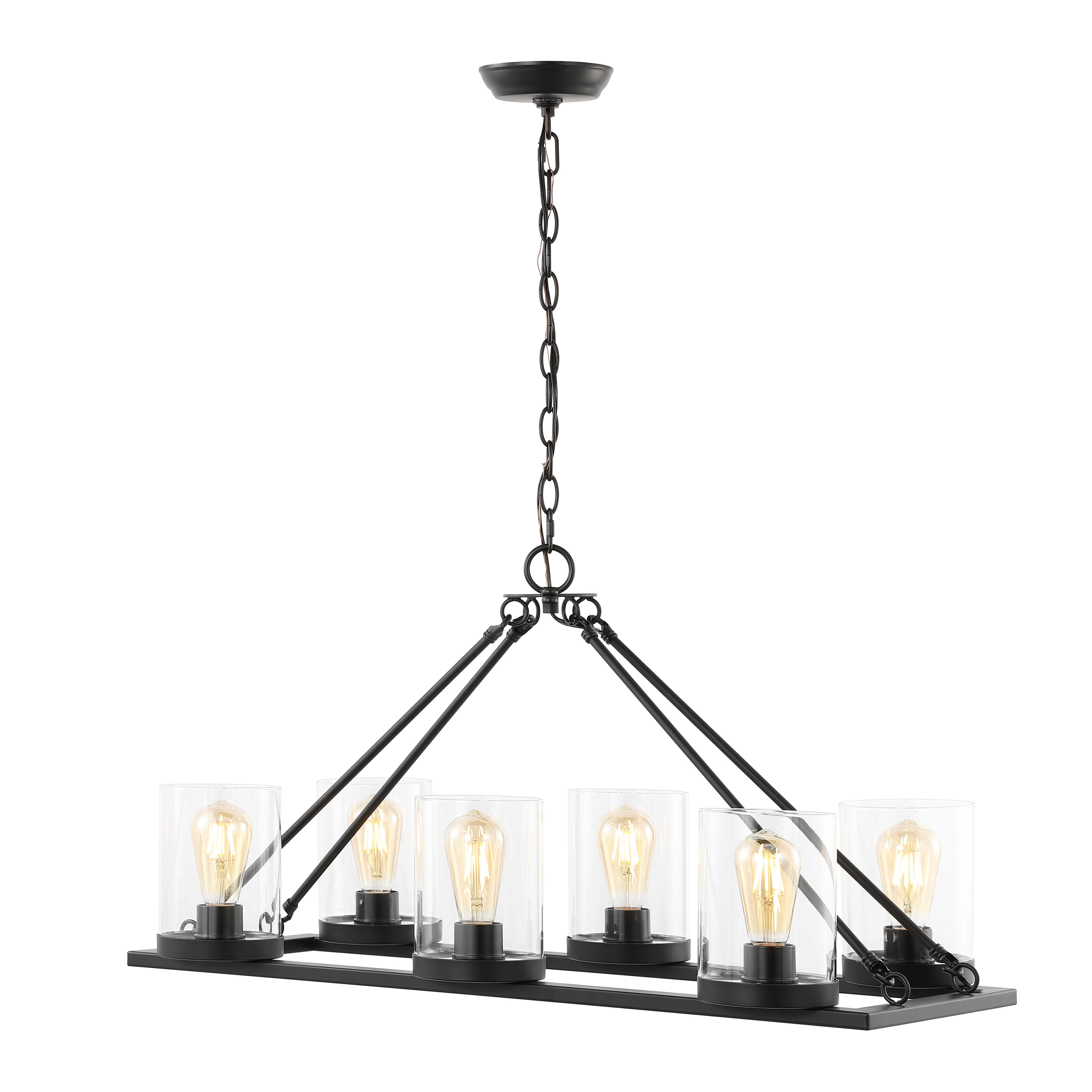 Illuminate your space with our beautifully minimalistic and charming Reagan chandelier. The clean and versatile silhouette of our chandelier is defined by elegant details and a beautiful mix of materials. An open and clean-lined metallic frame sets the foundation of your linear chandelier. It supports cylindrical glass shades to attain a chic and charming presence. Its six clear glass shades each cast a warm and pleasant glow. Our versatile chandelier showcases a black metallic finish to offer sleek elegance to your living space, dining room, kitchen, or hallway.