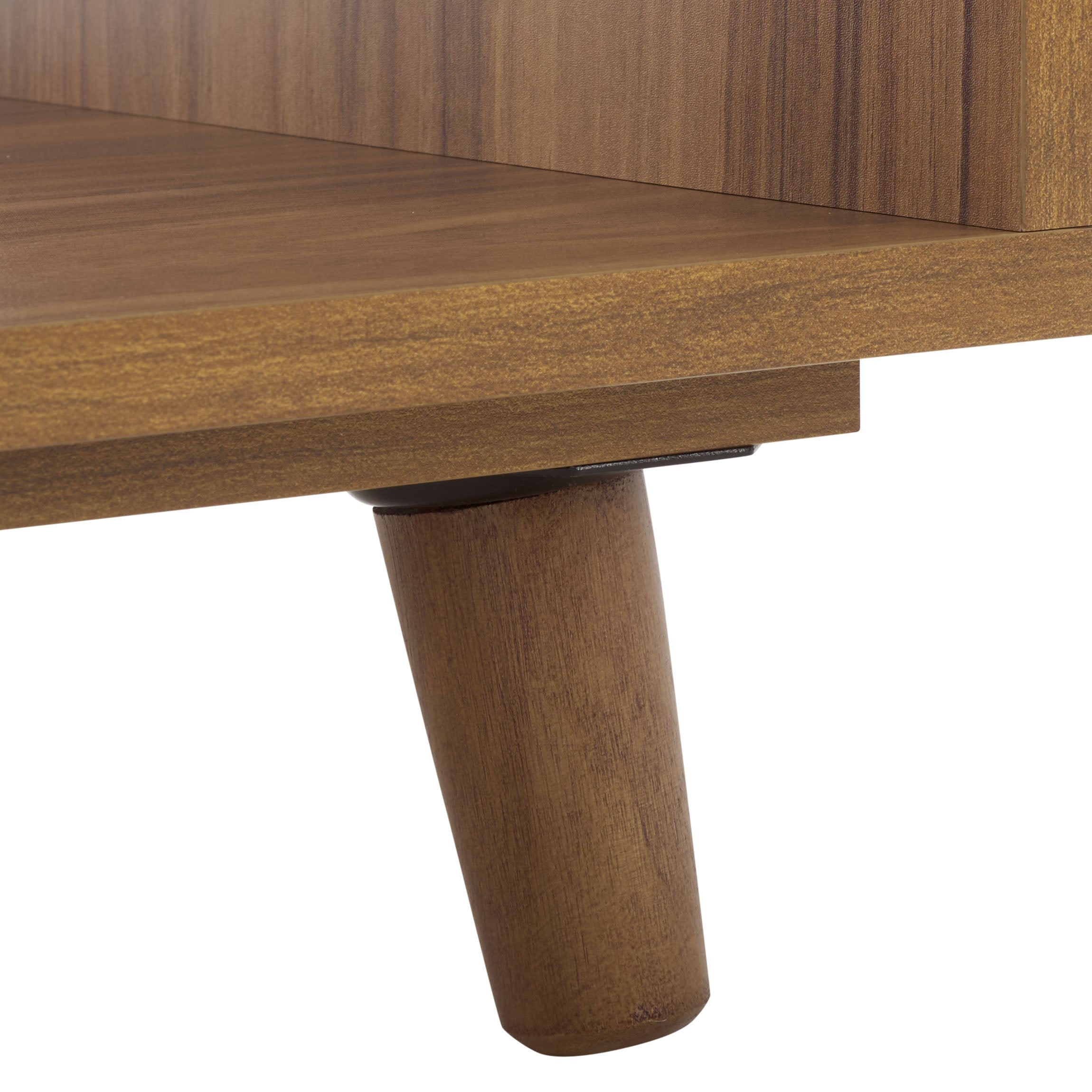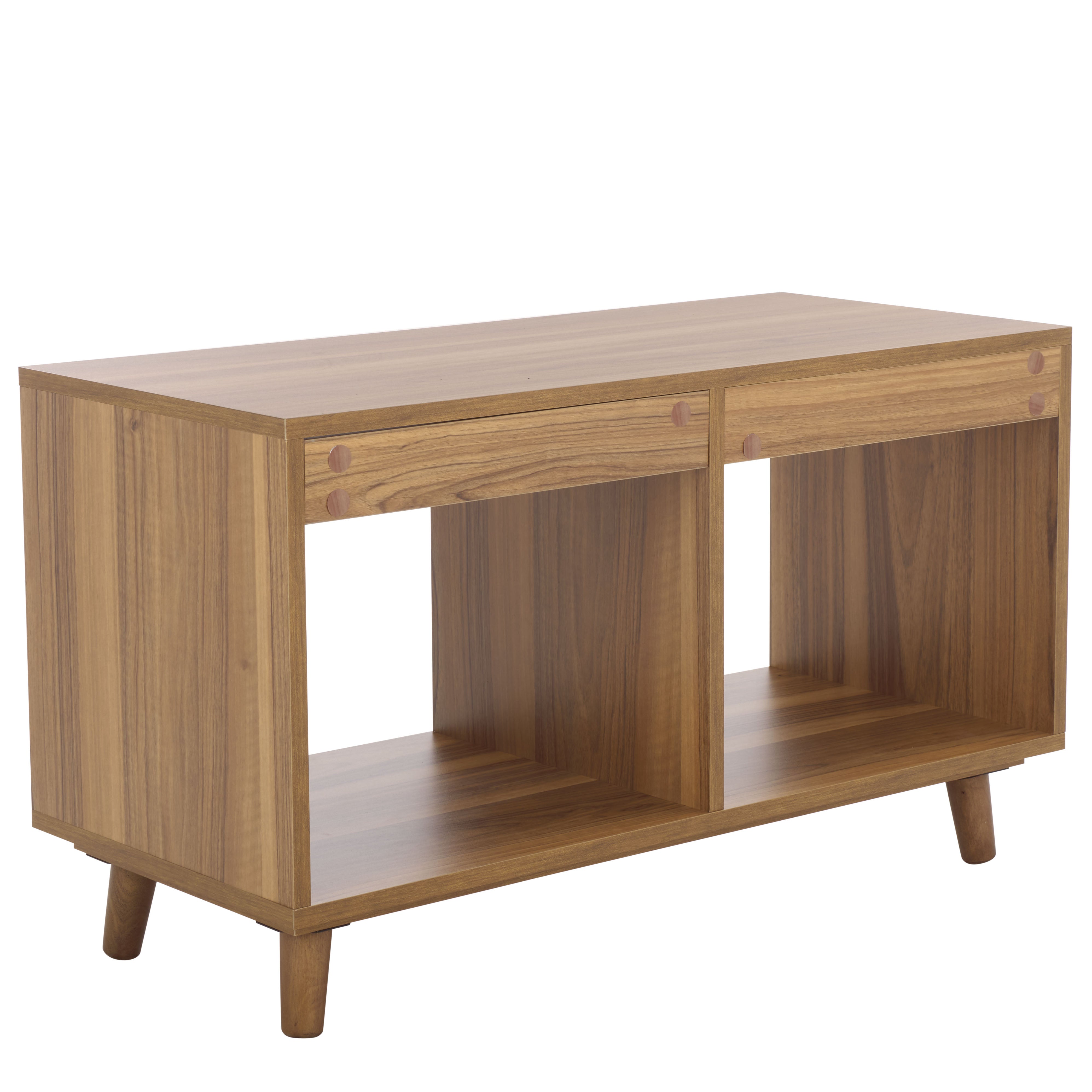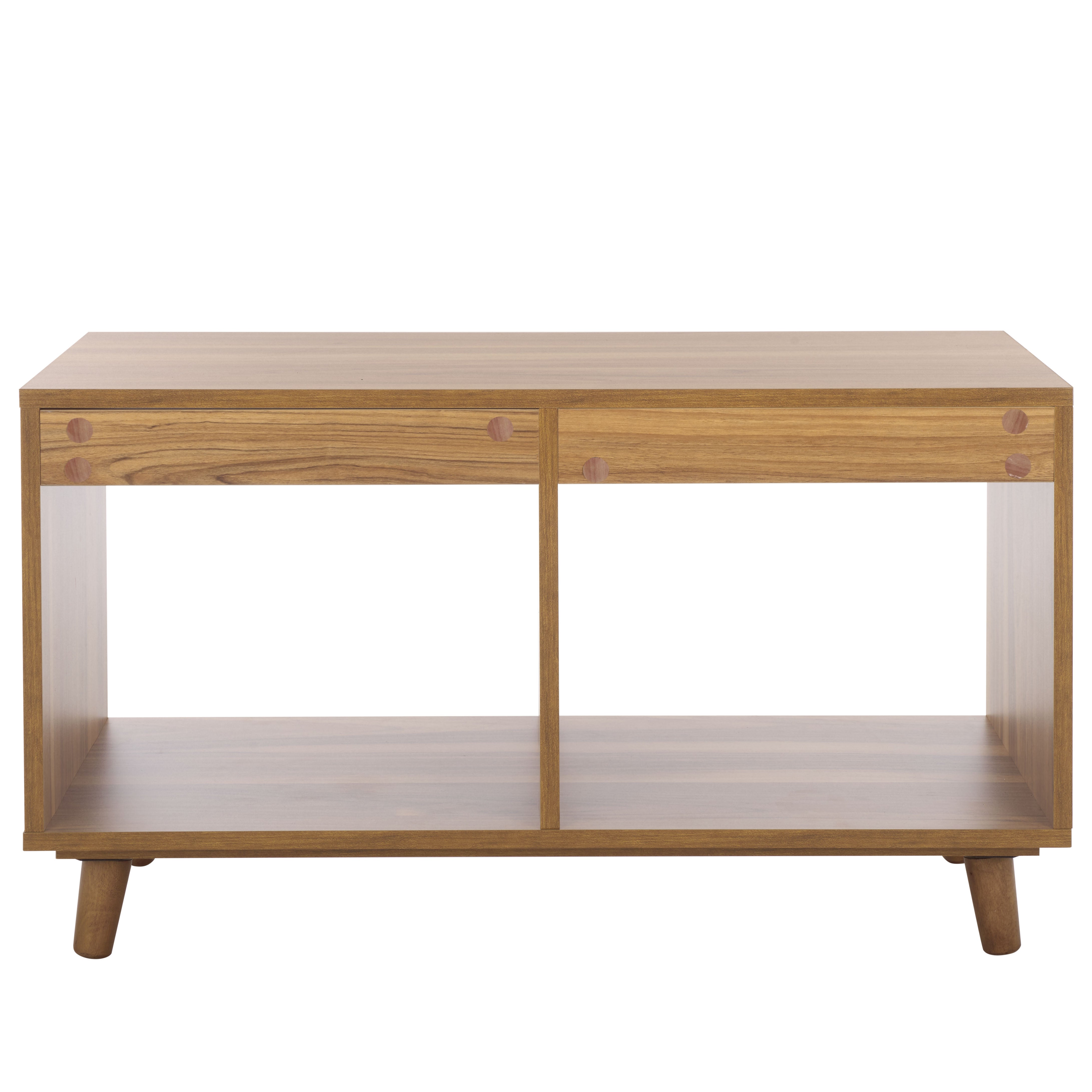 Introducing the Yona Horizontal 2 Shelf Open Shelf Accent Table in a warm brown color. This table features a sleek horizontal design with two open shelves, providing ample space to display books, plants, or personal items. The rich brown finish adds a touch of sophistication, making it a versatile addition to any living room, bedroom, or entryway. The Yona Table blends practical storage with a timeless look, enhancing your space with its stylish presence.