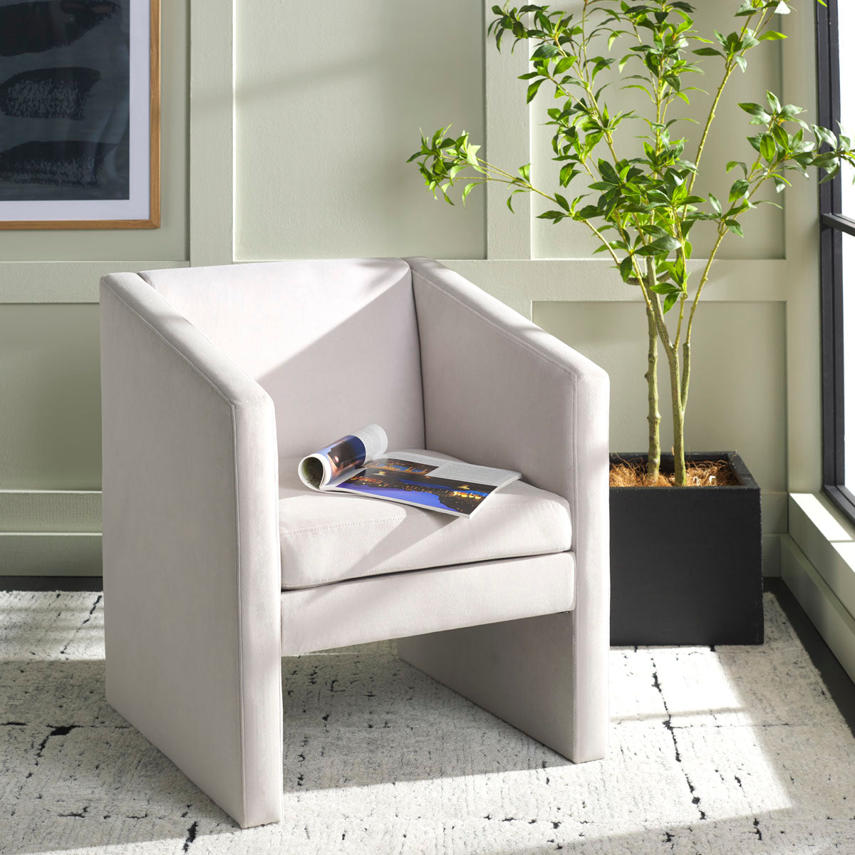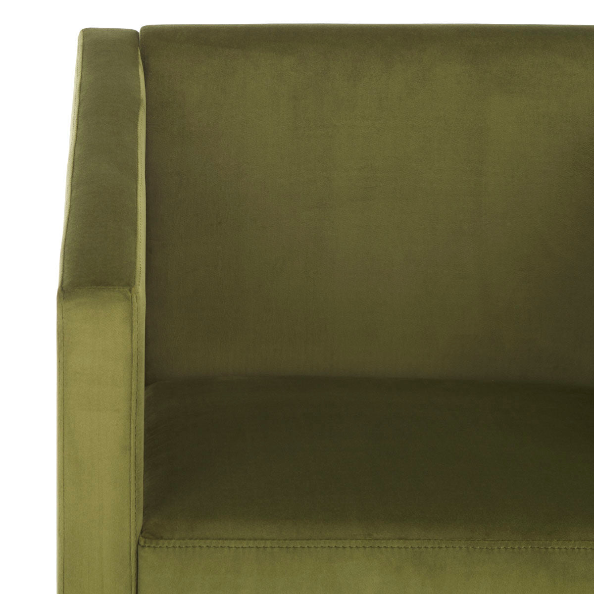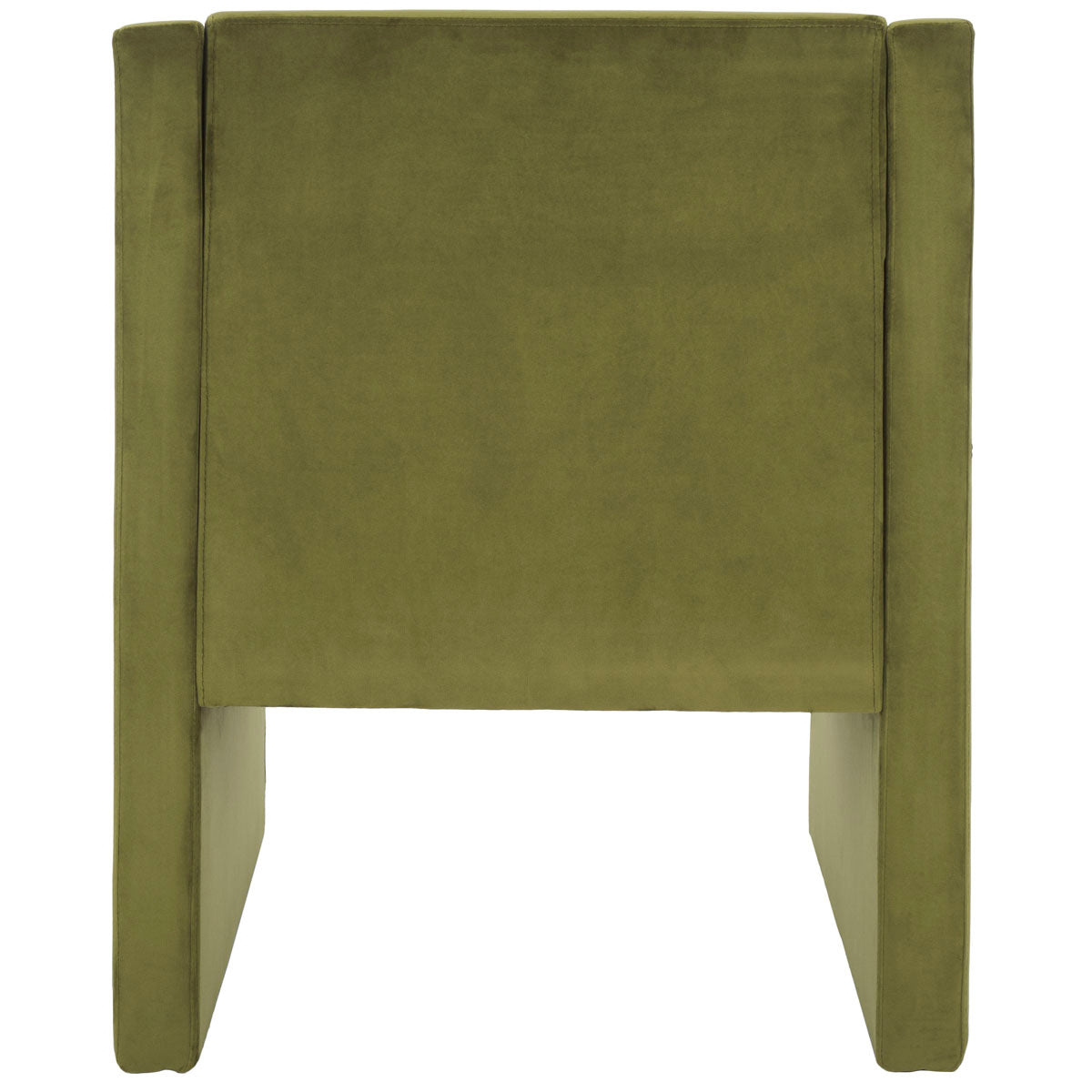 Bring sleek style and comfort to your home with our Ylva accent chair. Beautifully streamlined and tailored, our accent chair maintains the perfect balance within a plush and clean-lined design. Its tall sheltering arms and boxy cushioned seat offer a dose of comfort and style. Upholstered in fade-resistant fabric with soft velvety textures, our accent chair brings a refined touch of luxury to your home. It adorns a rich olive-green hue to become a charming fit for your living area, bedroom, or home office.