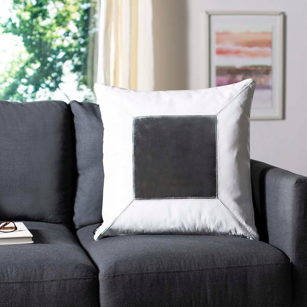 The stylish look of shimmering metallic is smartly displayed in this Safavieh Tinsley Cowhide Pillow. Designed with a bold square pattern for an eye catching look, Tinsley?? swank grey and white hues and suede cover breathe contemporary elegance into living room and bedroom d?cor. A fashionable choice for the penthouse inspired home.